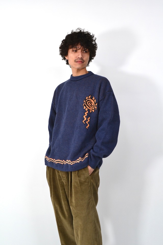 ACRO POLEの総柄ニット。タグやグラフィックのノリから見て 1990年代後半〜2000年代初頭あたり。 このブランド、90s〜Y2K期の「スポーツ×ストリート×スピリチュアル」みたいな空気をそのままニットに落とし込むのが得意で、今回もそのど真ん中。 一見するとブルーのプレーンなニットだけど、前身頃と背面で主張の強さがまったく違うのがポイント。フロントは控えめ、バックに大判のシンボルモチーフ。いかにも当時の“背中で語る”感覚で、スウェット感覚で着られるのに、実はかなりデザインしてる。 編み地も厚すぎず軽すぎずで、コットンアクリル系の実用ニット。ウールほど気を遣わず、でもプリントじゃ出せない立体感があるのがニットならでは。 【MATERIAL】 acrylic 65% wool 25% nylon 10% 【SIZE】 サイズ表記 XL 肩幅 63cm 身幅 64cm 着丈 69cm 袖丈 60cm モデル:172cm 【USED】 目立つダメージがある場合は商品写真に掲載しておりますのでご確認ください。 USED, VINTAGEは十分に検品しておりますが、記載の無い微細な汚れやダメージ等がある場合がございます。 -- 必読 -- ※お問い合わせの最中に売れてしまう場合もござい ますが予めご了承ください。 (ご購入が決定された商品はオンラインストア・店頭から引いておりますのでご安心ください。) ※こちらの価格には消費税が含まれています。 -- 注意事項 -- ・店頭販売を優先させていただいておりますこと予めご了承ください。 ・当店は一点物のVINTAGE、USED商品を中心とした商品を販売しております。購入後の返品・交換は受け付けておりません。中には、傷、汚れ等も見受けられる商品もございますが、長い歴史の中で経た経年変化と捉えていただければ幸いです。ご購入の際は、商品へのご理解をお願い申し上げます。 ・商品の色味は、ご閲覧いただく環境やカメラの性能による、多少の差異がある場合がございます。 【発送】 全国一律 ¥550 お買い上げ金額 ¥10,000以上で送料無料 【お問い合わせ】 meme 080-6581-7798 [email protected] ※Instagram DMでの問い合わせがスムーズです。