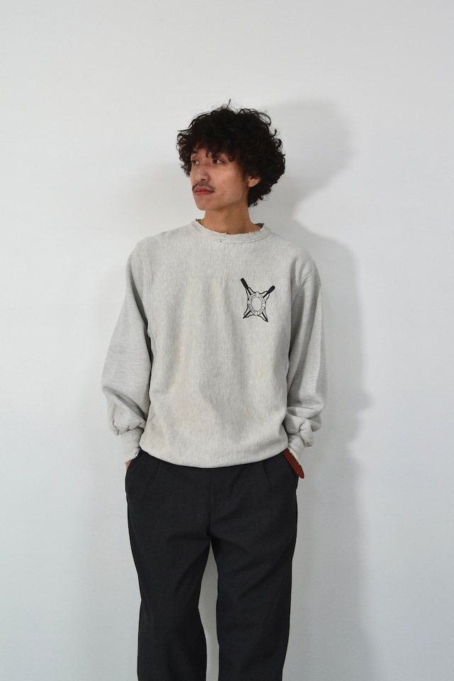 一見するとシンプルな杢グレーのリバースウィーブ。 でも胸元に入るこのプリント、よく見るとただのロゴじゃない。 救命浮輪(ライフリング)をモチーフに、 マサチューセッツ沿岸部の地名が並ぶ、完全にローカル文脈のグラフィック。 観光土産とも、大学モノとも違う、 その土地で暮らしていた人の生活圏の匂いがする一枚です。 ボディはMVP CORP.製のReverse Weave。 チャンピオン以外にも存在していた、アメリカ製リバースのリアルな選択肢。 90%コットン/10%アクリルの裏起毛で、 着込むほどにコシが抜けて、身体に馴染んでいくタイプ。 首元や袖口には程よくダメージが入り、 新品では絶対に出ない「時間を経たスウェットの表情」が完成しています。 ラフだけど、だらしなくならないのがリバースの強さ。 【MATERIAL】 cotton 90% acrylic 10% 【SIZE】 サイズ表記 L 肩幅 50cm 身幅 58cm 着丈 66cm 袖丈 60cm モデル:172cm 【USED】 腹部にも薄いシミと襟元のお直しがあります。 目立つダメージがある場合は商品写真に掲載しておりますのでご確認ください。 USED, VINTAGEは十分に検品しておりますが、記載の無い微細な汚れやダメージ等がある場合がございます。 -- 必読 -- ※お問い合わせの最中に売れてしまう場合もござい ますが予めご了承ください。 (ご購入が決定された商品はオンラインストア・店頭から引いておりますのでご安心ください。) ※こちらの価格には消費税が含まれています。 -- 注意事項 -- ・店頭販売を優先させていただいておりますこと予めご了承ください。 ・当店は一点物のVINTAGE、USED商品を中心とした商品を販売しております。購入後の返品・交換は受け付けておりません。中には、傷、汚れ等も見受けられる商品もございますが、長い歴史の中で経た経年変化と捉えていただければ幸いです。ご購入の際は、商品へのご理解をお願い申し上げます。 ・商品の色味は、ご閲覧いただく環境やカメラの性能による、多少の差異がある場合がございます。 【発送】 全国一律 ¥550 お買い上げ金額 ¥10,000以上で送料無料 【お問い合わせ】 meme 080-6581-7798 [email protected] ※Instagram DMでの問い合わせがスムーズです。