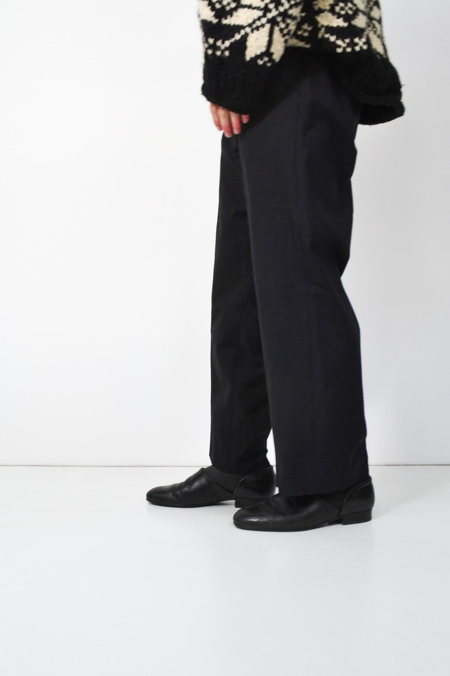 TRUSTのブラックスラックス。 一見は普通の黒パンツだけど、触るとすぐ分かる独特なヌメリ感。 生地はポリエステル100%。 表面は起毛しすぎないスムーシーなフェイクスエード調で、 光を吸いすぎず、反射もしすぎない、 マットとドレープの中間みたいな質感です。 落ち感がかなり良く、 歩いた時や足を曲げた時に 生地が「折れる」というより流れる感じ。 シルエットはツータックで腰回りに余裕があり、 裾までストンと落ちるワイドストレート。 レザーシューズでも、スニーカーでも、 足元を選ばない黒です。 【MATERIAL】 polyester 100% 【SIZE】 サイズ表記 35インチ ウエスト90cm 股上30cm 股下76cm ワタリ35cm 裾幅22cm モデル:170cm 【USED】 目立つダメージがある場合は商品写真に掲載しておりますのでご確認ください。 USED, VINTAGEは十分に検品しておりますが、記載の無い微細な汚れやダメージ等がある場合がございます。 -- 必読 -- ※お問い合わせの最中に売れてしまう場合もござい ますが予めご了承ください。 (ご購入が決定された商品はオンラインストア・店頭から引いておりますのでご安心ください。) ※こちらの価格には消費税が含まれています。 -- 注意事項 -- ・店頭販売を優先させていただいておりますこと予めご了承ください。 ・当店は一点物のVINTAGE、USED商品を中心とした商品を販売しております。購入後の返品・交換は受け付けておりません。中には、傷、汚れ等も見受けられる商品もございますが、長い歴史の中で経た経年変化と捉えていただければ幸いです。ご購入の際は、商品へのご理解をお願い申し上げます。 ・商品の色味は、ご閲覧いただく環境やカメラの性能による、多少の差異がある場合がございます。 【発送】 全国一律 ¥550 お買い上げ金額 ¥10,000以上で送料無料 【お問い合わせ】 meme 080-6581-7798 [email protected] ※Instagram DMでの問い合わせがスムーズです。