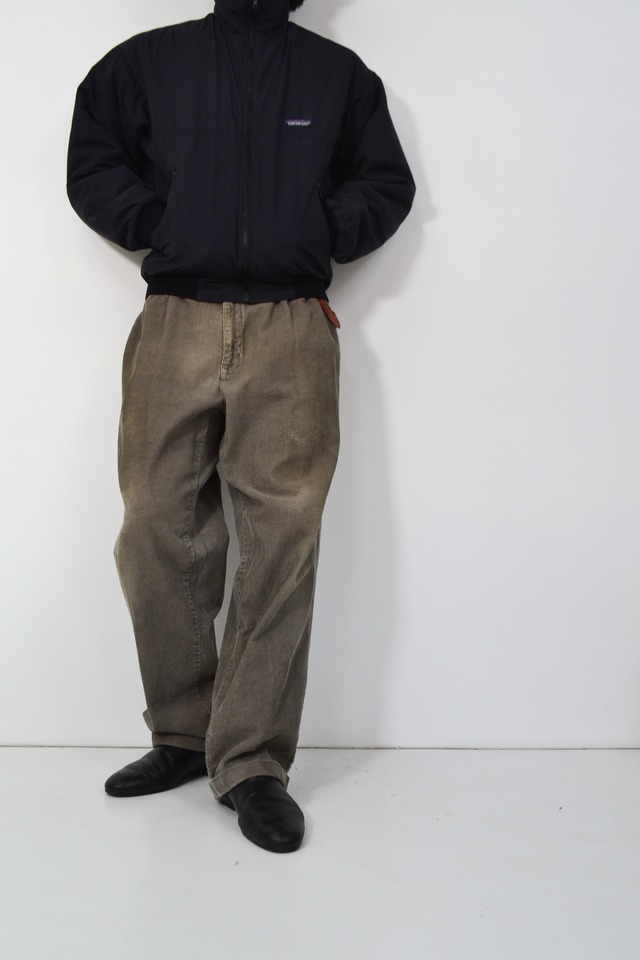 まず畝。 細すぎず太すぎない、GAPらしい中畝コーデュロイ。 履き込まれて畝の山が少し白みがかっていて、 色ムラというより“陰影”で立体感が出ている状態。 新品の均一なベージュより、 今のこの表情の方が断然いい。 タグを見ると Relaxed Fit / fuller seat, straighter leg。 腰回りに余裕があって、 腿から裾にかけて素直に落ちるストレート。 太いけど野暮ったくならないのは、 GAPの90s〜00s前半のパターンの強さ。 スニーカーでも革靴でも成立する形。 素材は 85% Cotton / 15% Polyester、Made in Taiwan。 コットン100より少し軽く、 扱いやすさと耐久性を優先した配合。 【MATERIAL】 cotton 85% polyester 15% 【SIZE】 サイズ表記 35インチ ウエスト90cm 股上30cm 股下76cm ワタリ39cm 裾幅22cm モデル:172cm 【USED】 目立つダメージがある場合は商品写真に掲載しておりますのでご確認ください。 USED, VINTAGEは十分に検品しておりますが、記載の無い微細な汚れやダメージ等がある場合がございます。 -- 必読 -- ※お問い合わせの最中に売れてしまう場合もござい ますが予めご了承ください。 (ご購入が決定された商品はオンラインストア・店頭から引いておりますのでご安心ください。) ※こちらの価格には消費税が含まれています。 -- 注意事項 -- ・店頭販売を優先させていただいておりますこと予めご了承ください。 ・当店は一点物のVINTAGE、USED商品を中心とした商品を販売しております。購入後の返品・交換は受け付けておりません。中には、傷、汚れ等も見受けられる商品もございますが、長い歴史の中で経た経年変化と捉えていただければ幸いです。ご購入の際は、商品へのご理解をお願い申し上げます。 ・商品の色味は、ご閲覧いただく環境やカメラの性能による、多少の差異がある場合がございます。 【発送】 全国一律 ¥550 お買い上げ金額 ¥10,000以上で送料無料 【お問い合わせ】 meme 080-6581-7798 [email protected] ※Instagram DMでの問い合わせがスムーズです。