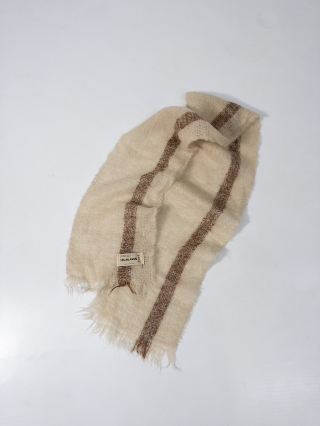 スコットランド製 HIGHLANDS のモヘア×ウールマフラー。 生成りに近いナチュラルカラーをベースに、ブラウンのラインが一本だけ入る、極端に引き算されたデザイン。 素材は モヘア70% × ウール30%。 かなり甘く織られたガーゼのような生地感で、透け感があり、見た目以上に軽い。 首に巻くと空気を含んでふわっと立ち上がり、防寒具というより「布を重ねる」感覚に近い質感です。 織りの粗さ、糸の不均一さ、実用品寄りの佇まいから見て、 1960年代後半〜70年代初頭頃のスコットランド製。 量産化が進む前の時代らしく、均一さよりも素材そのものの表情が前に出ています。 デザインで主張するタイプではなく、 コートやニットの質感を壊さず、空気感だけを足してくれる存在。 いかにもヴィンテージ、ではなく、 「なんか雰囲気が違う」と感じさせるマフラーです。 【MATERIAL】 mohair 70% wool 30% 【SIZE】 幅 24cm 縦 174cm 【USED】 目立つダメージがある場合は商品写真に掲載しておりますのでご確認ください。 USED, VINTAGEは十分に検品しておりますが、記載の無い微細な汚れやダメージ等がある場合がございます。 -- 必読 -- ※お問い合わせの最中に売れてしまう場合もござい ますが予めご了承ください。 (ご購入が決定された商品はオンラインストア・店頭から引いておりますのでご安心ください。) ※こちらの価格には消費税が含まれています。 -- 注意事項 -- ・店頭販売を優先させていただいておりますこと予めご了承ください。 ・当店は一点物のVINTAGE、USED商品を中心とした商品を販売しております。購入後の返品・交換は受け付けておりません。中には、傷、汚れ等も見受けられる商品もございますが、長い歴史の中で経た経年変化と捉えていただければ幸いです。ご購入の際は、商品へのご理解をお願い申し上げます。 ・商品の色味は、ご閲覧いただく環境やカメラの性能による、多少の差異がある場合がございます。 【発送】 全国一律 ¥550 お買い上げ金額 ¥10,000以上で送料無料 【お問い合わせ】 meme 080-6581-7798 [email protected] ※Instagram DMでの問い合わせがスムーズです。