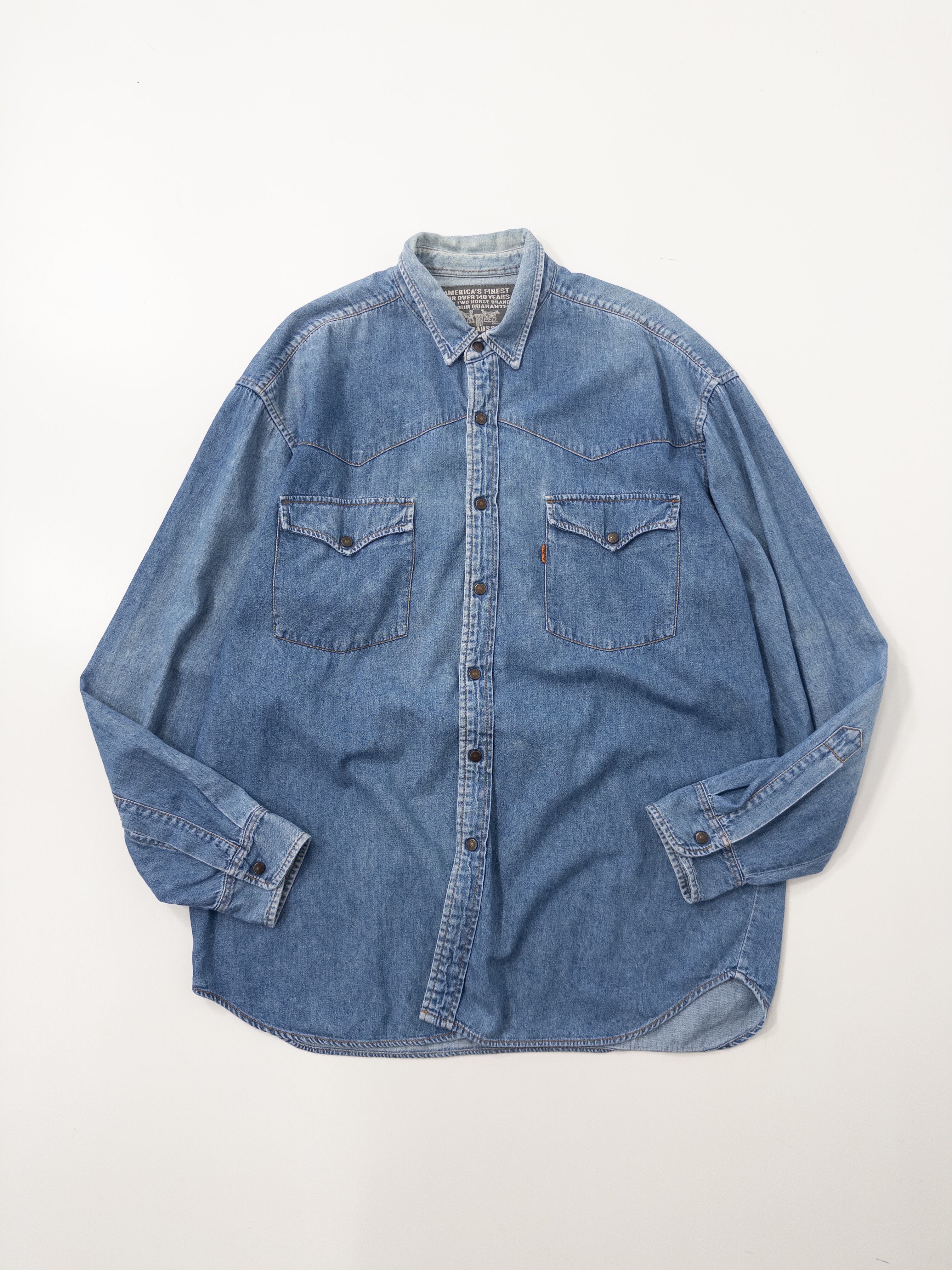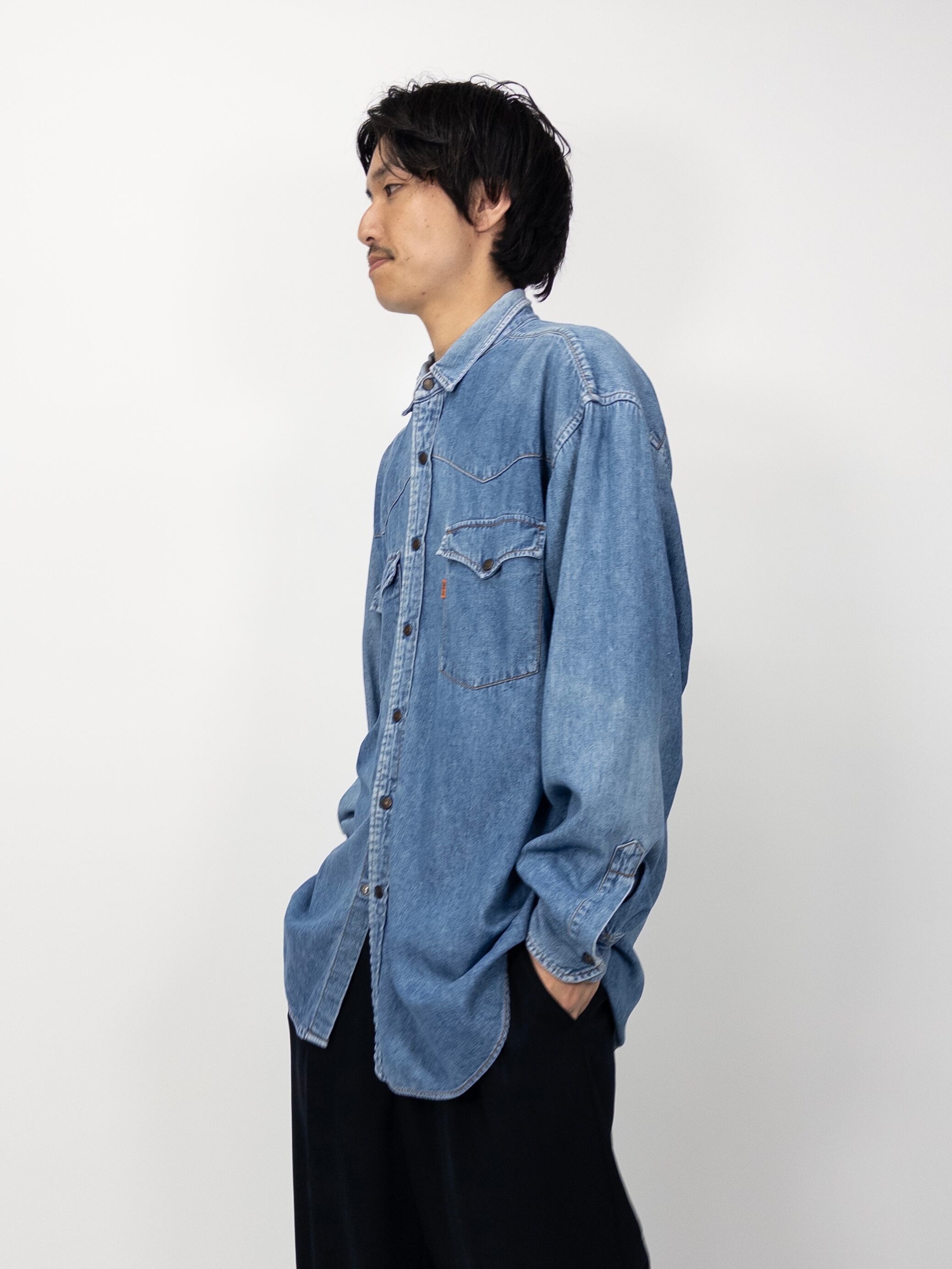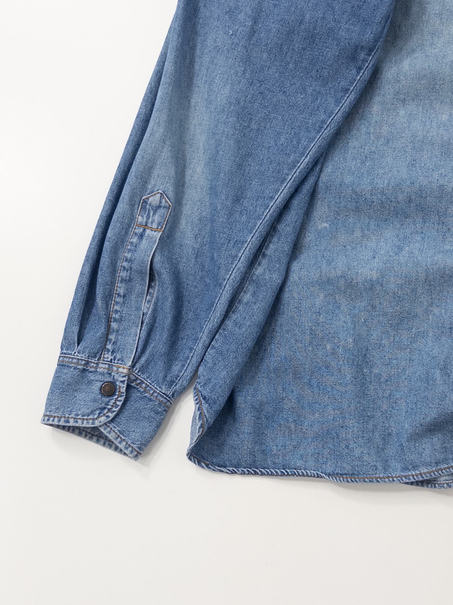 しっかりとしたデニム生地に、程よく色落ちしたブルーがヴィンテージ感たっぷり。胸元のダブルフラップポケット、スナップボタン仕様、ヨークの切り替えなど、ウエスタンシャツらしいディテールも健在です。