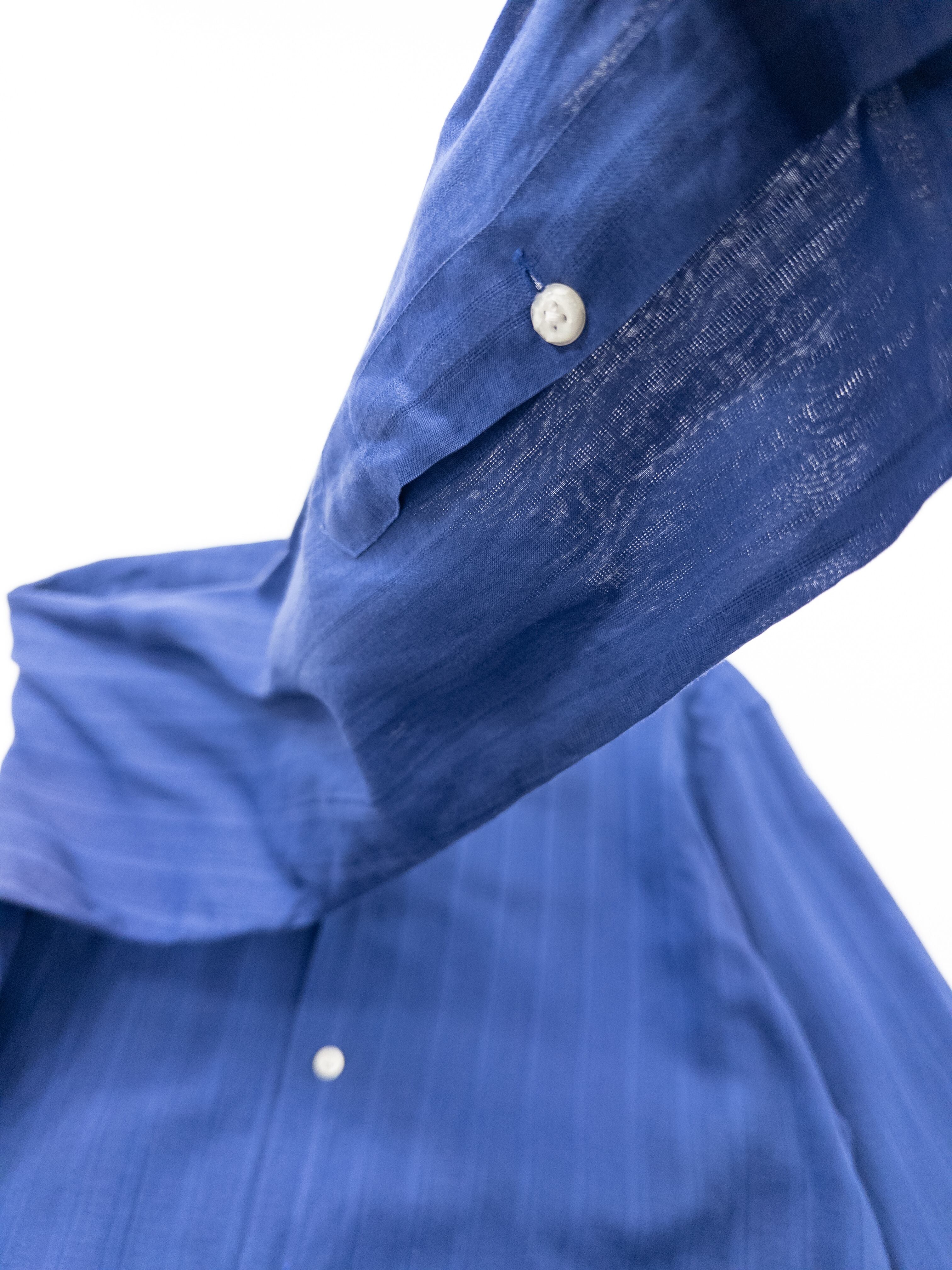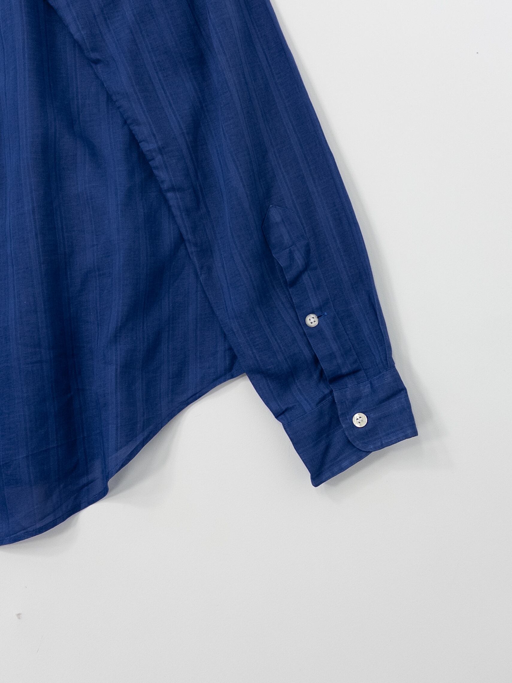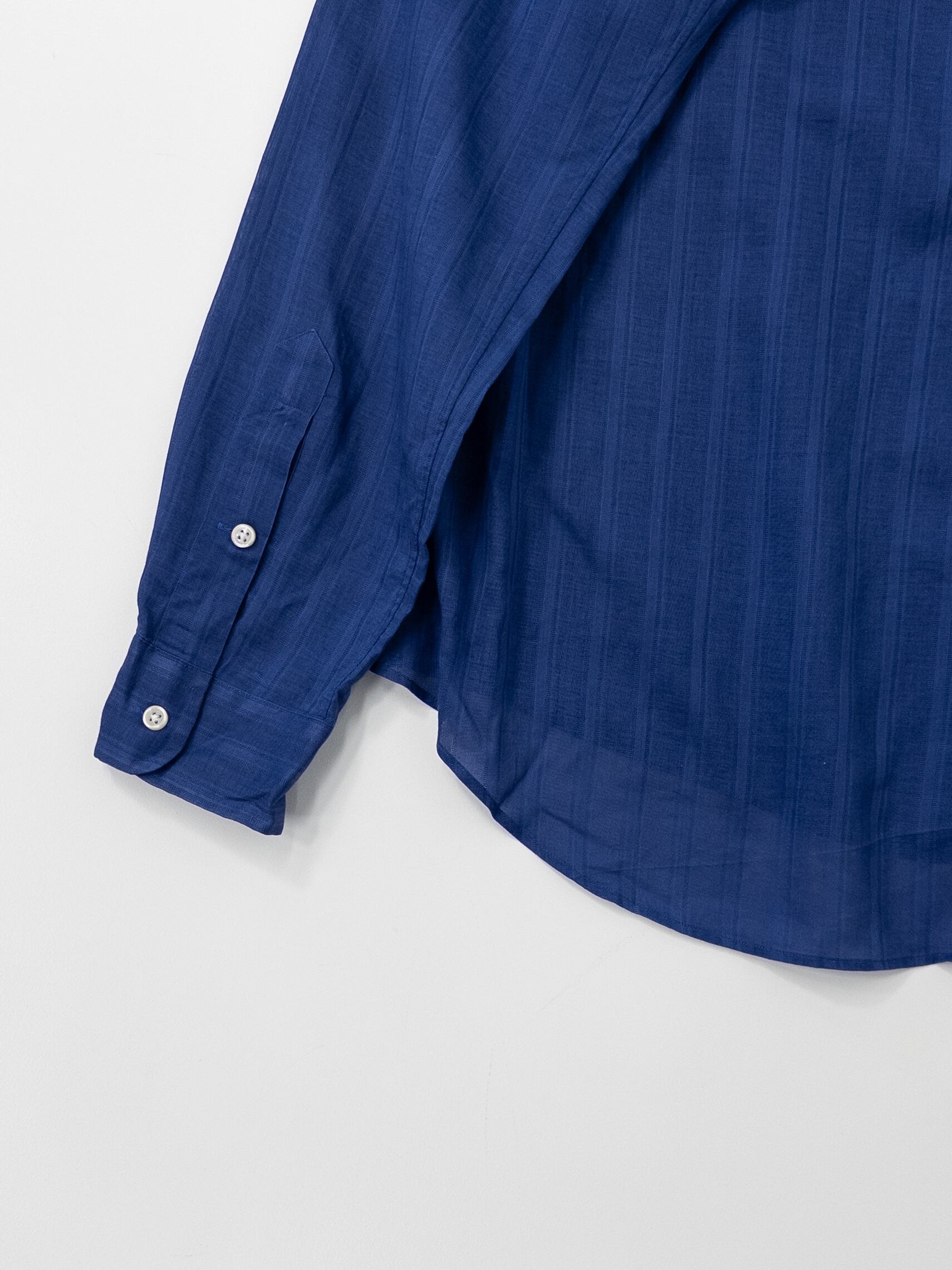 極めて細番手のコットン糸で織り上げられたこのシャツは、まるで空気を纏うような軽やかさとドレープ感が特徴。ネイビーの深みの中にほんのりとした透け感が漂い、素肌に乗せるだけで絵になる一枚です。