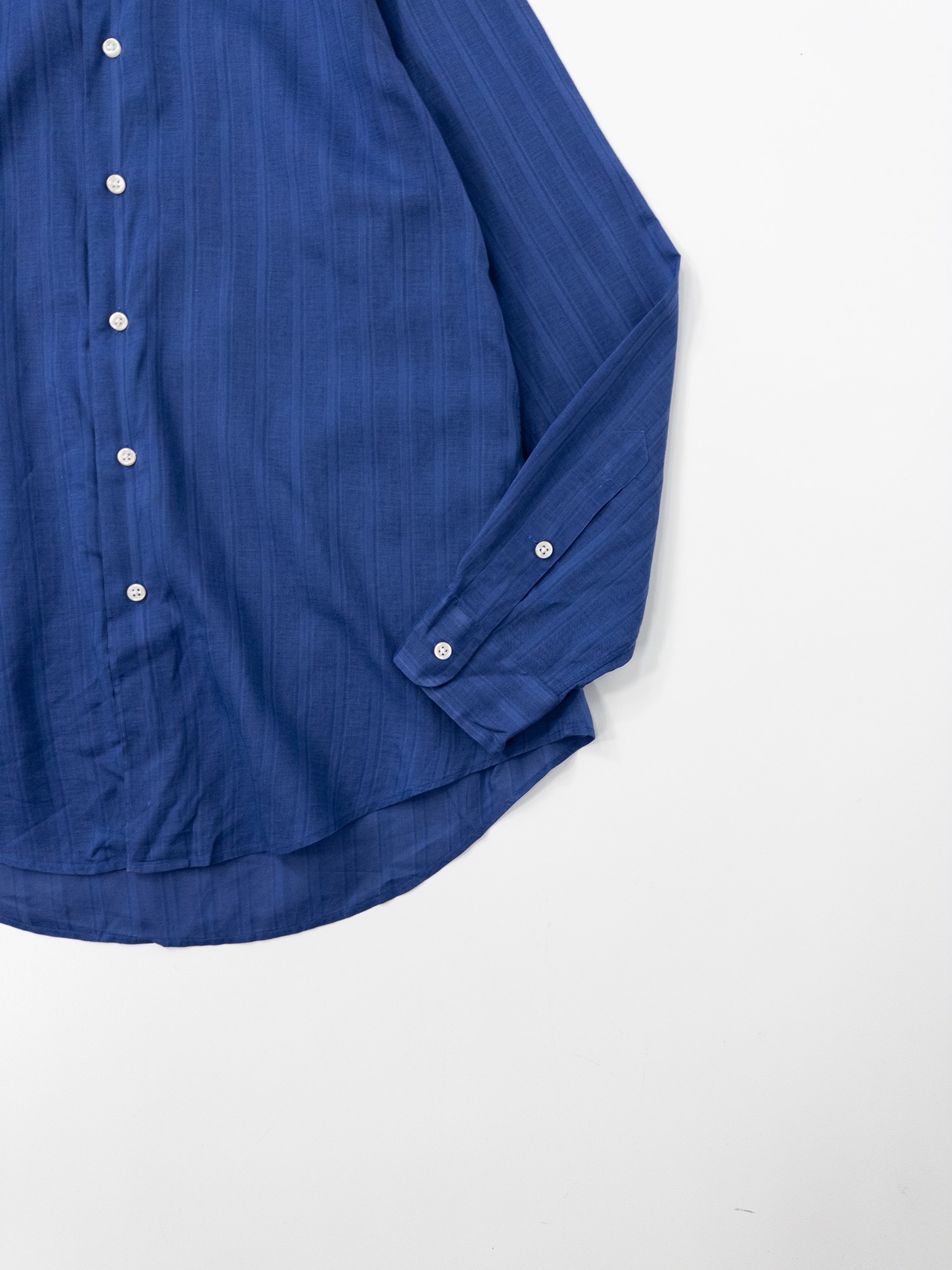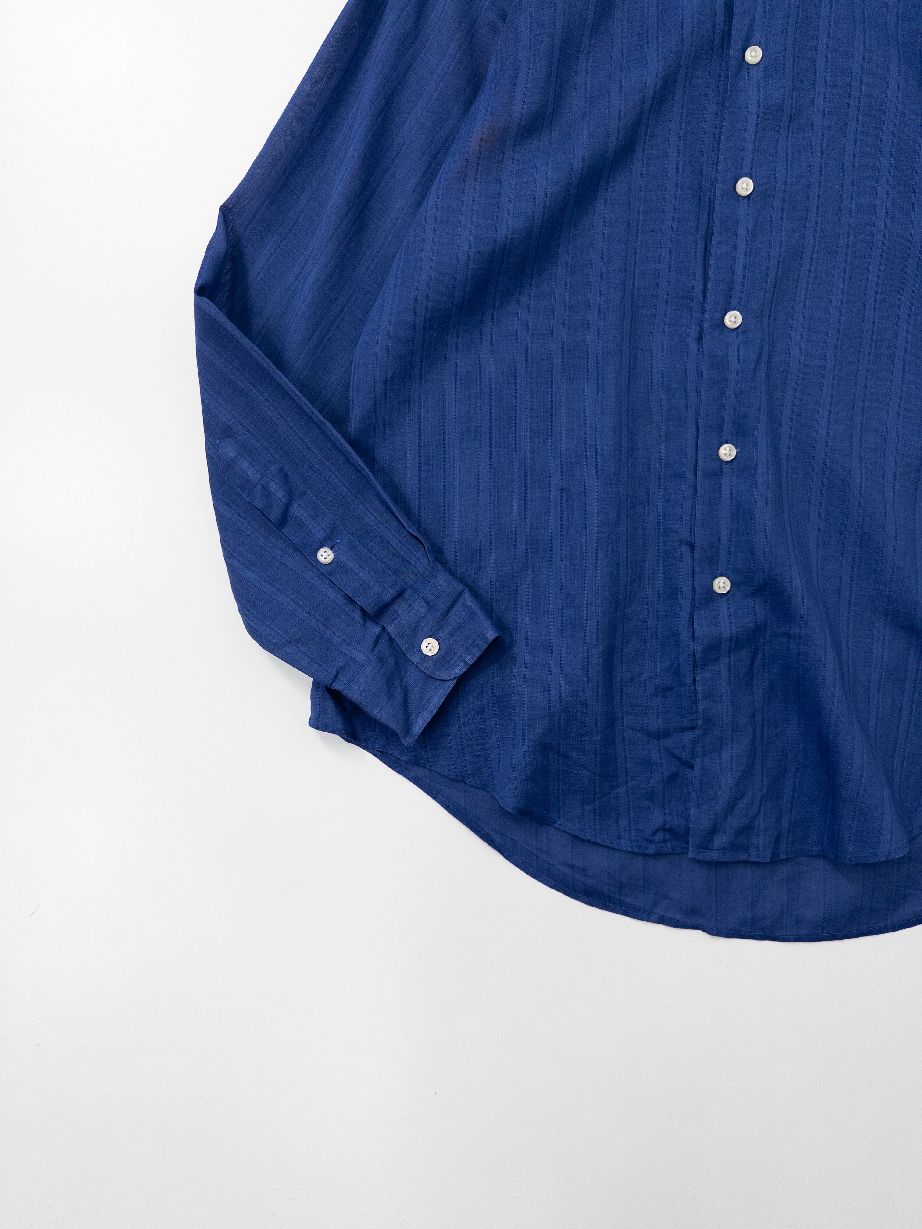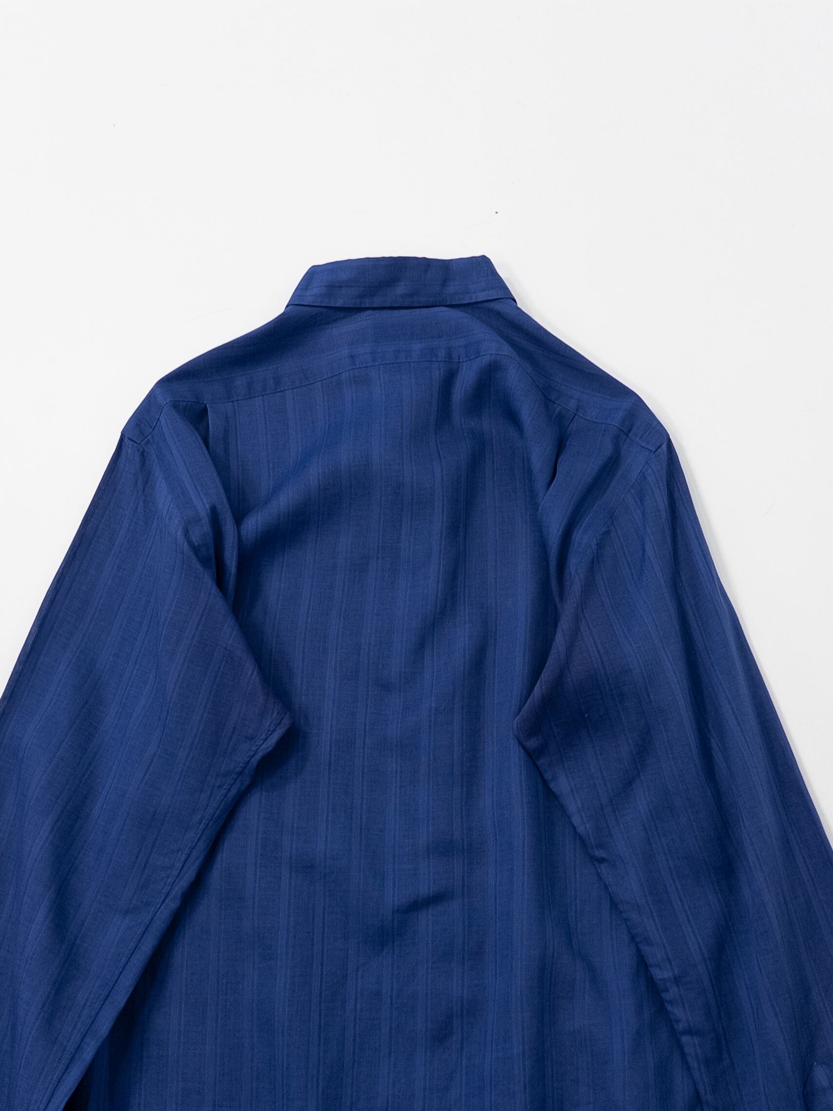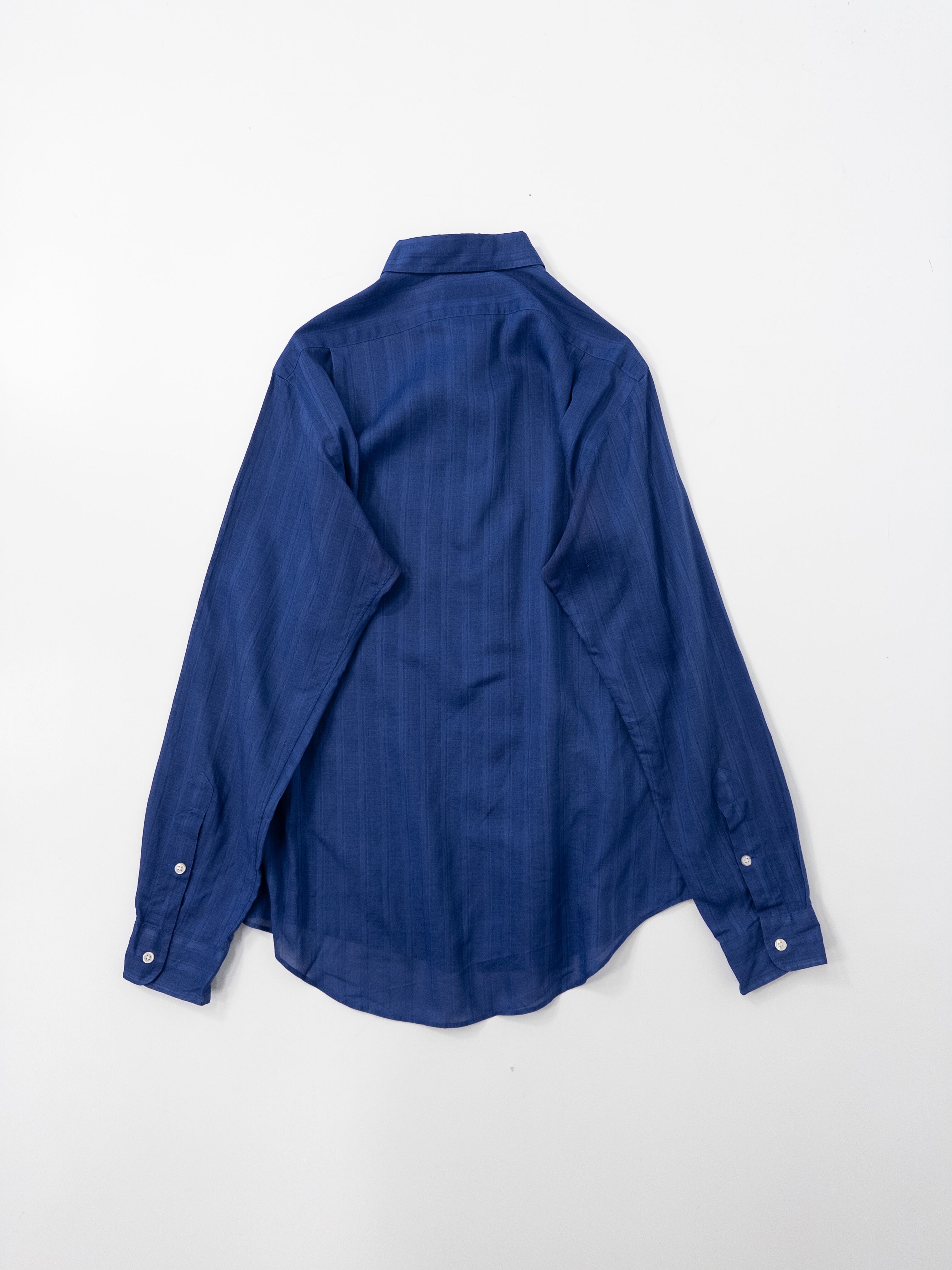 極めて細番手のコットン糸で織り上げられたこのシャツは、まるで空気を纏うような軽やかさとドレープ感が特徴。ネイビーの深みの中にほんのりとした透け感が漂い、素肌に乗せるだけで絵になる一枚です。