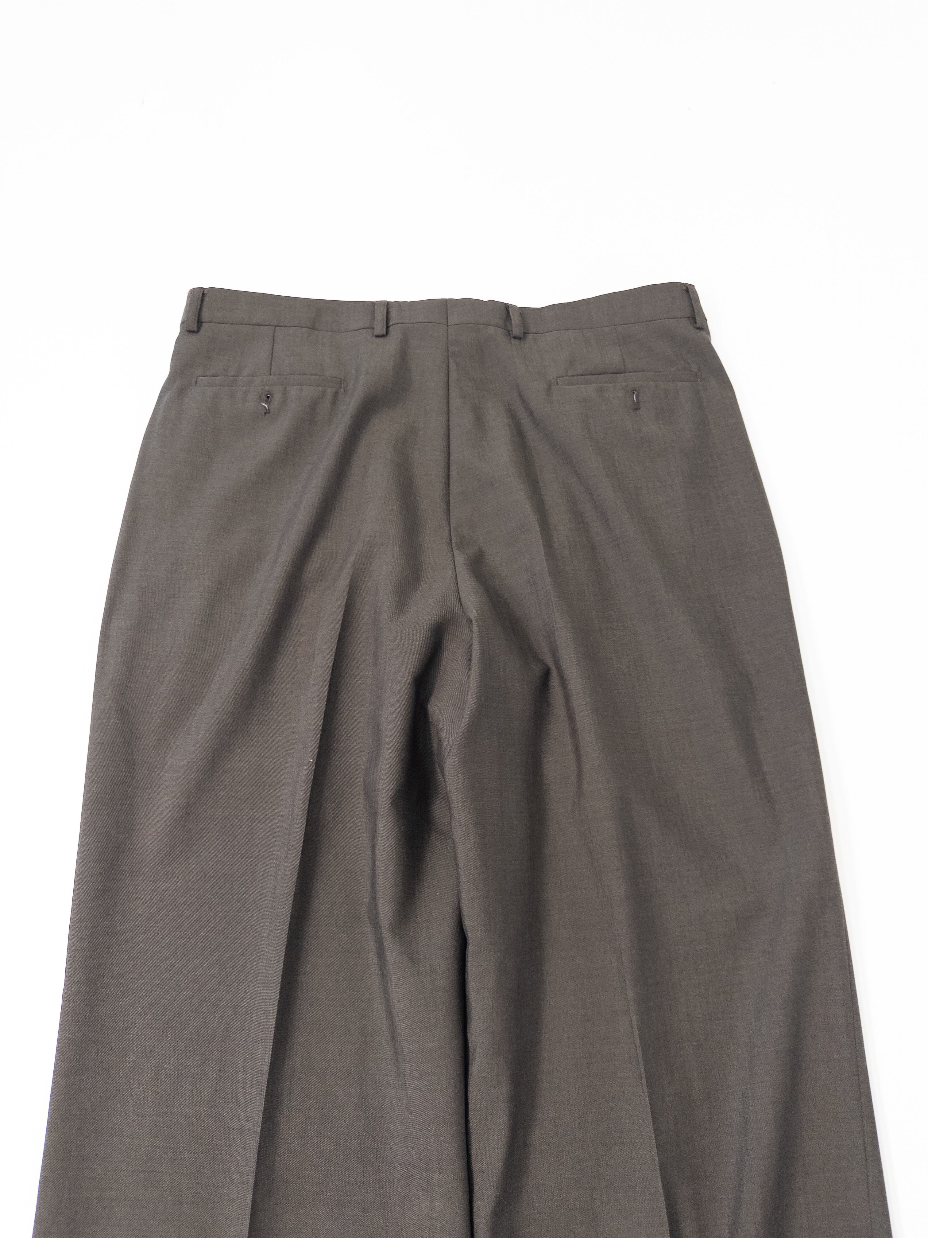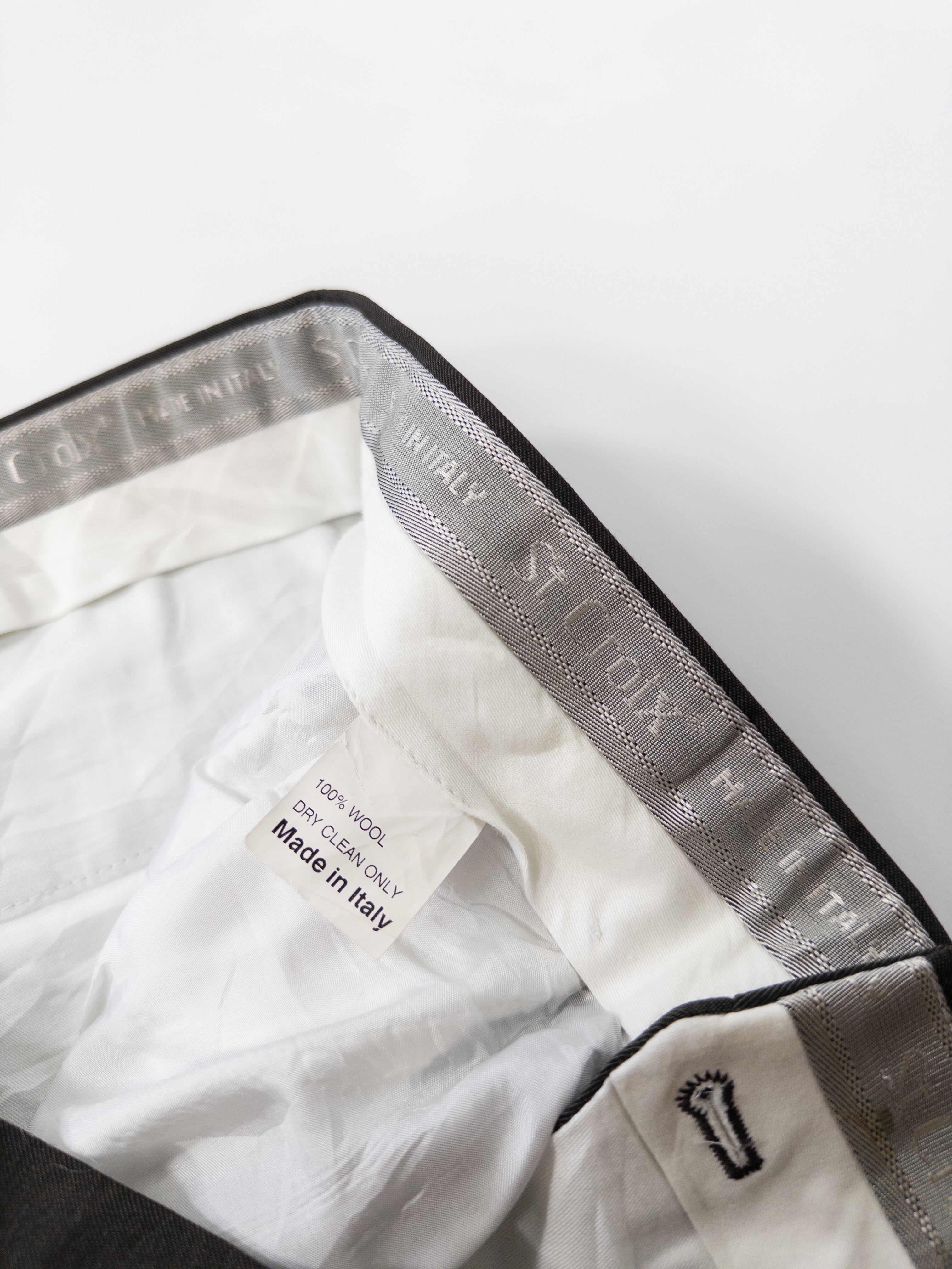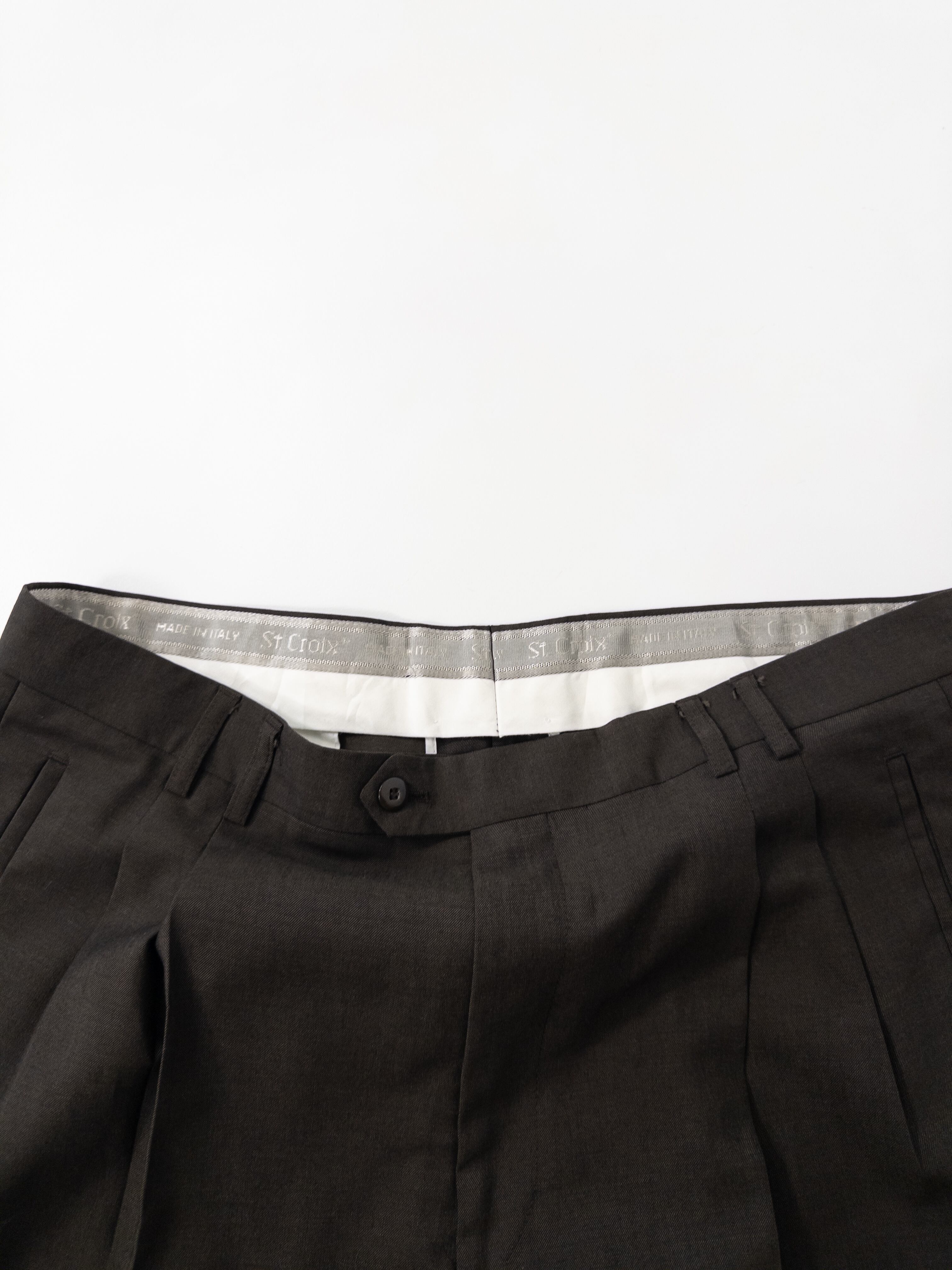 高級ニットやスラックスを手がけるアメリカ発のラグジュアリーブランド〈St. Croix(セントクロワ)〉。この一本は、同ブランドが誇るイタリア製ライン。イタリアメイドならではの洗練されたシルエットと仕立ての良さが光り、2タックのクラシックな構成ながら、どこか現代的なバランス。内側には“ST. CROIX ITALY”の織りネームが入っており、丁寧なつくりを裏付けています。高級テーラリングと日常性の間を上品に往復する、クローゼットに一本あると嬉しいスラックスです。