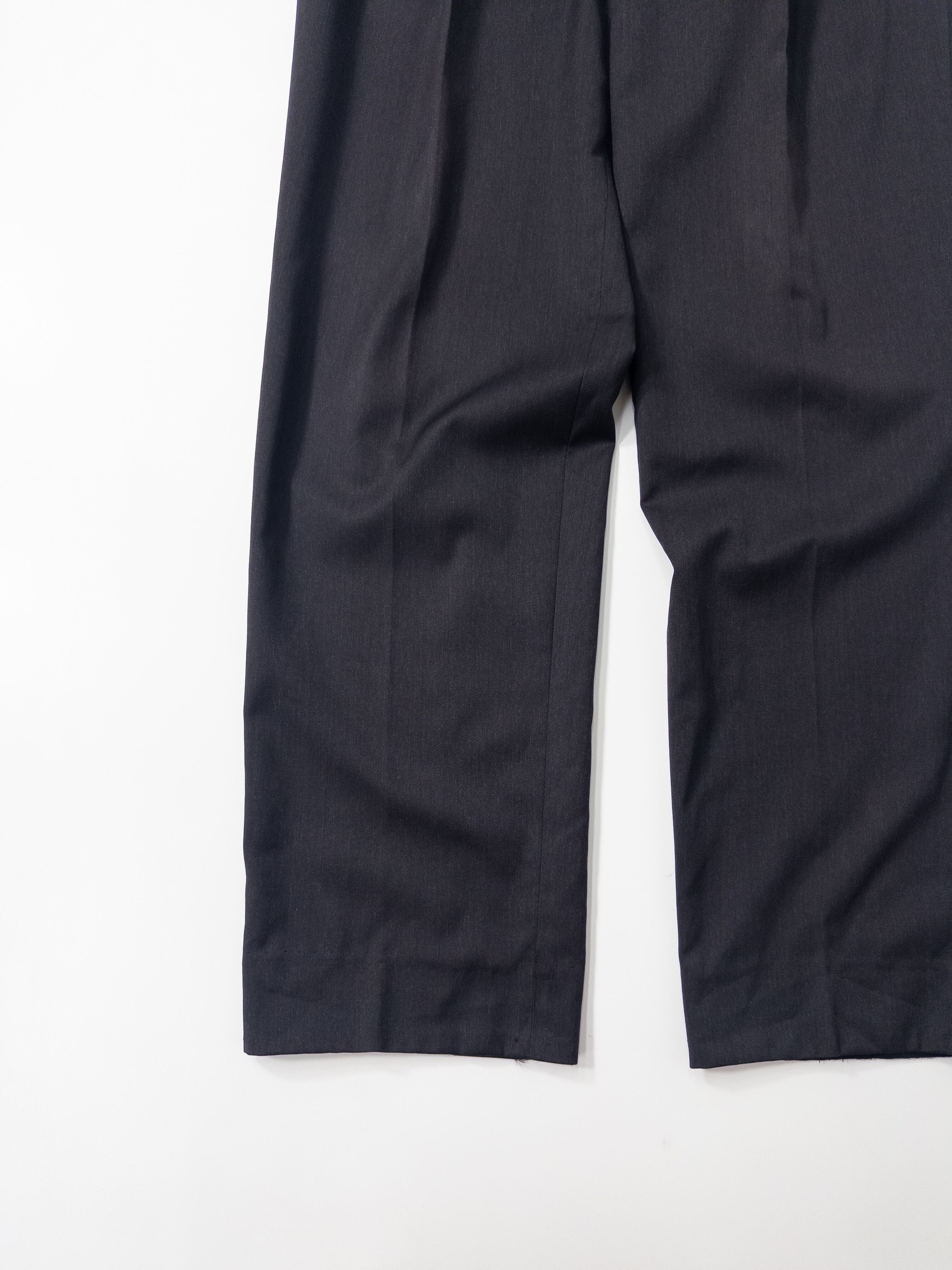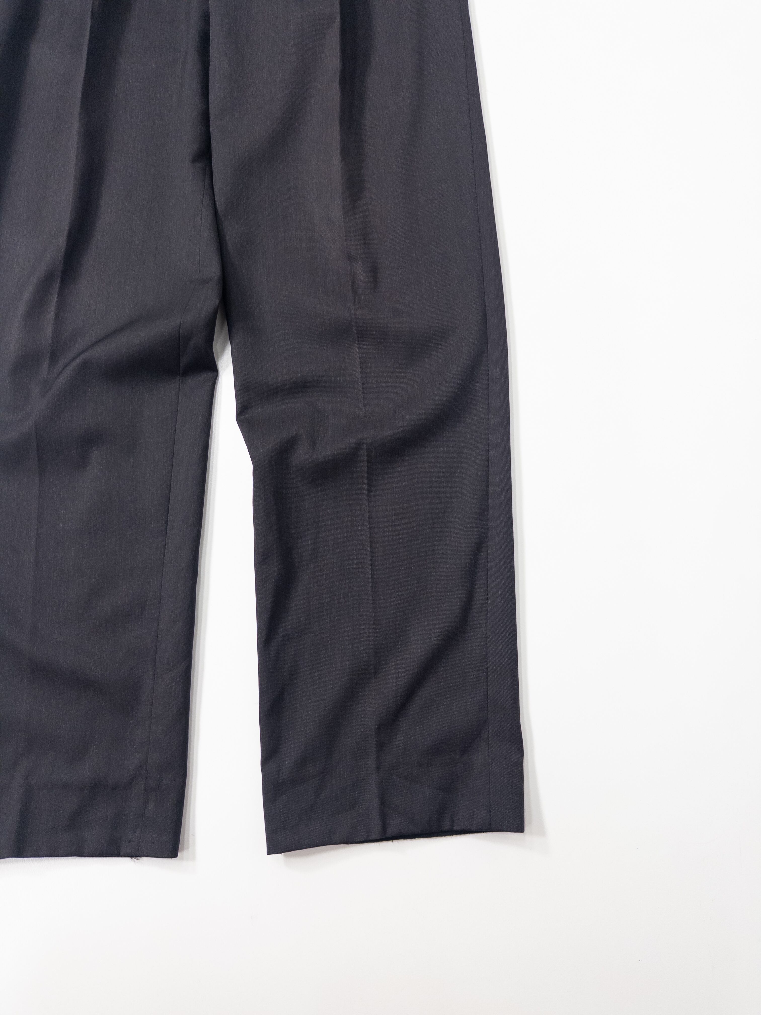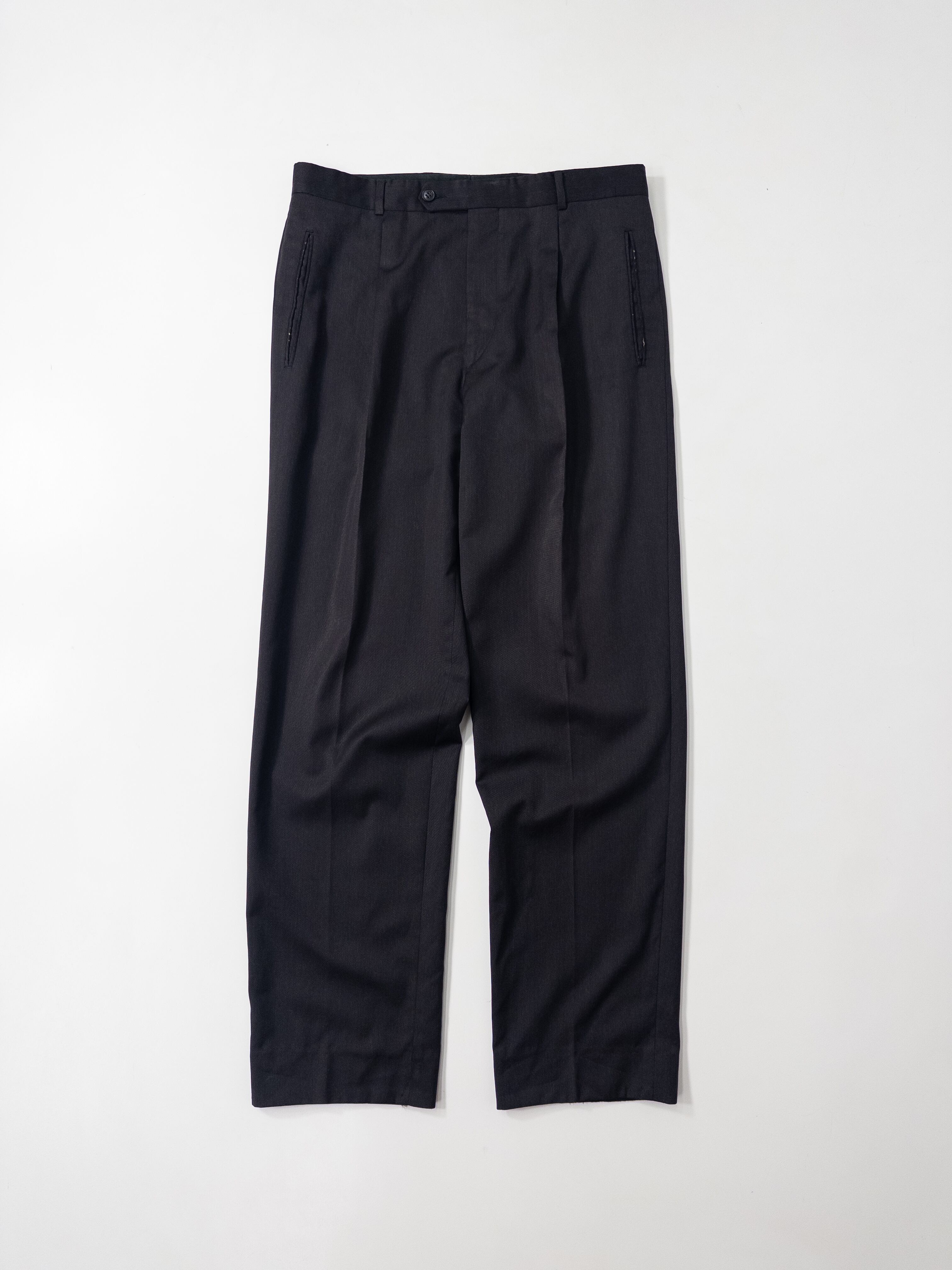 ディテールは、往年のフレンチメゾンならではのラグジュアリーな仕立てを感じさせます。ウールはドイツ語表記の「Reine Schurwolle(ピュアニューウール)」で、しっとりとしたタッチと光の加減で揺らめく深みのある黒が印象的。程よいゆとりと美しいセンタークリースが、大人のヴィンテージスタイルに格上げしてくれる一本です。