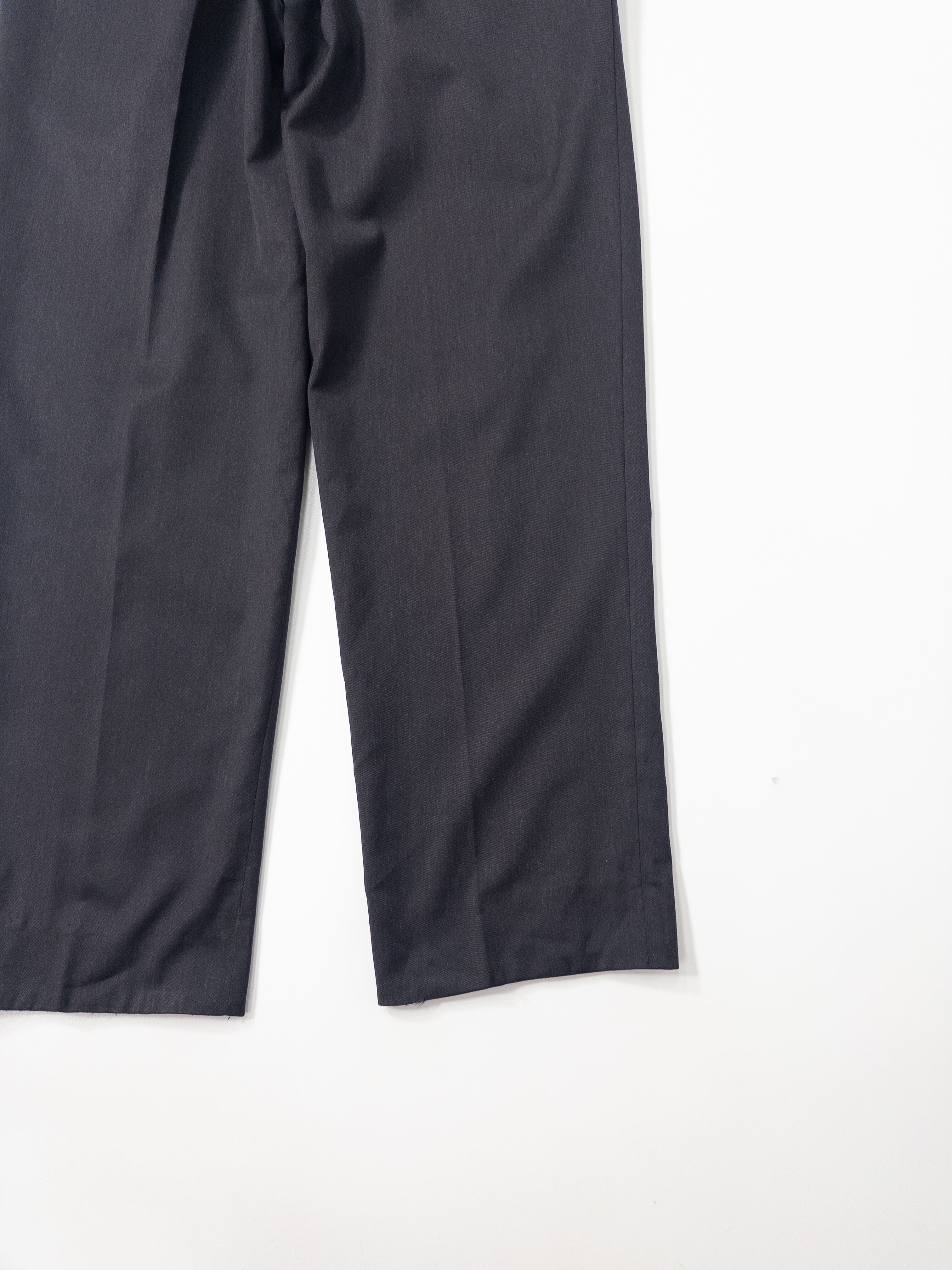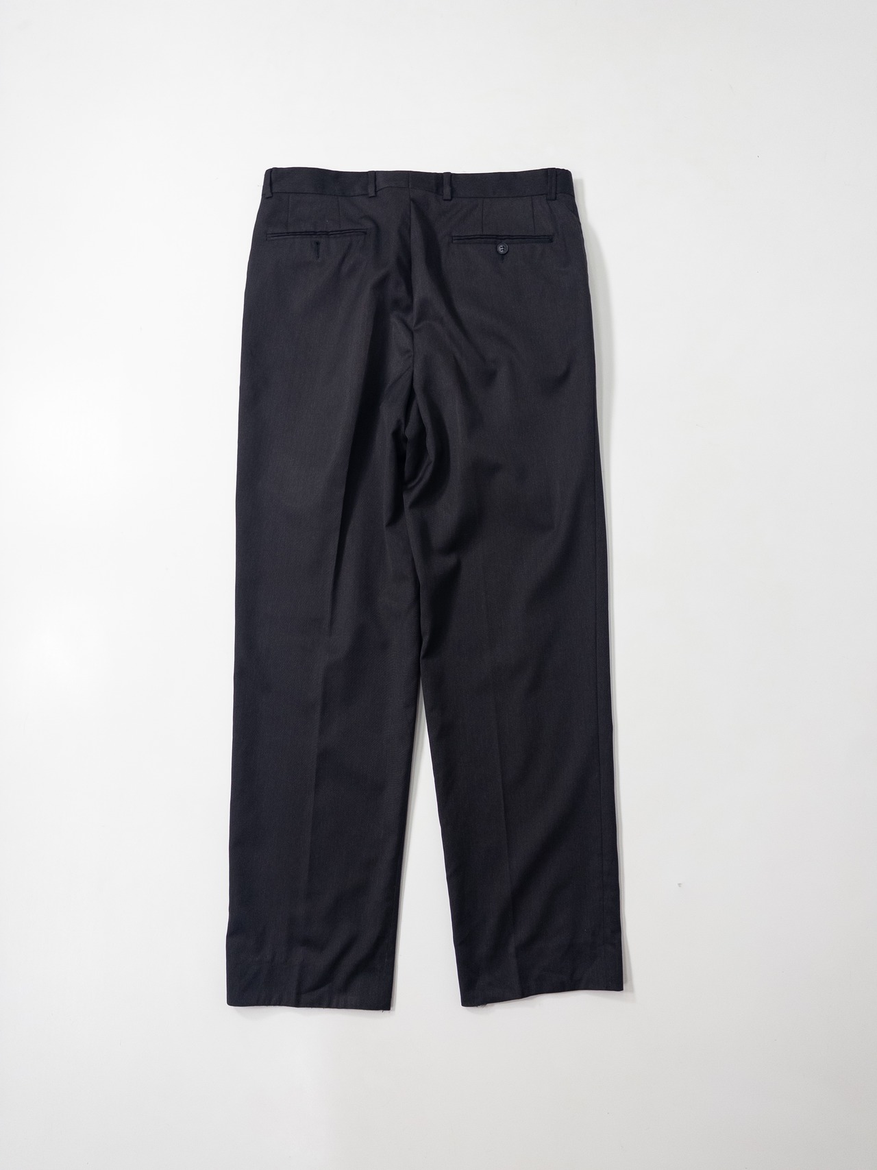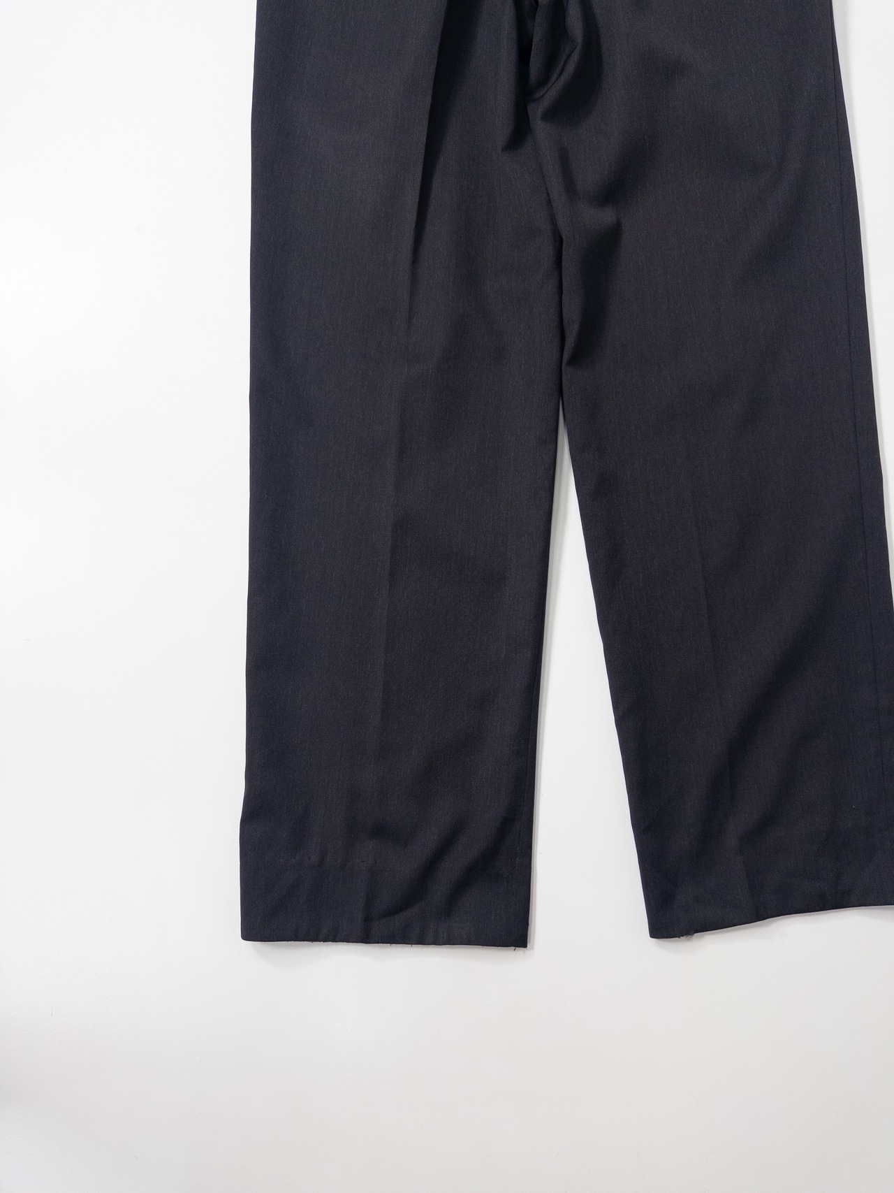 ディテールは、往年のフレンチメゾンならではのラグジュアリーな仕立てを感じさせます。ウールはドイツ語表記の「Reine Schurwolle(ピュアニューウール)」で、しっとりとしたタッチと光の加減で揺らめく深みのある黒が印象的。程よいゆとりと美しいセンタークリースが、大人のヴィンテージスタイルに格上げしてくれる一本です。