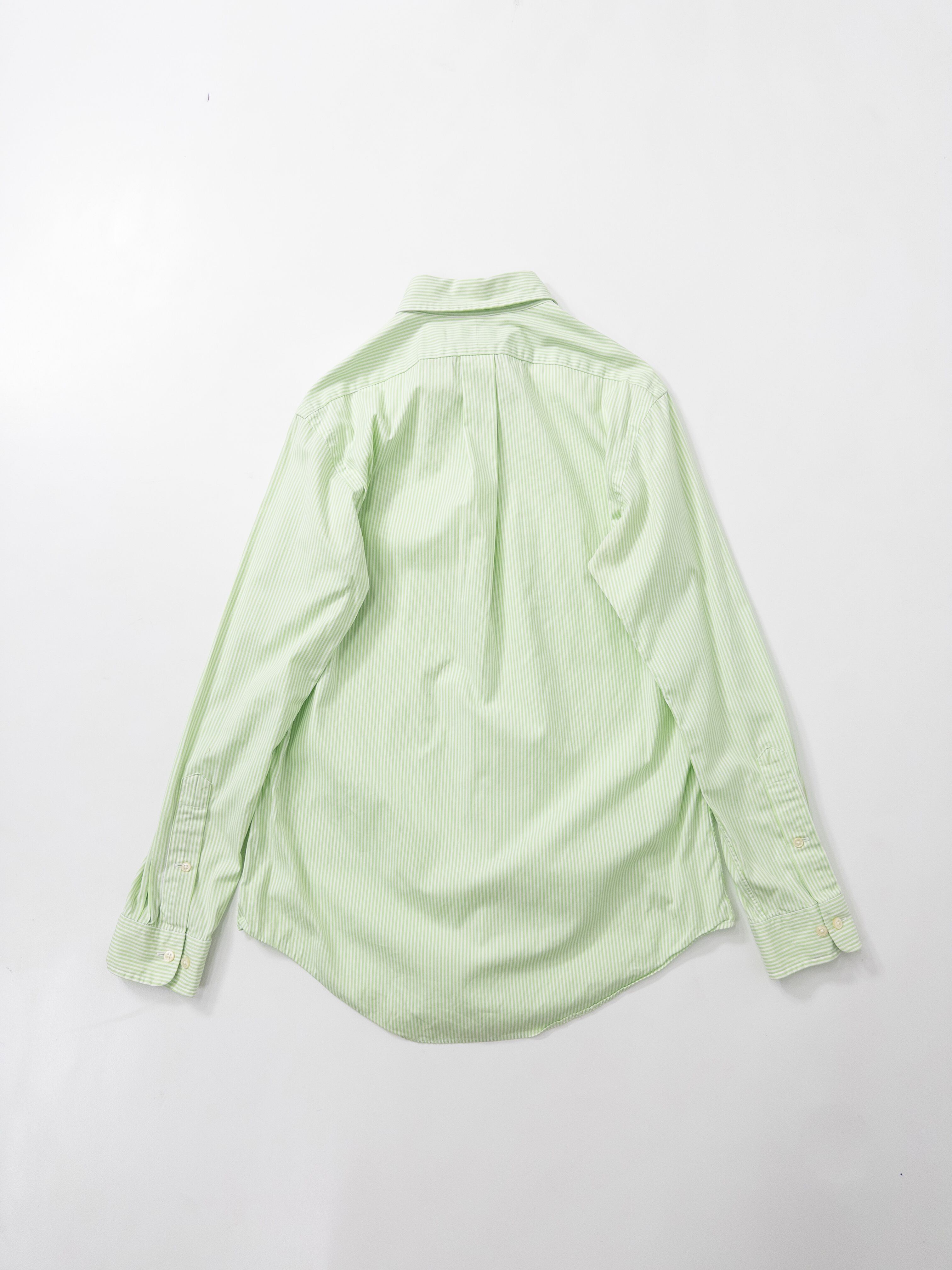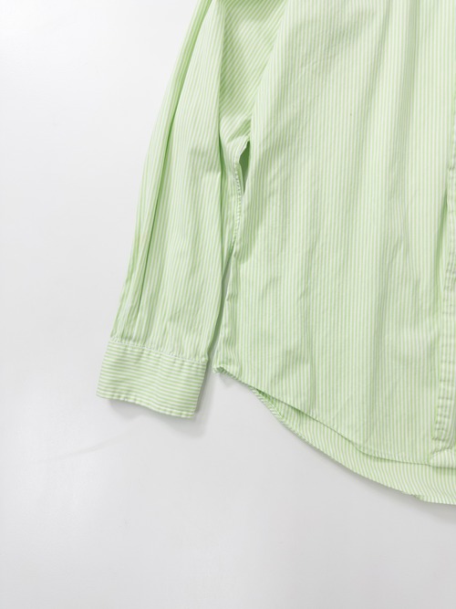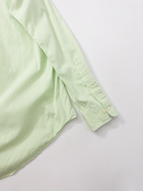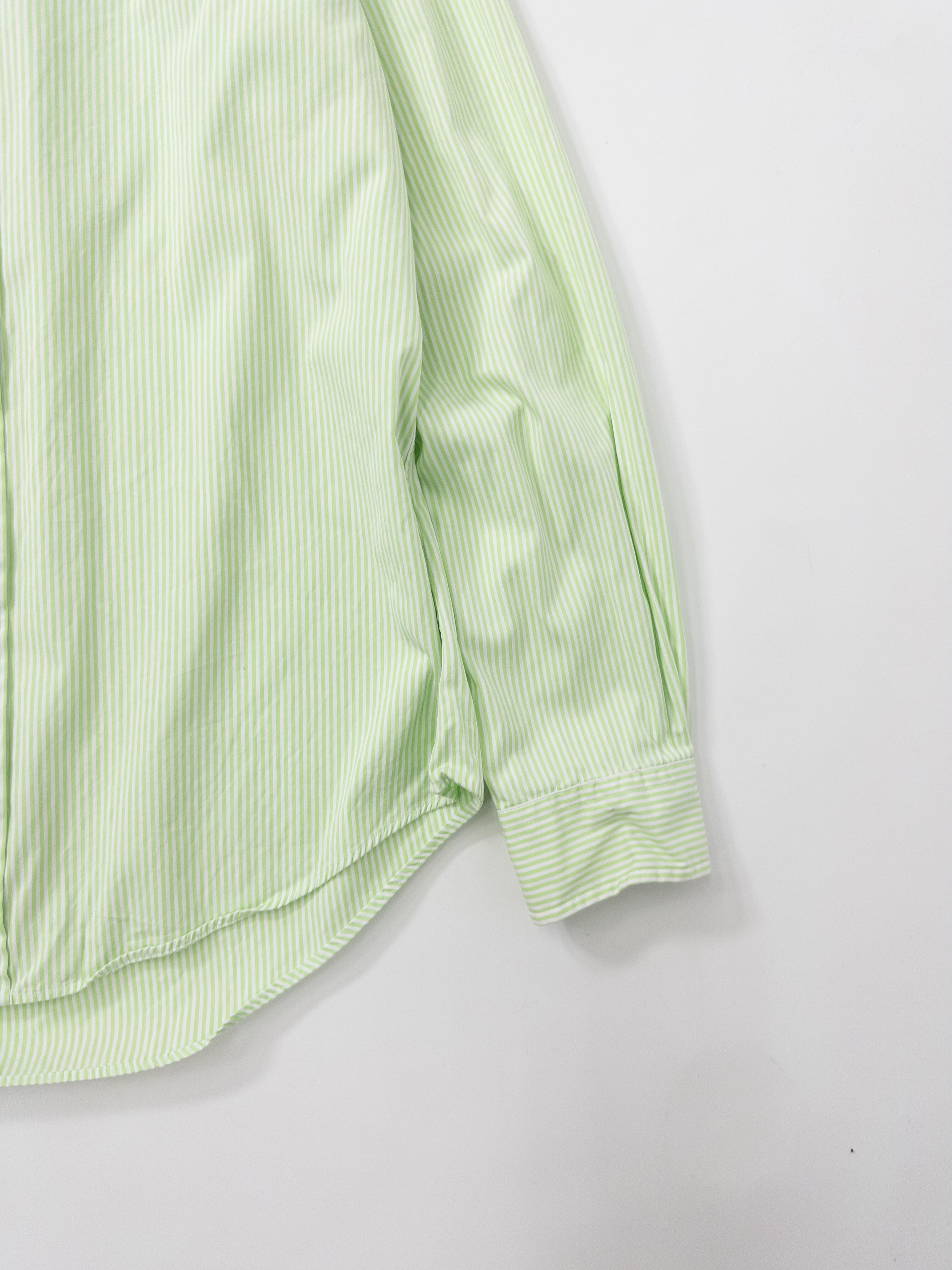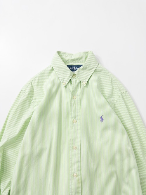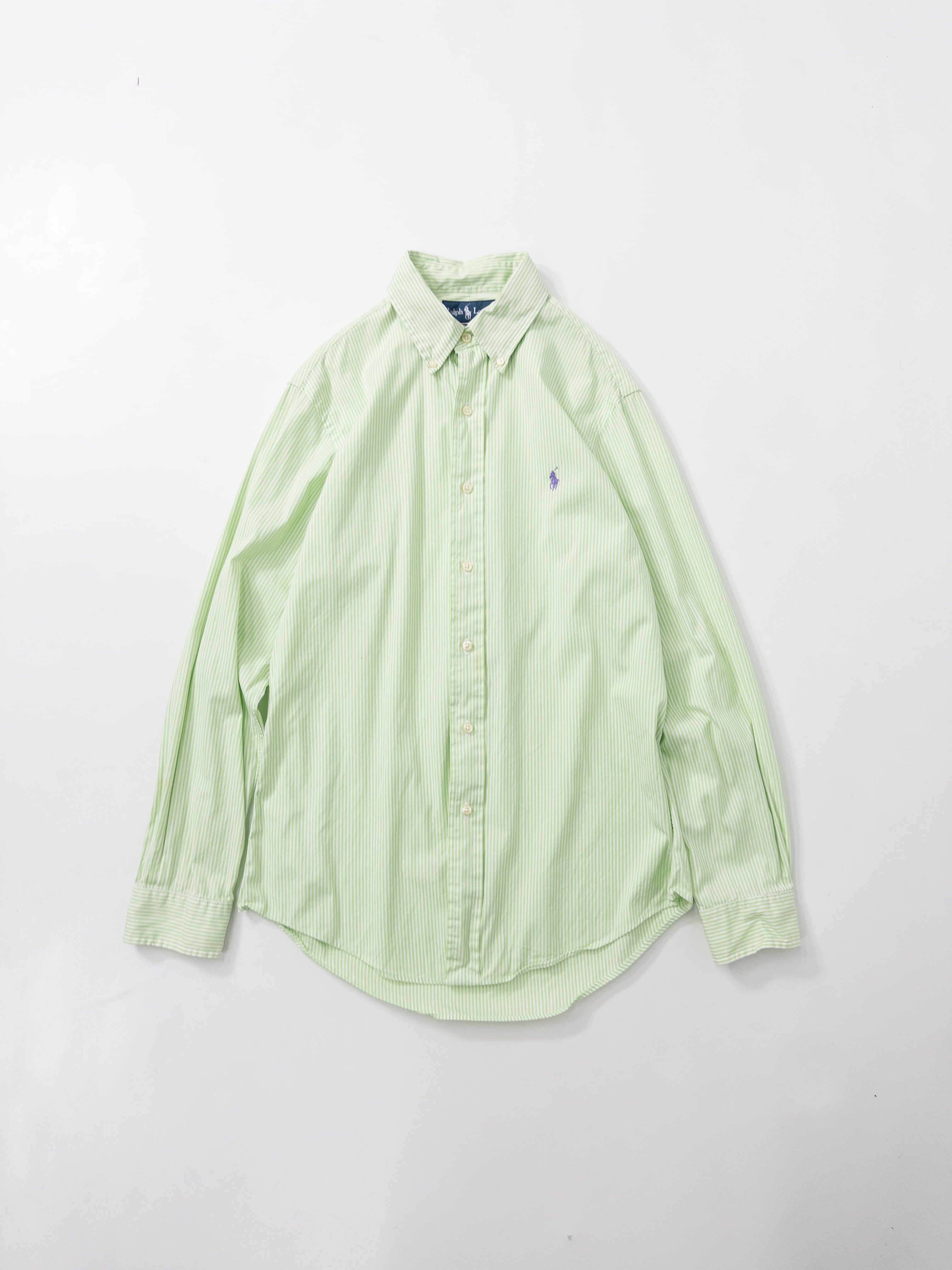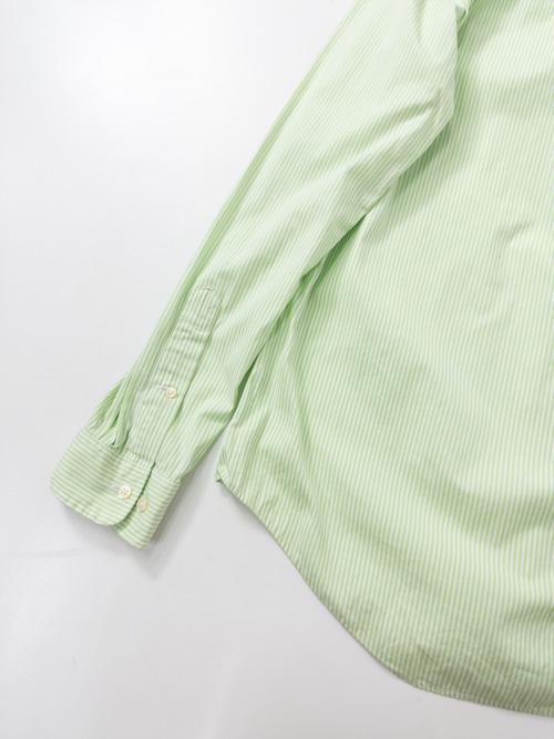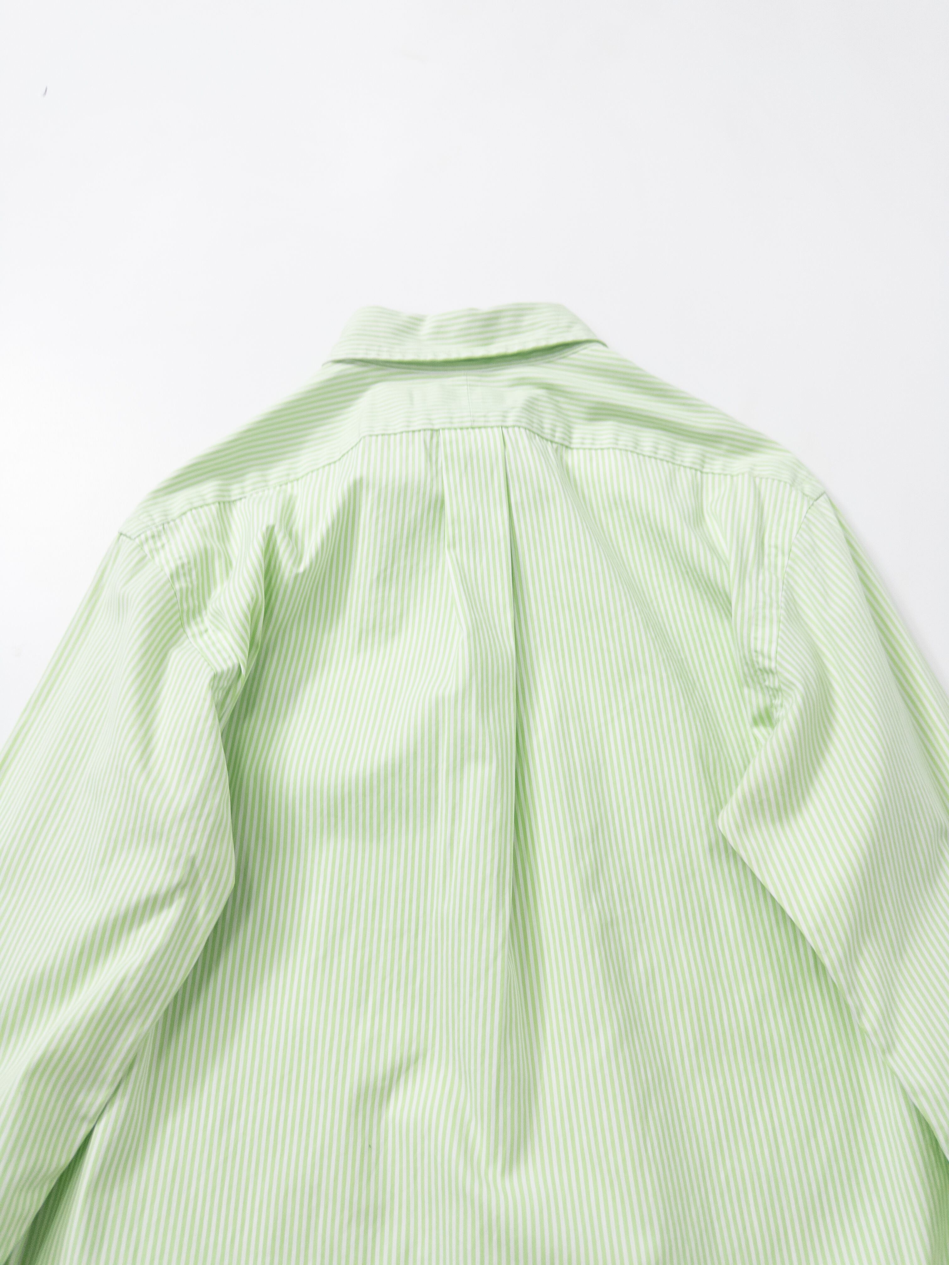 柔らかなライムグリーンが美しい。ボタンダウン仕様に、刺繍ポニーはパープルで彩られた爽やかな配色バランス。タグは“CUSTOM FIT”。フィット感がありながらクラシックすぎない現代的シルエットも◎