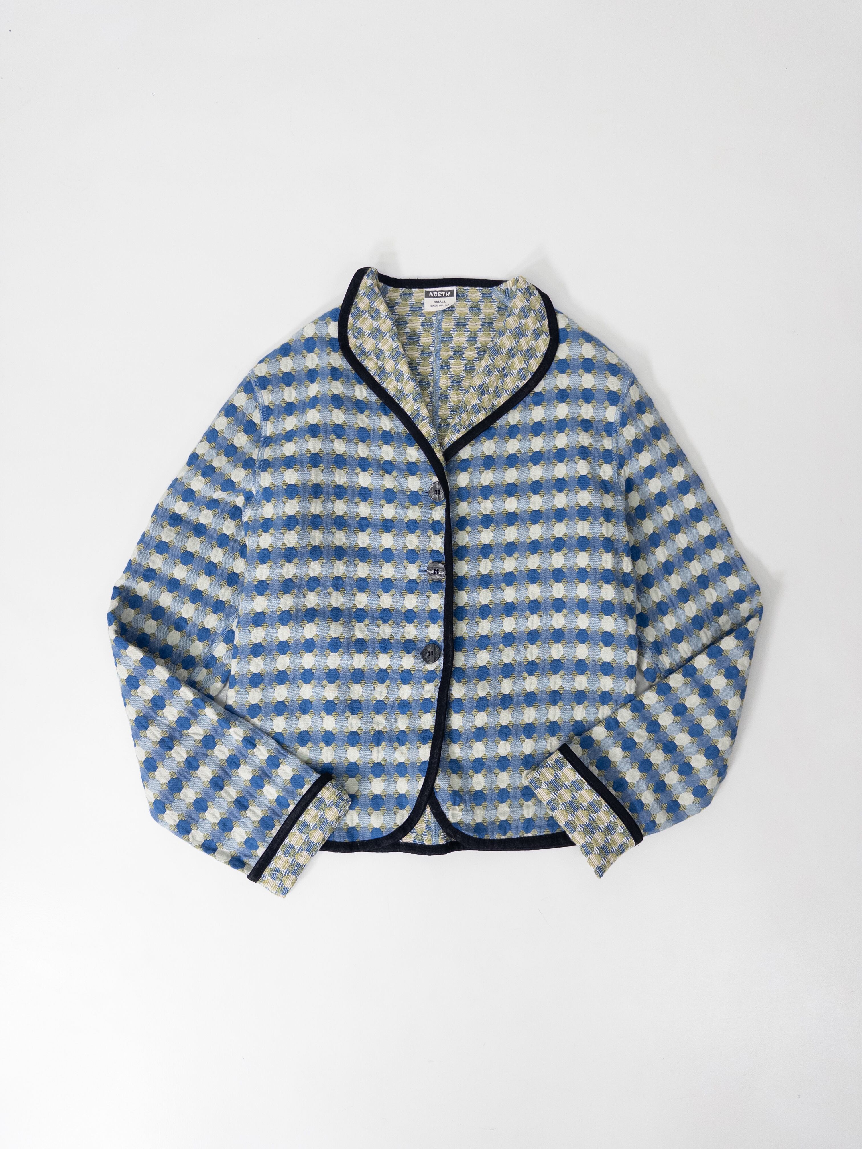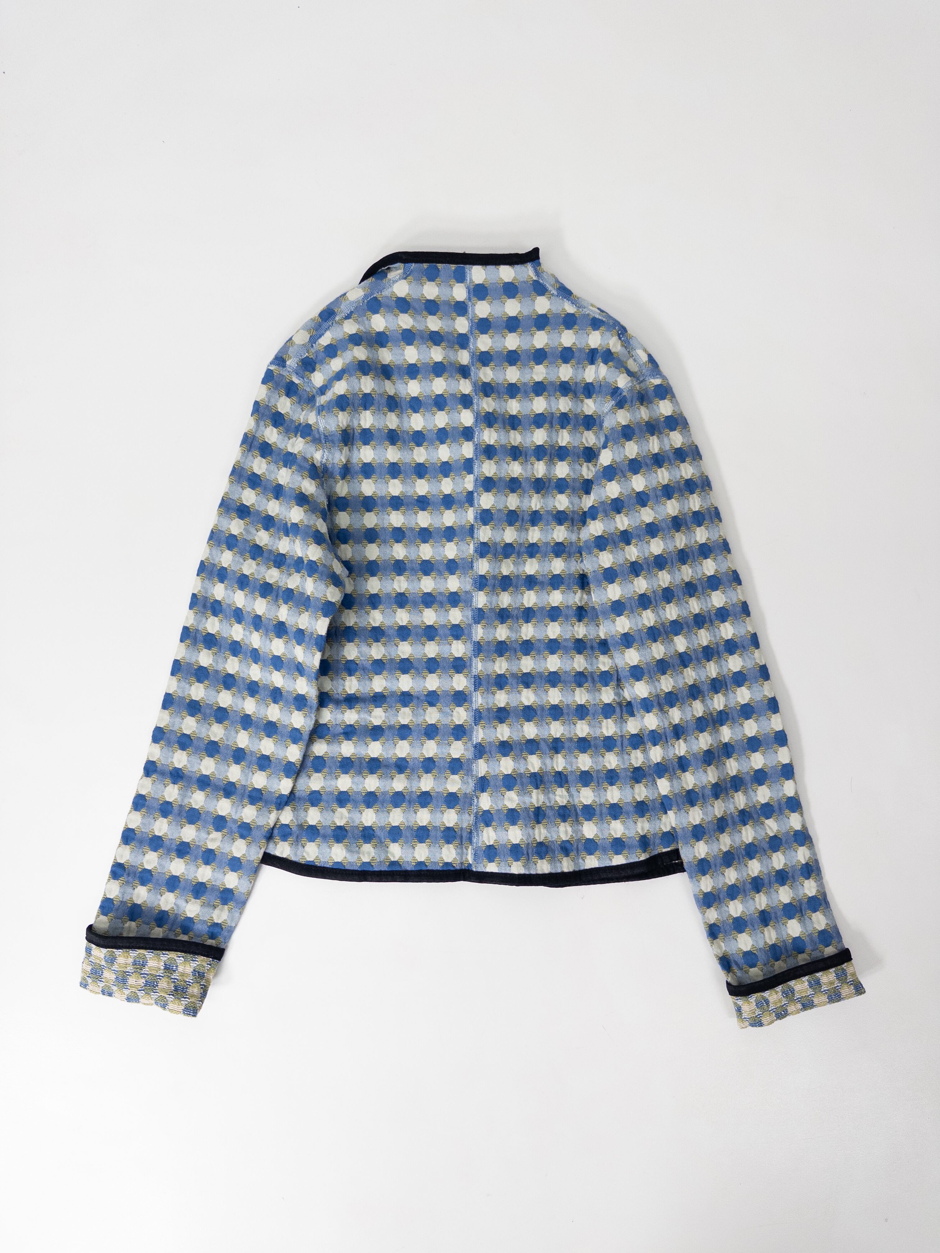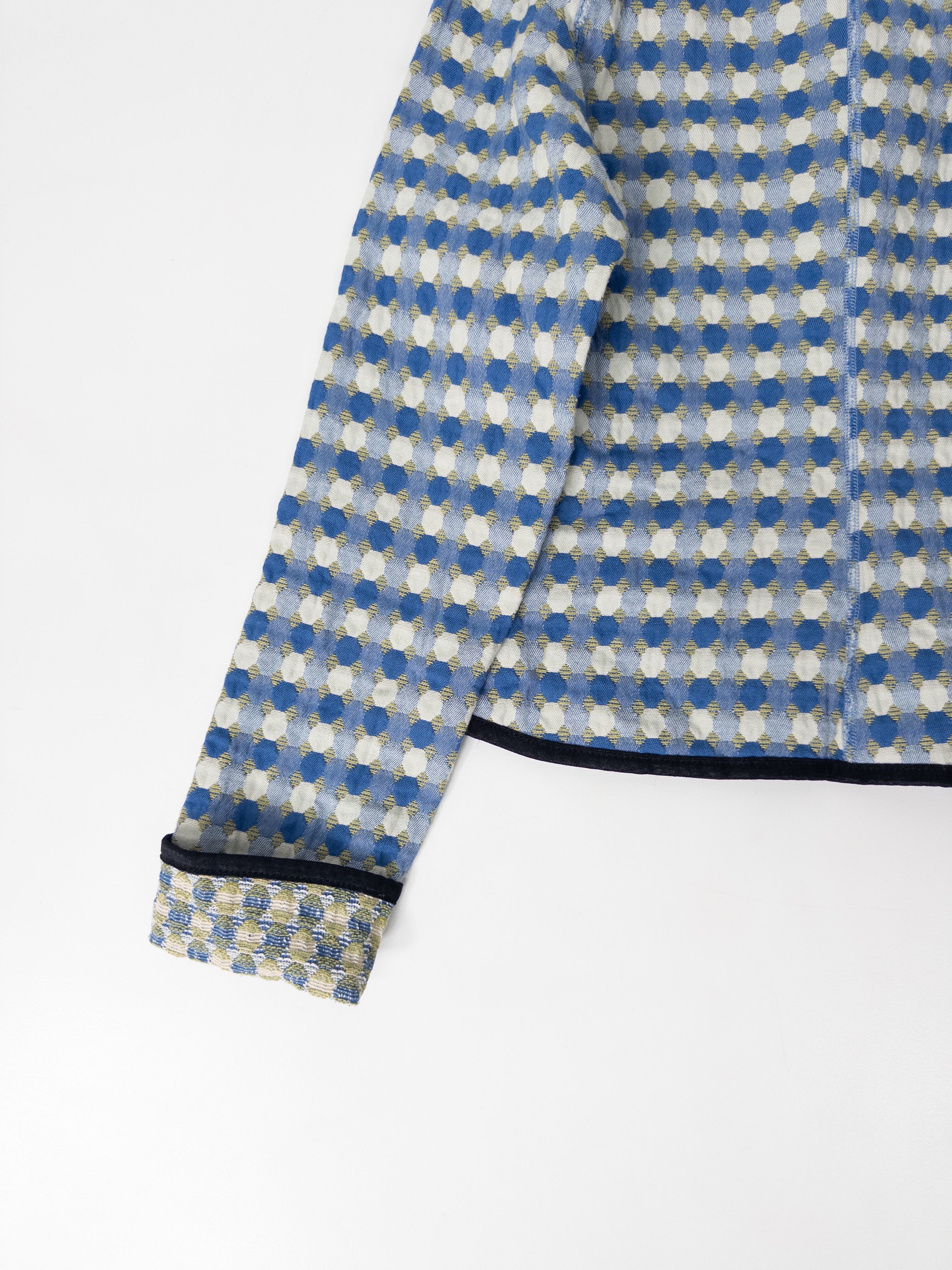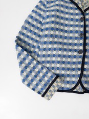 ドットとチェックが重なるジャカード織りのノーカラージャケット。ブルーとカーキをベースにしたやや渋めの配色ながら、柄のリズムと立体的な織りが軽やかな存在感を放ちます。