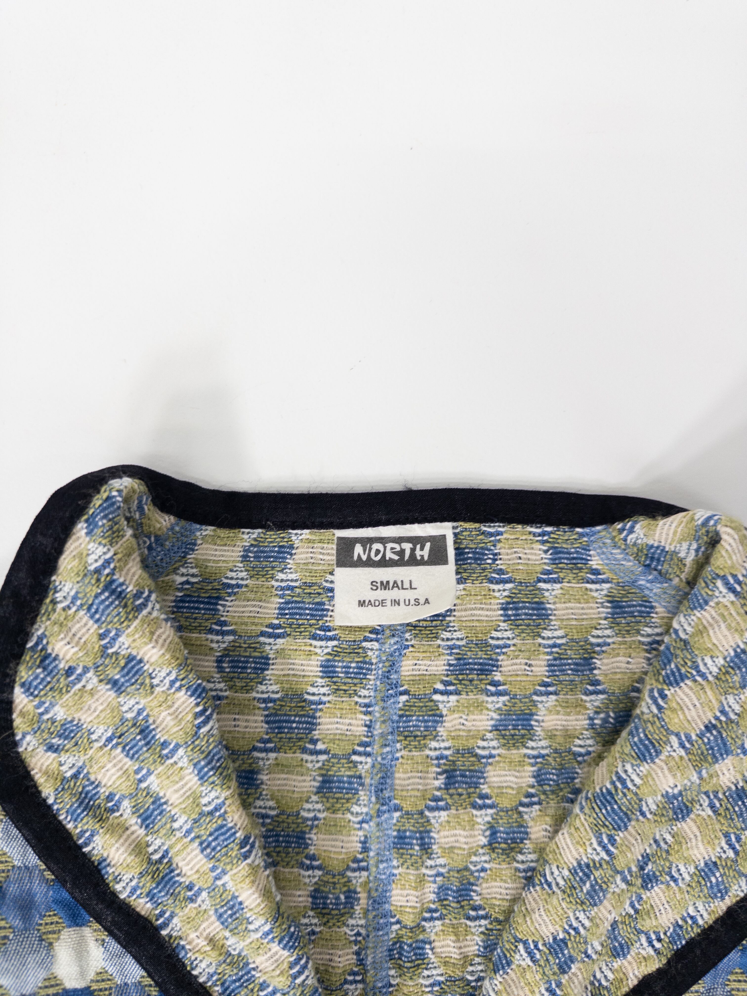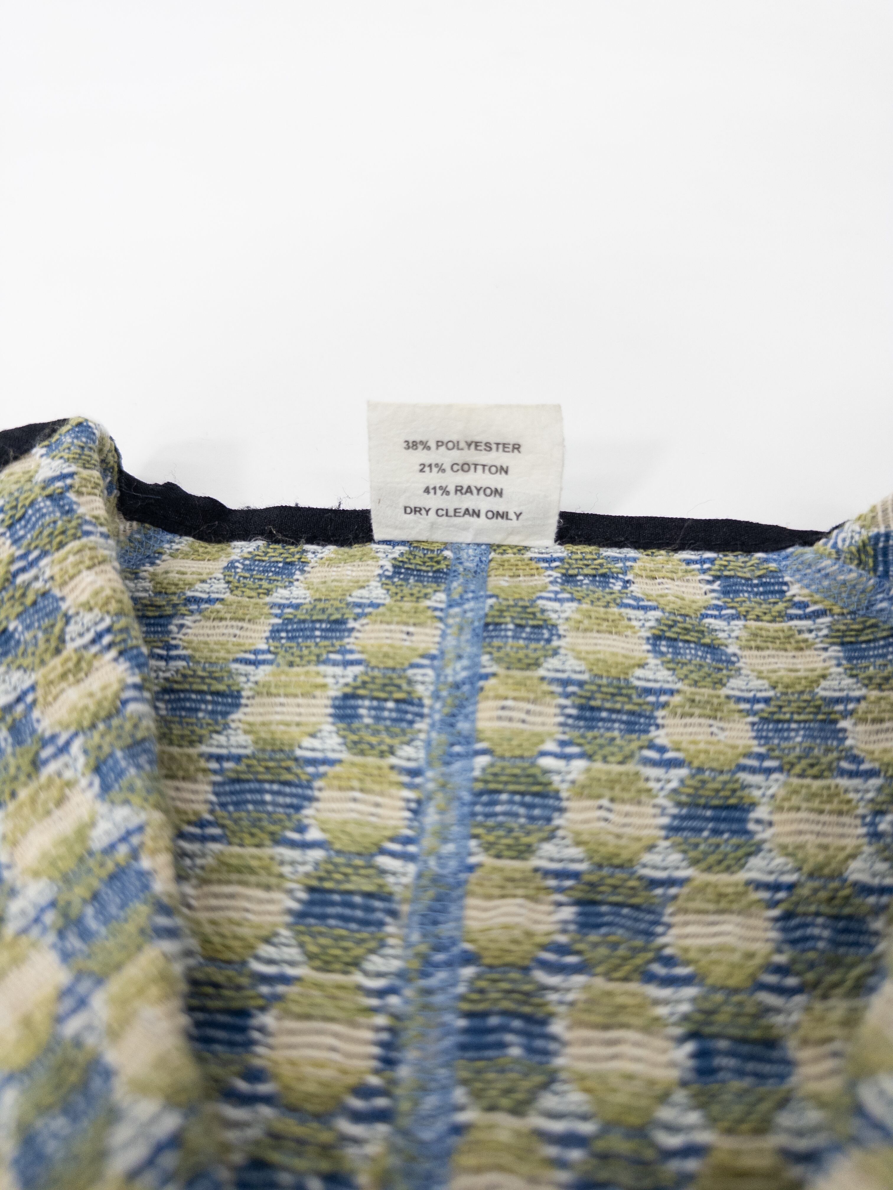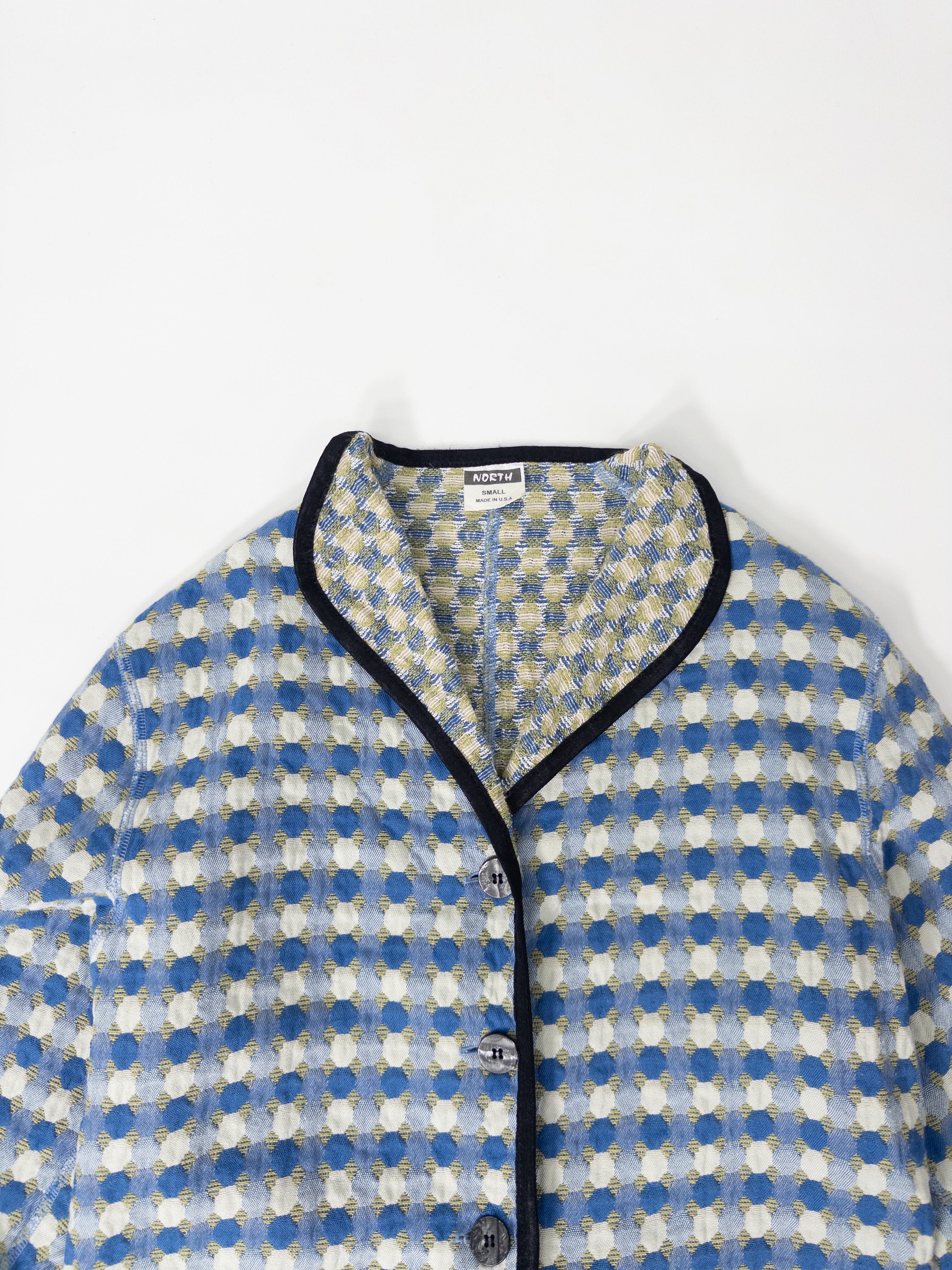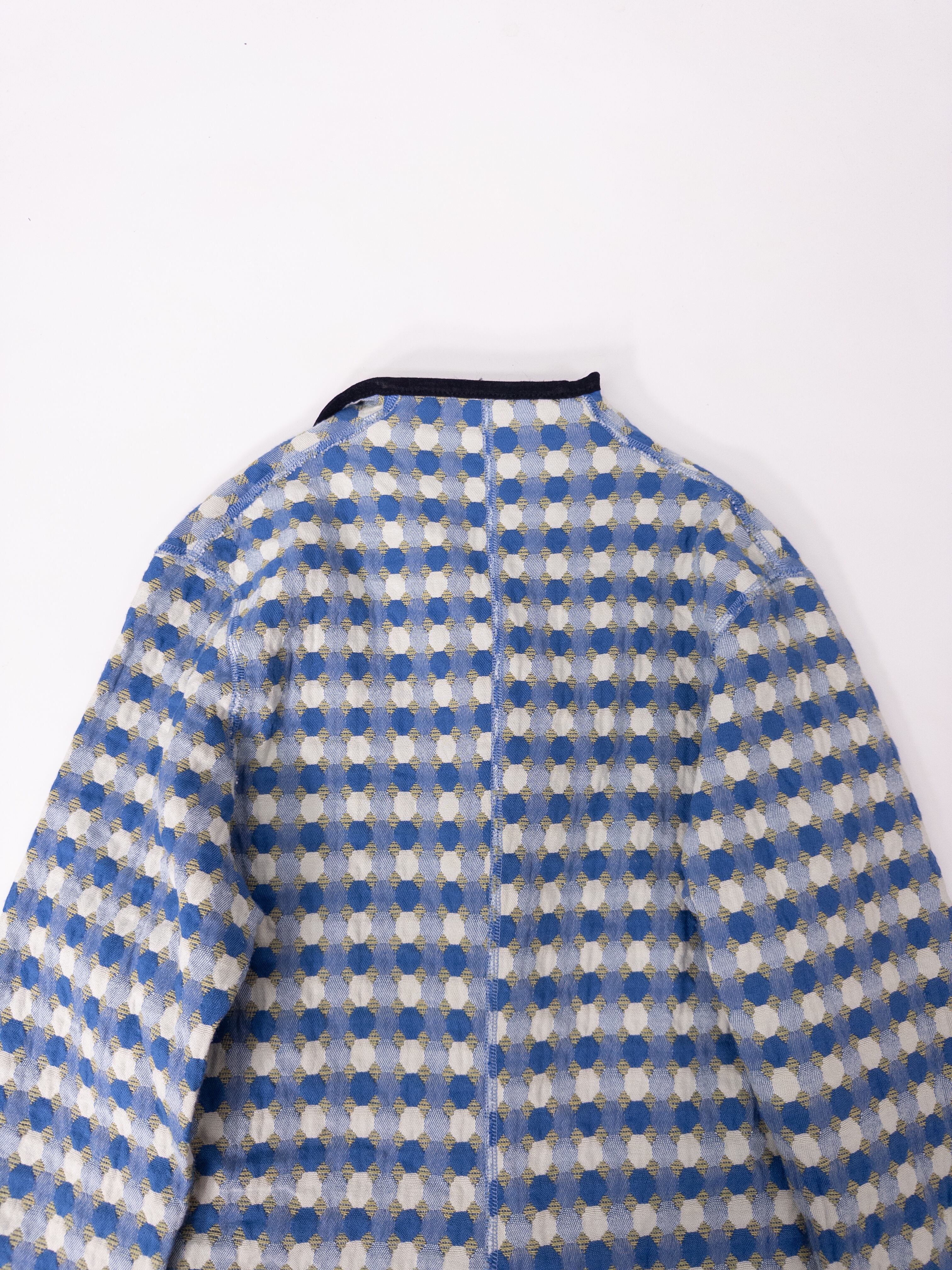 ドットとチェックが重なるジャカード織りのノーカラージャケット。ブルーとカーキをベースにしたやや渋めの配色ながら、柄のリズムと立体的な織りが軽やかな存在感を放ちます。