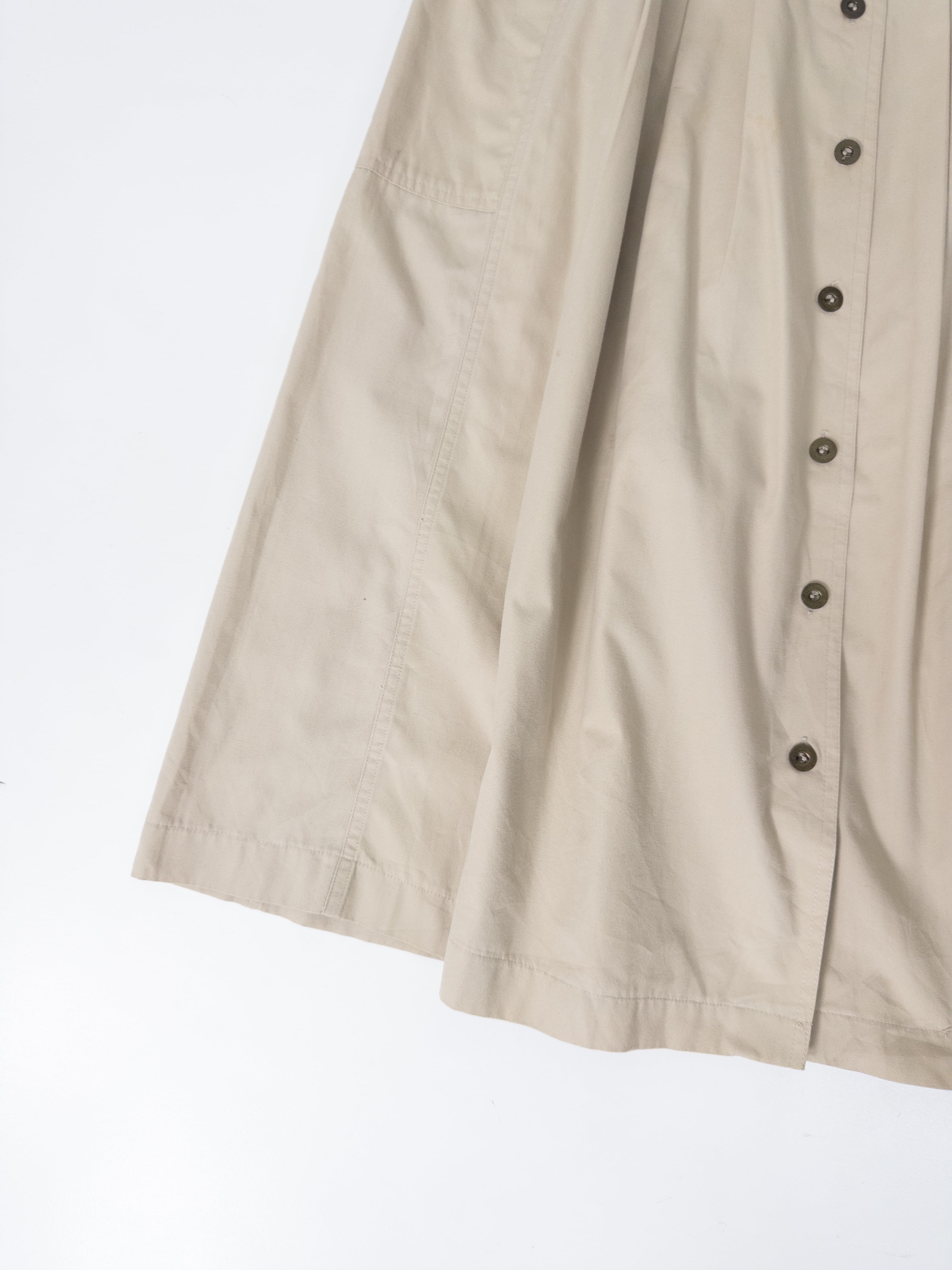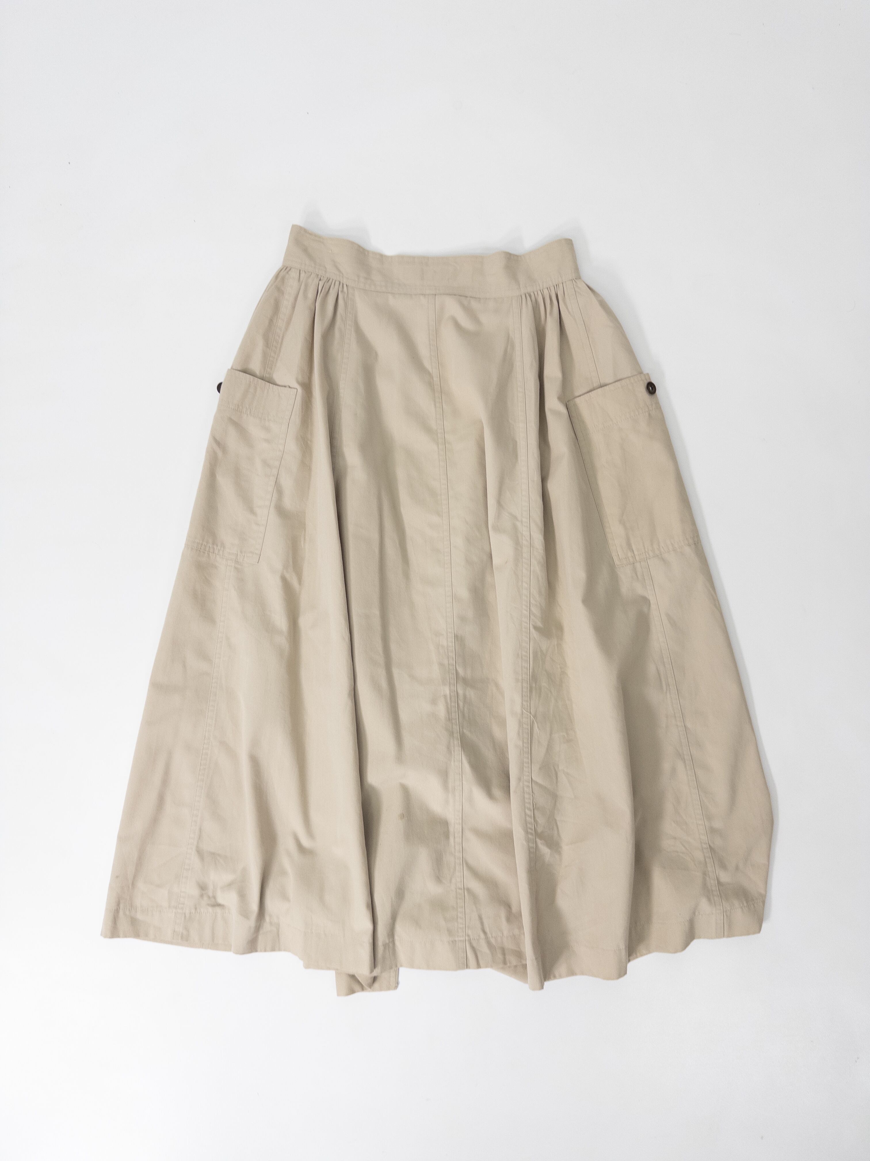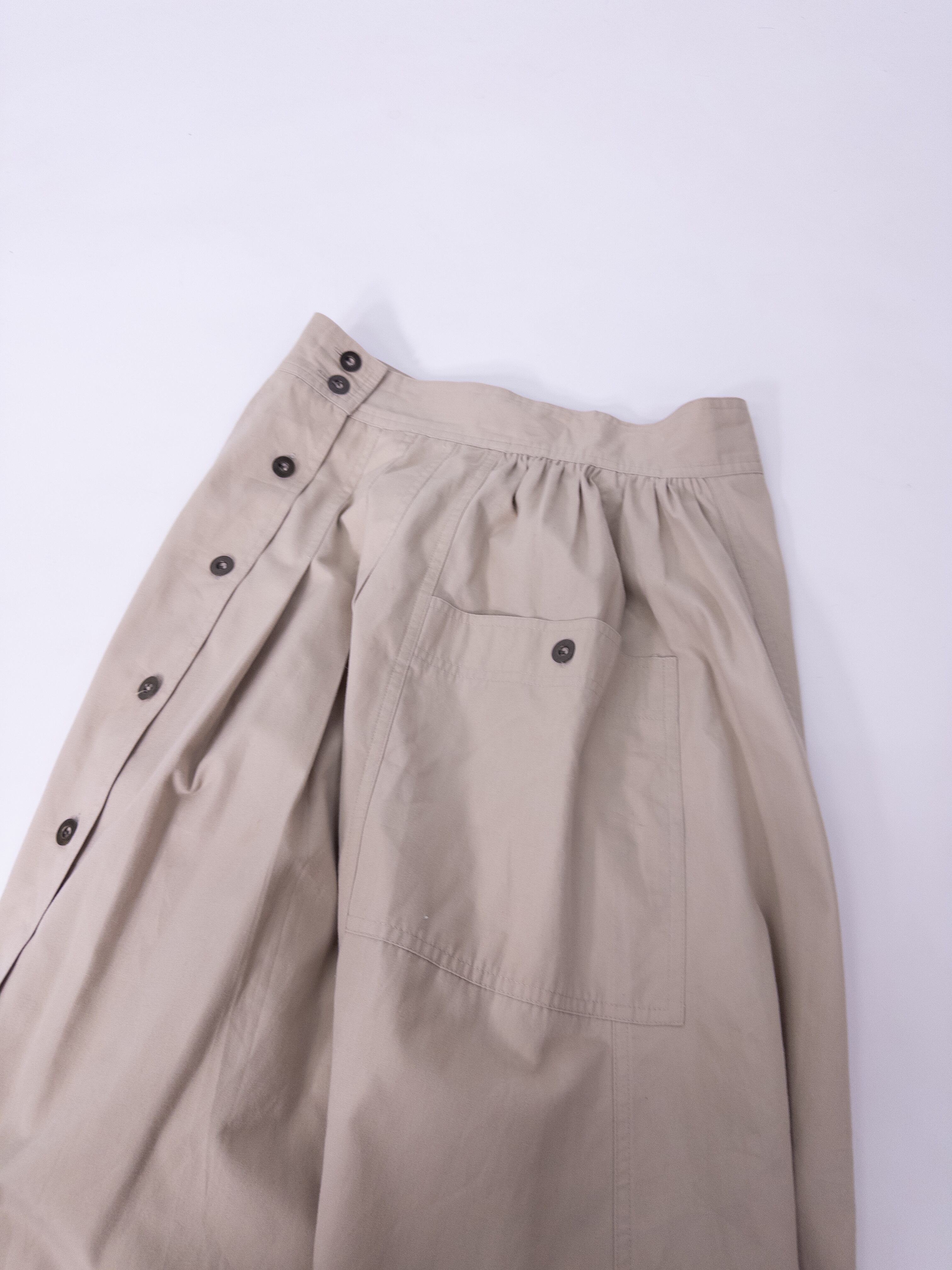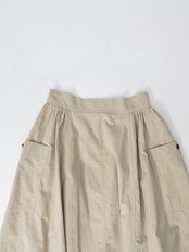 ワークディテールを効かせた、Aラインのフロントボタンスカート。目を惹くのは、サイドにあしらわれたカーゴポケット。ベーシックなベージュトーンと、ミリタリー調のディテールを掛け合わせた一本。