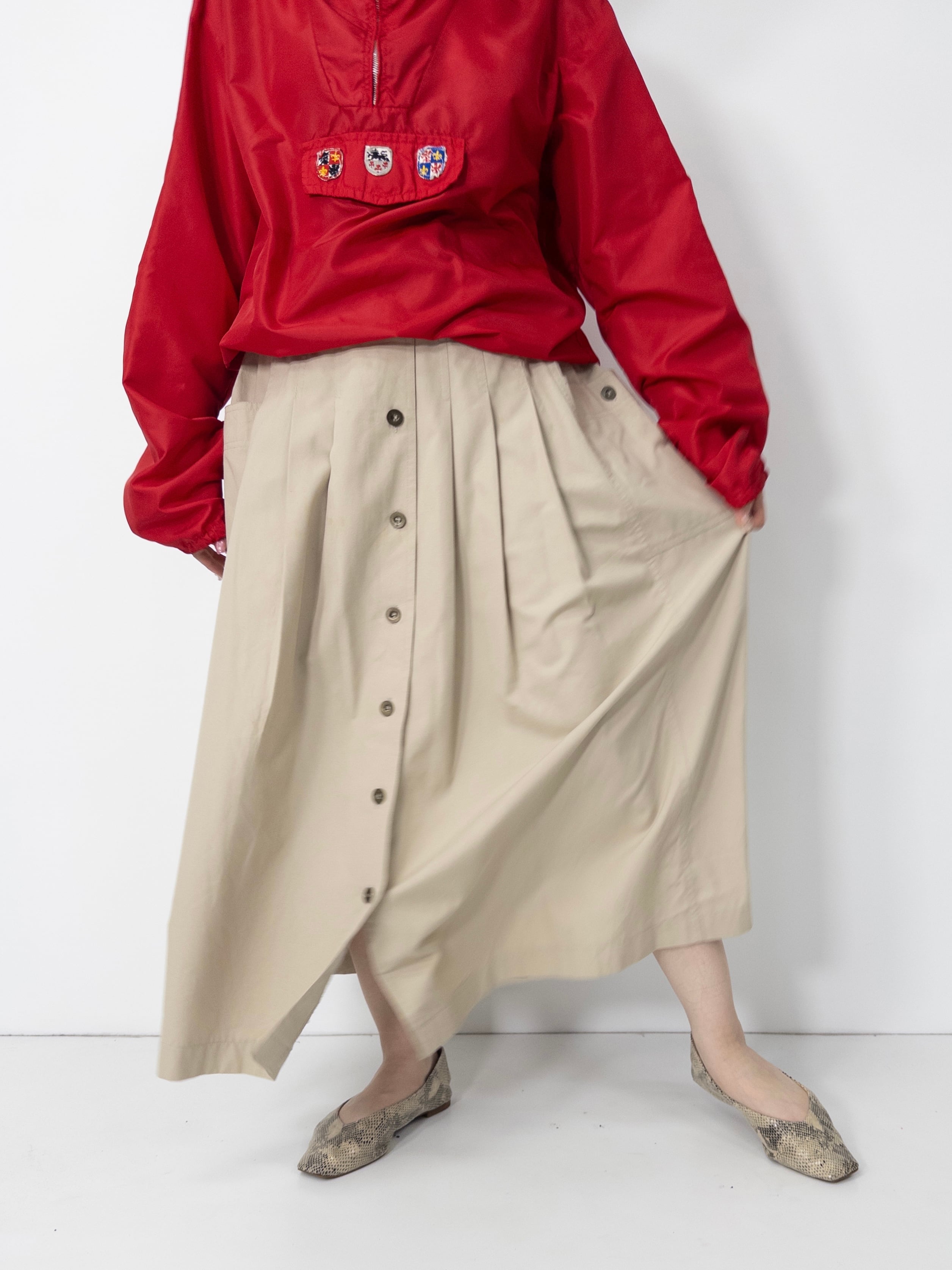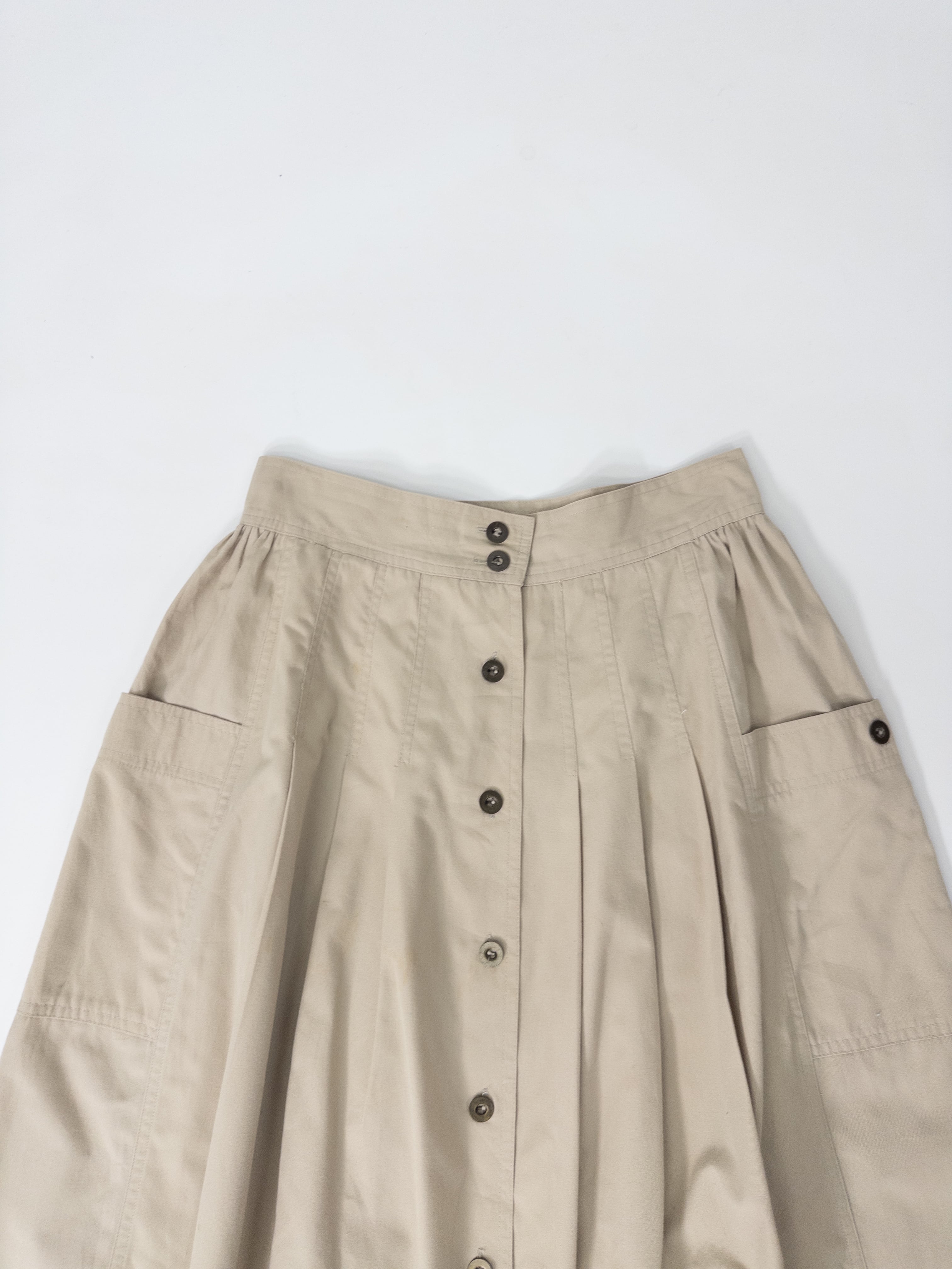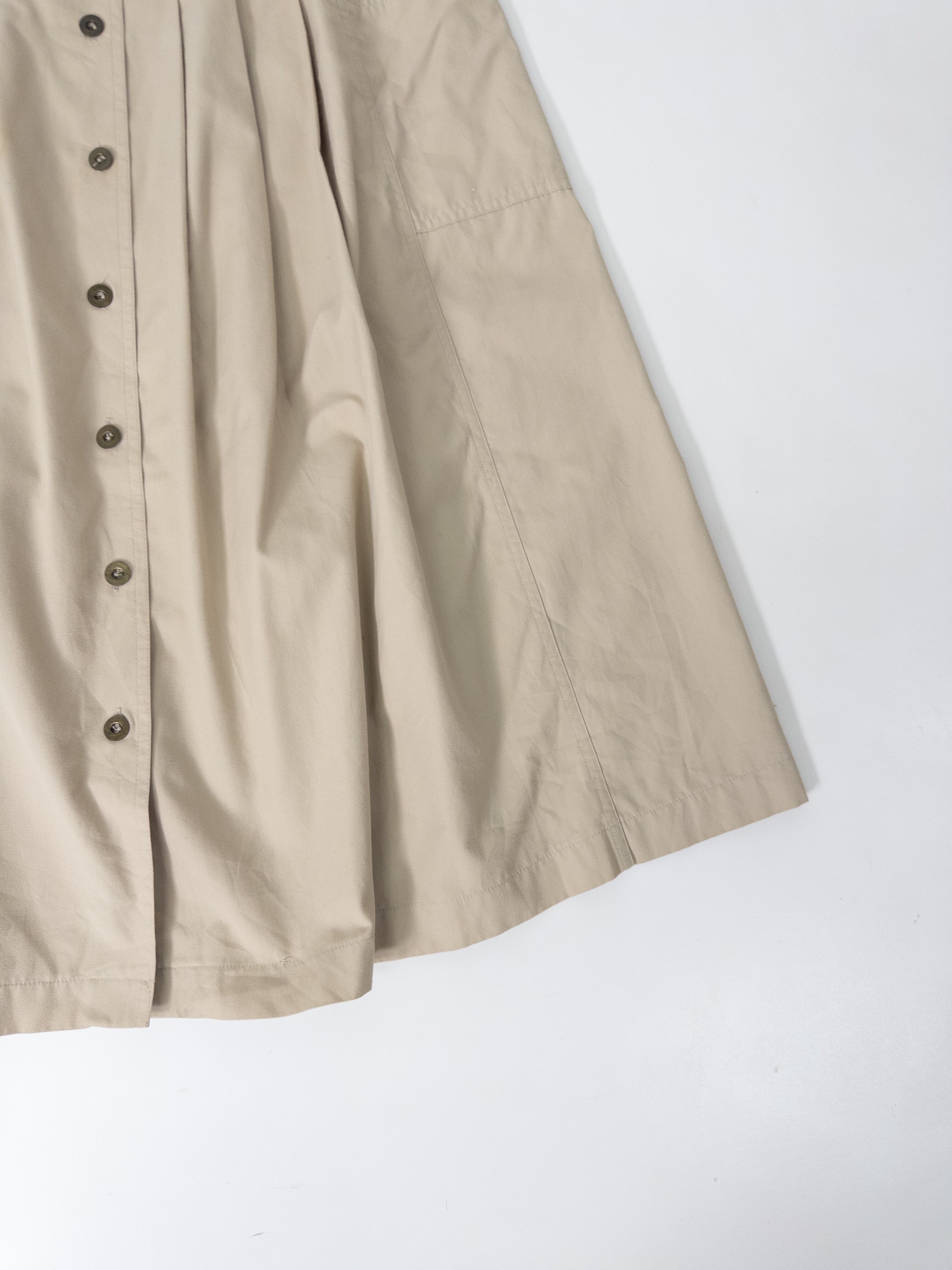 ワークディテールを効かせた、Aラインのフロントボタンスカート。目を惹くのは、サイドにあしらわれたカーゴポケット。ベーシックなベージュトーンと、ミリタリー調のディテールを掛け合わせた一本。