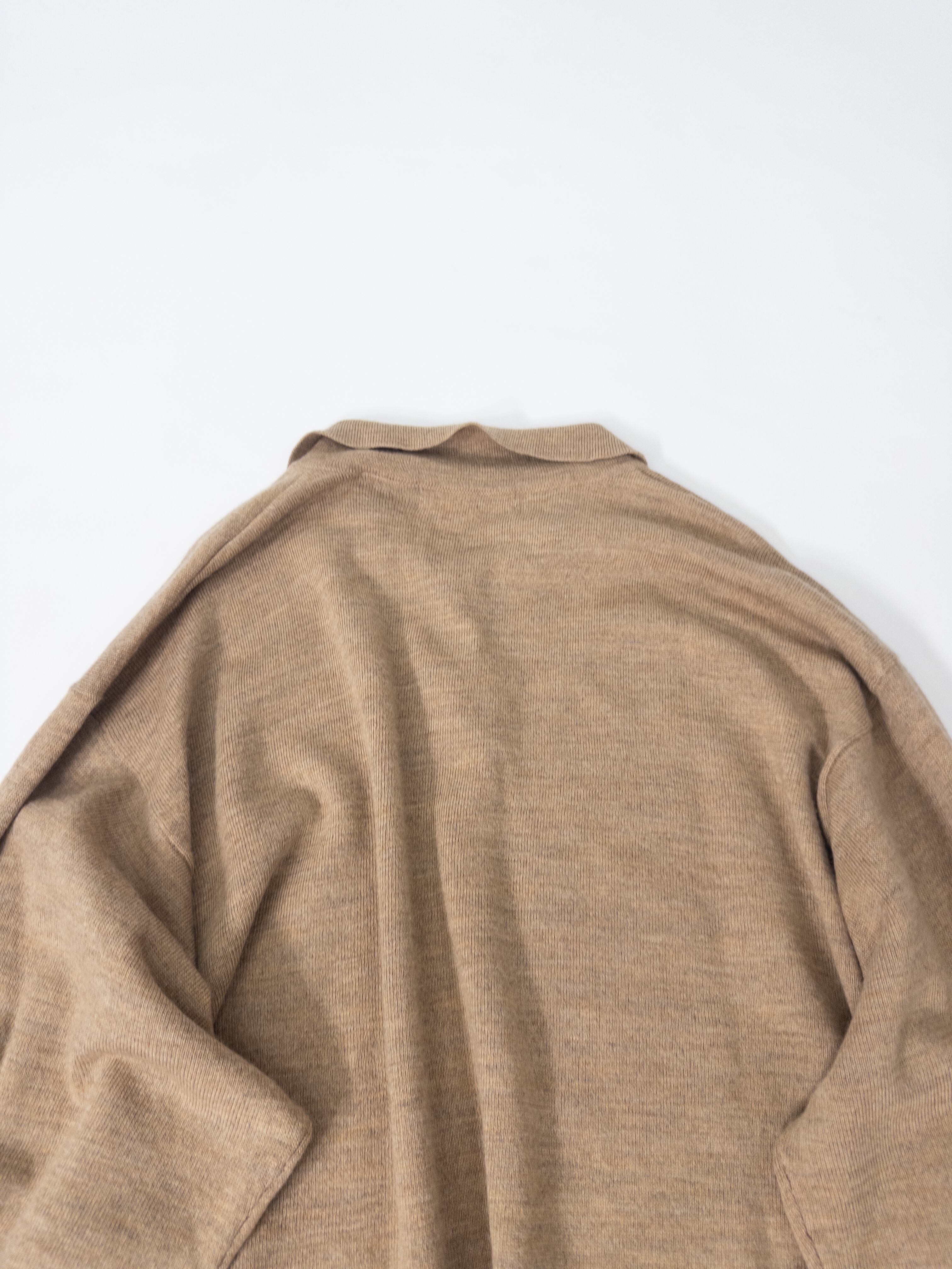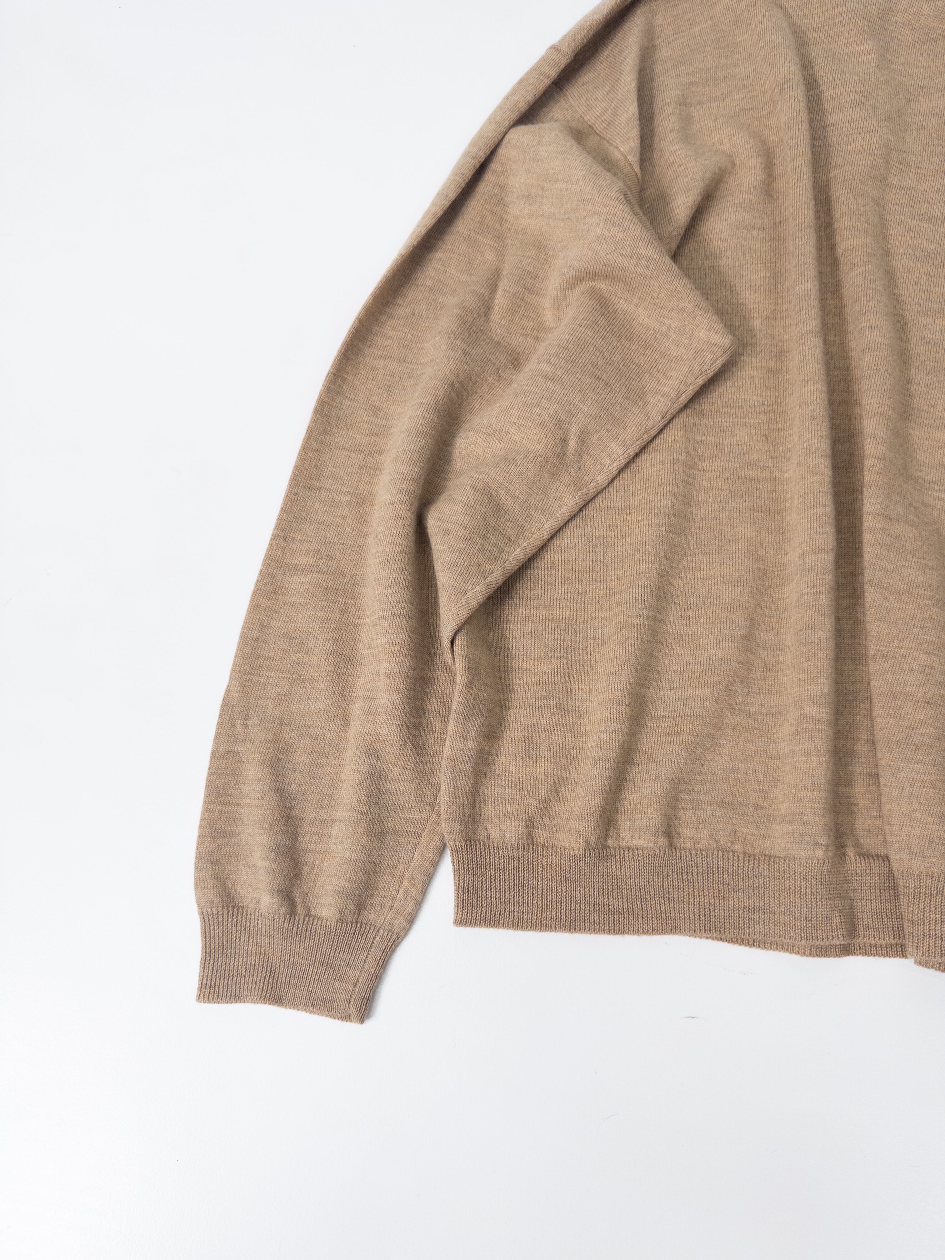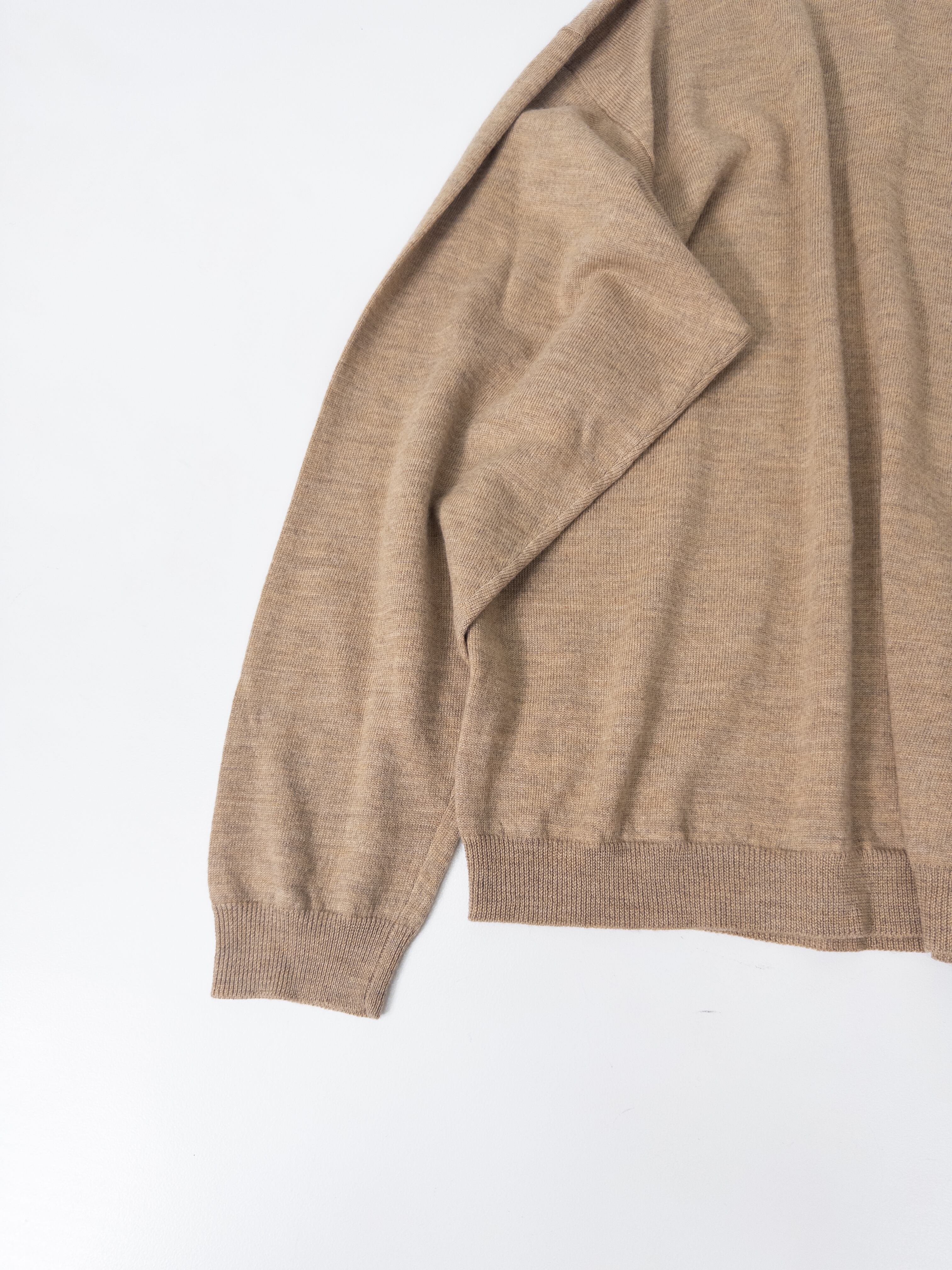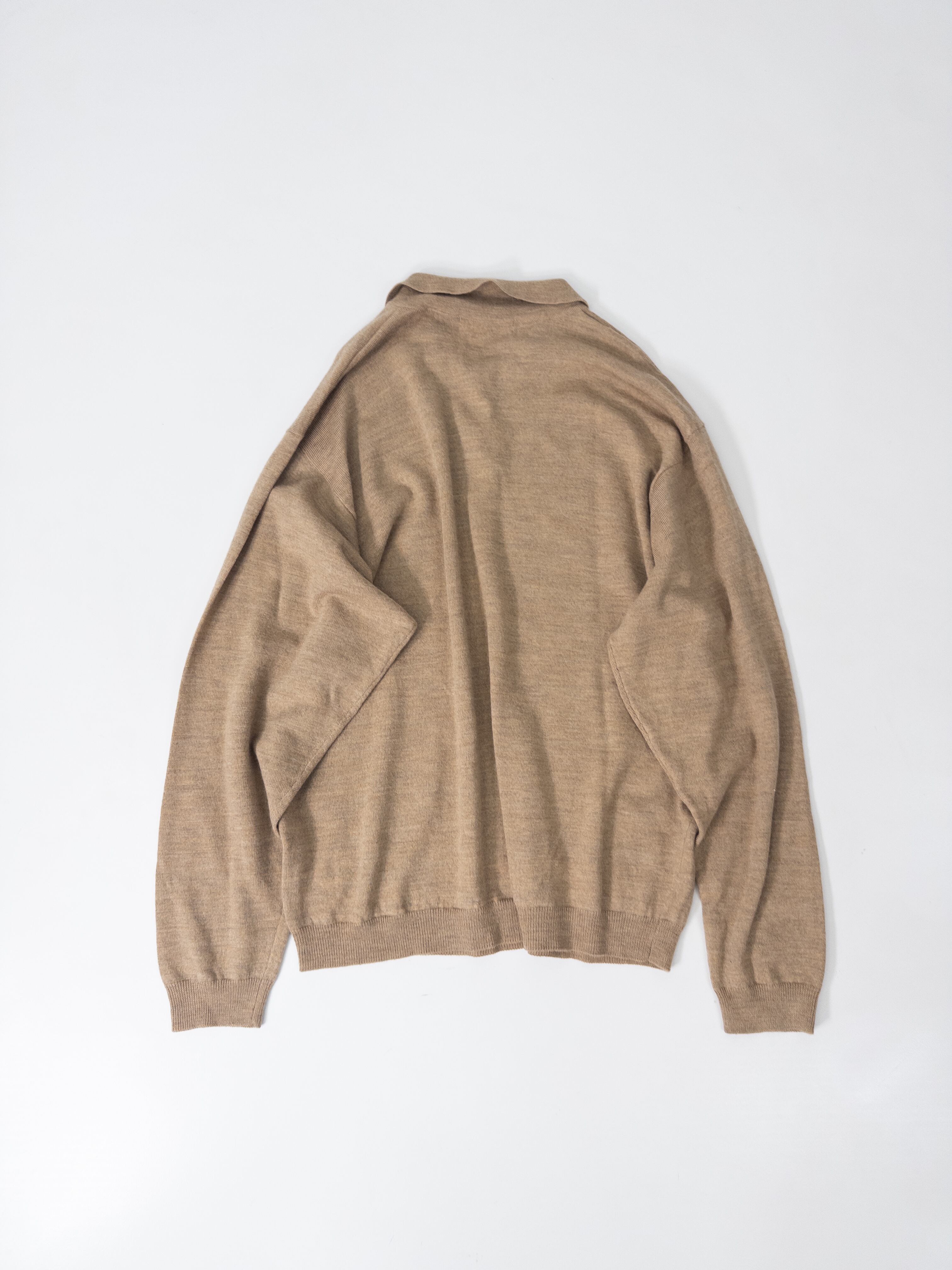 肌馴染みの良いサンドベージュが魅力のポロタイプニット。素材はWoolmark認証付きの100%エクストラファインメリノウールで、滑らかな手触りと通気性の良さが特長。襟付きの品のあるデザインながら、リブで程よく抜け感も演出。イギリス製という背景も含めて、日常に寄り添う上質な1枚。