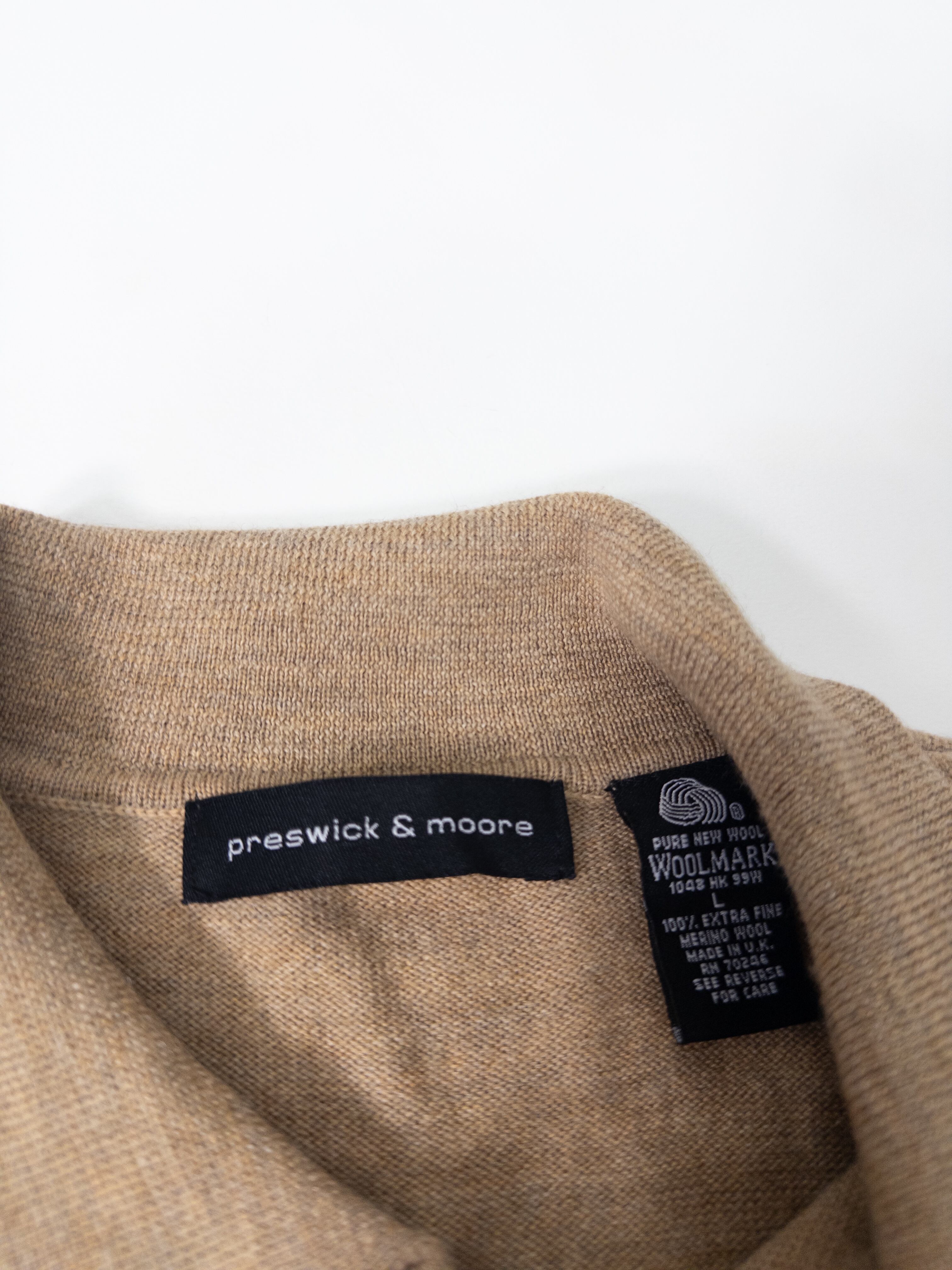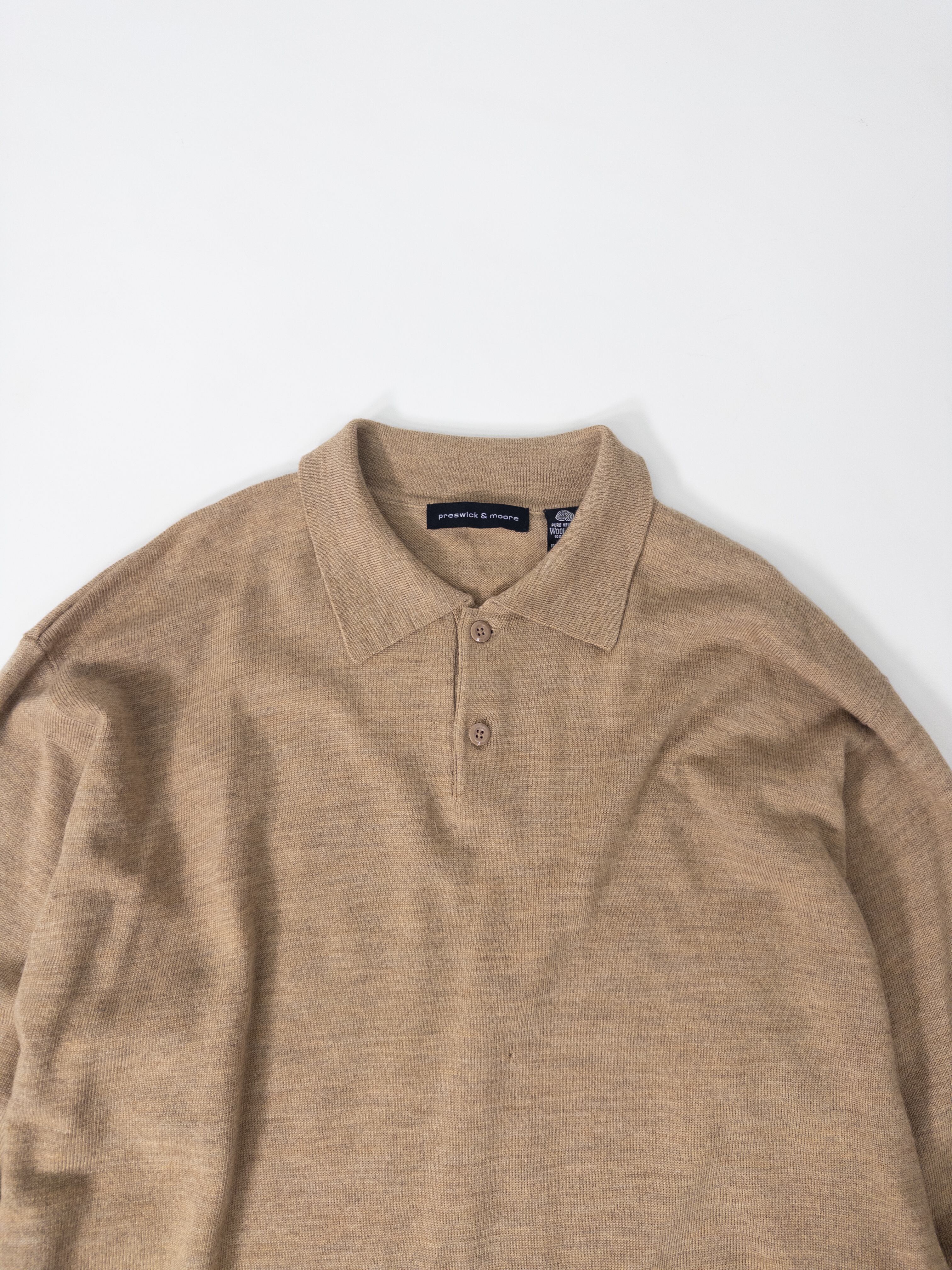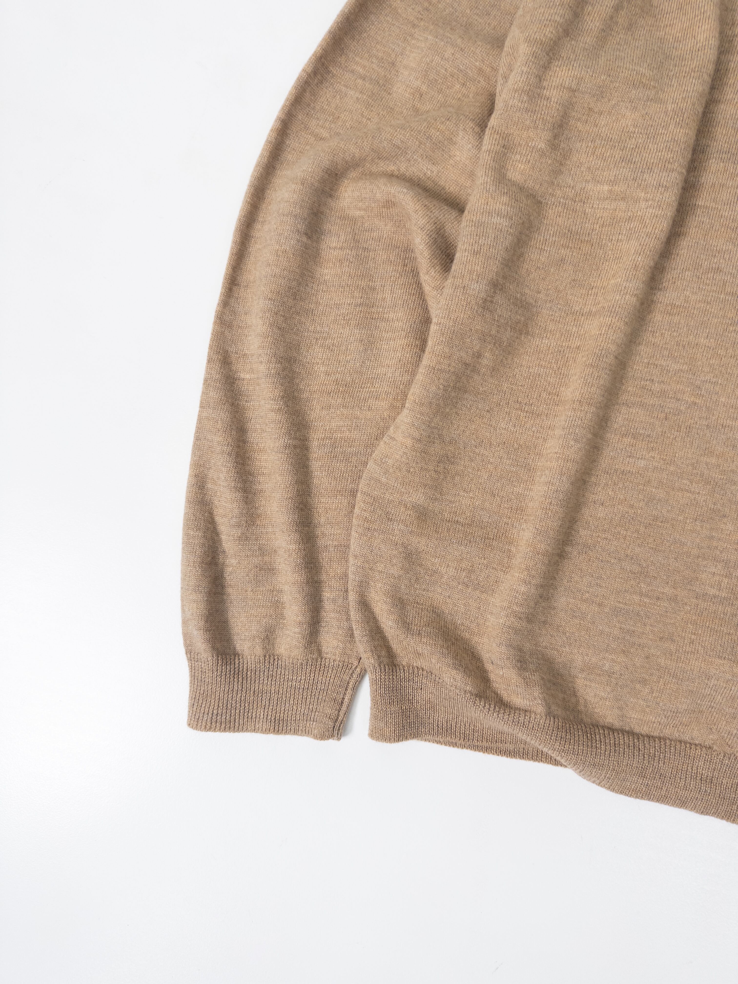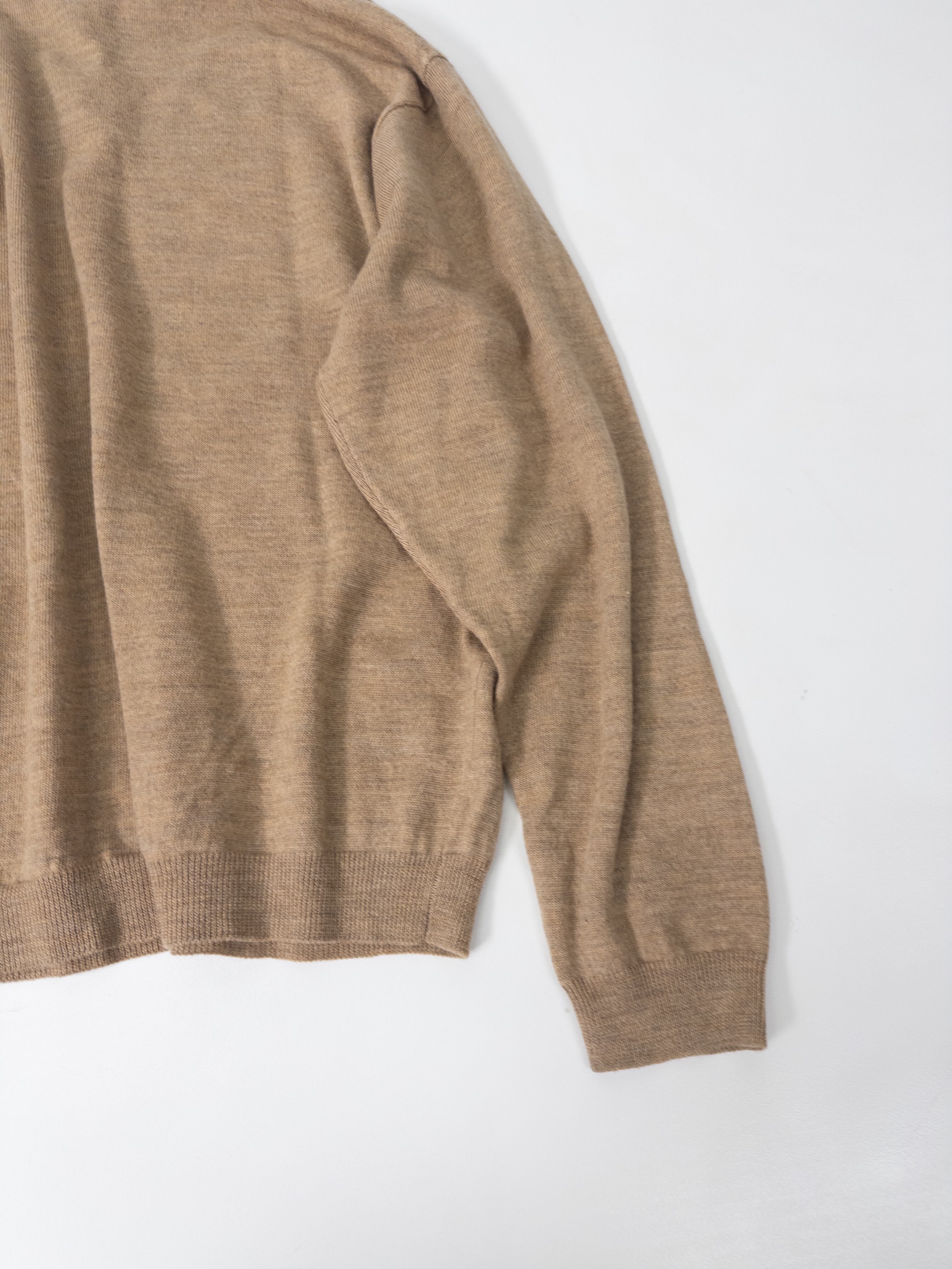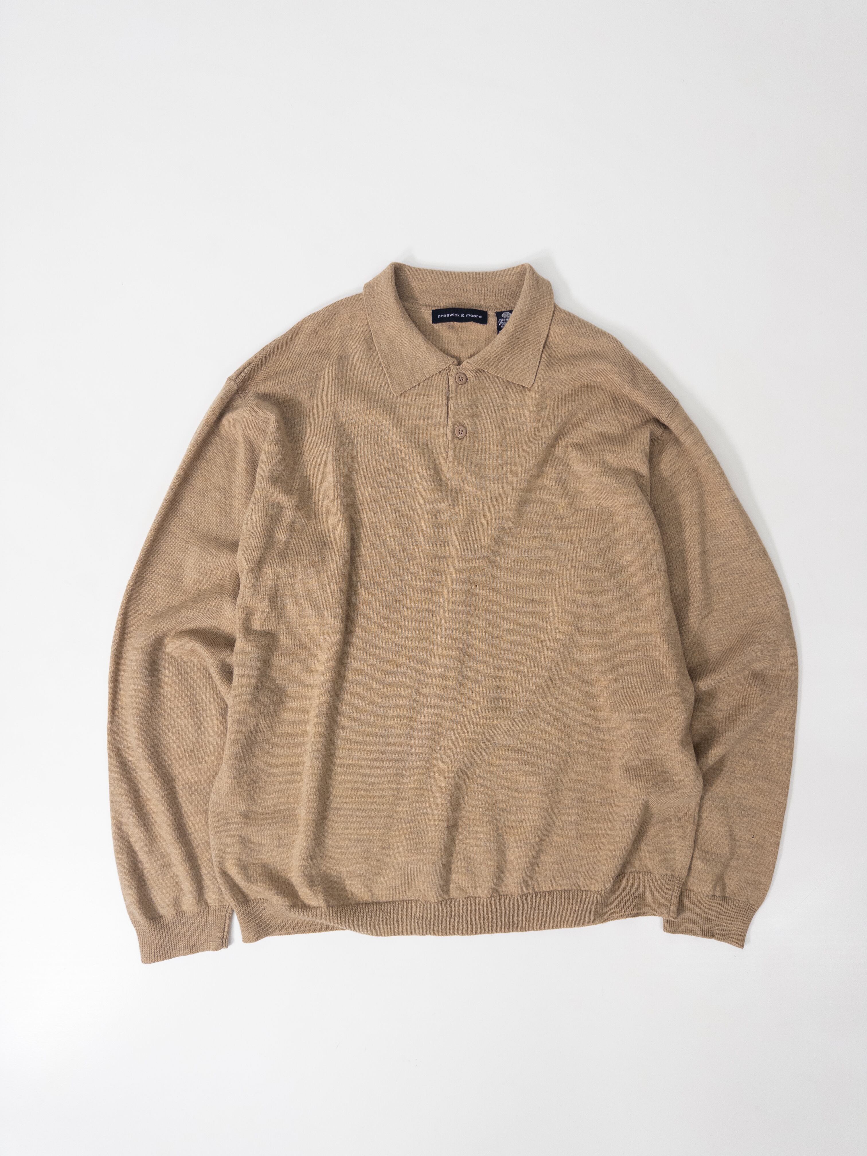肌馴染みの良いサンドベージュが魅力のポロタイプニット。素材はWoolmark認証付きの100%エクストラファインメリノウールで、滑らかな手触りと通気性の良さが特長。襟付きの品のあるデザインながら、リブで程よく抜け感も演出。イギリス製という背景も含めて、日常に寄り添う上質な1枚。