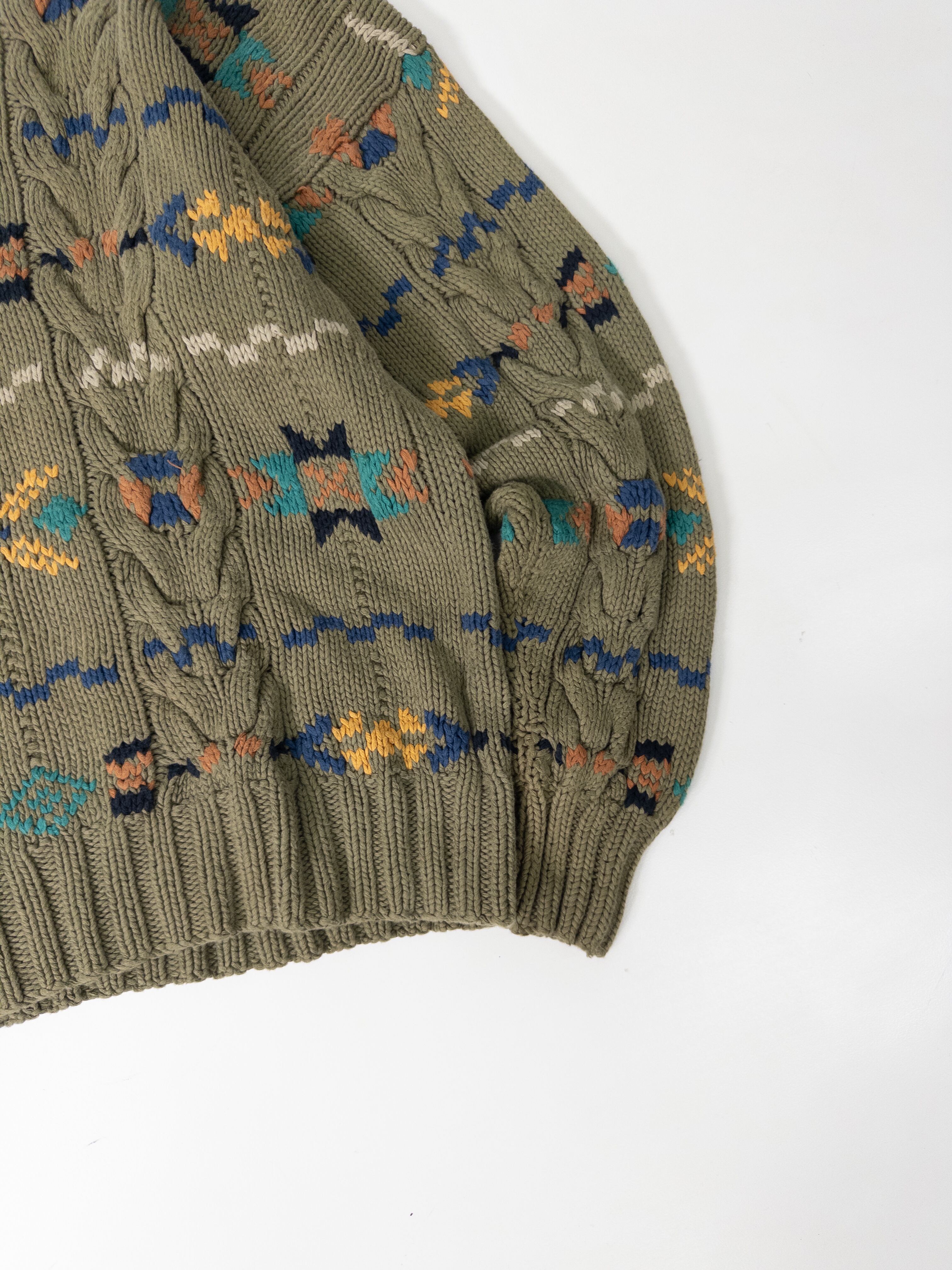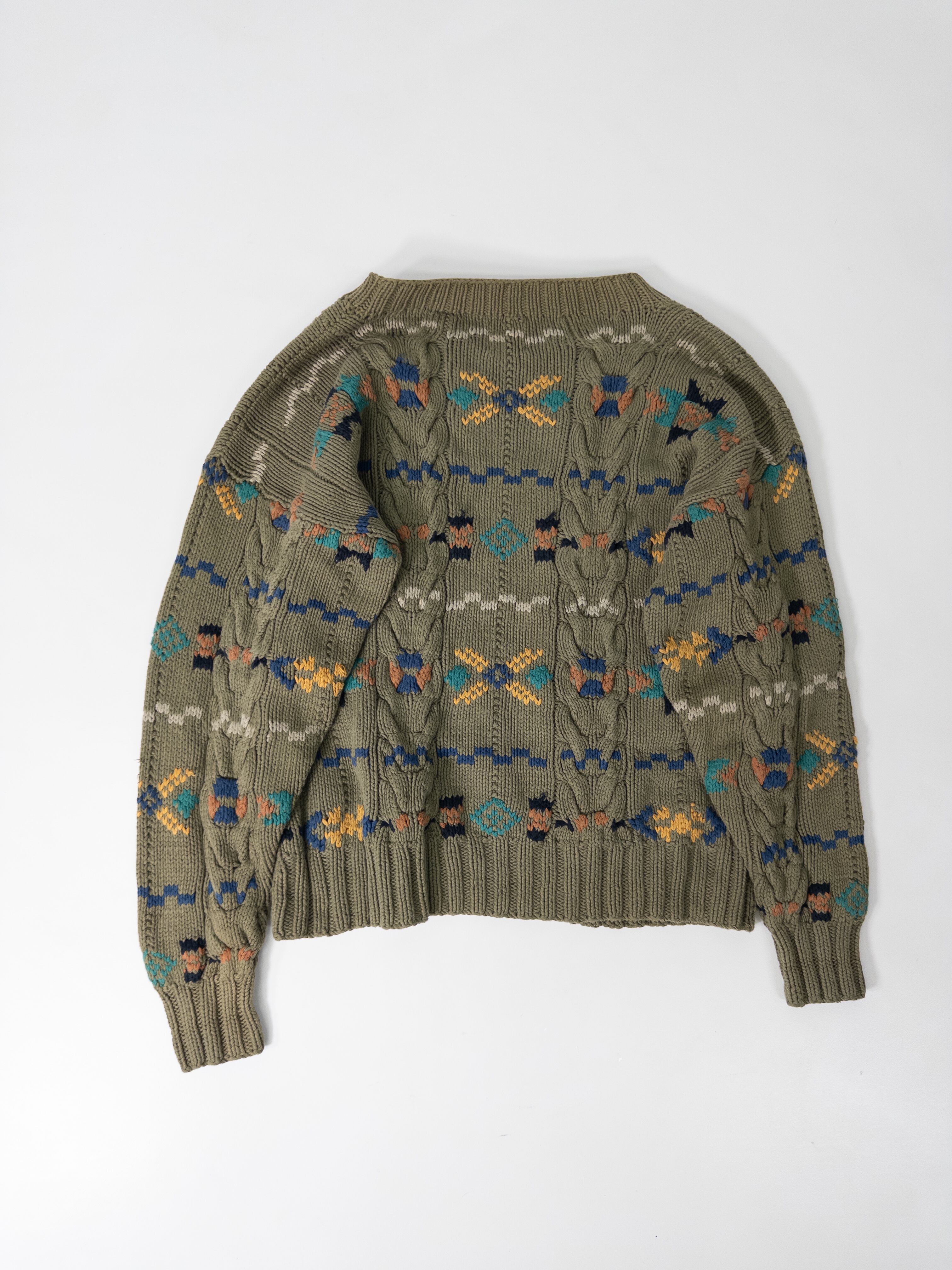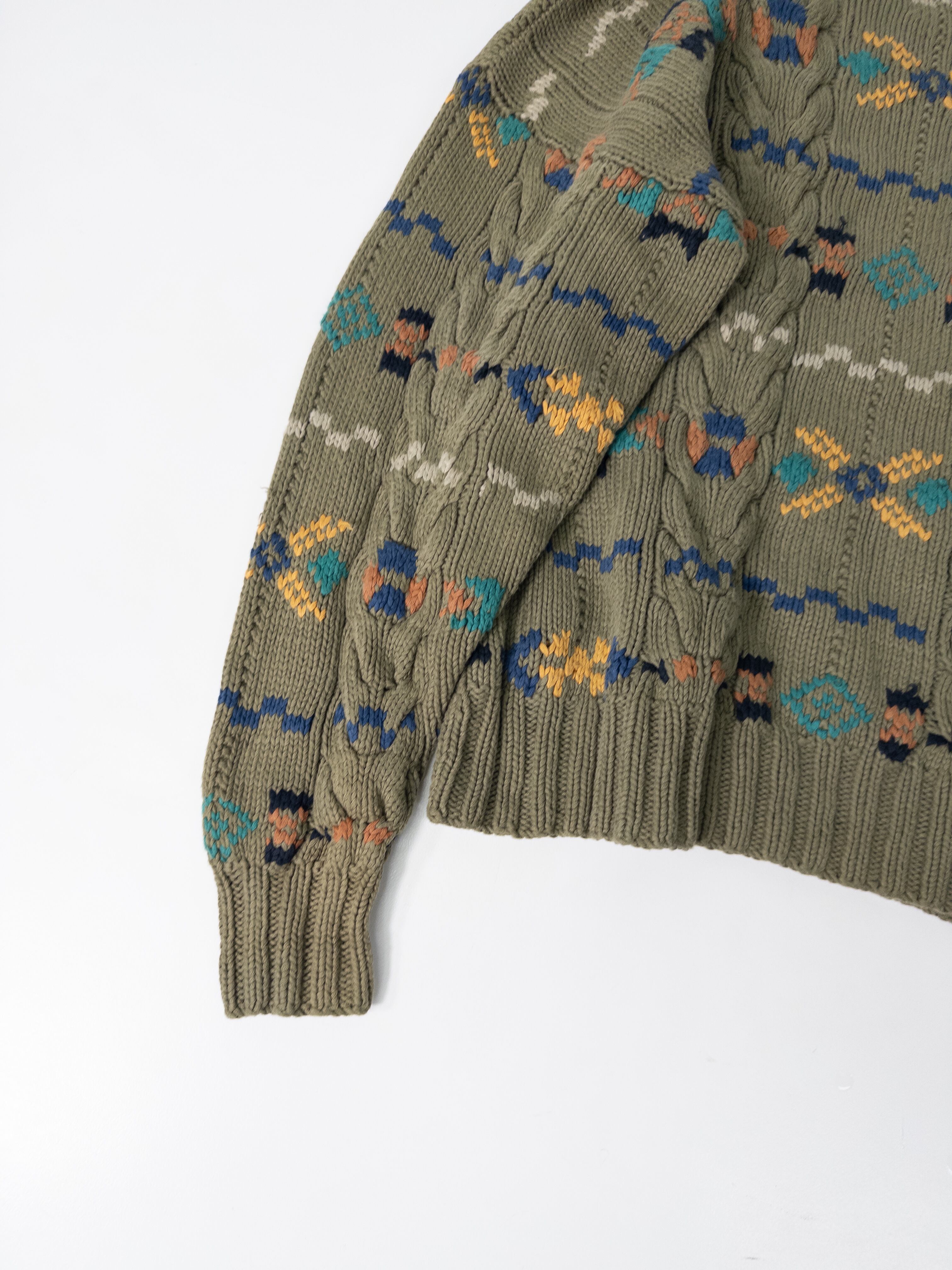 表面的には90sらしい存在感ですが、注目すべきは編みのバランス。ローゲージのケーブルに細かなフェアアイルを重ねることで、立体感と奥行きを同時に作り出しています。単なる装飾ではなく、糸の太さや撚りの違いが光の加減で陰影を生み、角度によって見え方が変わるのもポイント。