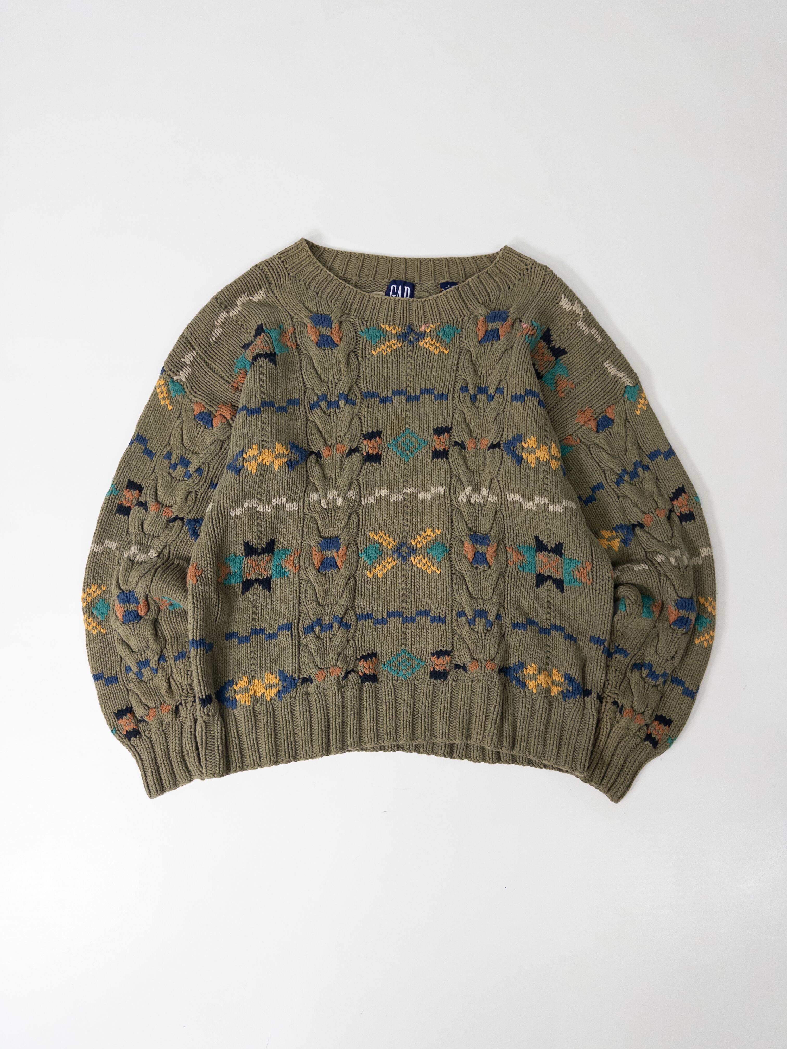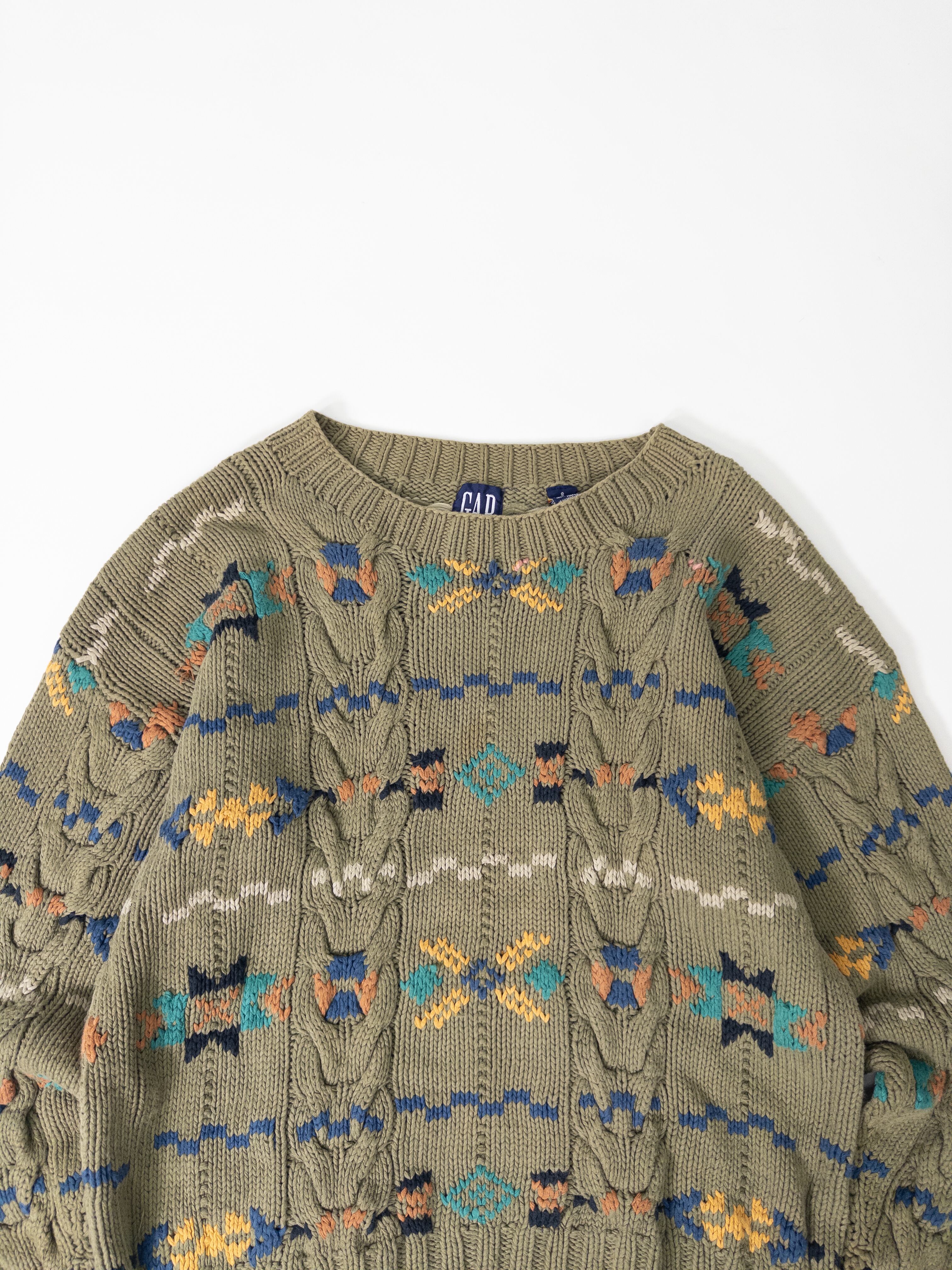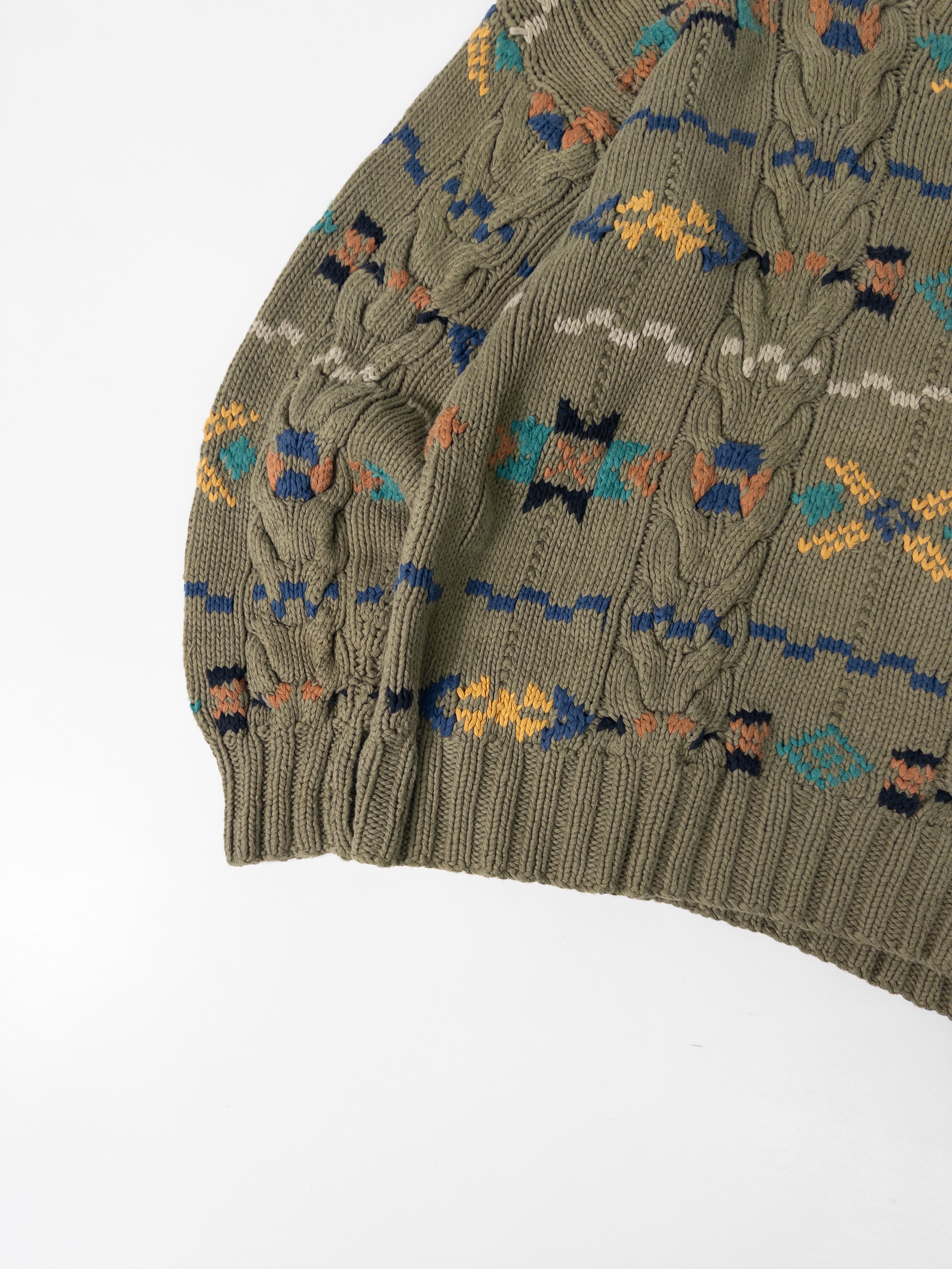 表面的には90sらしい存在感ですが、注目すべきは編みのバランス。ローゲージのケーブルに細かなフェアアイルを重ねることで、立体感と奥行きを同時に作り出しています。単なる装飾ではなく、糸の太さや撚りの違いが光の加減で陰影を生み、角度によって見え方が変わるのもポイント。