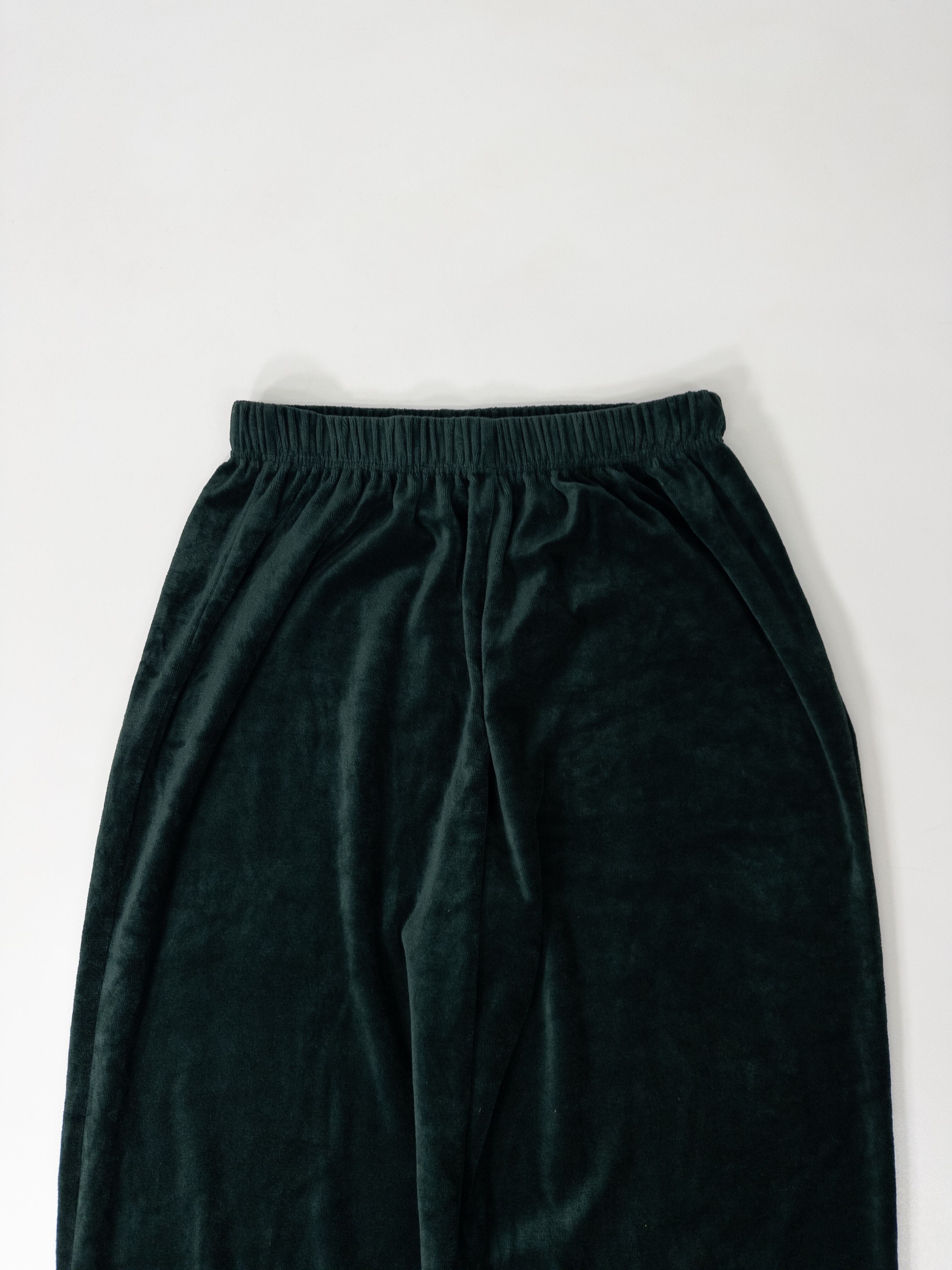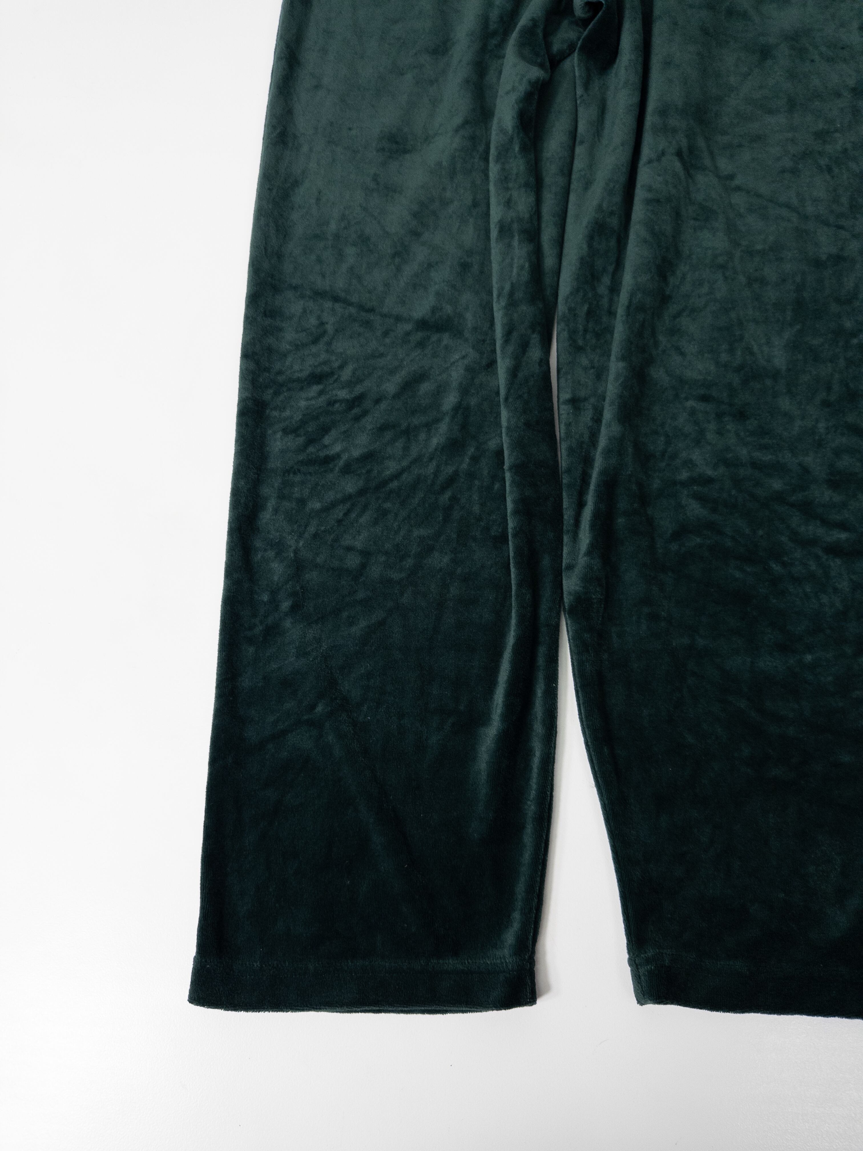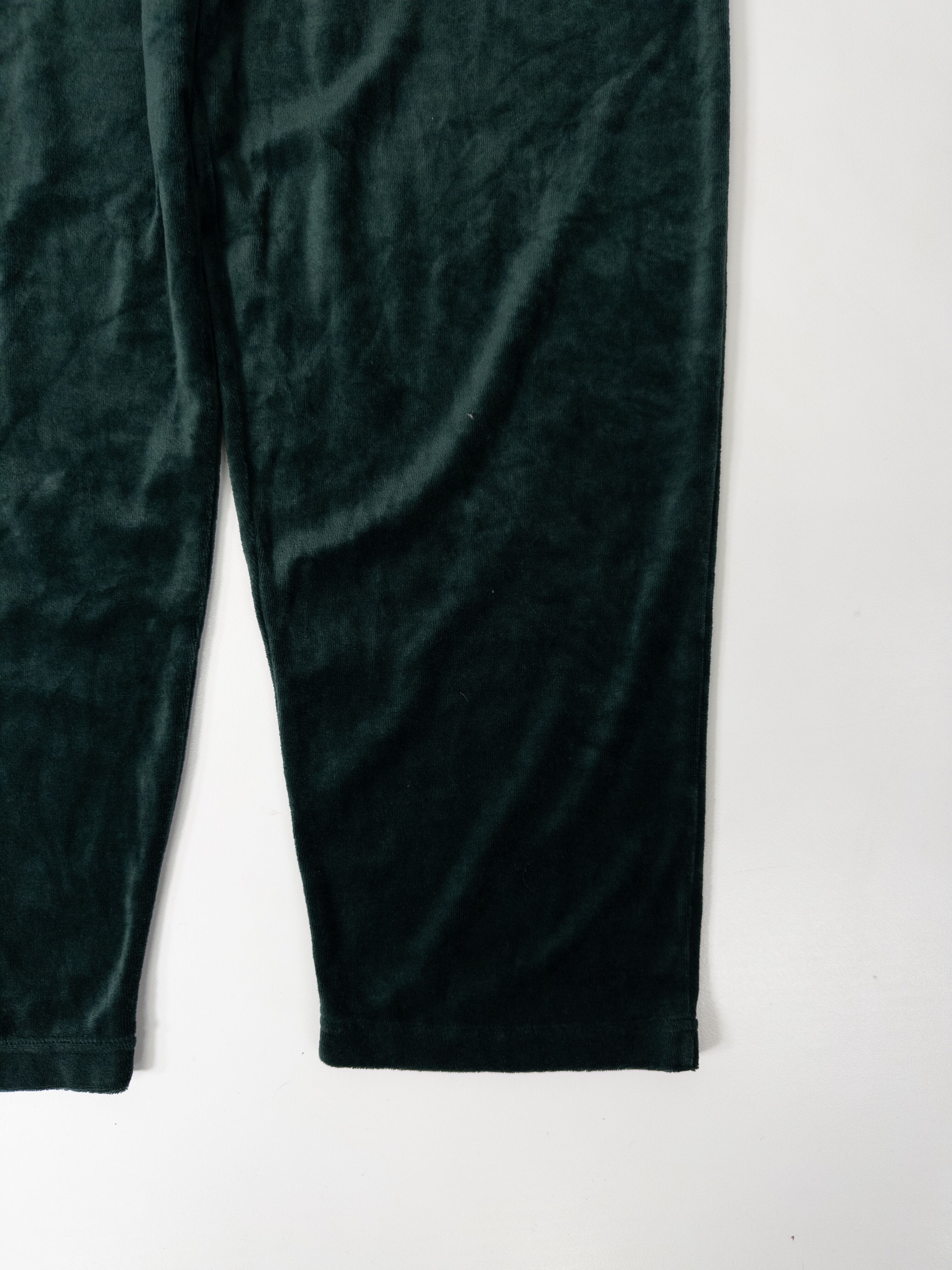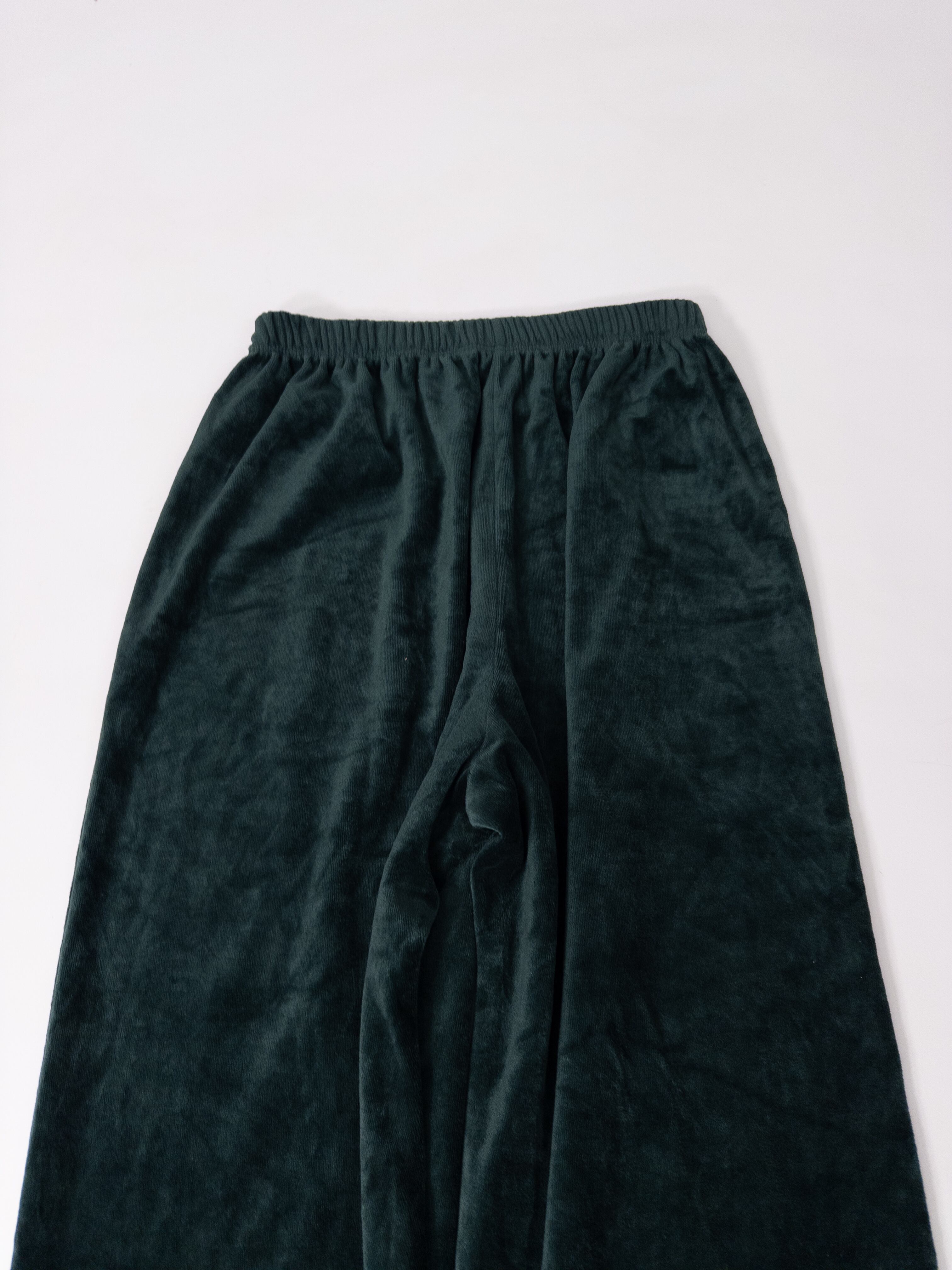深い森のようなダークグリーンのベロアパンツ。柔らかな光沢と落ち感があり、ラフに穿くだけでドレープが生まれる一本です。