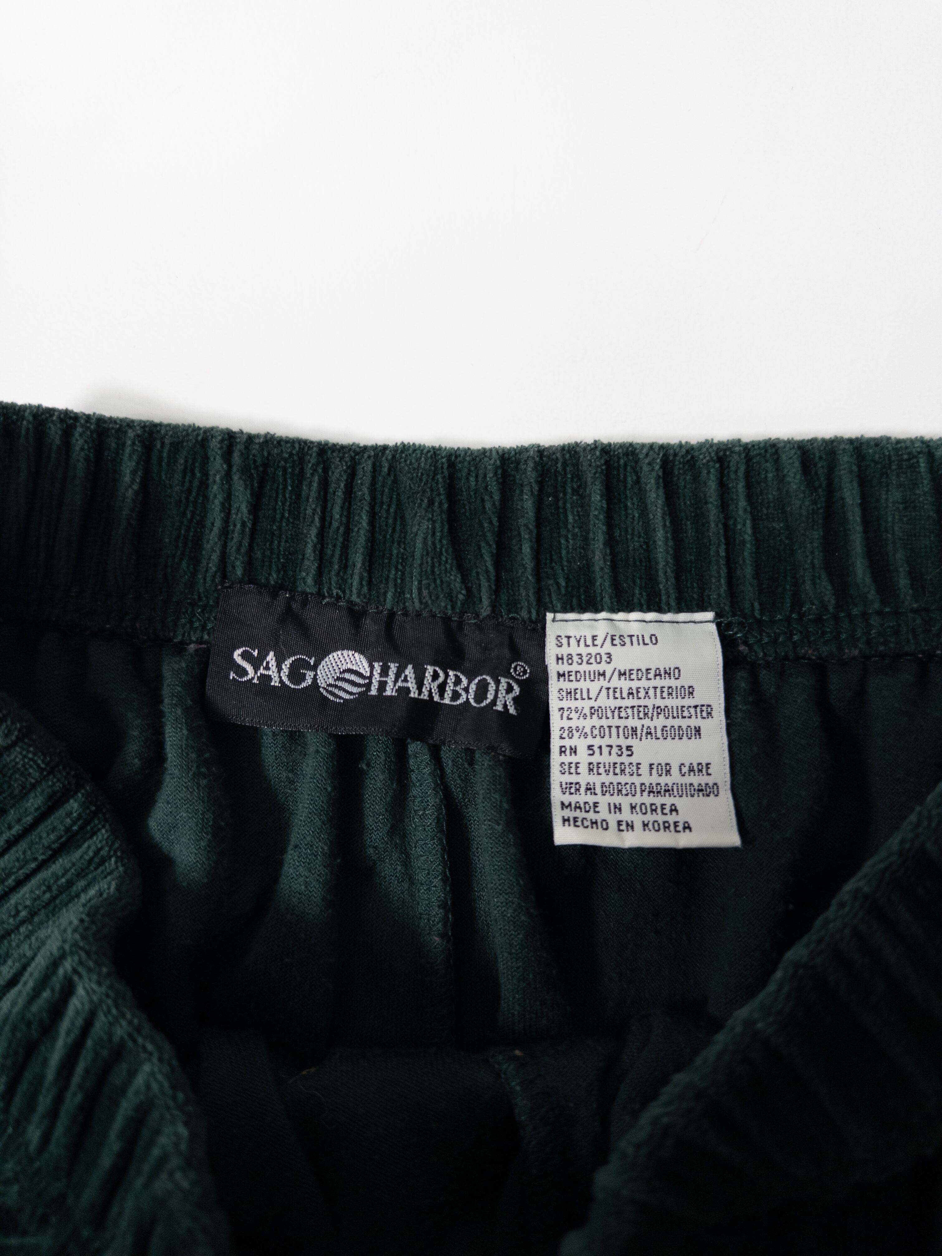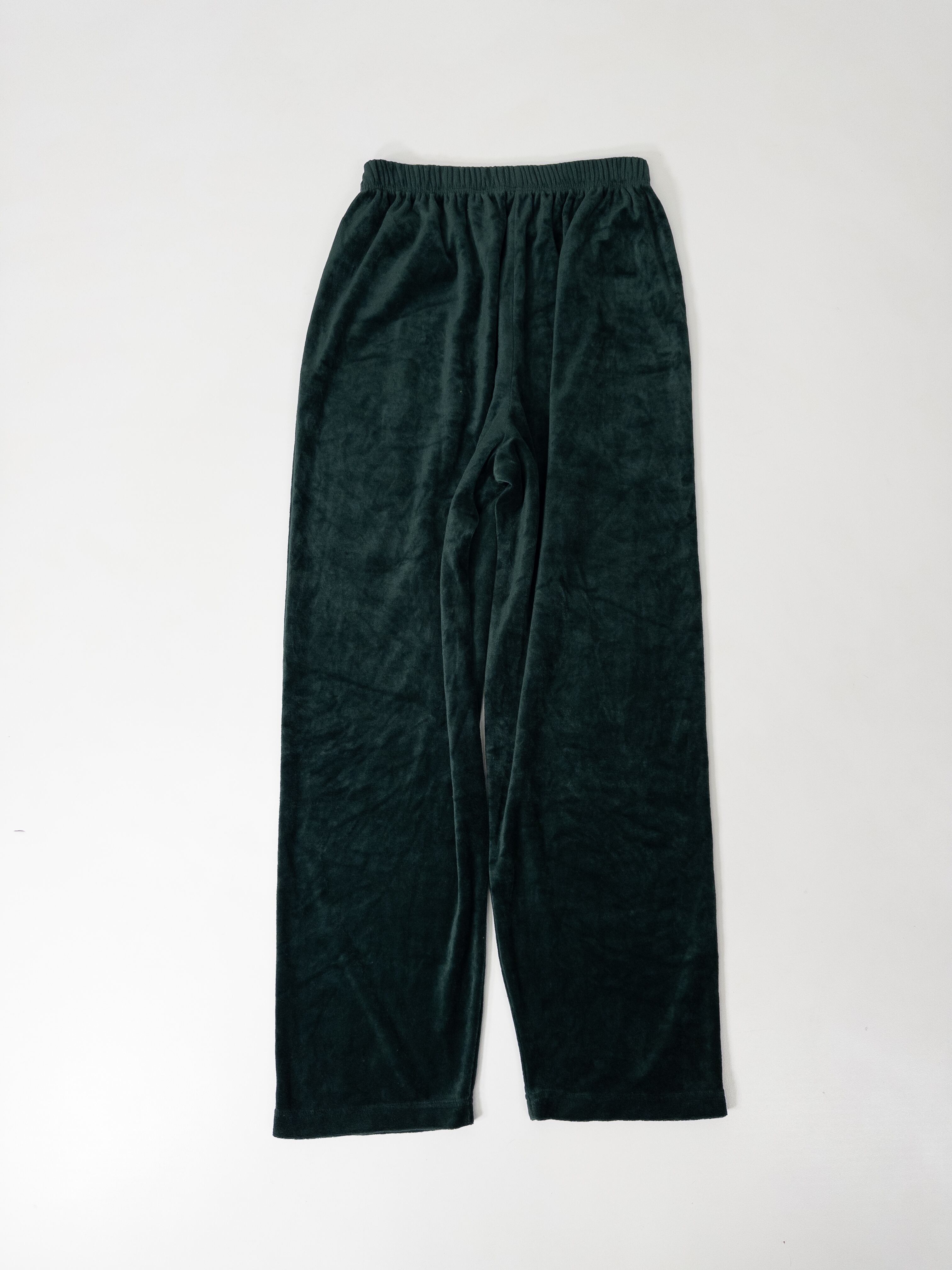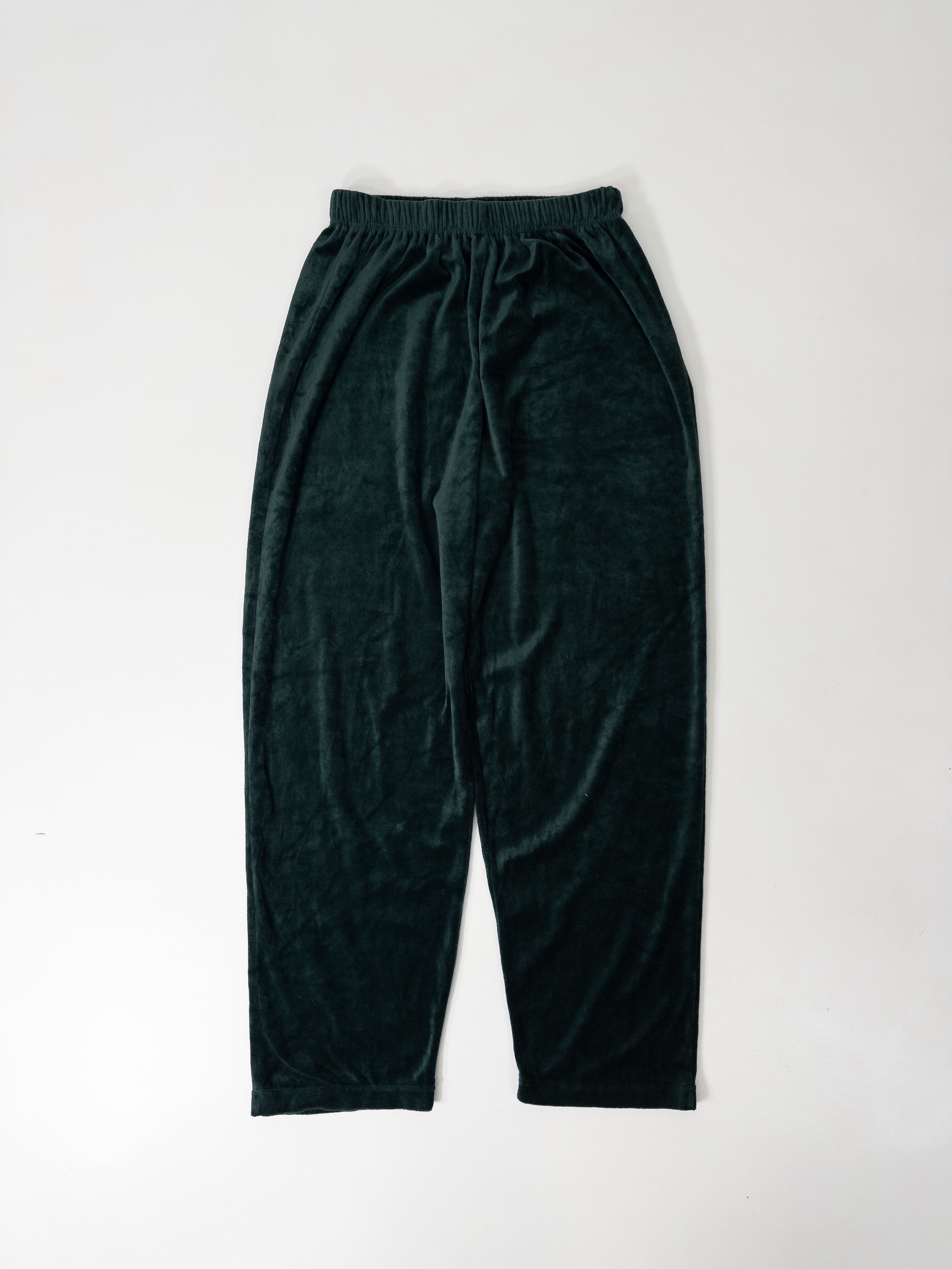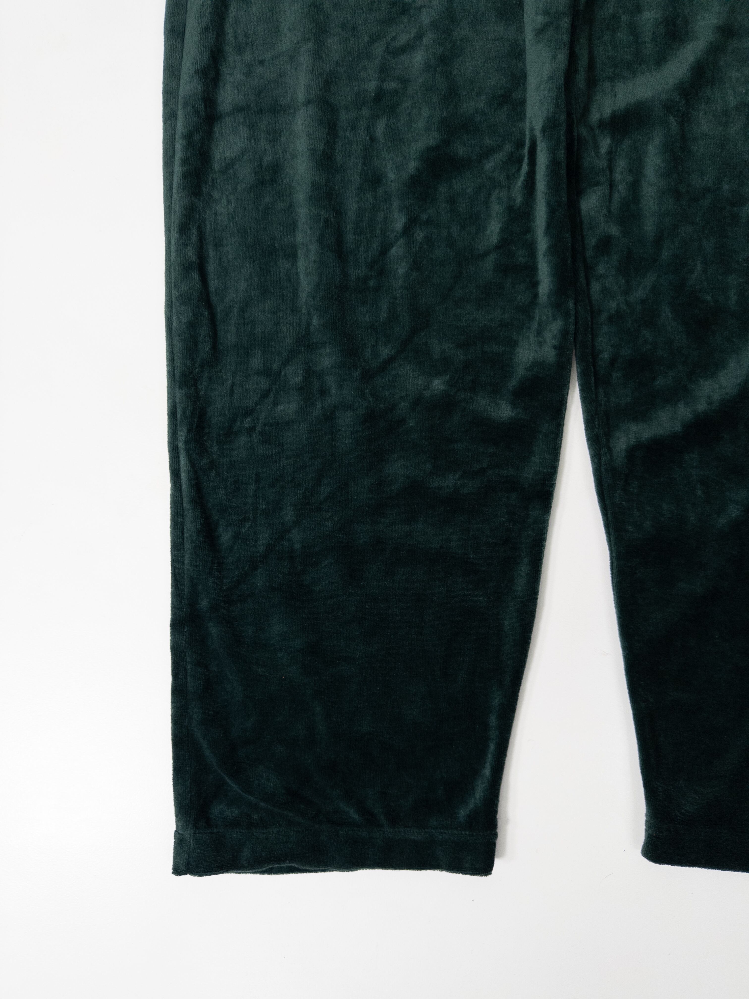 深い森のようなダークグリーンのベロアパンツ。柔らかな光沢と落ち感があり、ラフに穿くだけでドレープが生まれる一本です。