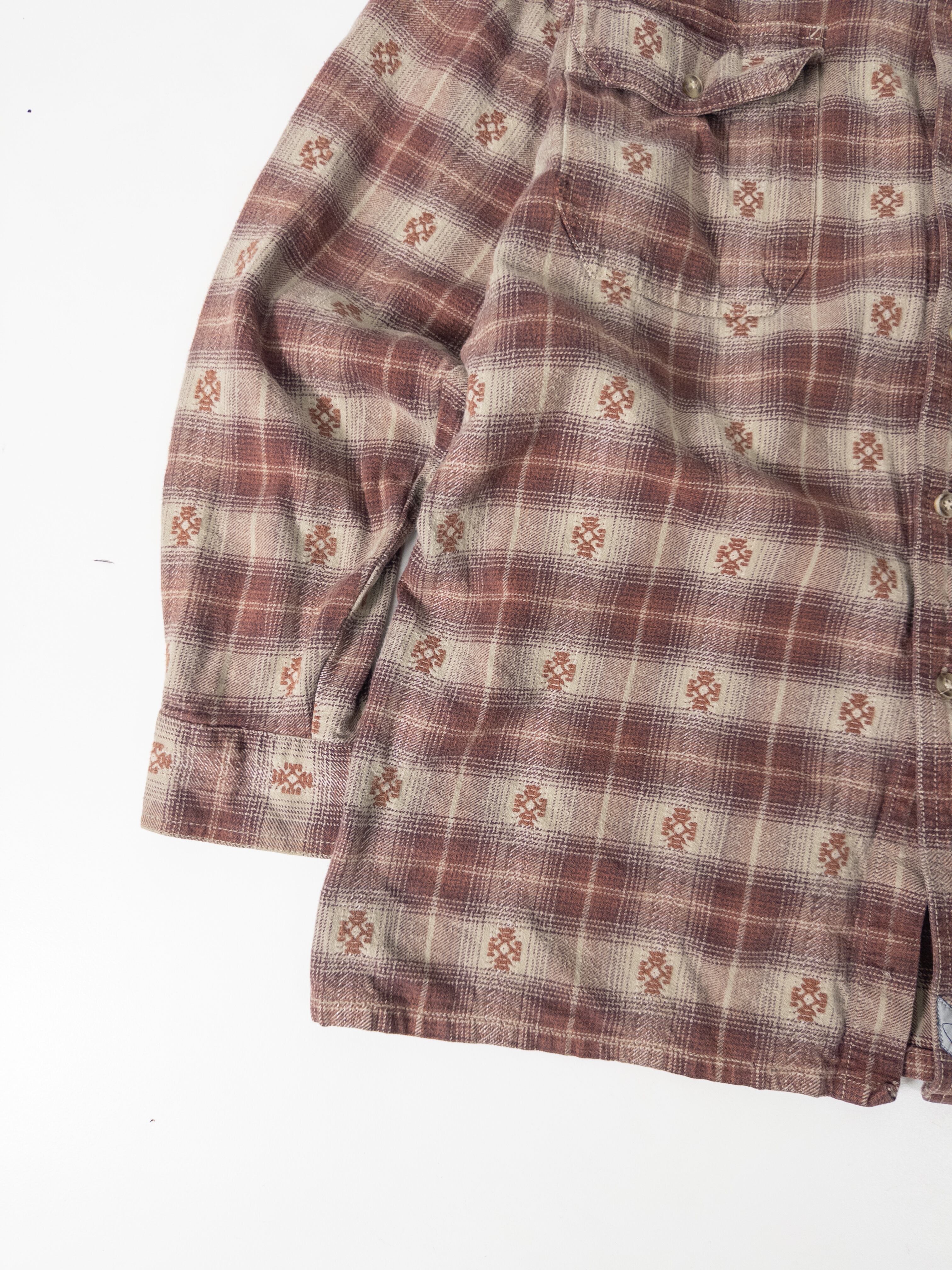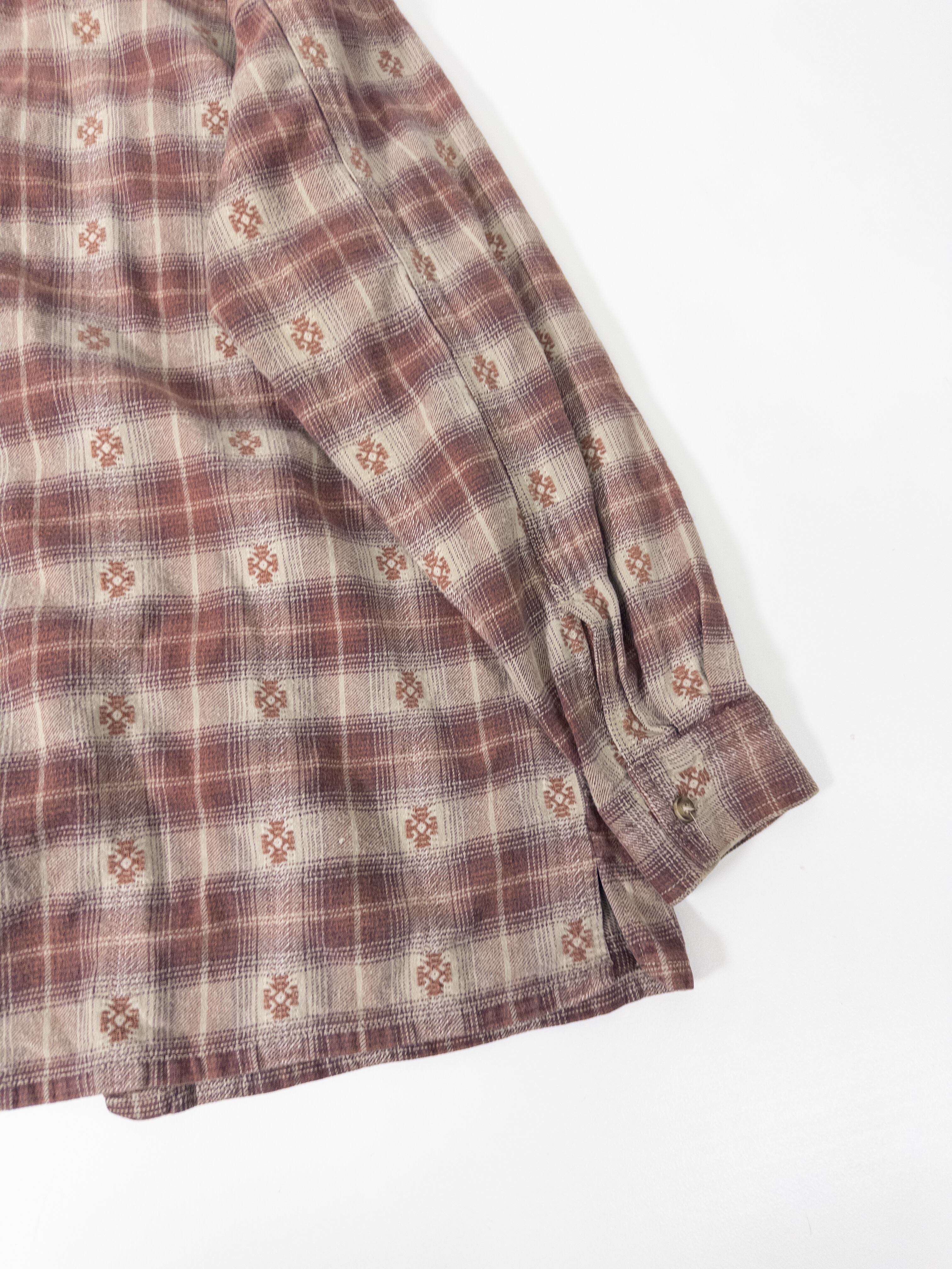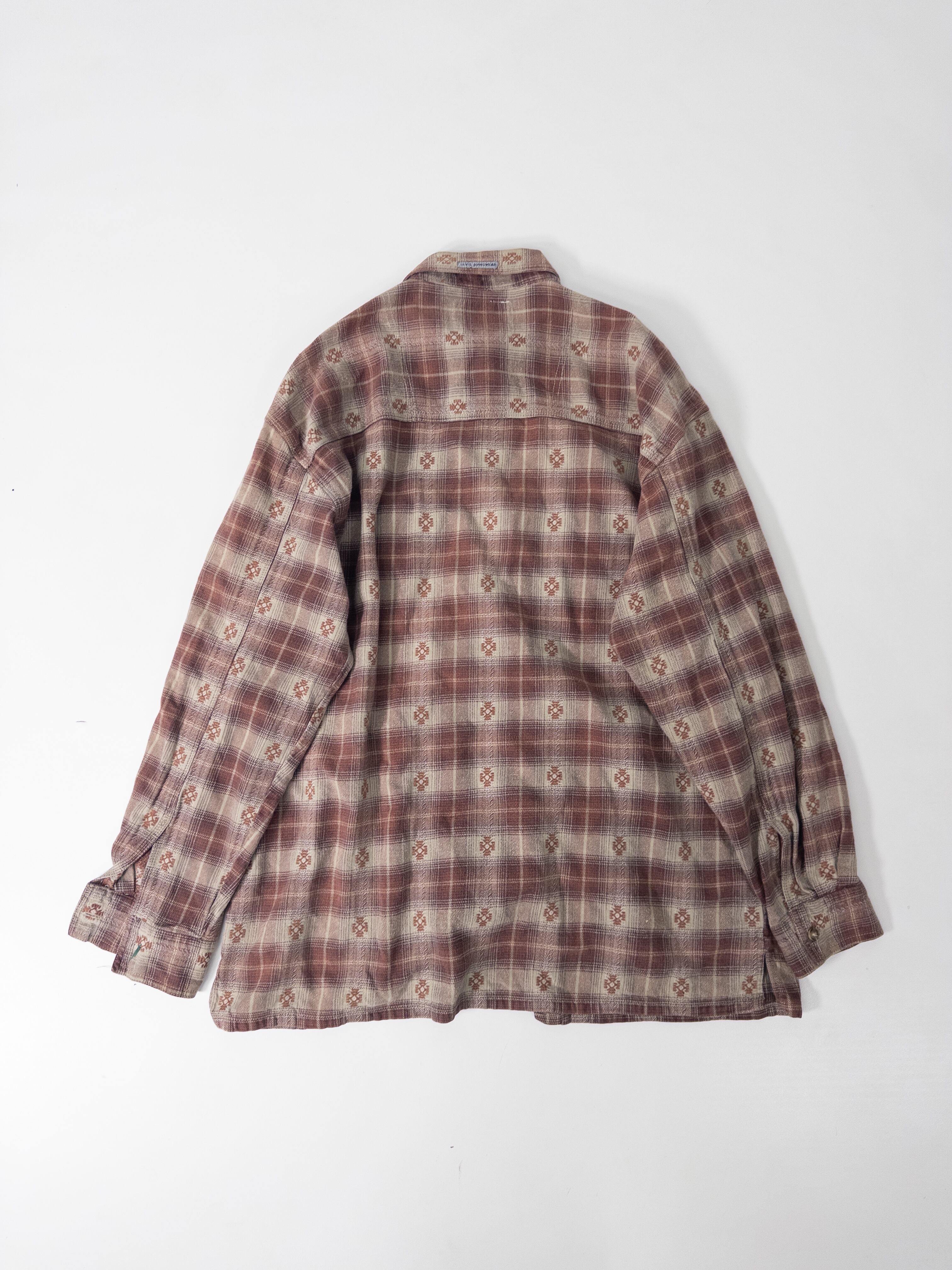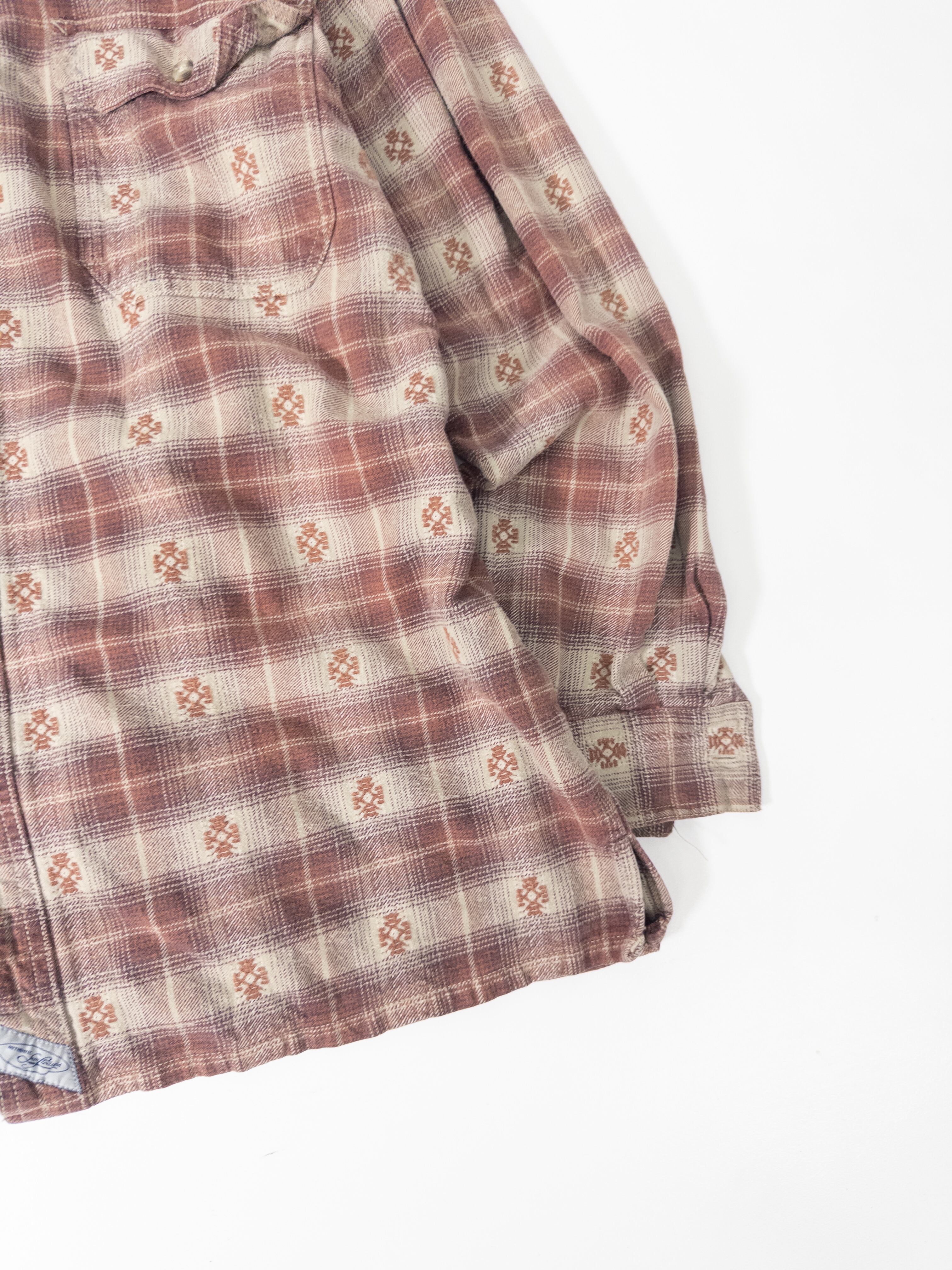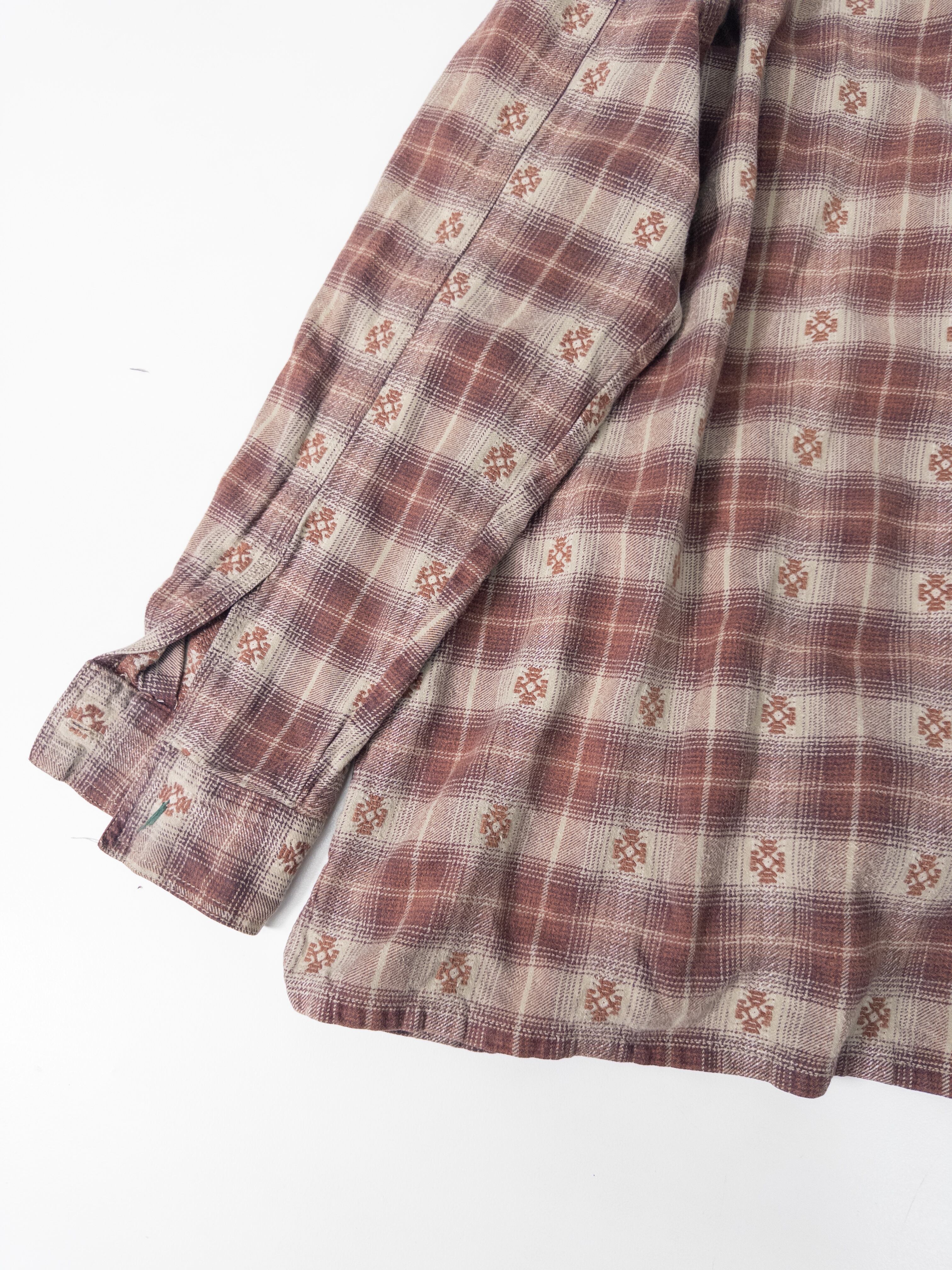 ネル特有の柔らかい起毛感に加えて、この小紋柄がヴィンテージらしい“ひとクセ”を加えていて、普通のチェックシャツとは違う洒落感を演出してくれます。ライトアウター代わりにも使える厚みで、秋冬のスタイリングに落とし込みやすい一枚。