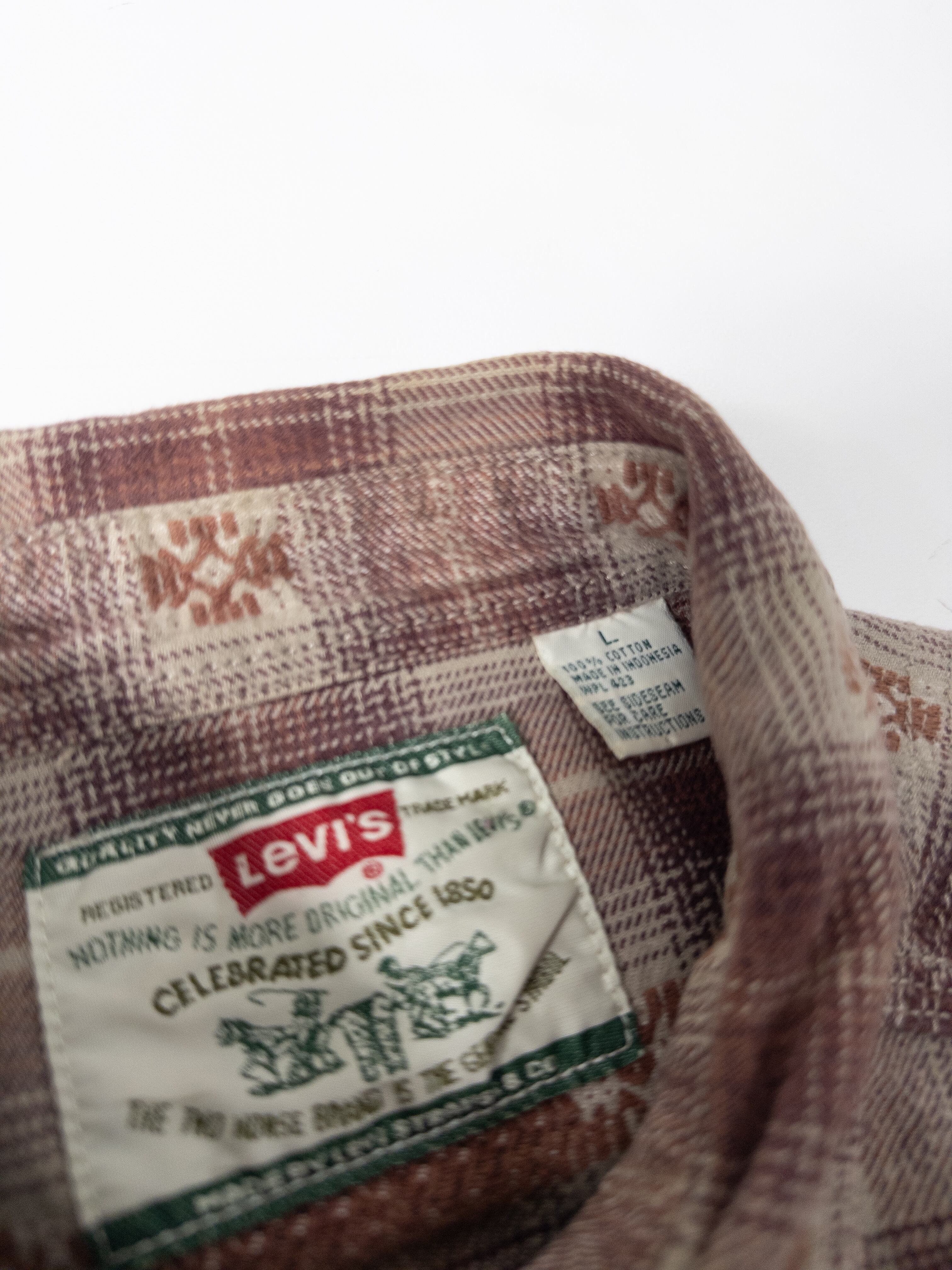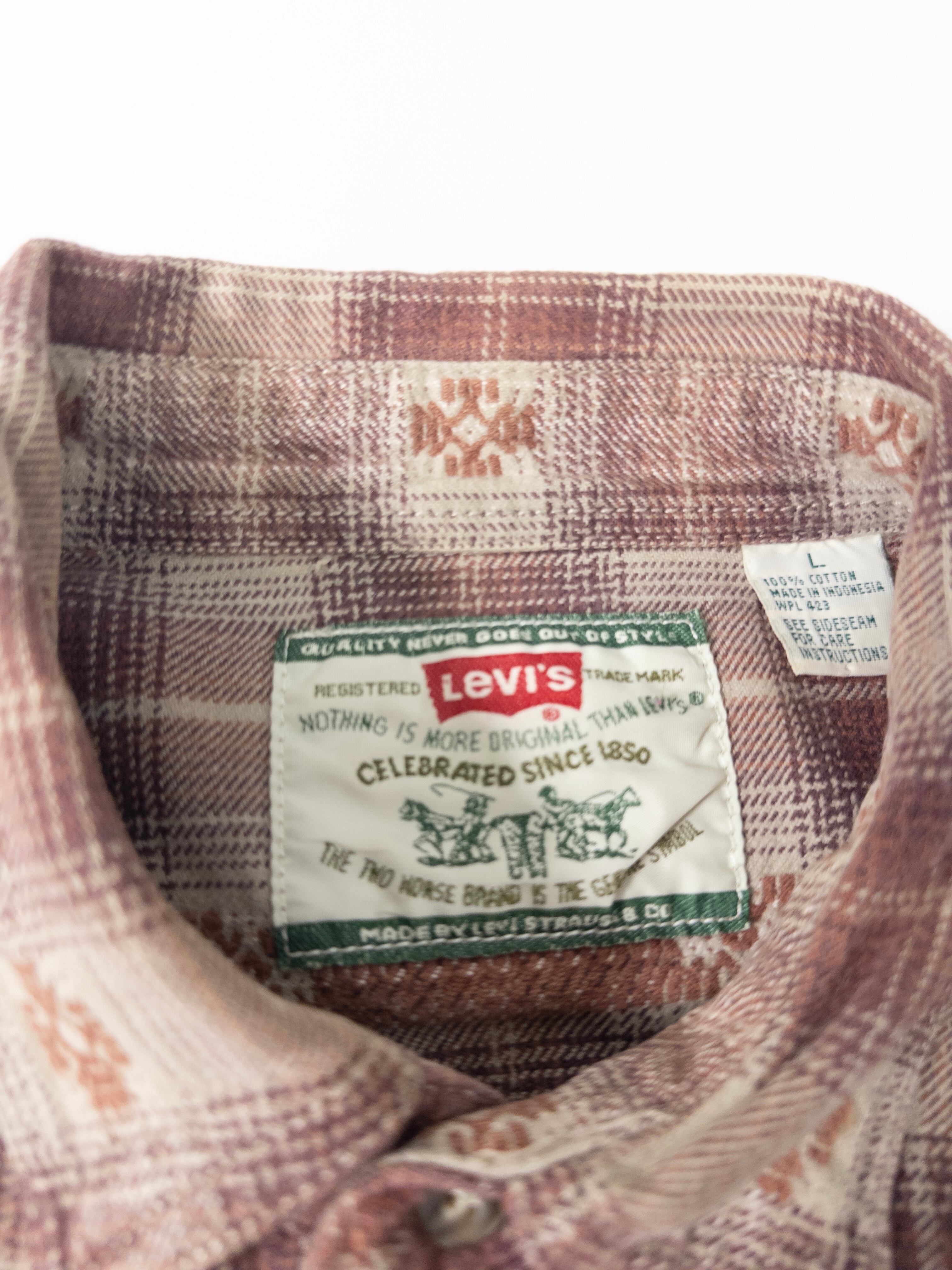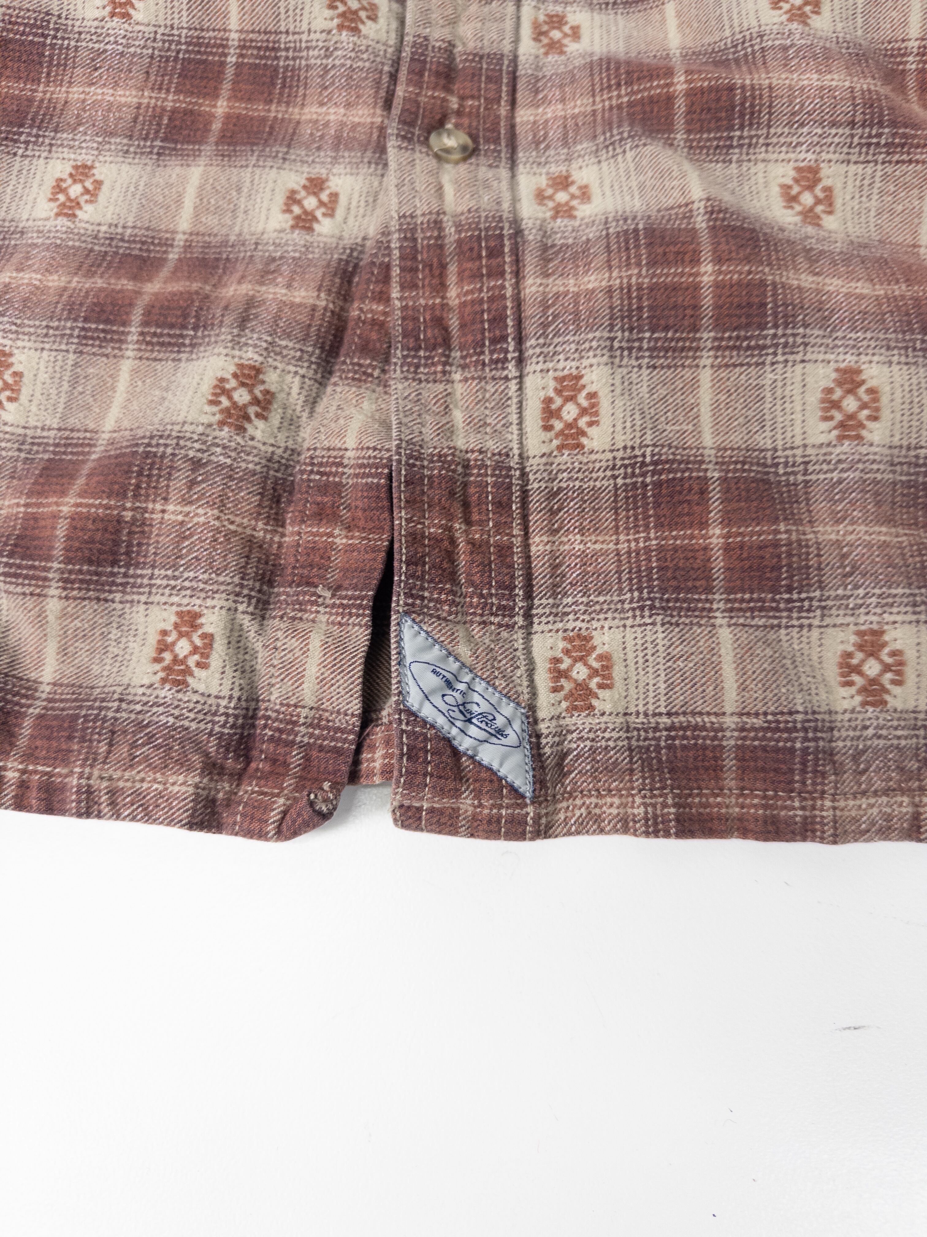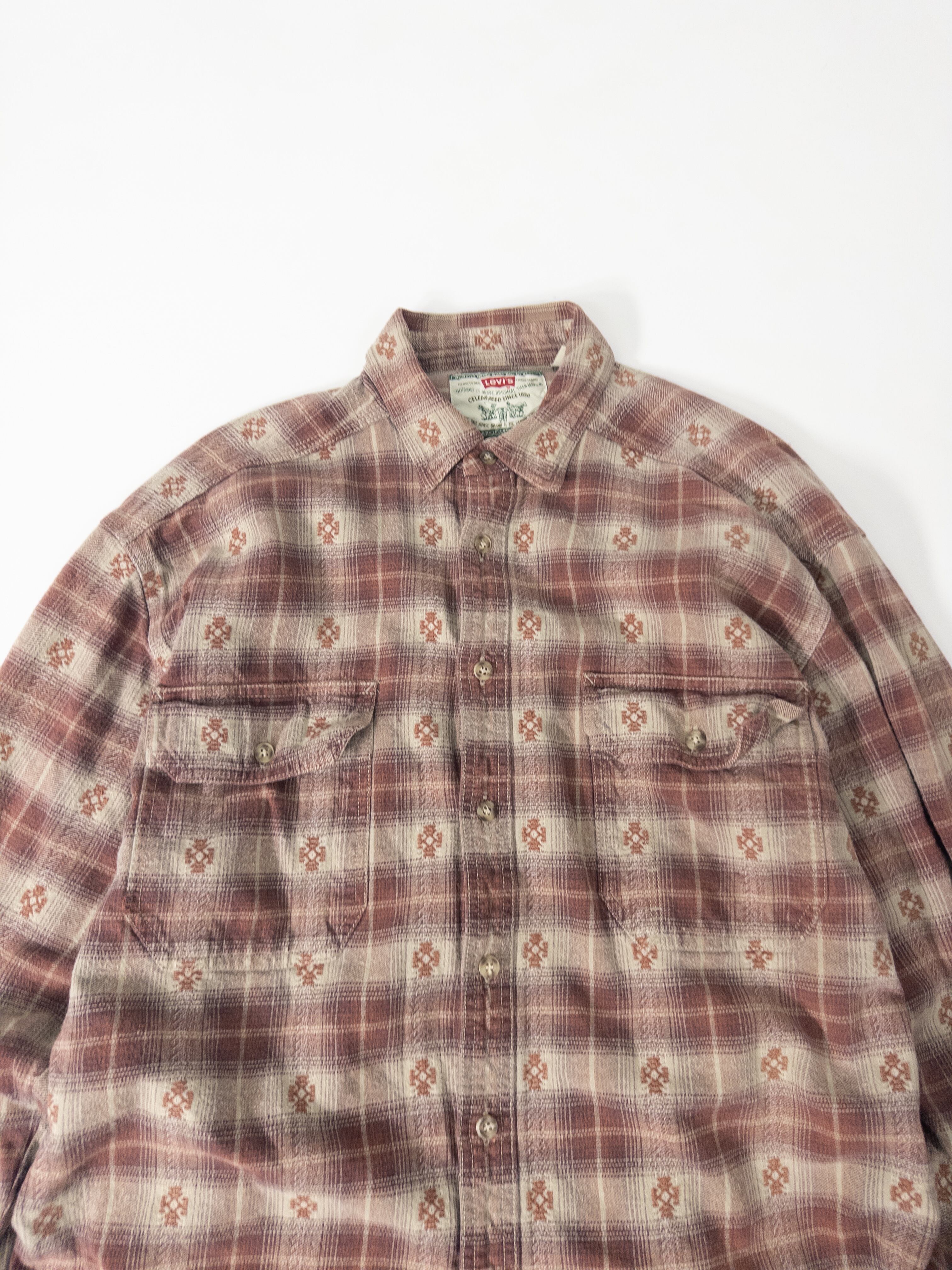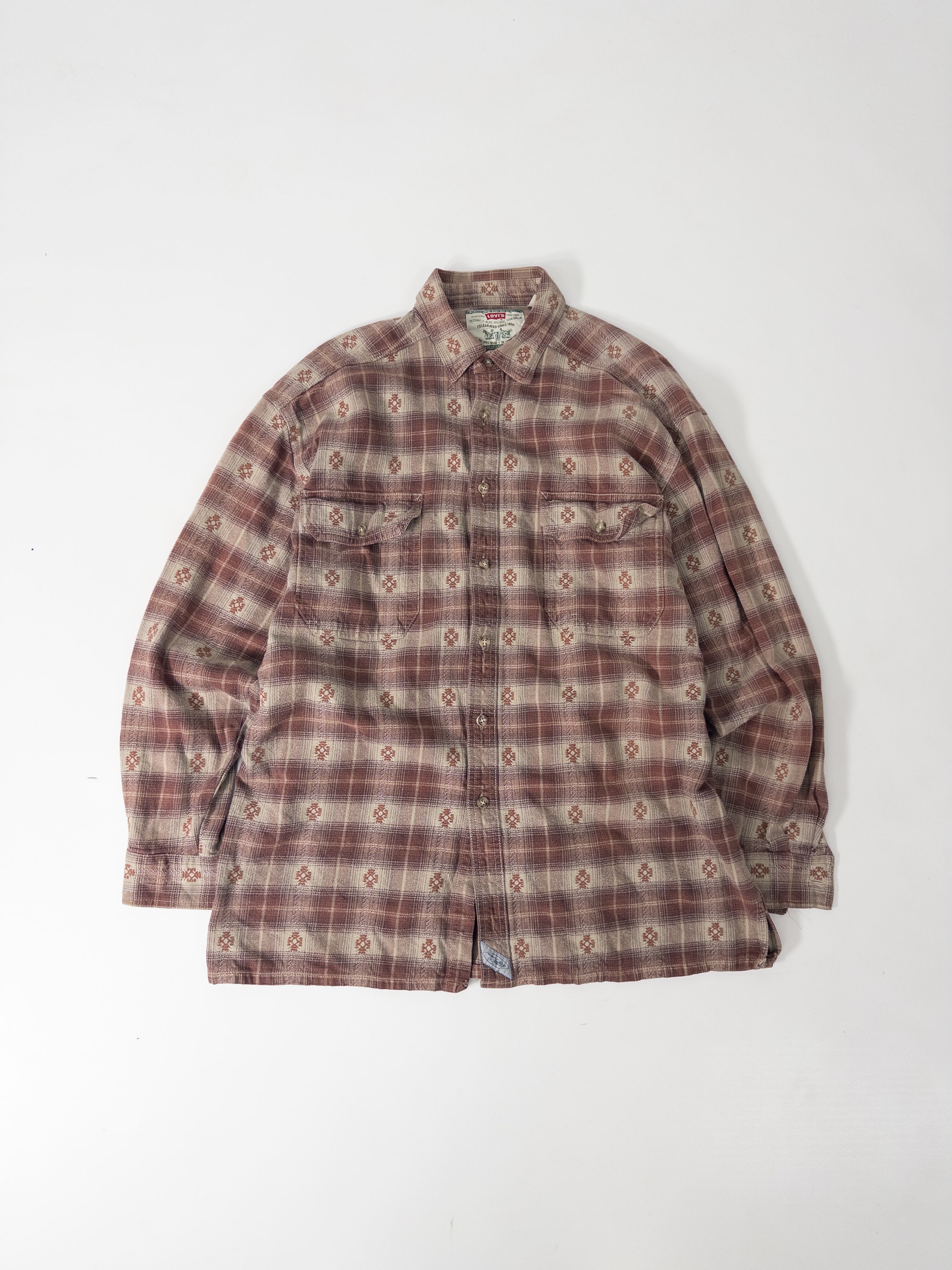 ネル特有の柔らかい起毛感に加えて、この小紋柄がヴィンテージらしい“ひとクセ”を加えていて、普通のチェックシャツとは違う洒落感を演出してくれます。ライトアウター代わりにも使える厚みで、秋冬のスタイリングに落とし込みやすい一枚。
