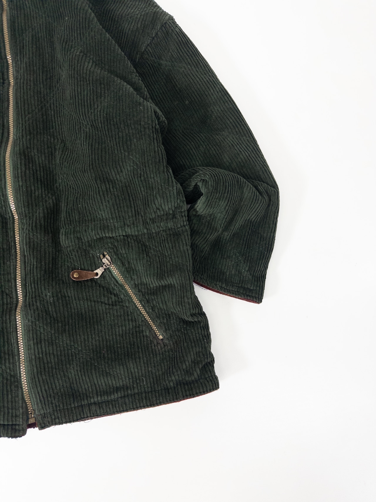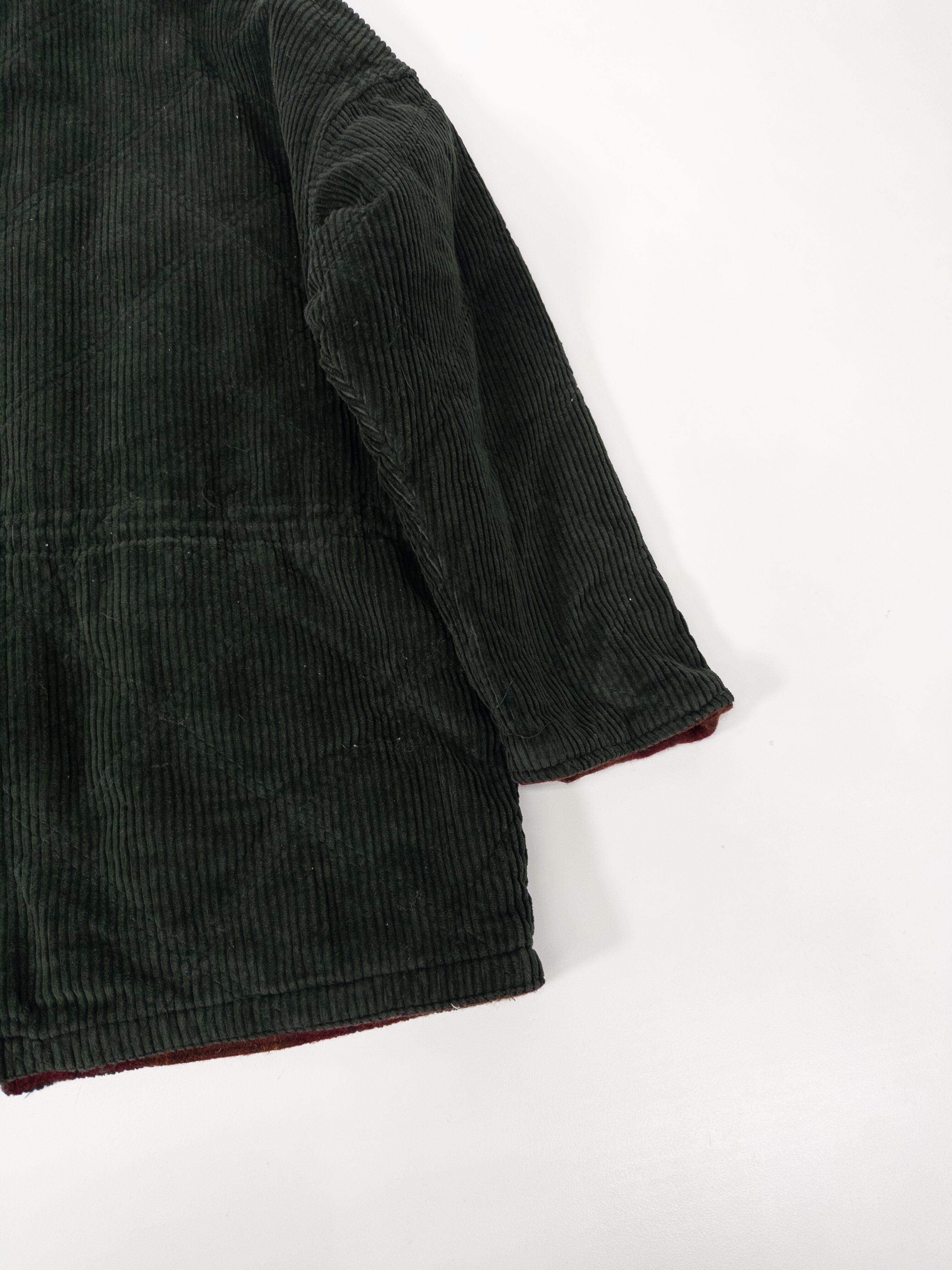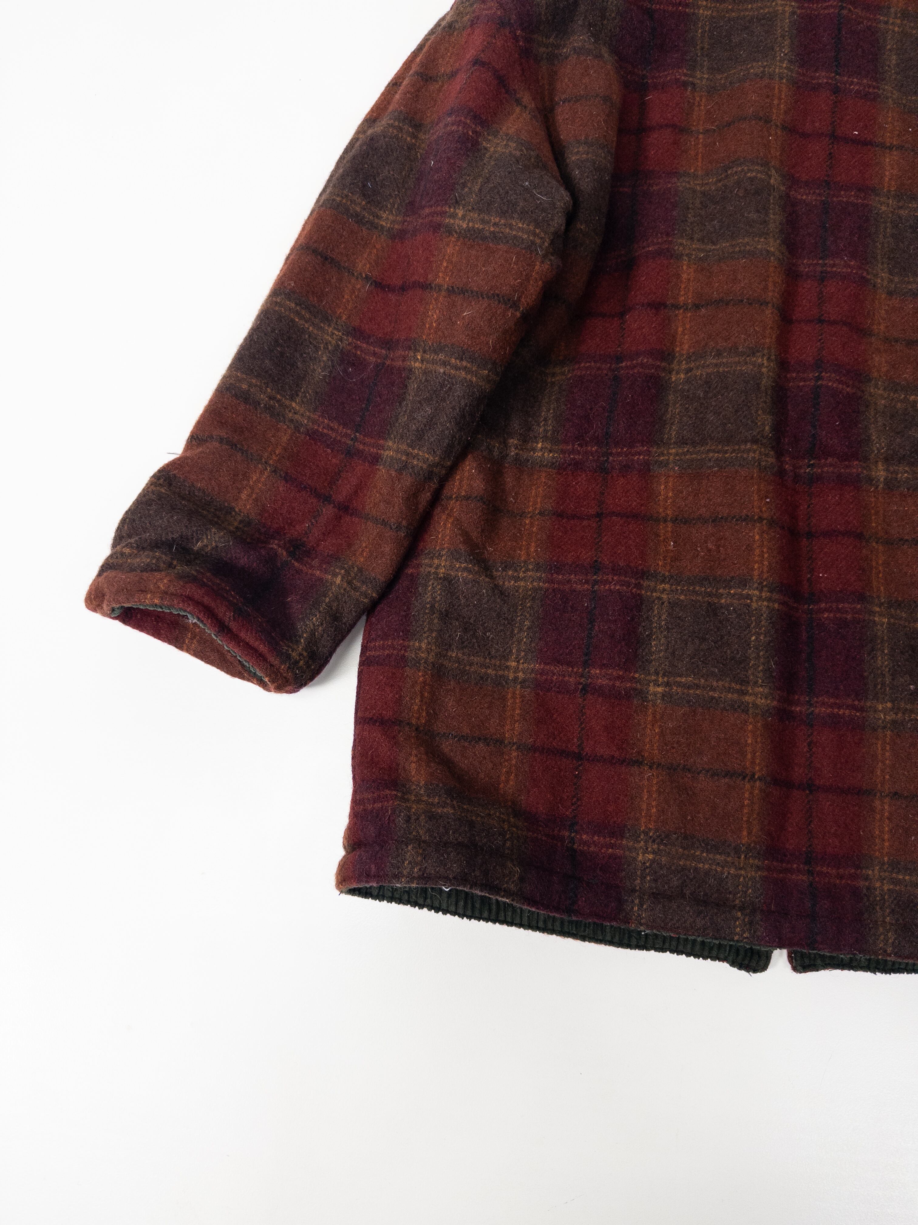 片面は深いオリーブグリーンの太畝コーデュロイ、もう片面はバーガンディ×ブラウンのウールチェック。