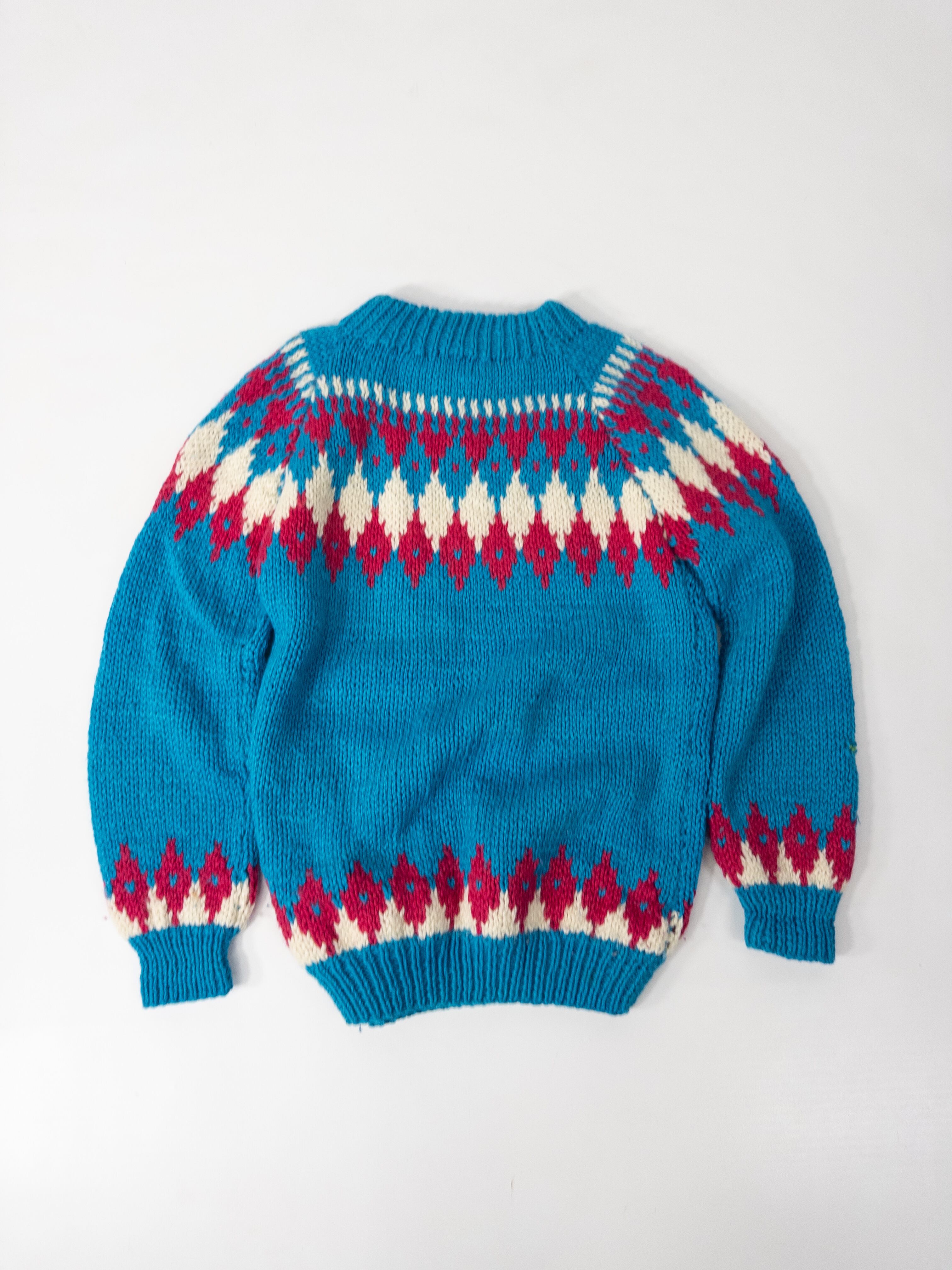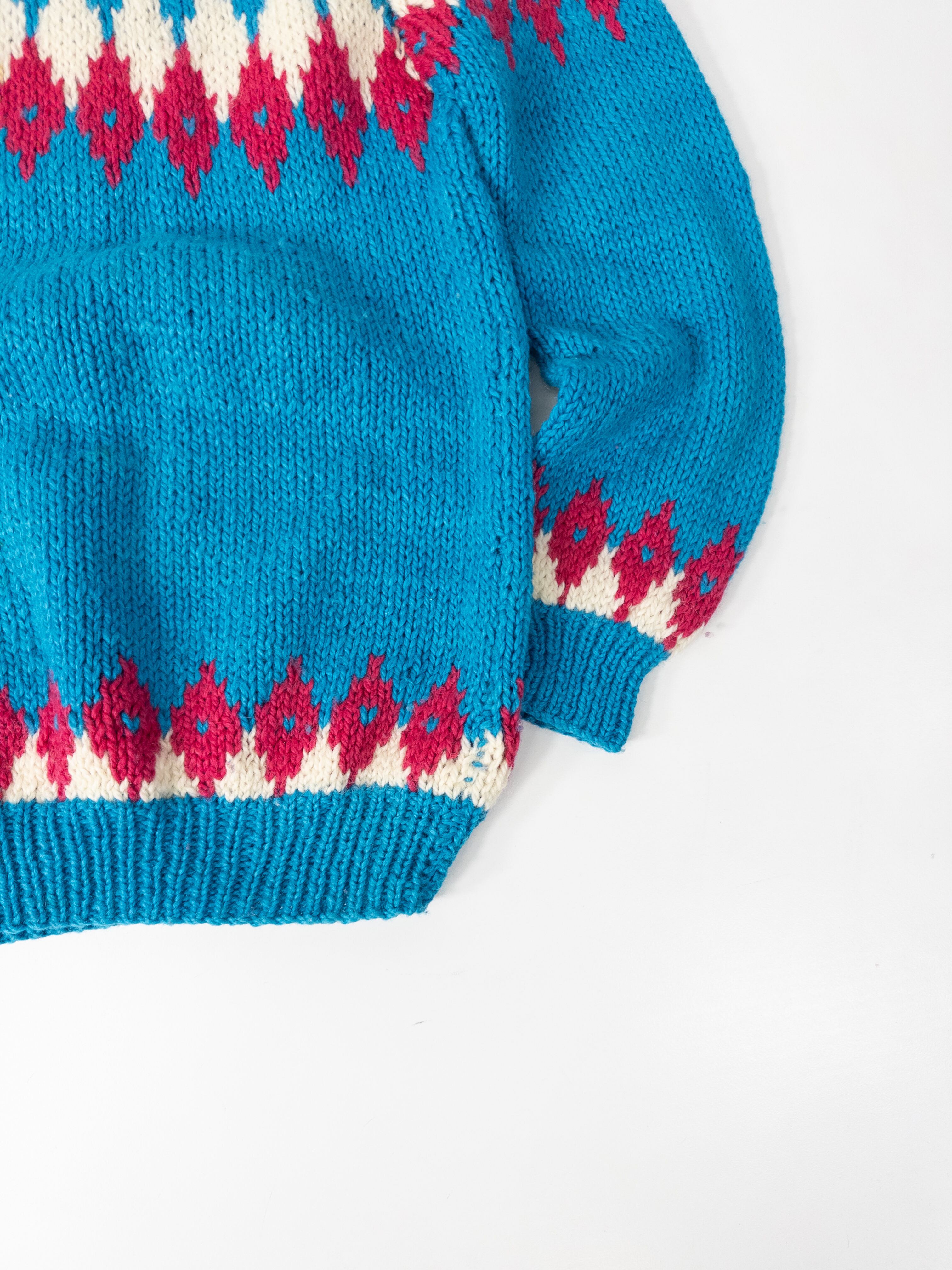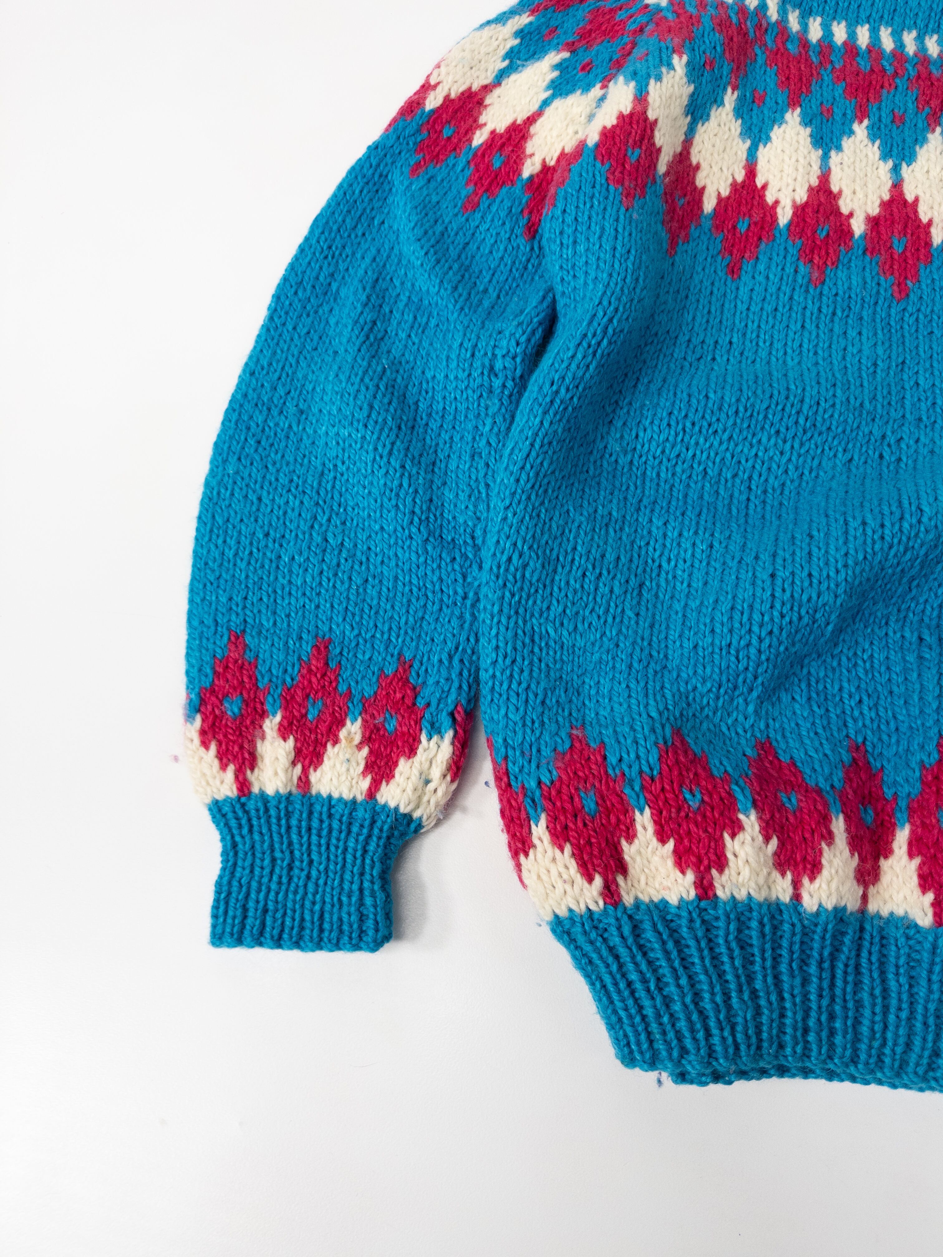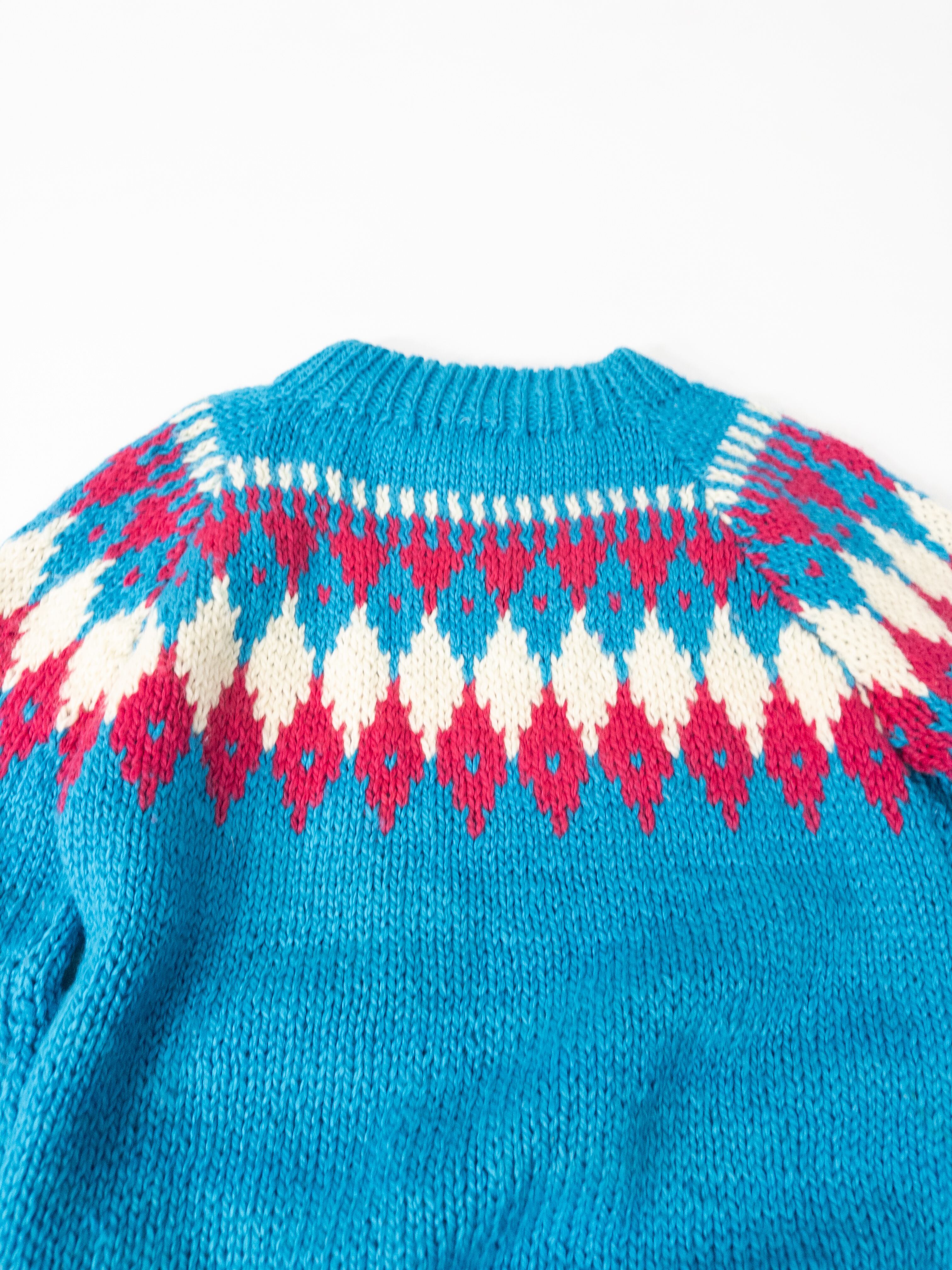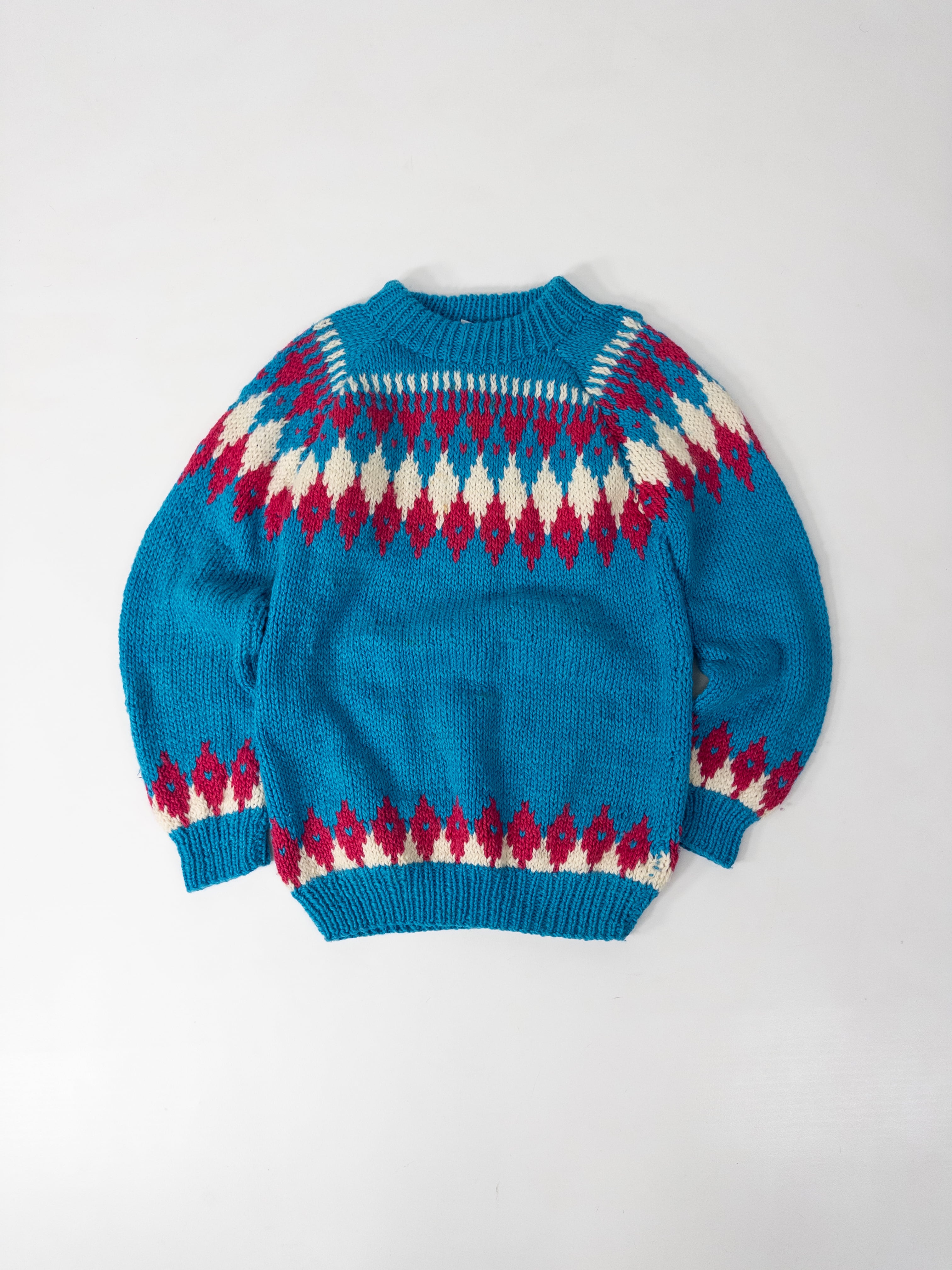 明るいターコイズブルーをベースに、赤と生成りの幾何学柄が配された北欧調フェアアイルパターン。