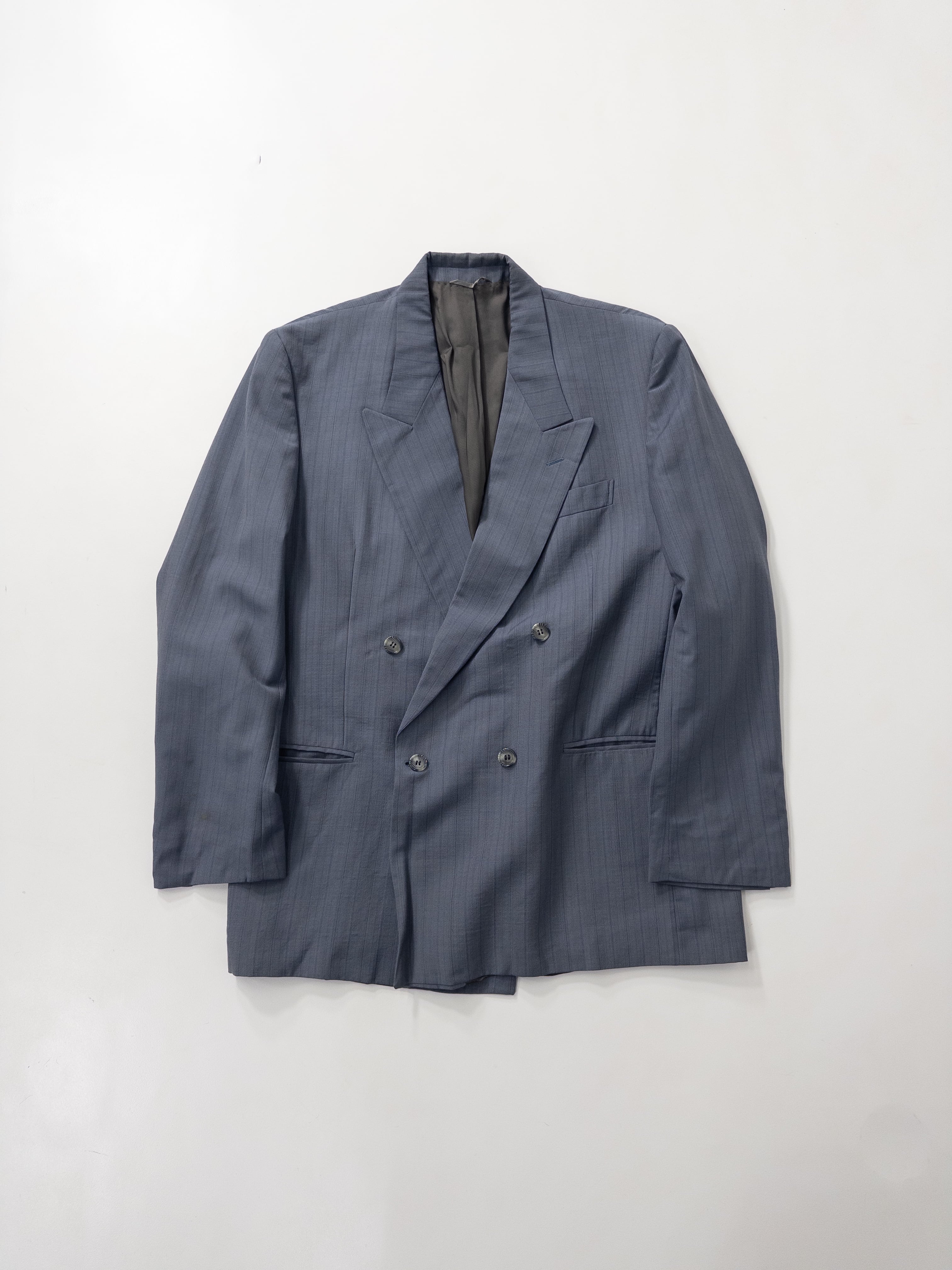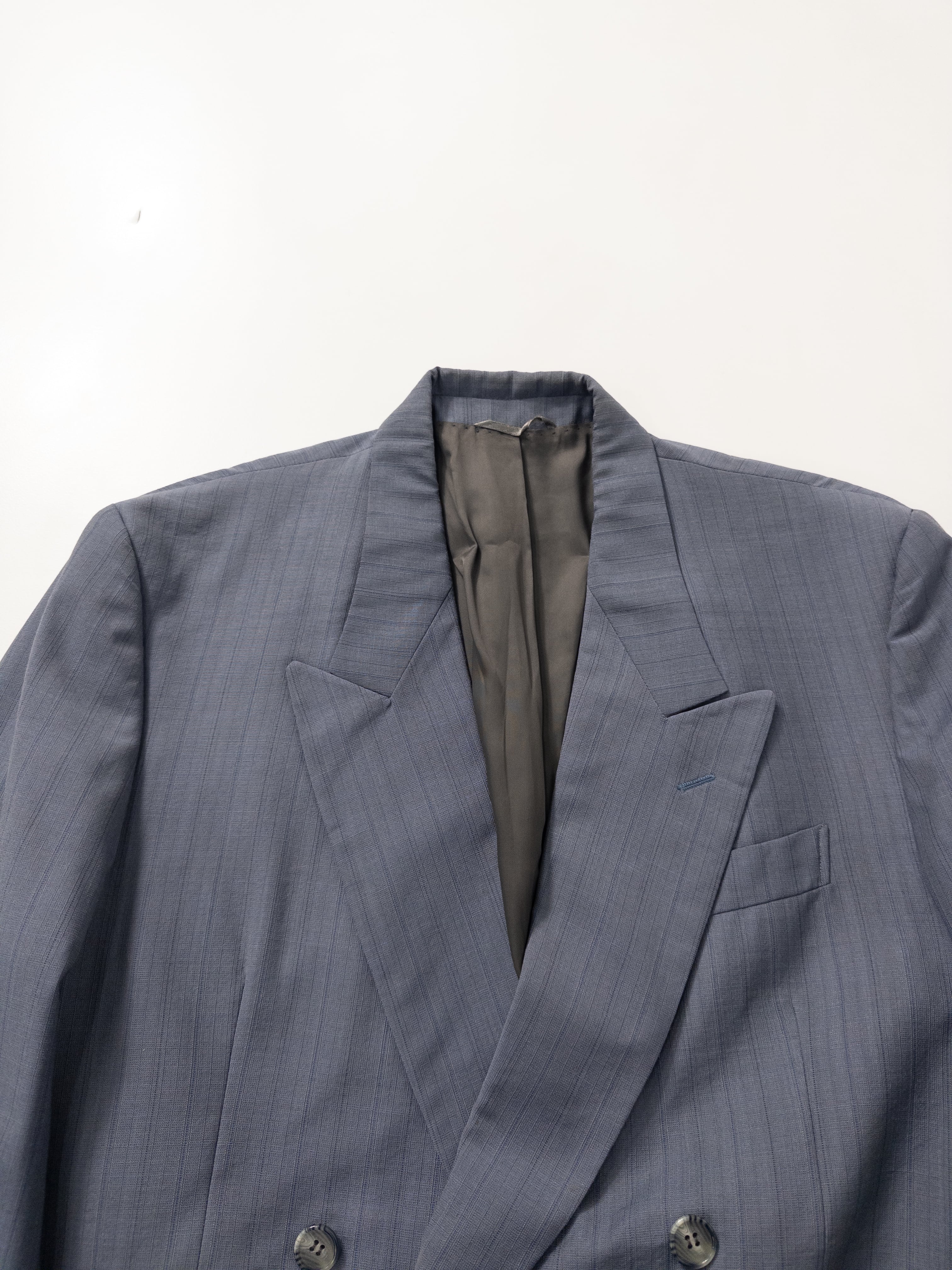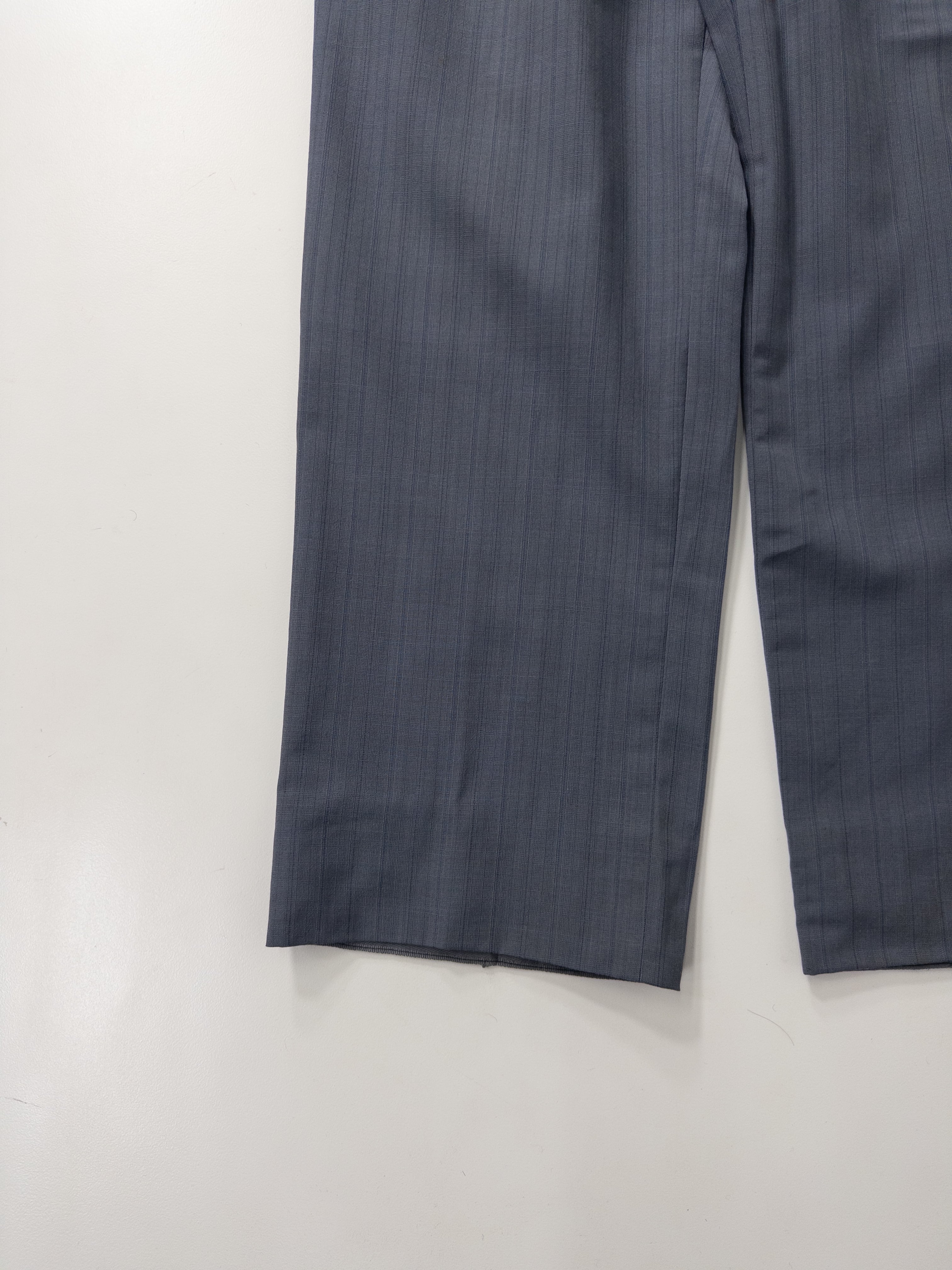 スモーキーなグレーの色味とストライプの織りが上品で、90s的な広めのピークドラペルやワイドスラックスのシルエットもモードに映る。