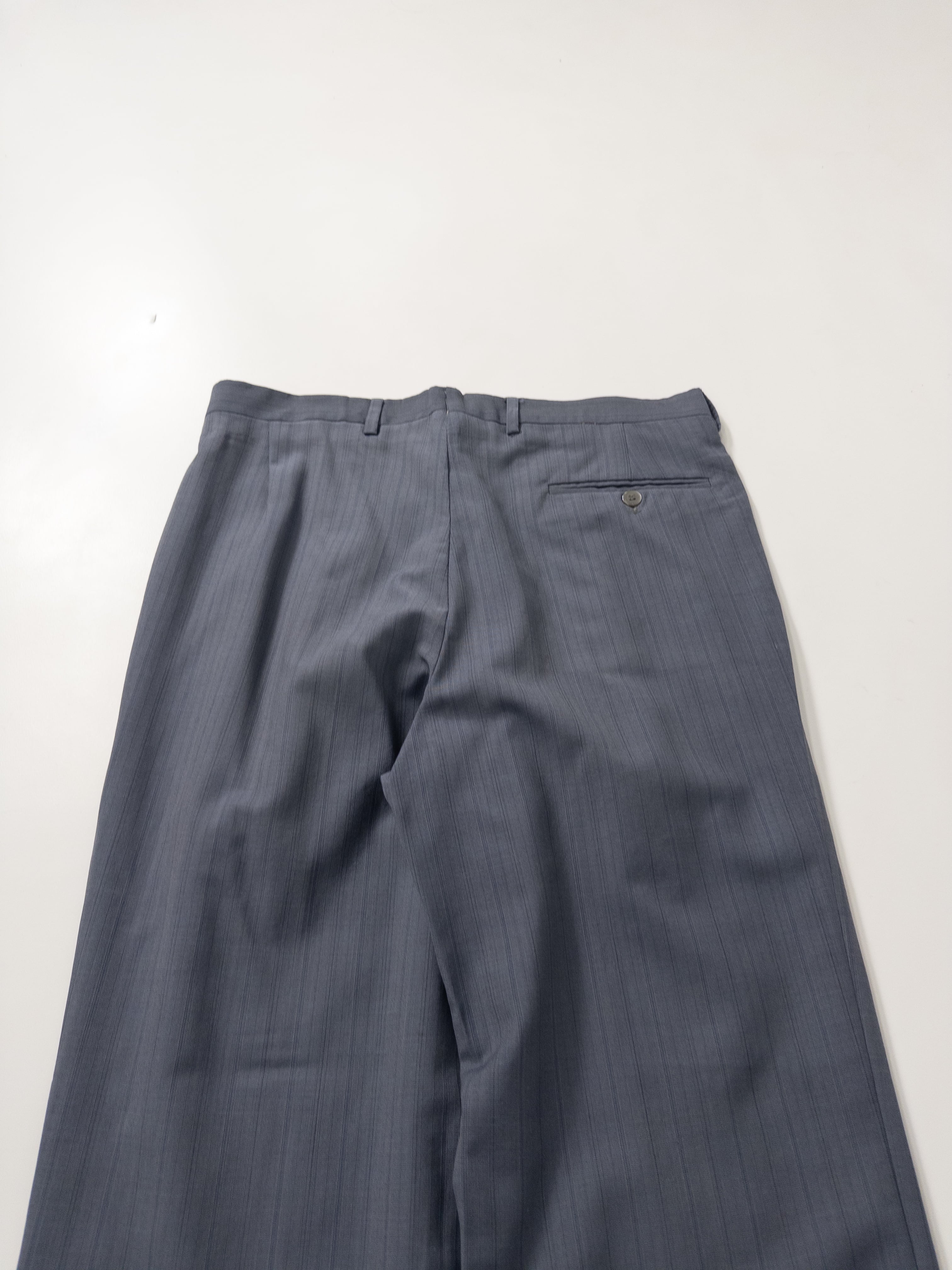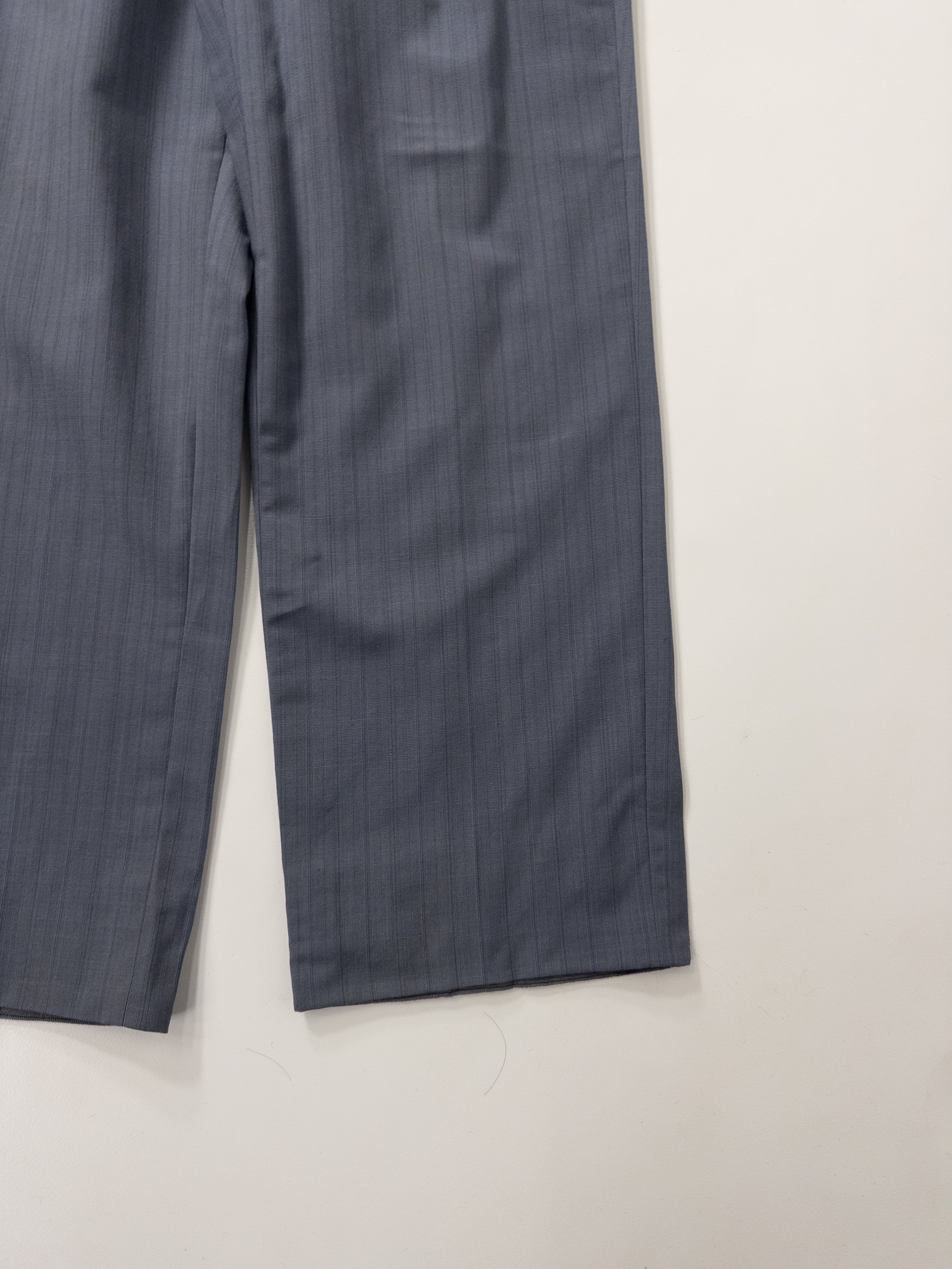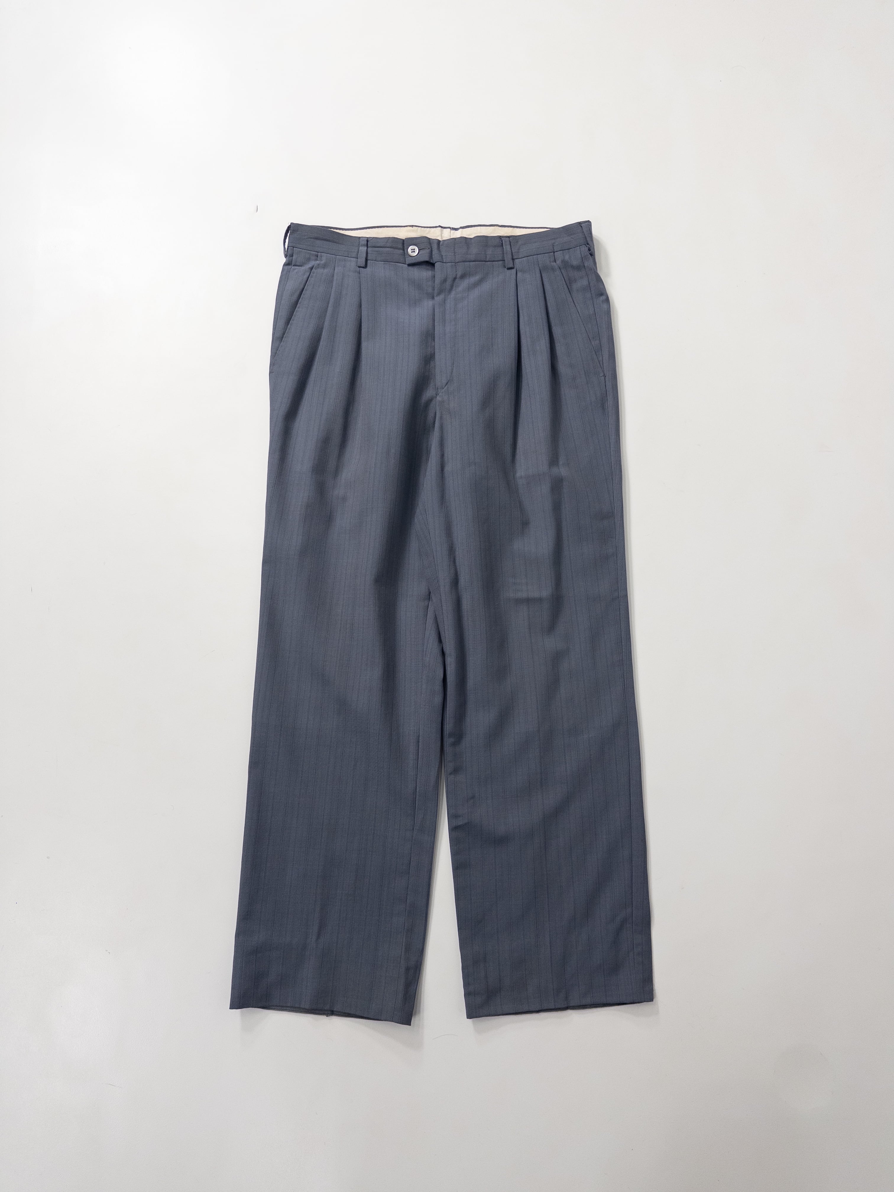 スモーキーなグレーの色味とストライプの織りが上品で、90s的な広めのピークドラペルやワイドスラックスのシルエットもモードに映る。