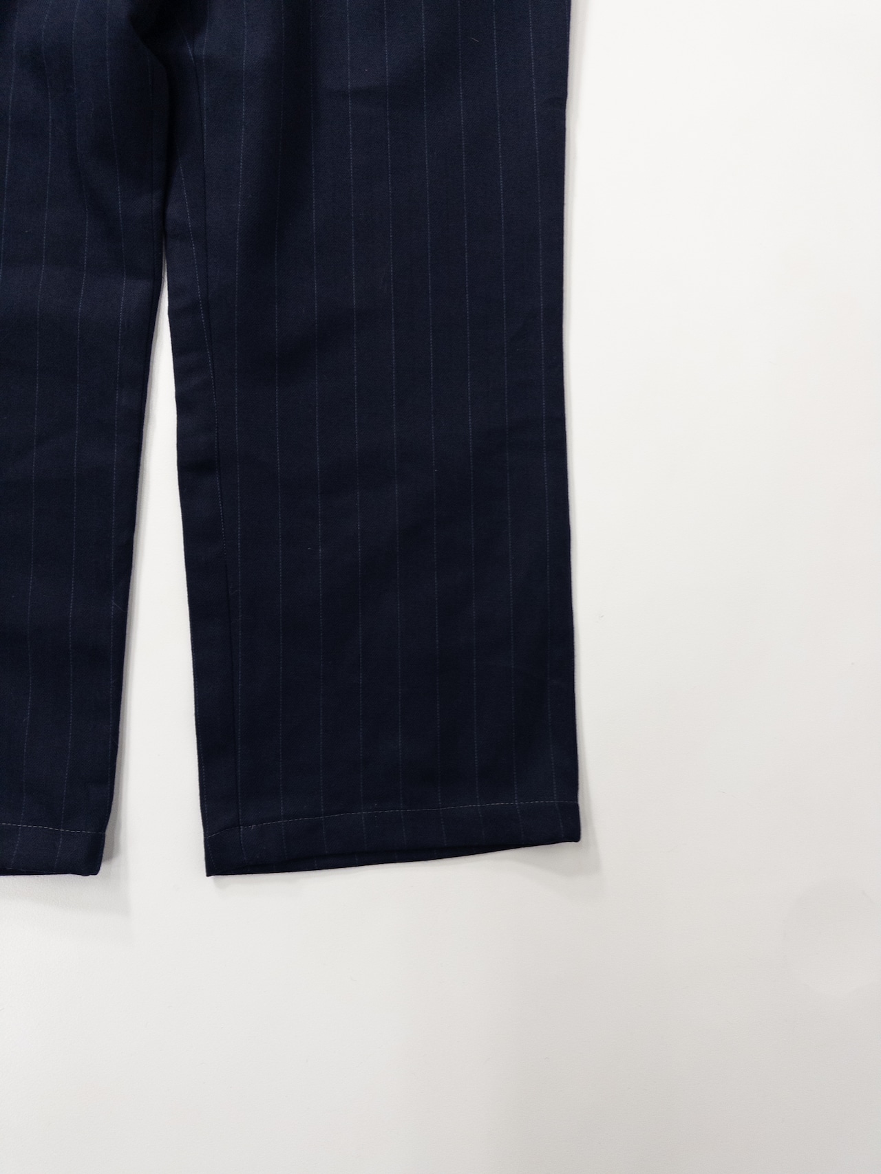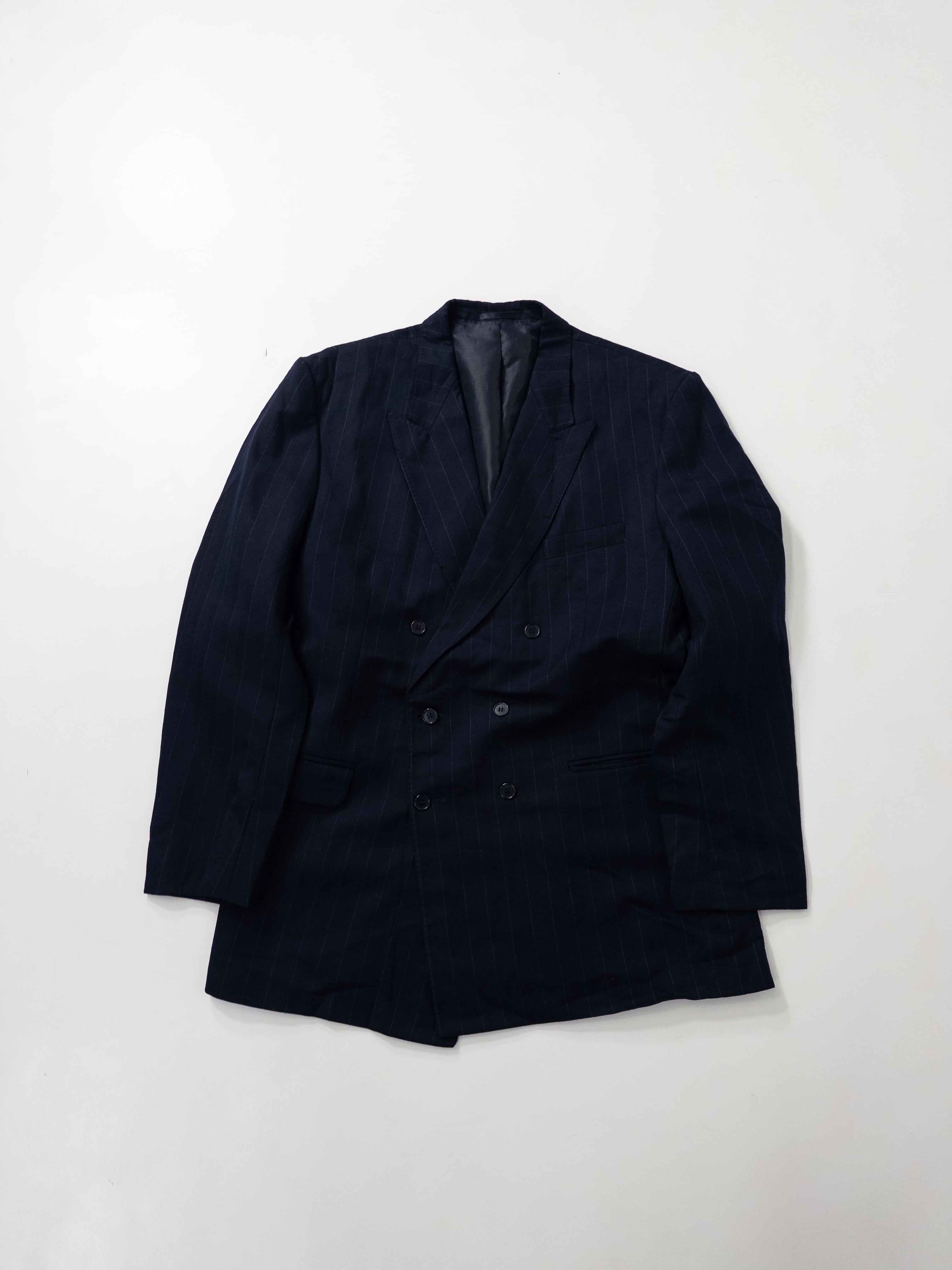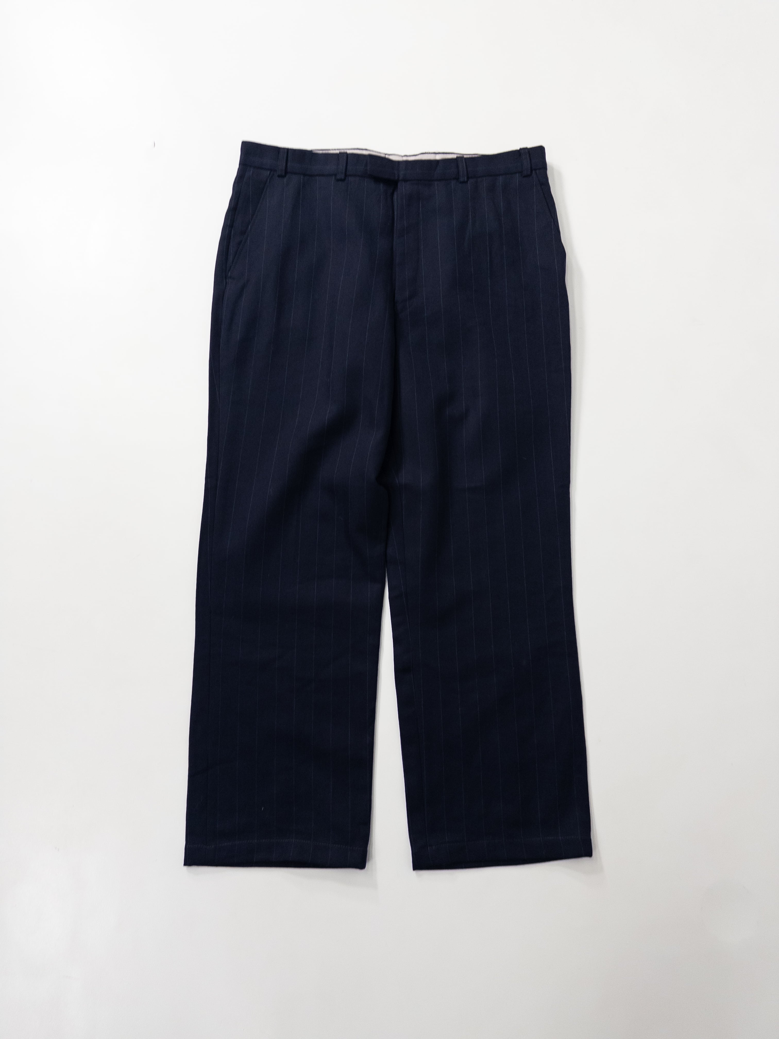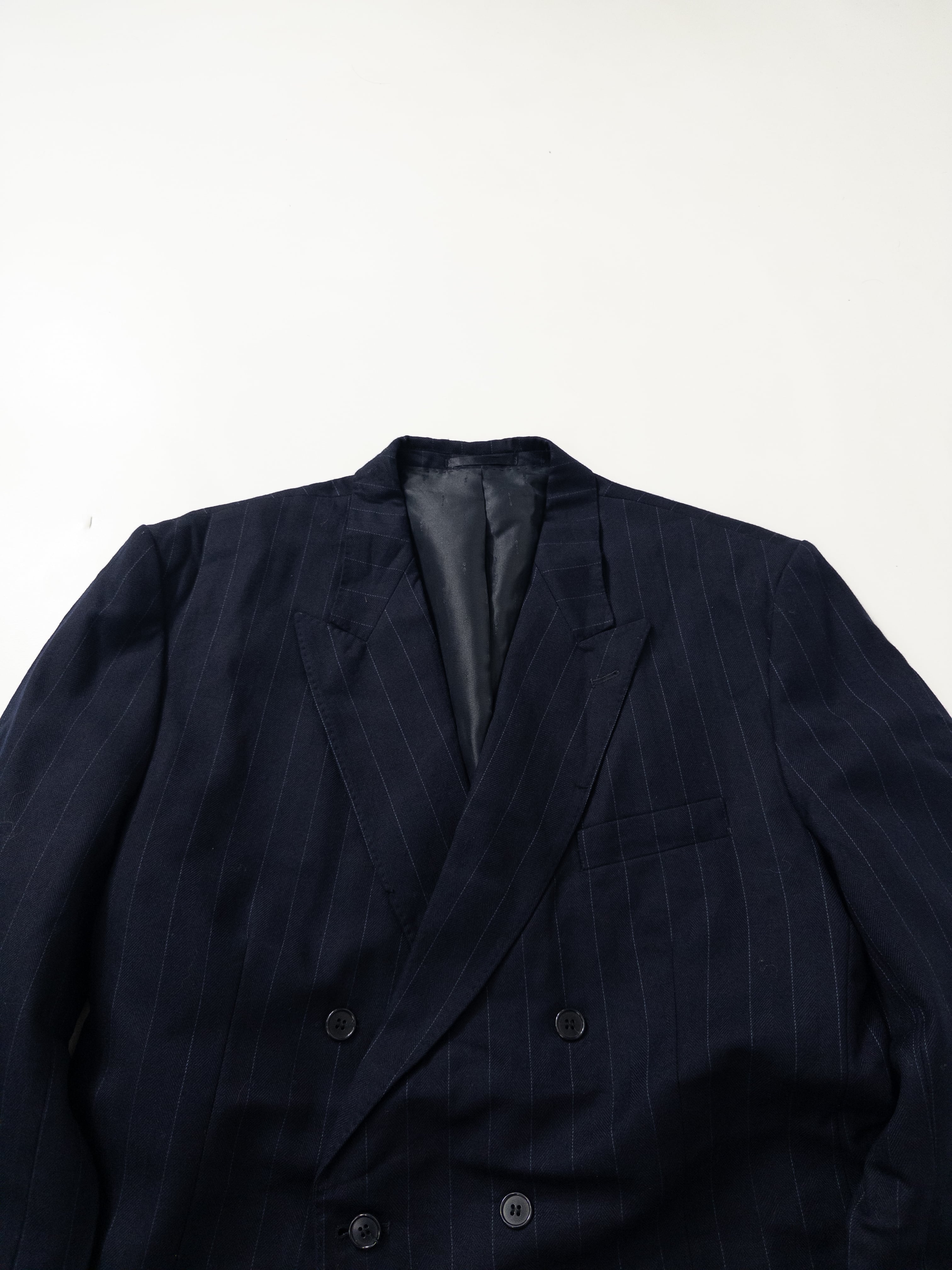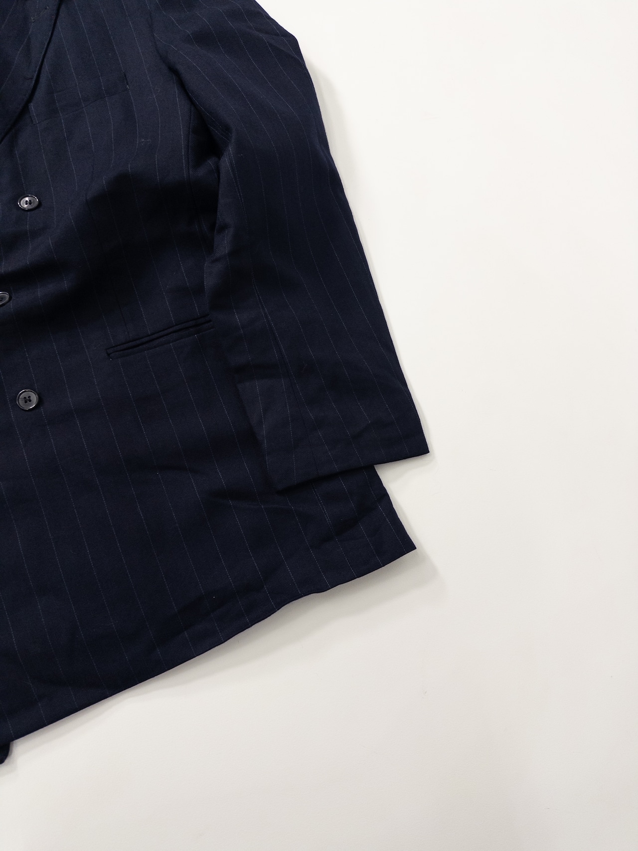 生地はしっかりと目の詰まったウールトロピカル。ネイビー地に細いピンストライプが走る、知的でストイックな佇まい。
