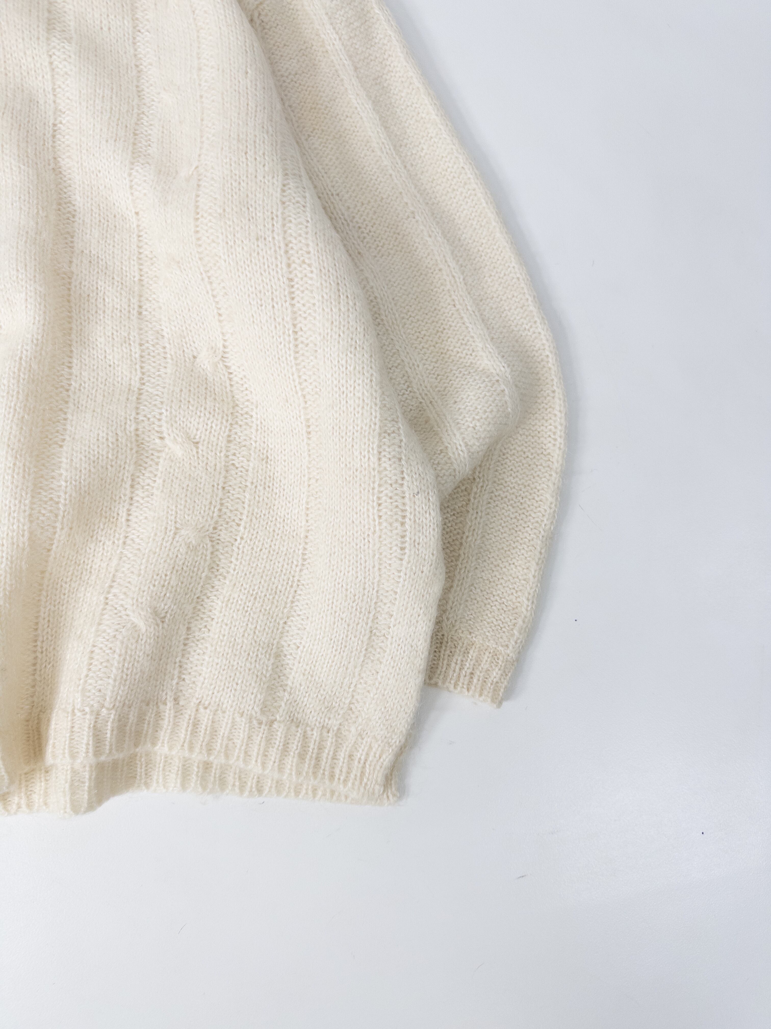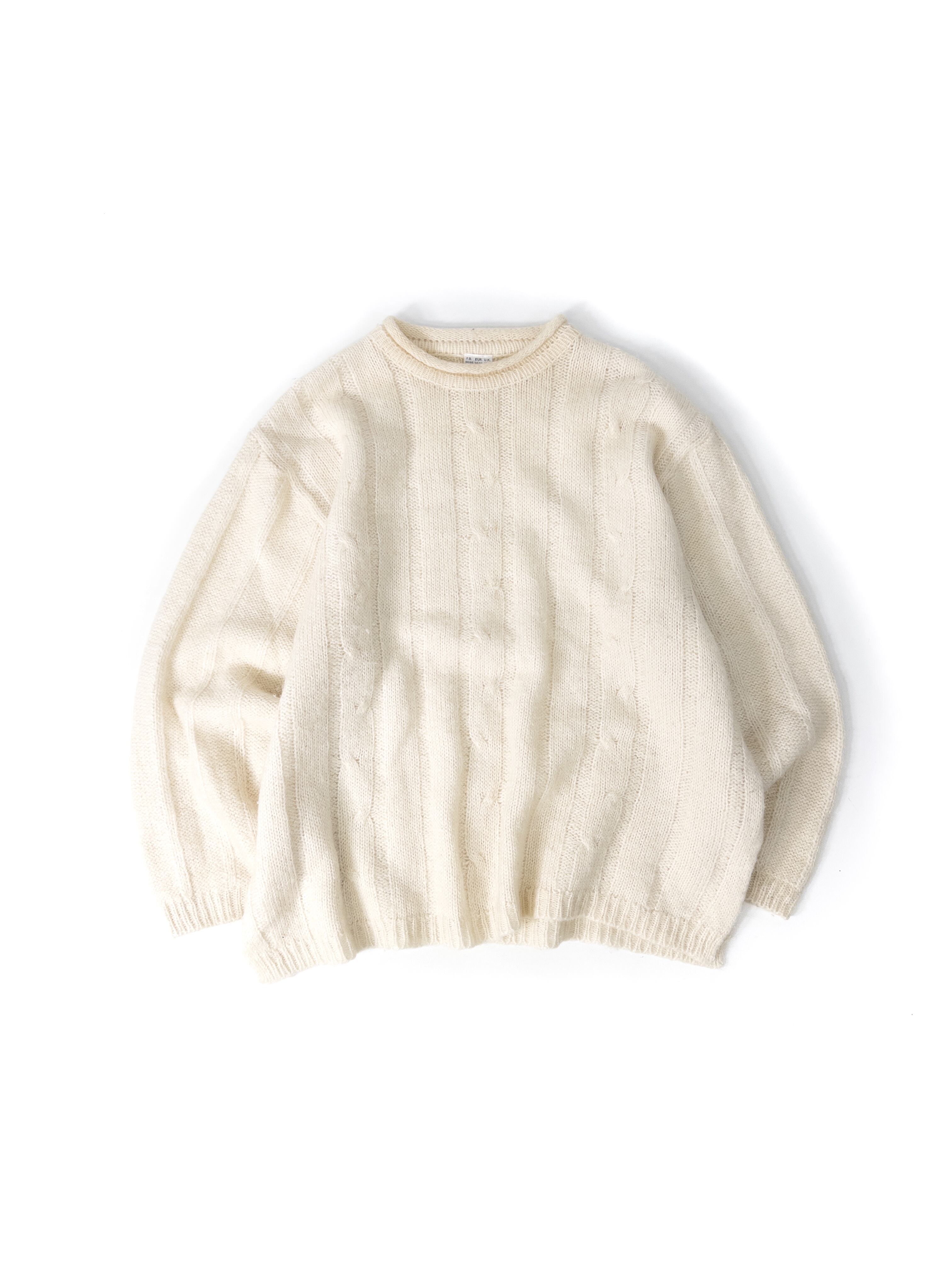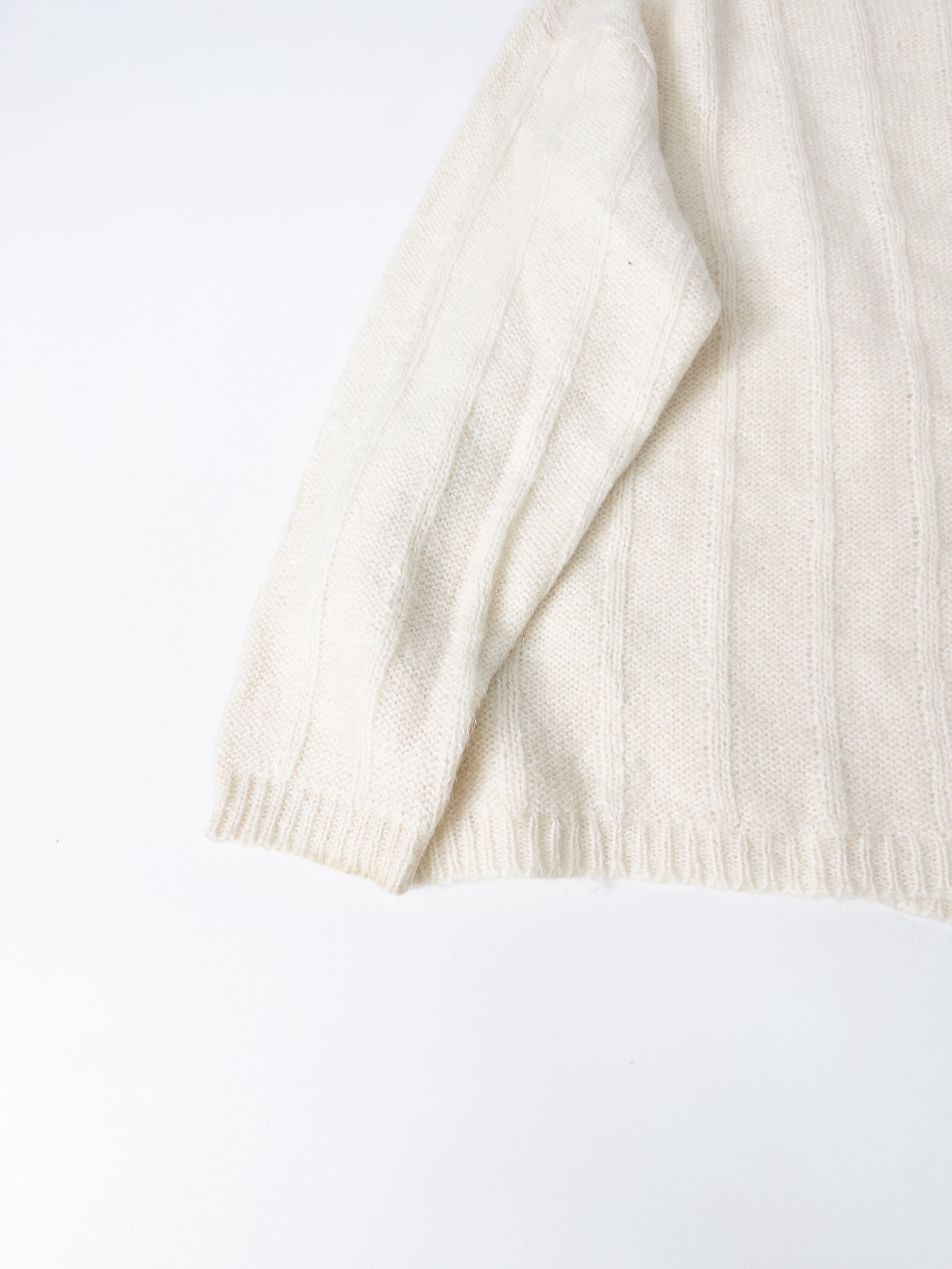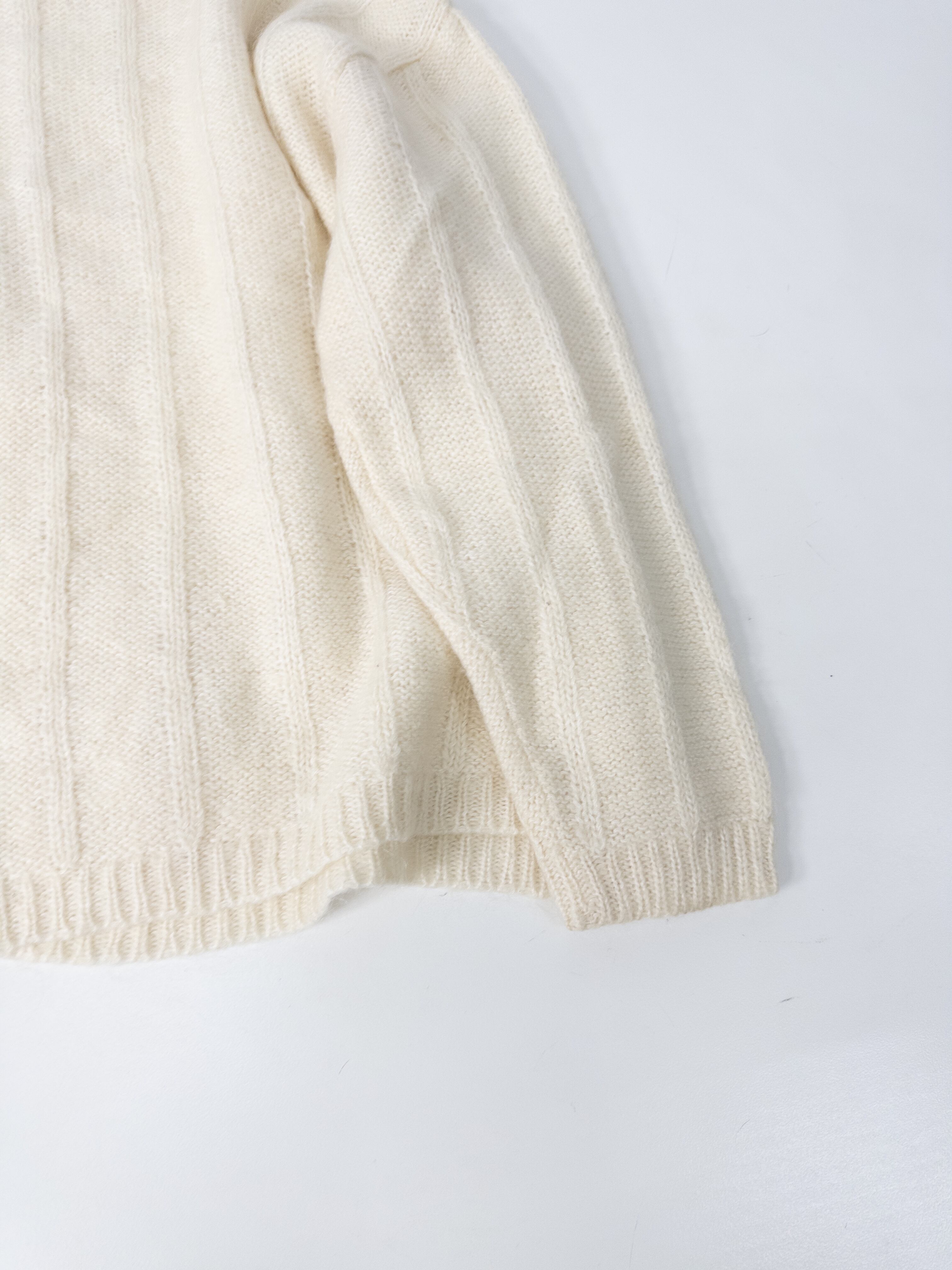 モヘア特有の柔らかい毛流れと、生成り寄りのアイボリーカラーが好印象。スタイリングを選ばず、古着のコートやジャケットのインナーとしても映える一枚だと思いました。