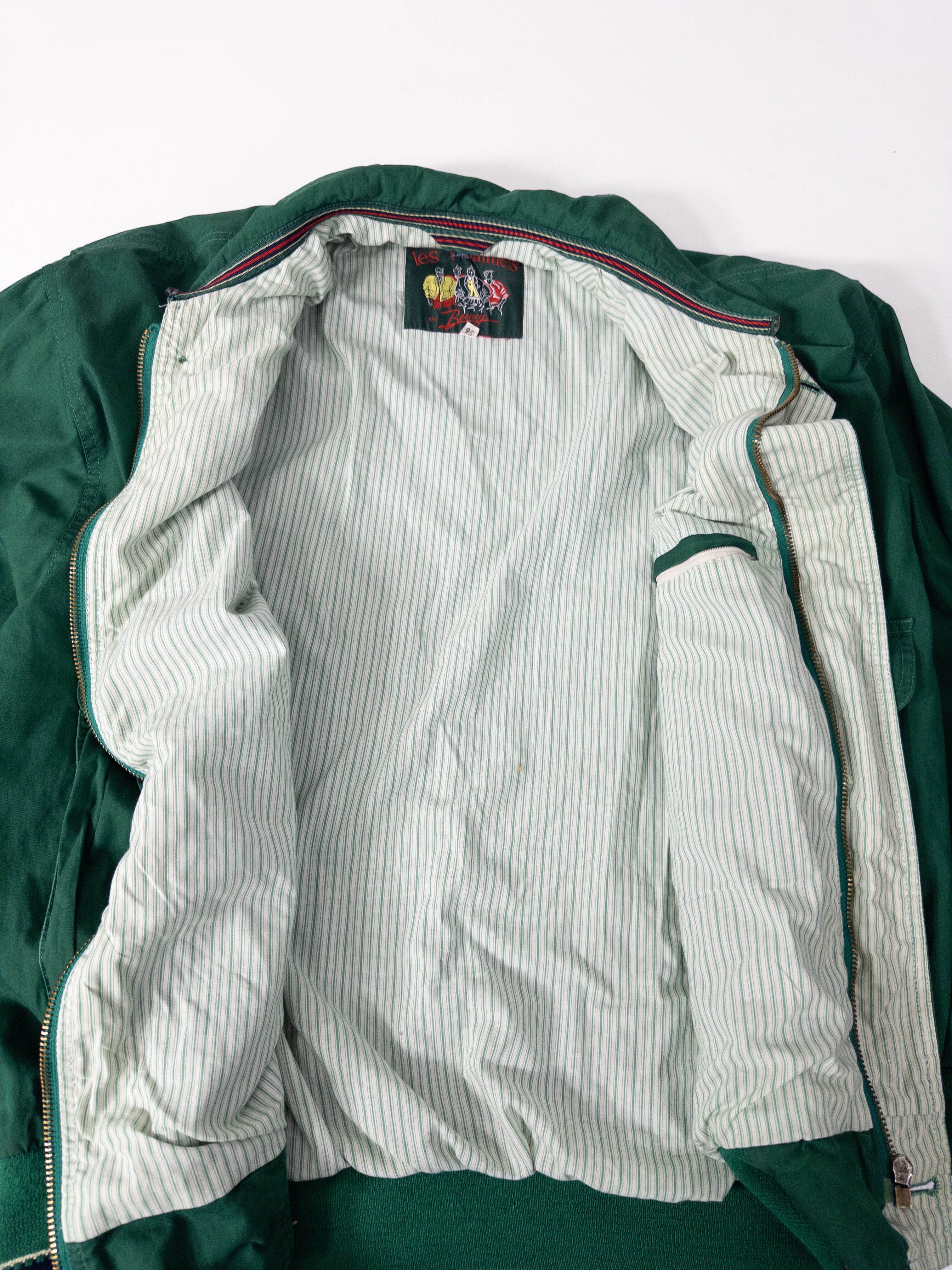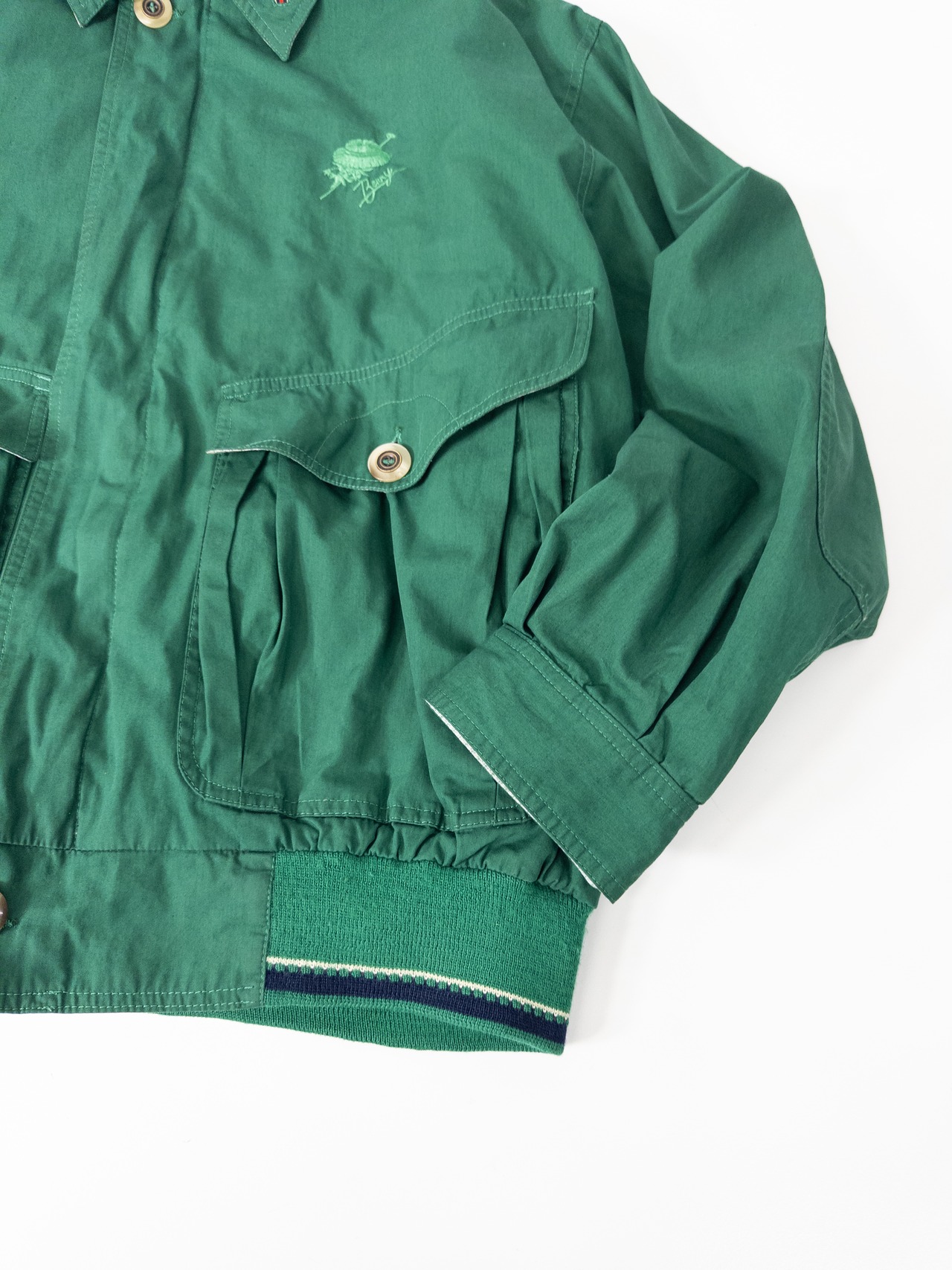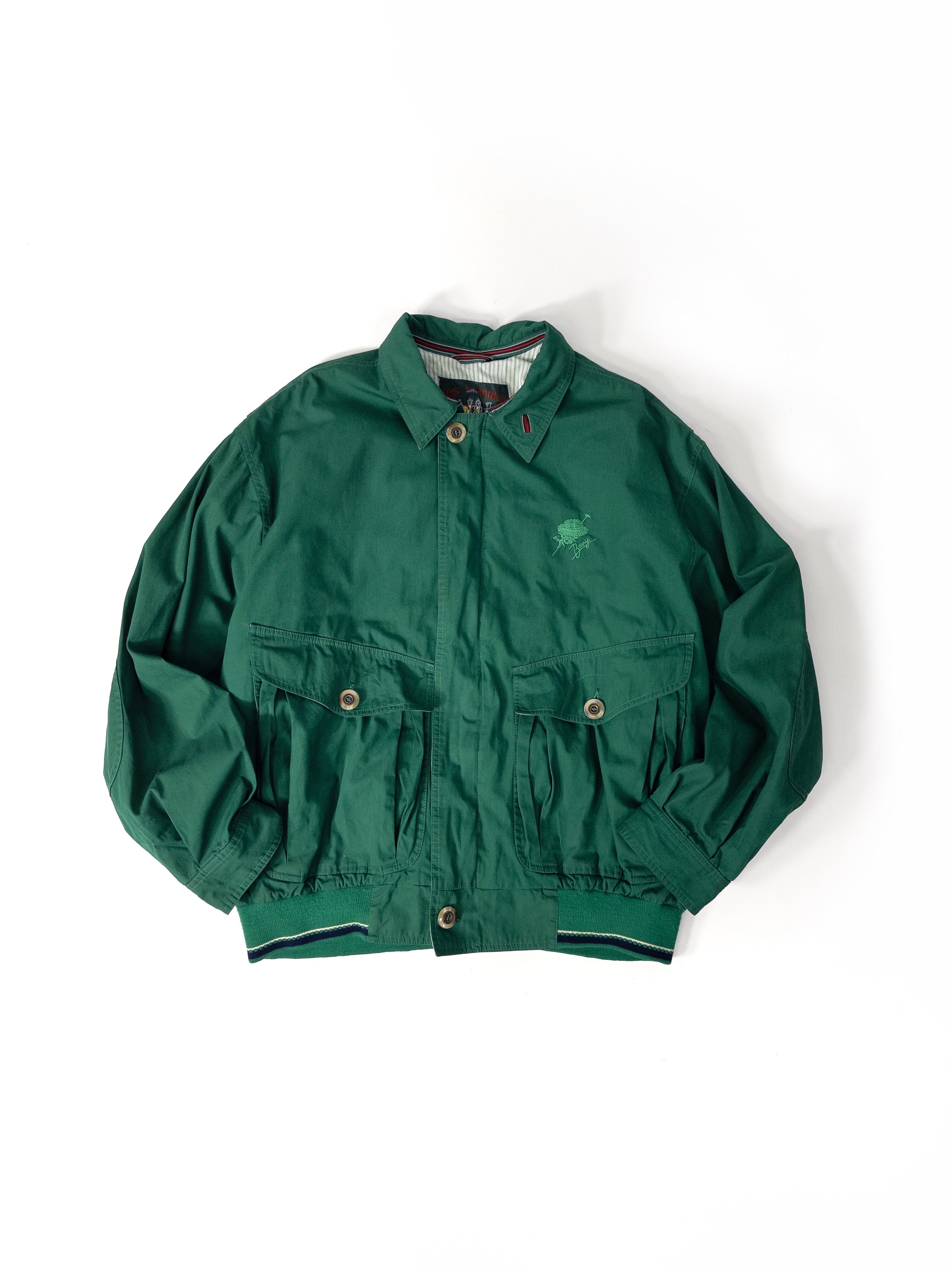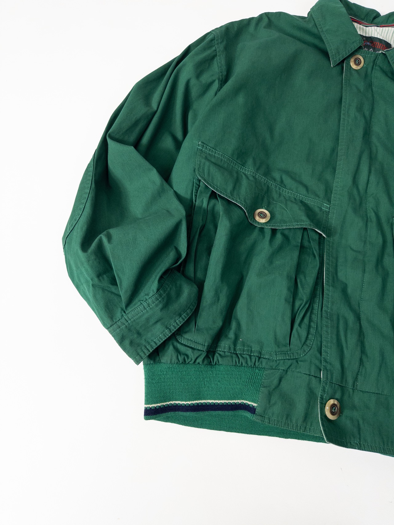深みのあるグリーンボディに、ライニングのストライプや襟裏のトリコロールテープが効いた一枚。