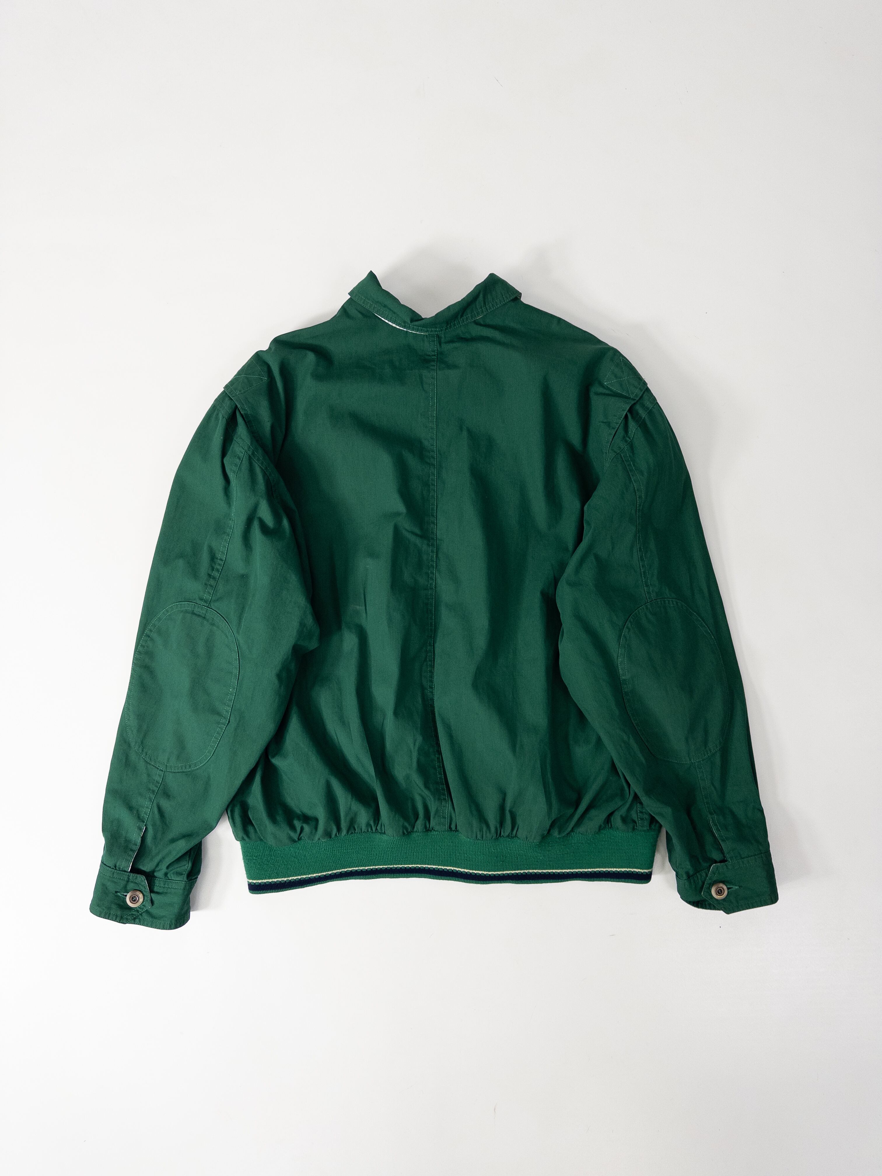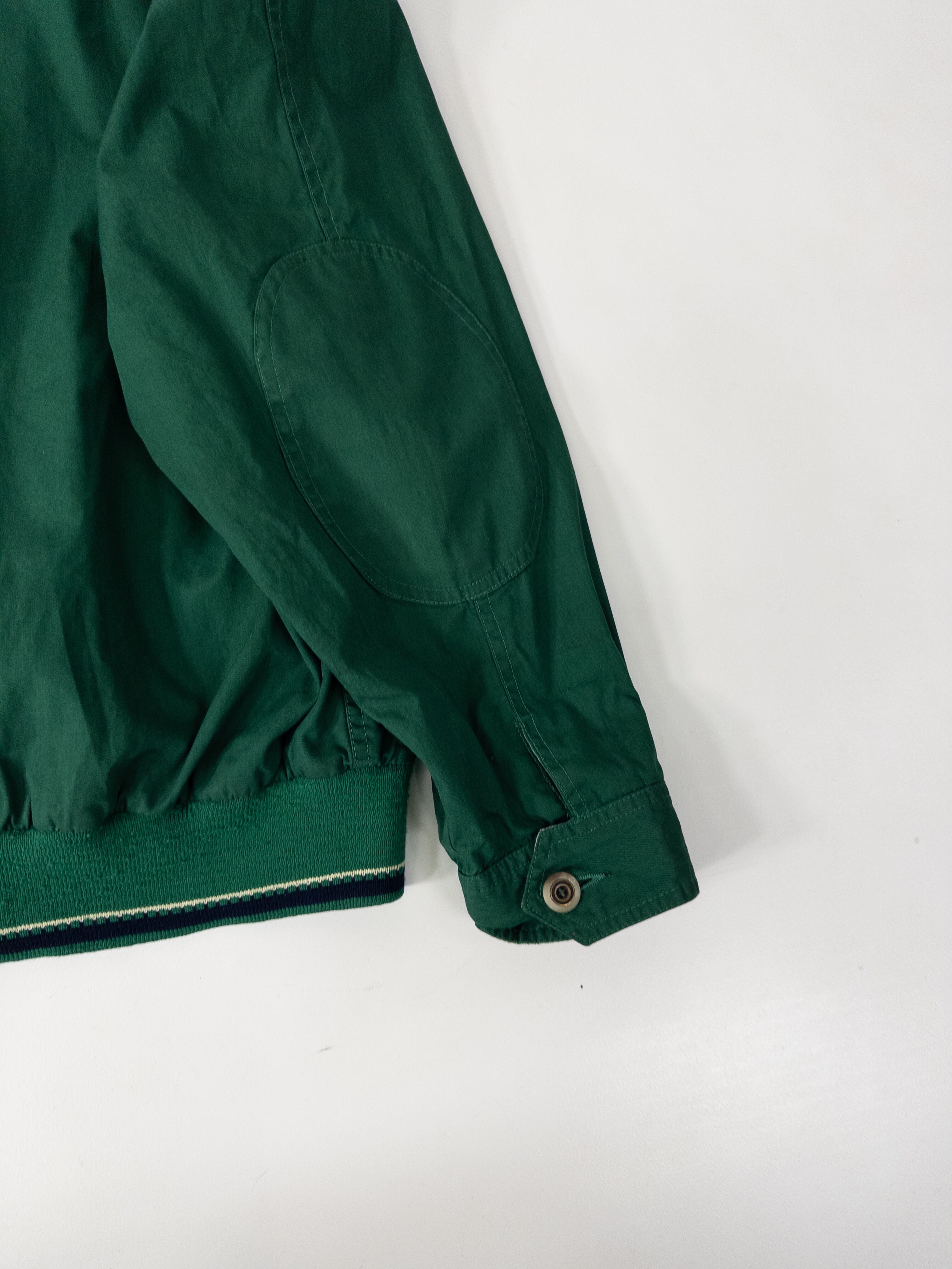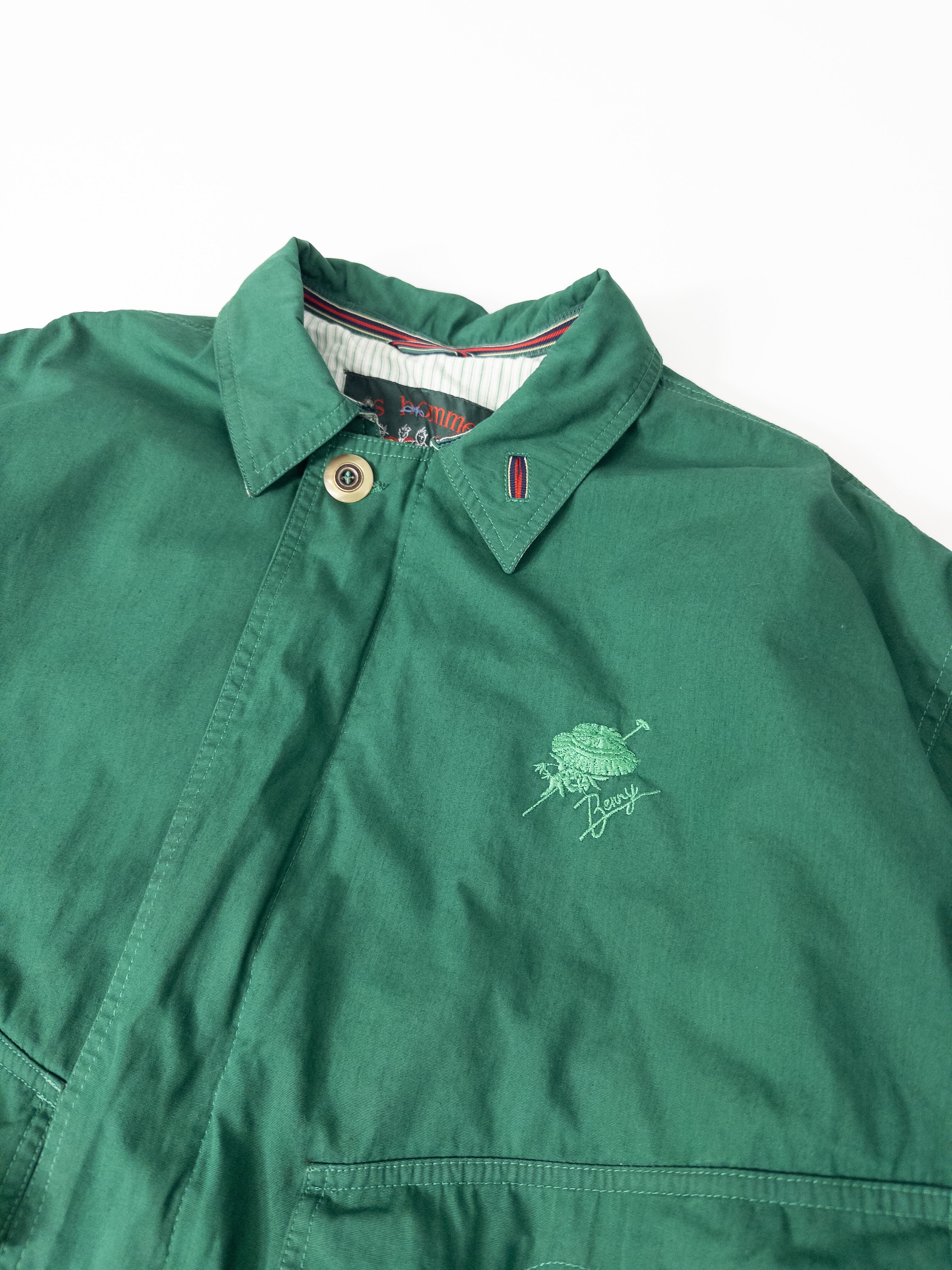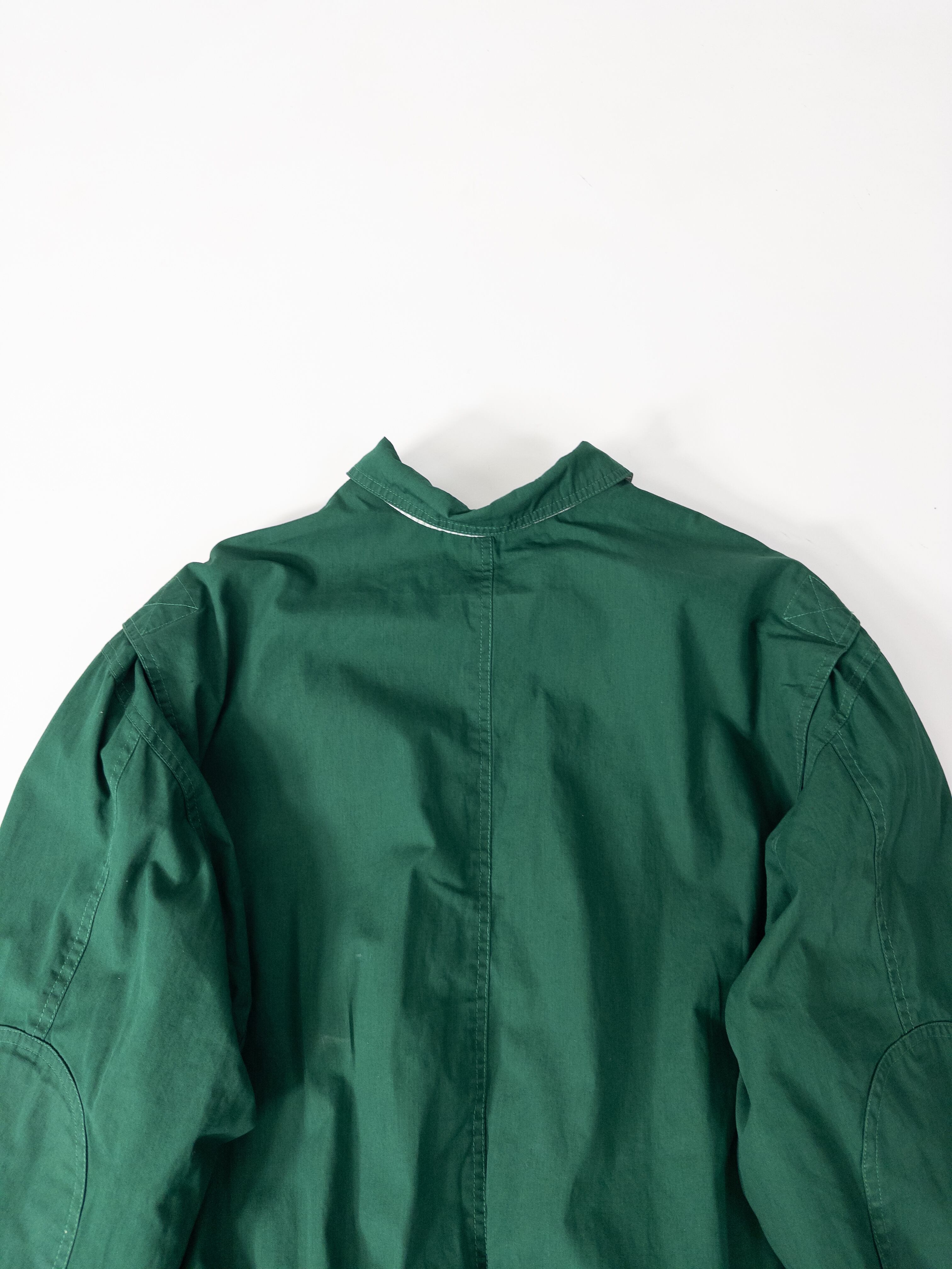 深みのあるグリーンボディに、ライニングのストライプや襟裏のトリコロールテープが効いた一枚。