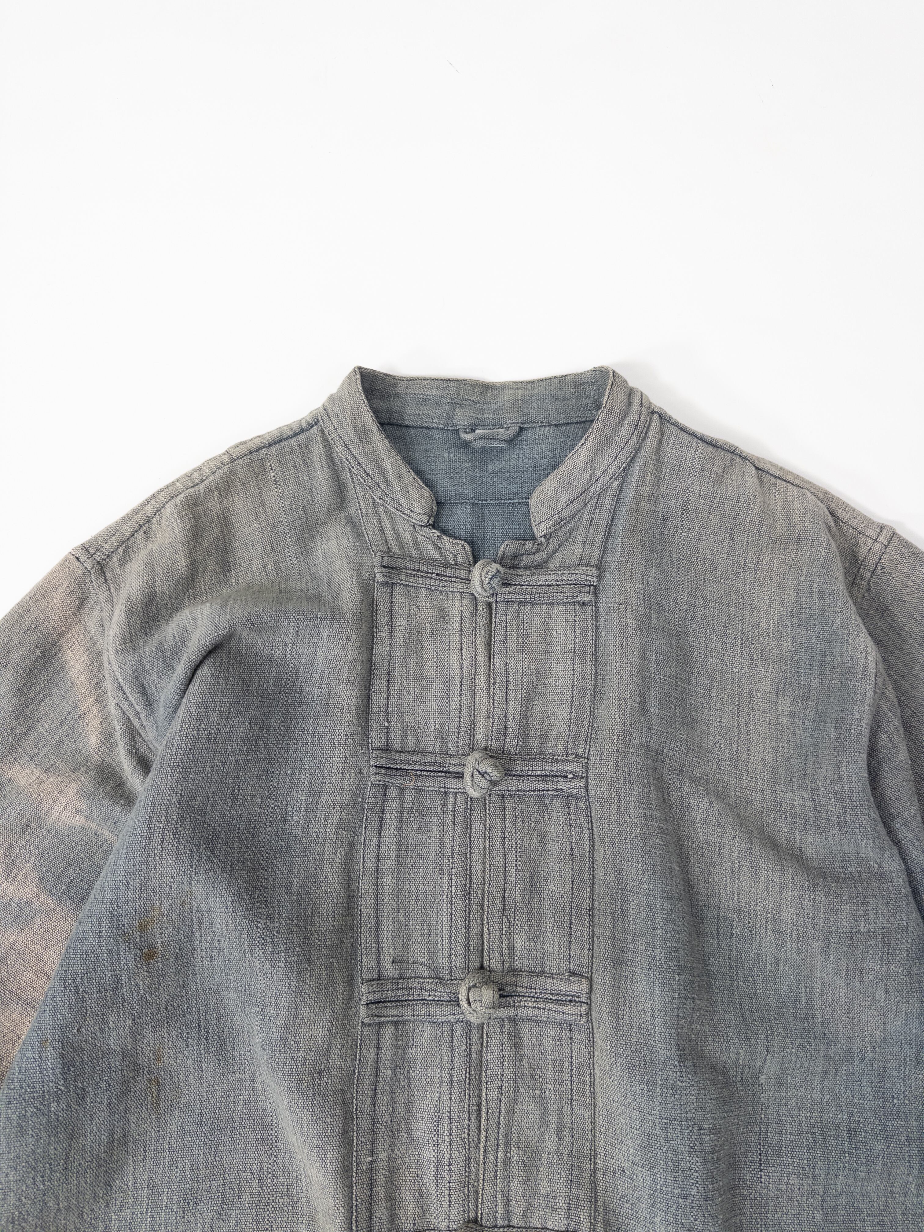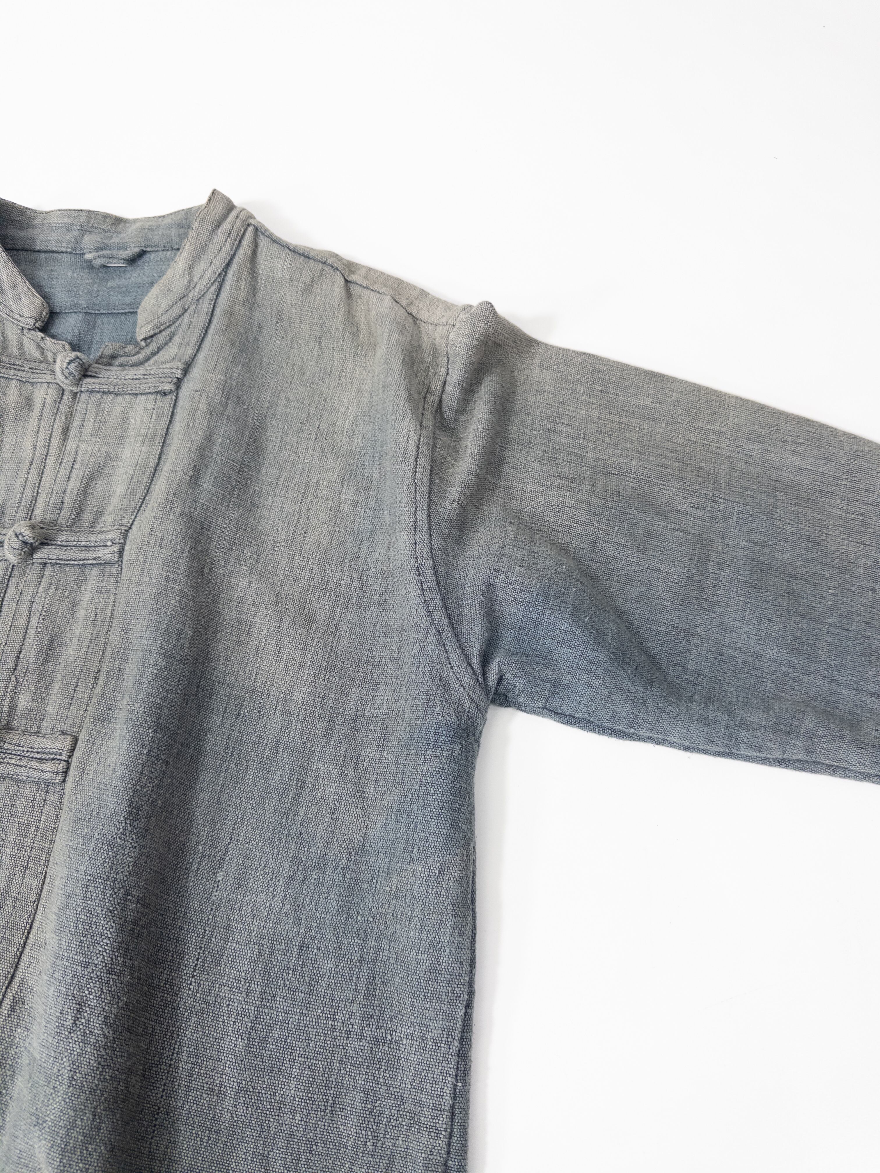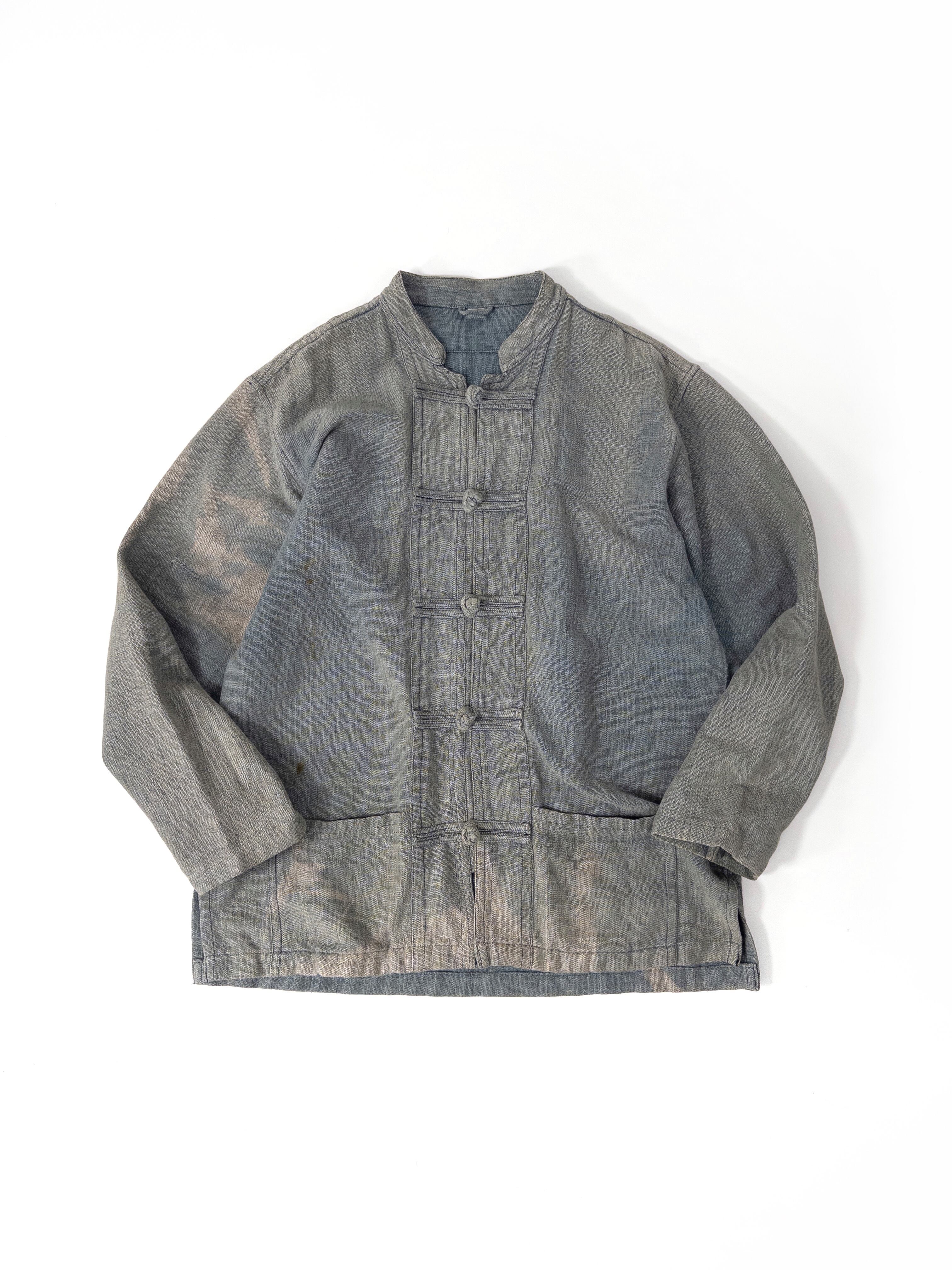 チャイナボタンの構造ながらも、全体にワークウェアのような土っぽさが残っていて、どこかミリタリーとフォークが混じった雰囲気があります。