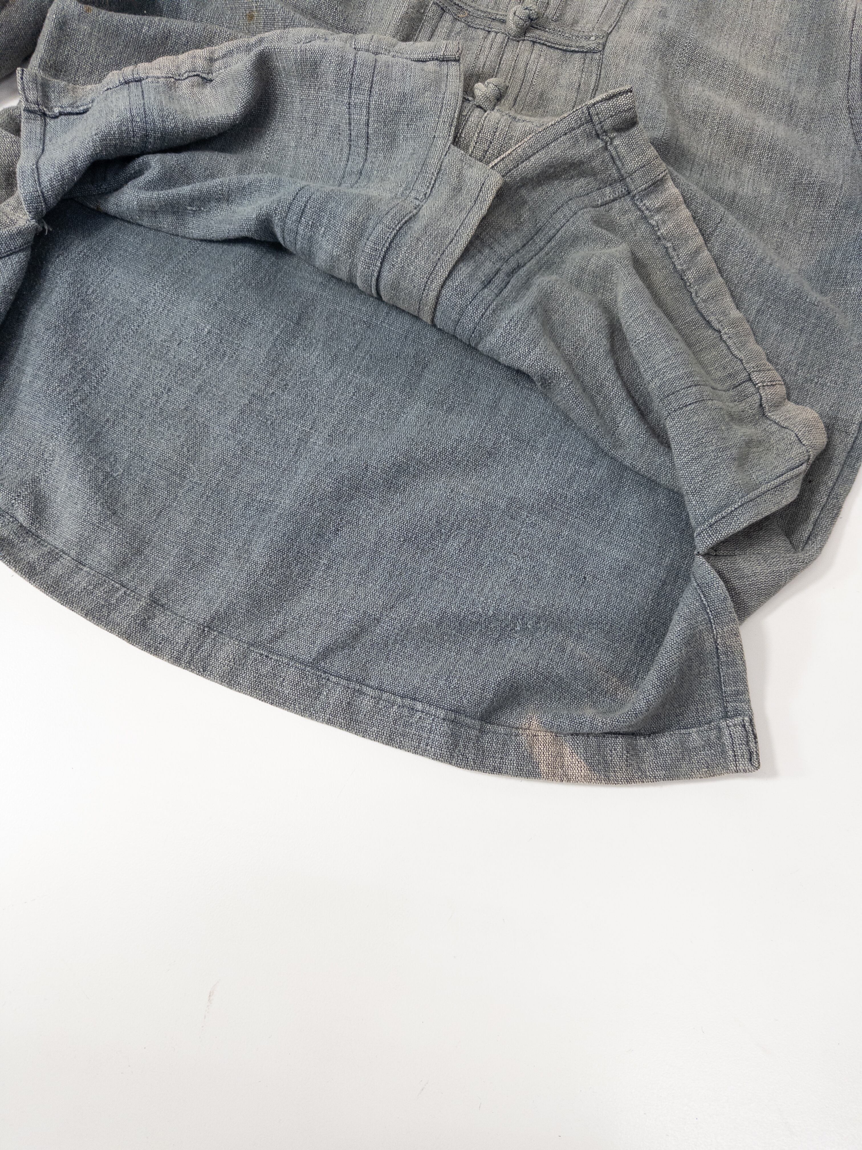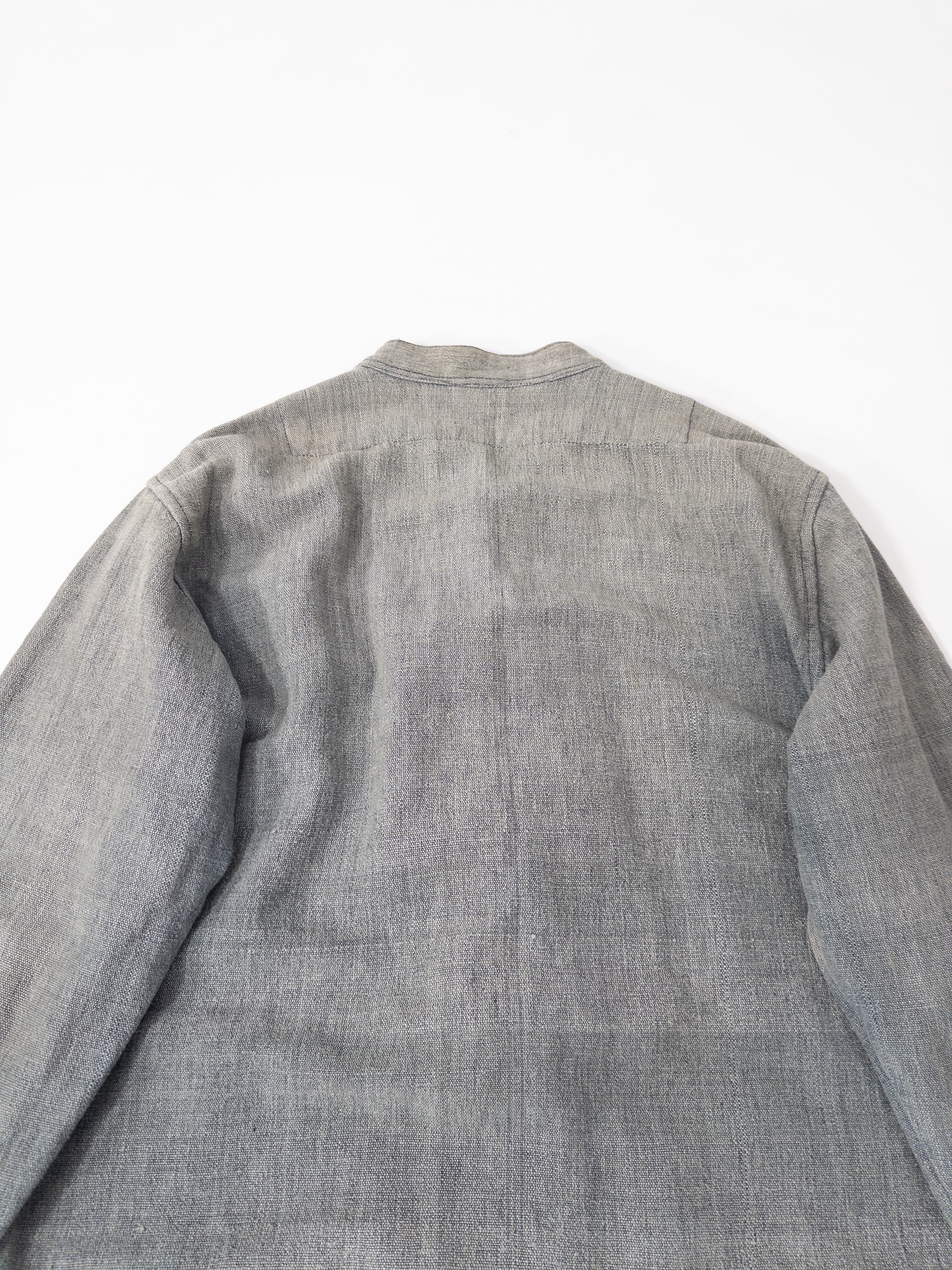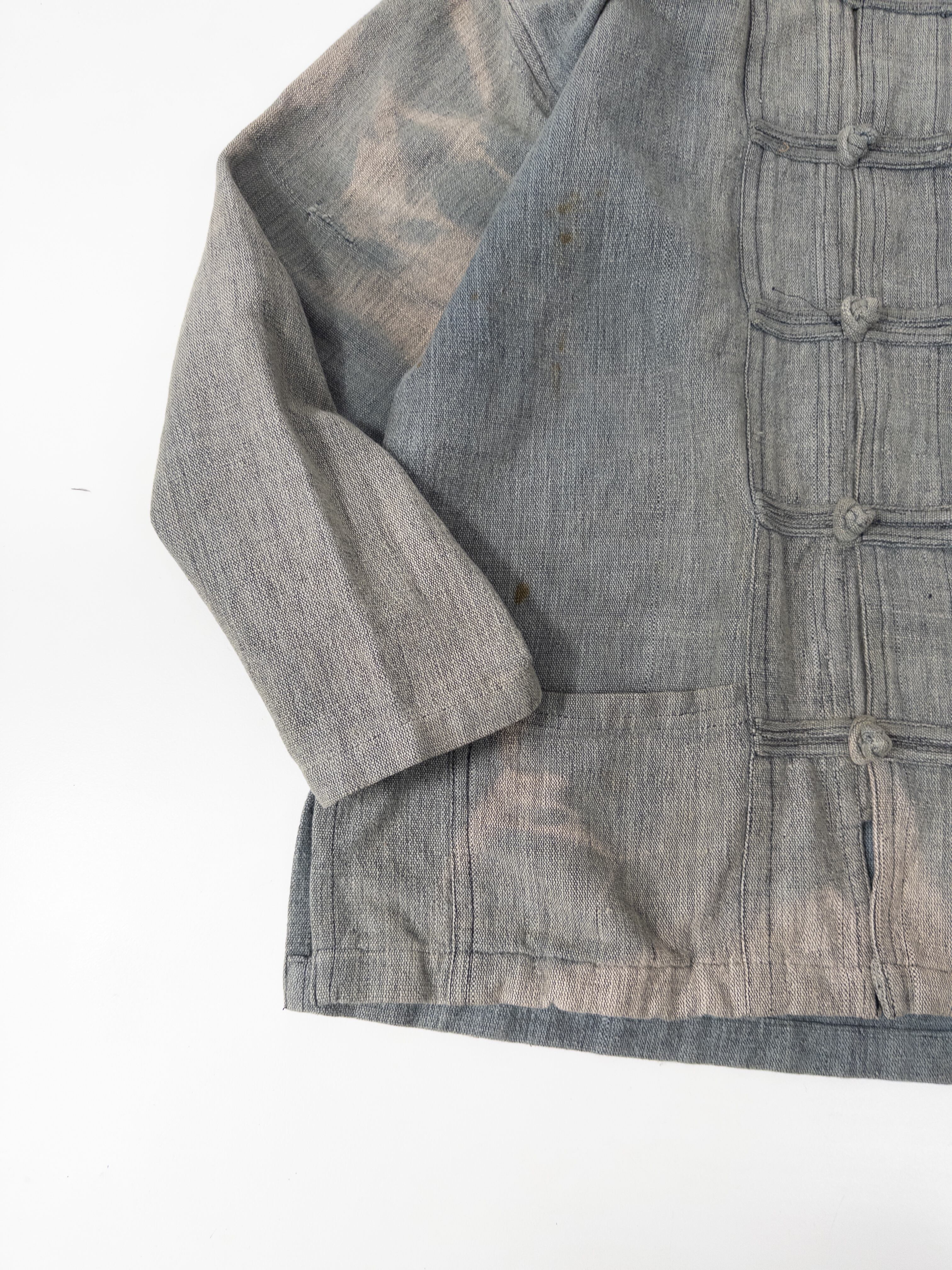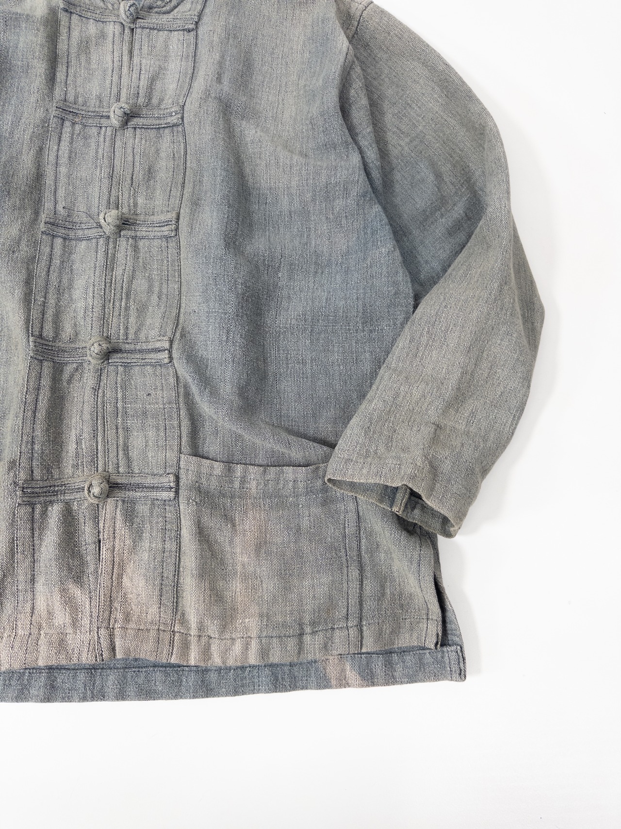 チャイナボタンの構造ながらも、全体にワークウェアのような土っぽさが残っていて、どこかミリタリーとフォークが混じった雰囲気があります。