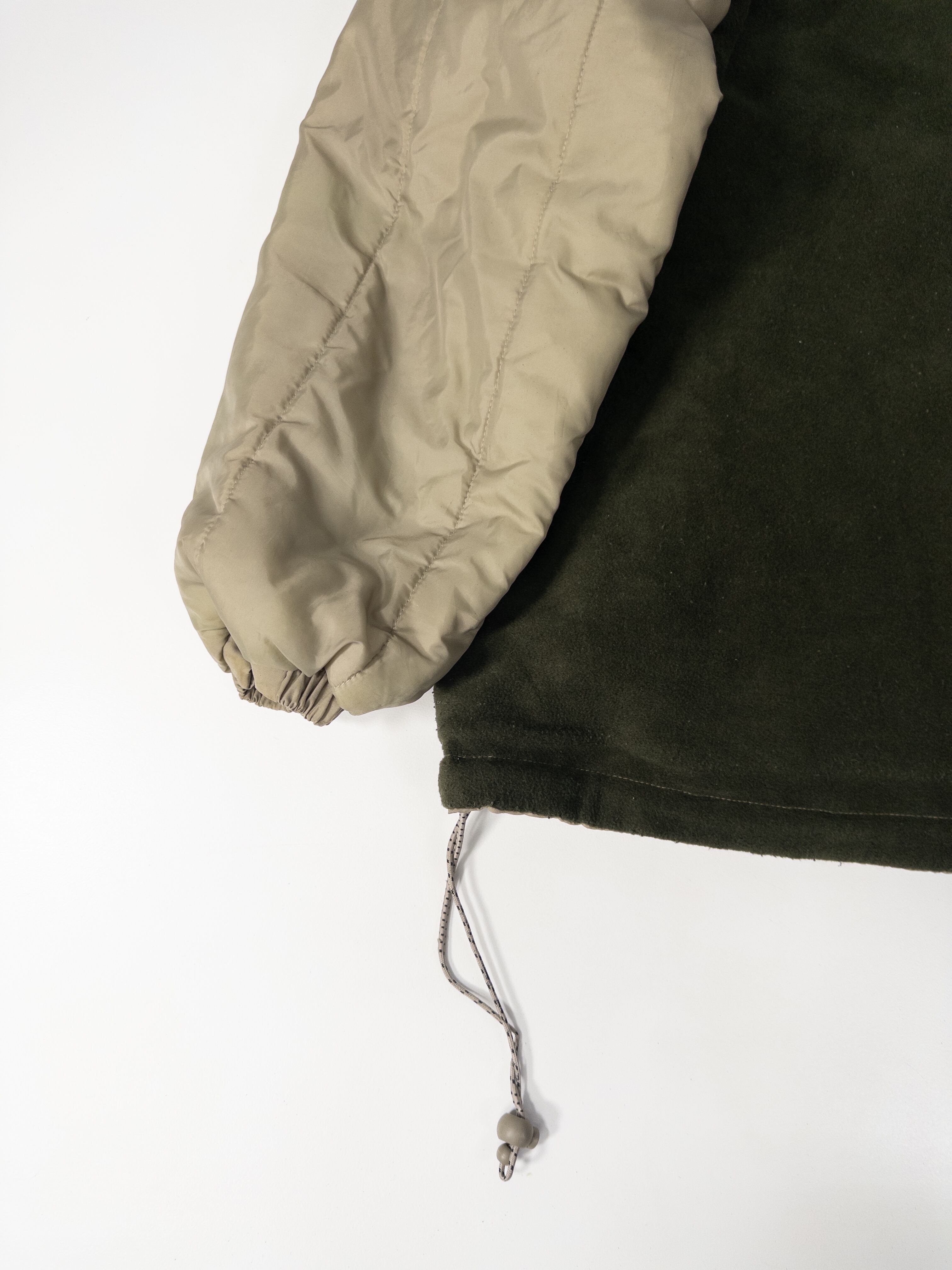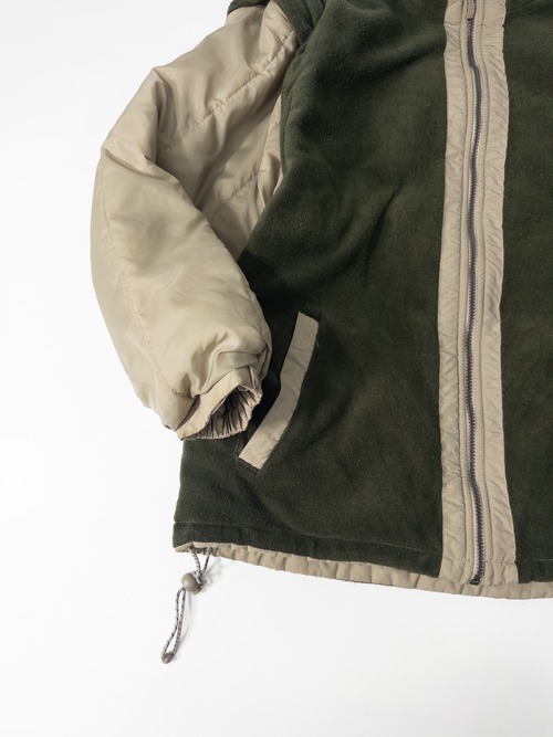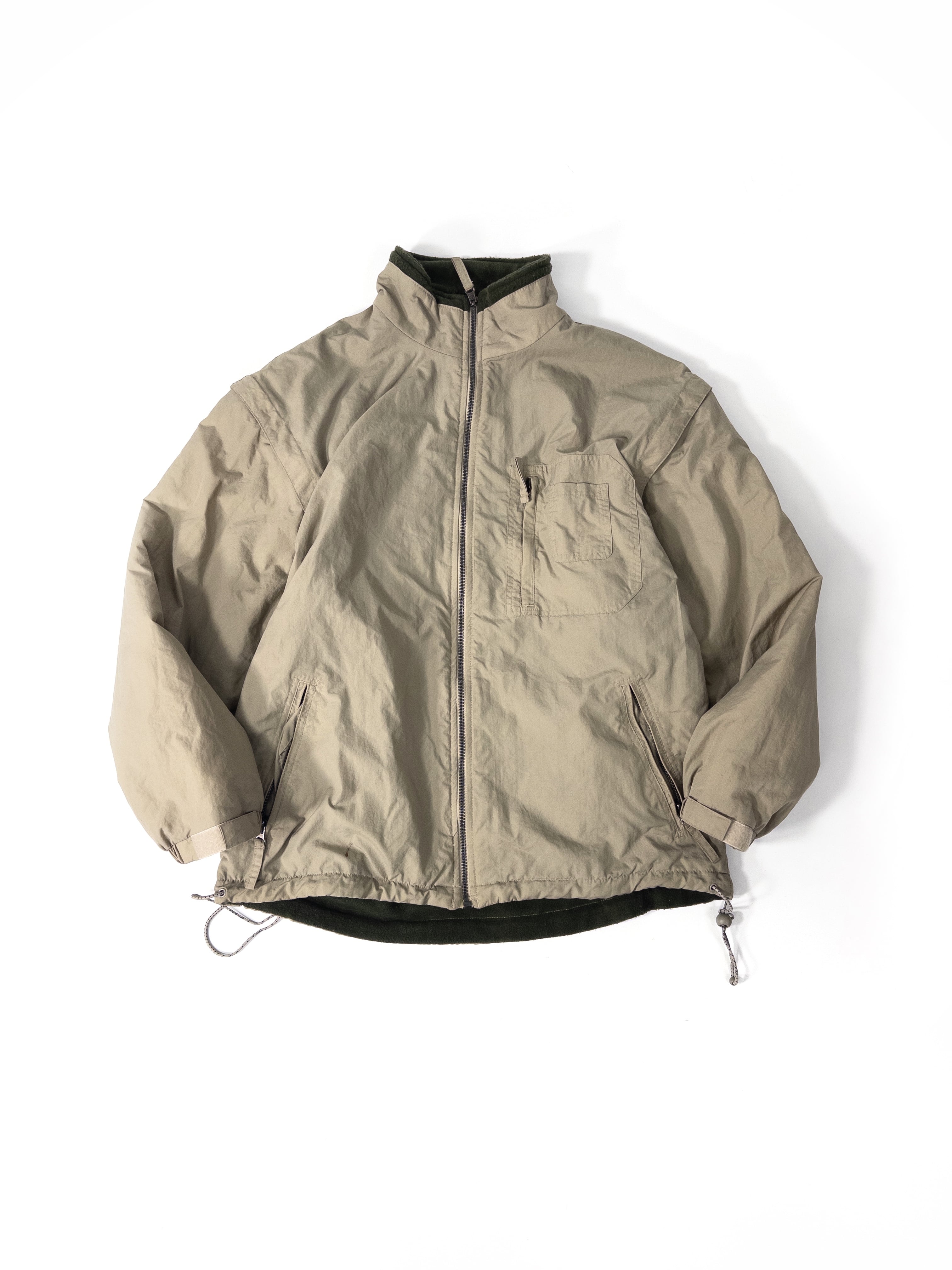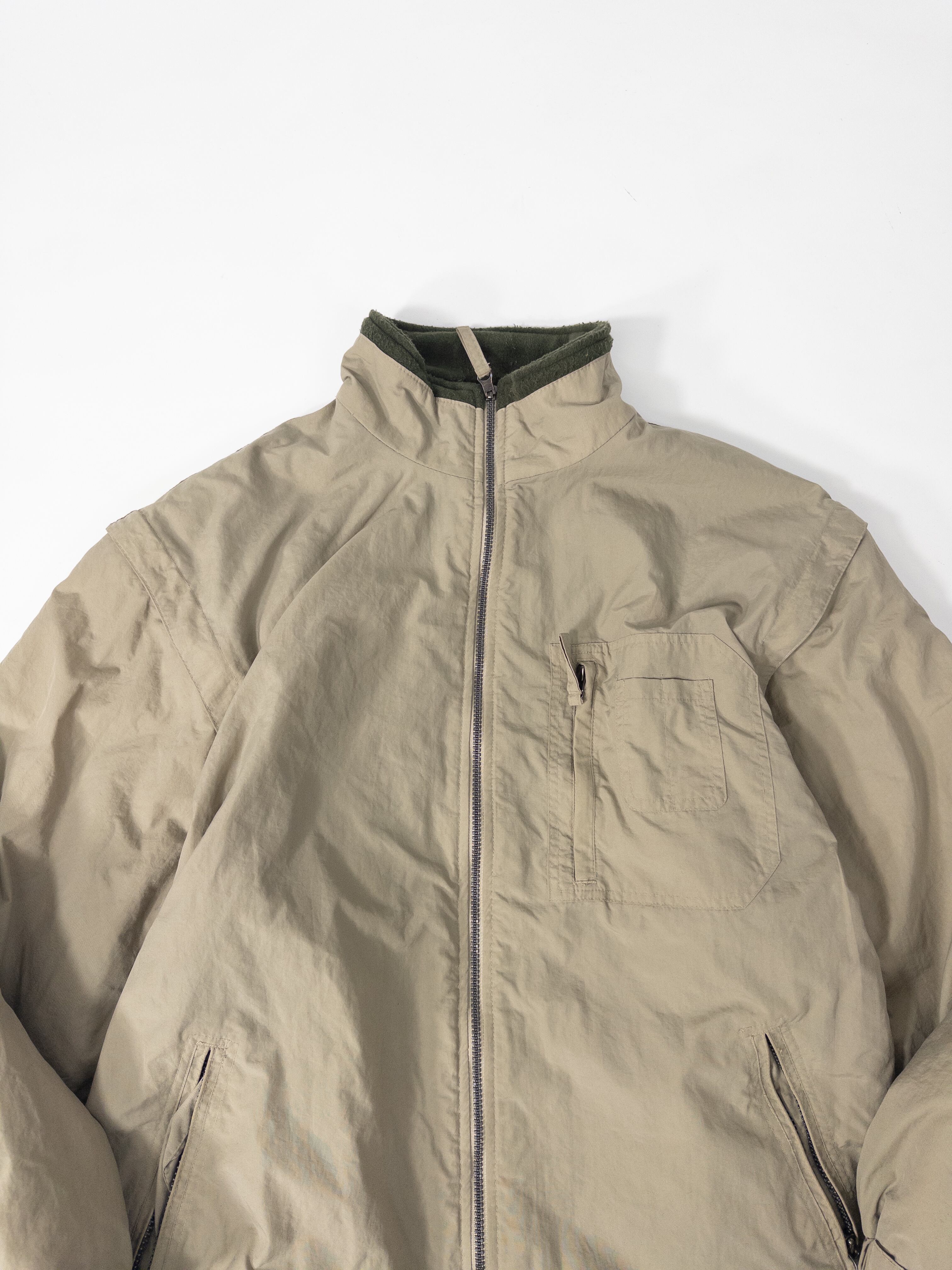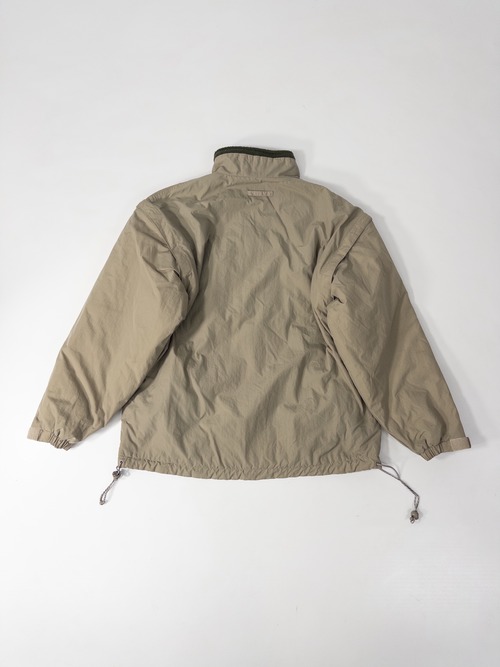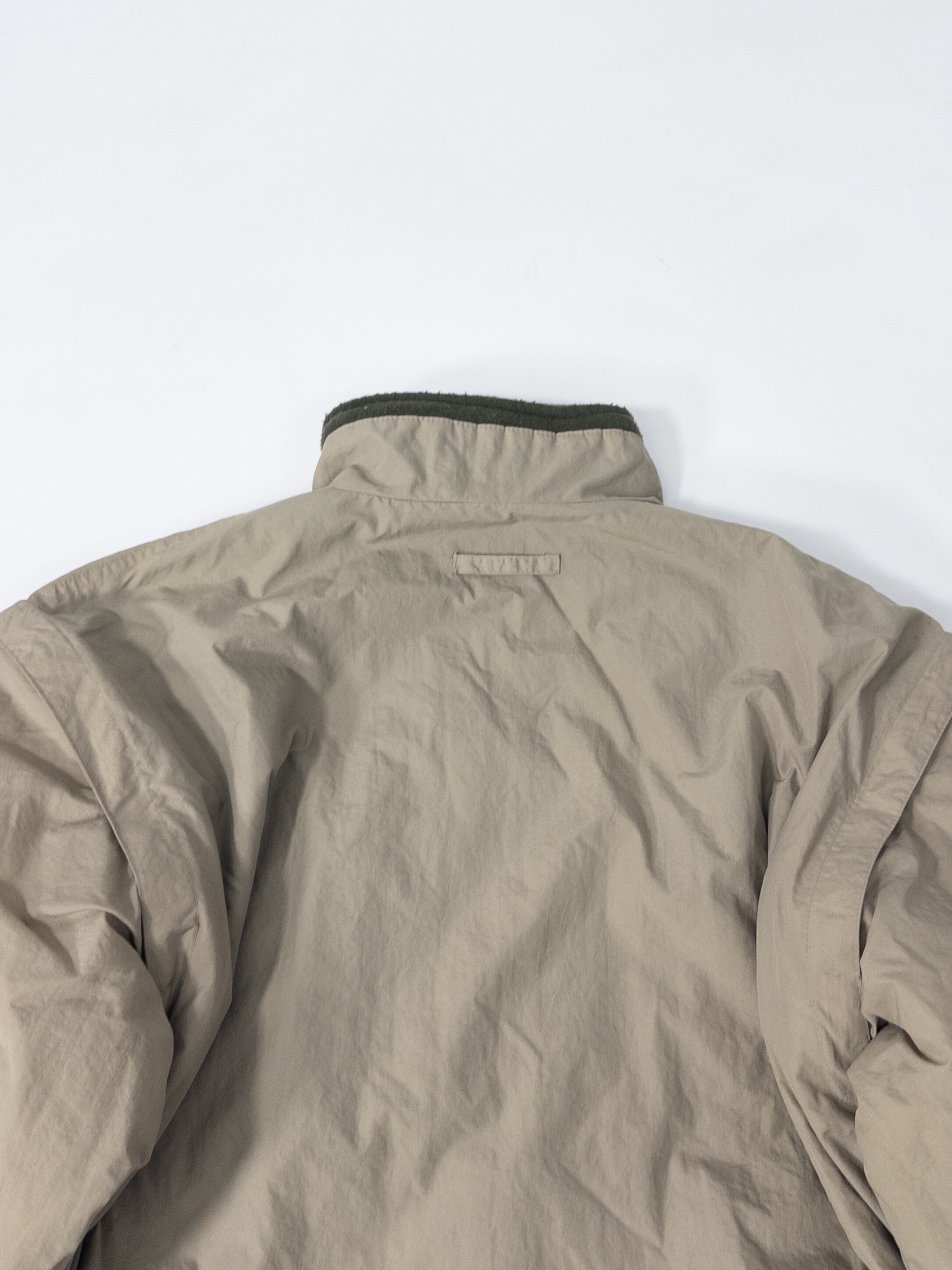 ナイロンシェルとフリースを組み合わせた構成で、片面はクリーンなベージュのナイロン、もう片面は深いオリーブのフリース仕様。