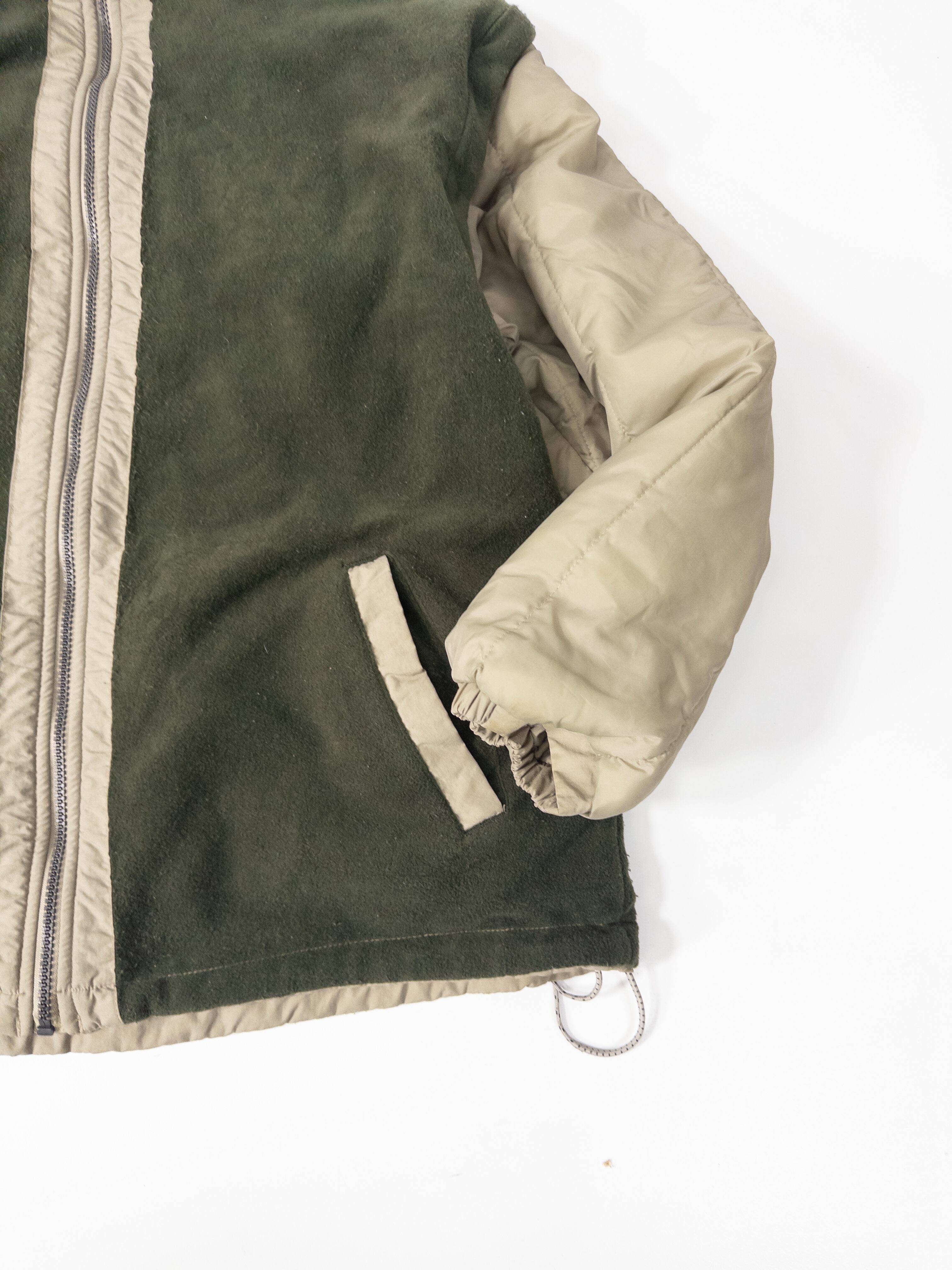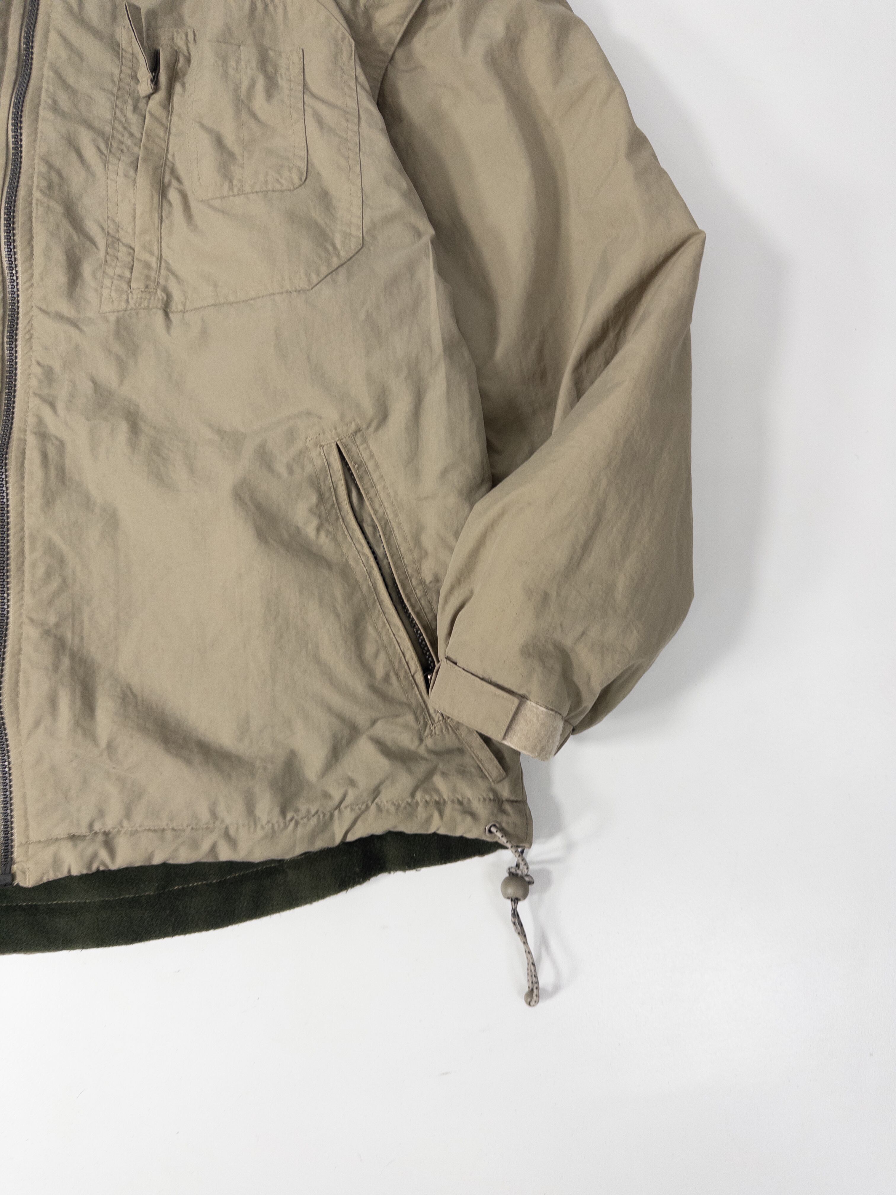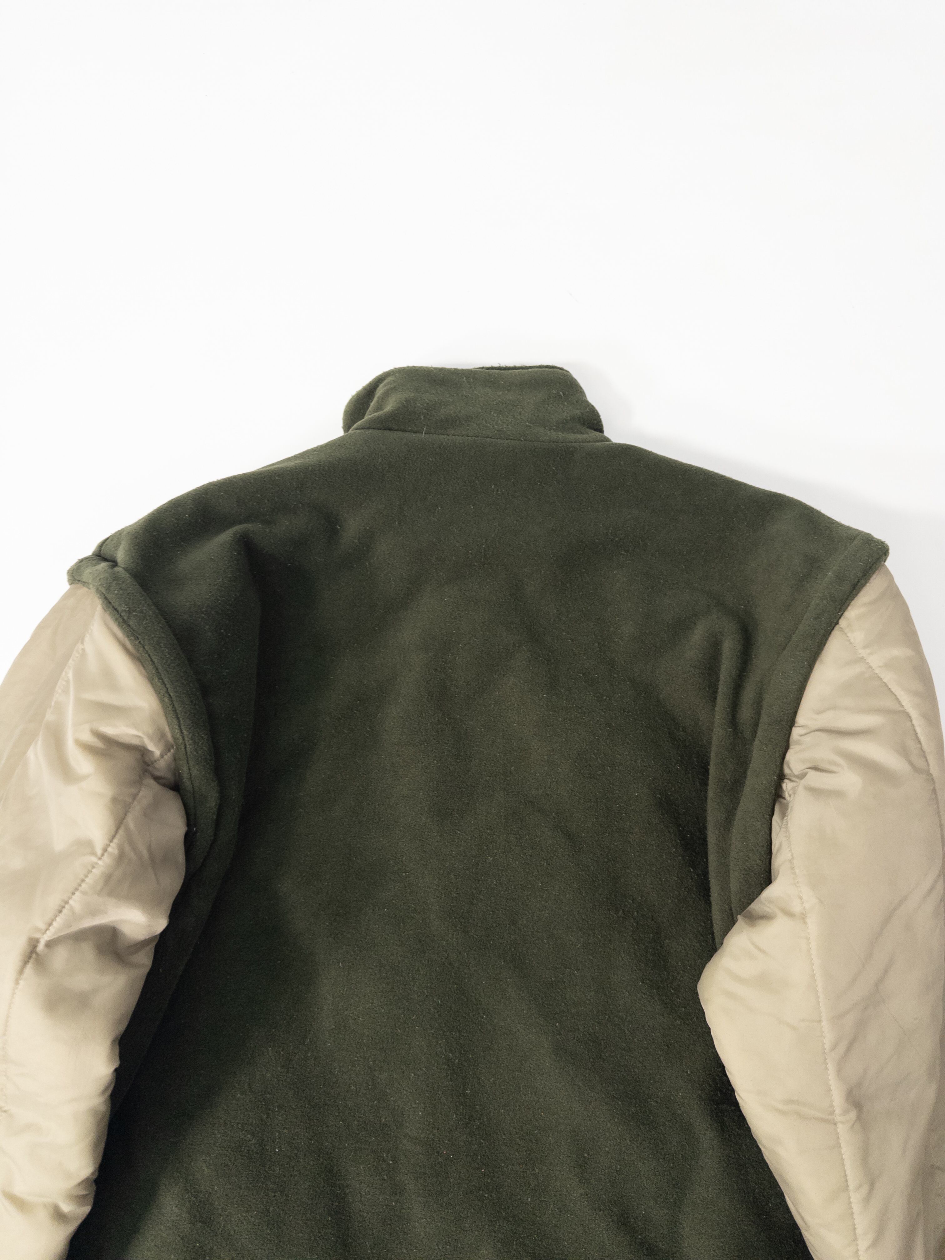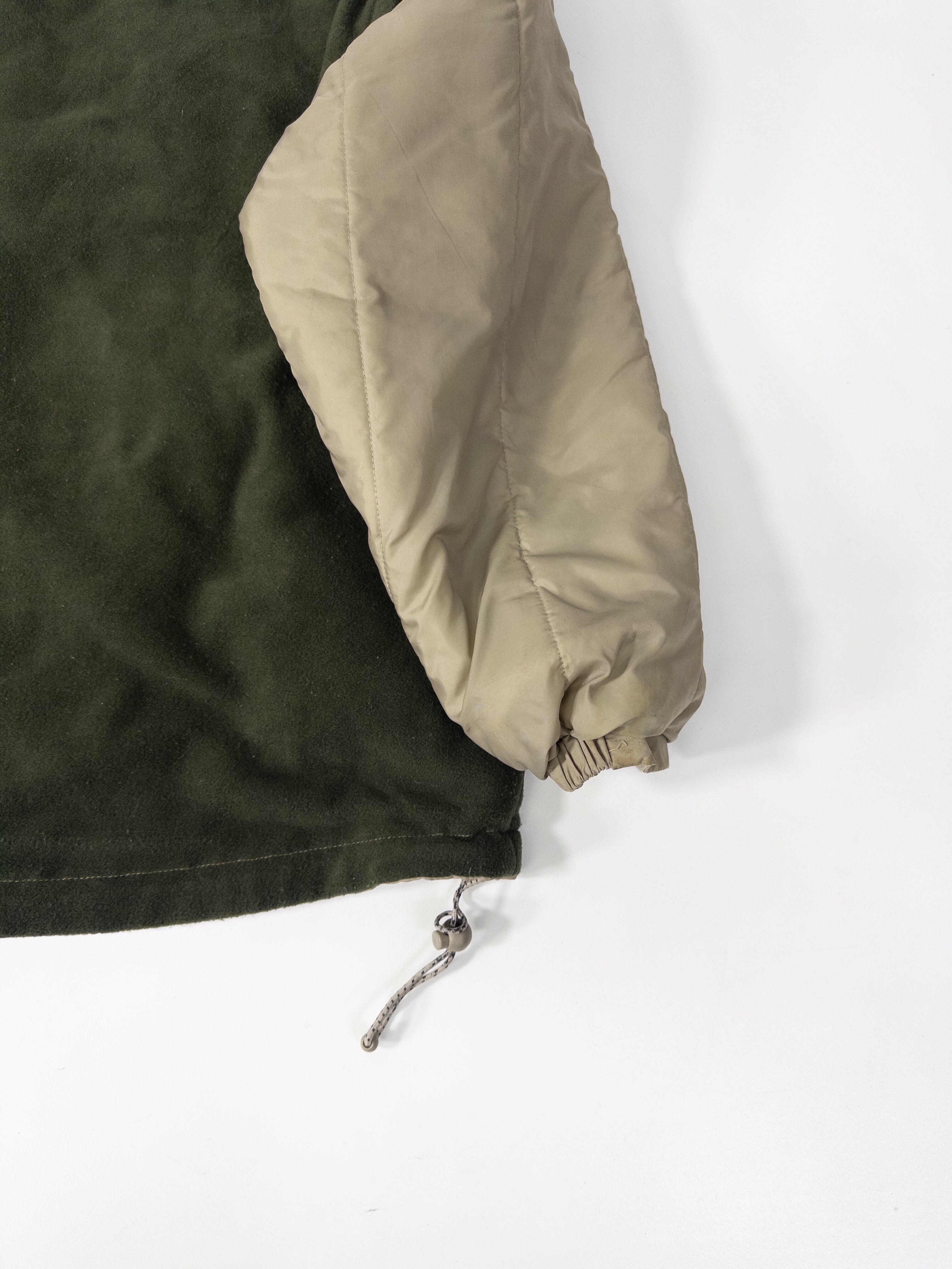 ナイロンシェルとフリースを組み合わせた構成で、片面はクリーンなベージュのナイロン、もう片面は深いオリーブのフリース仕様。