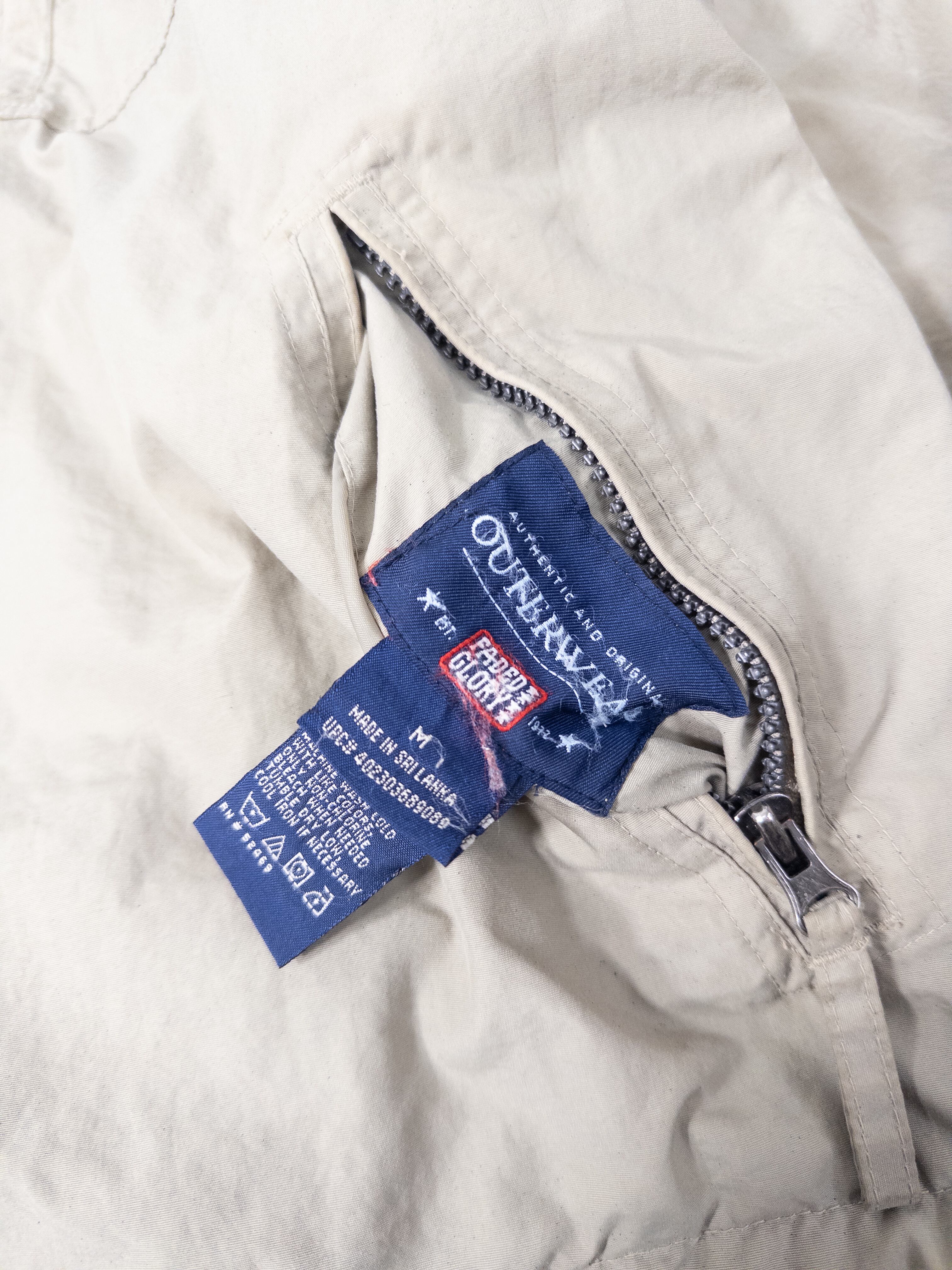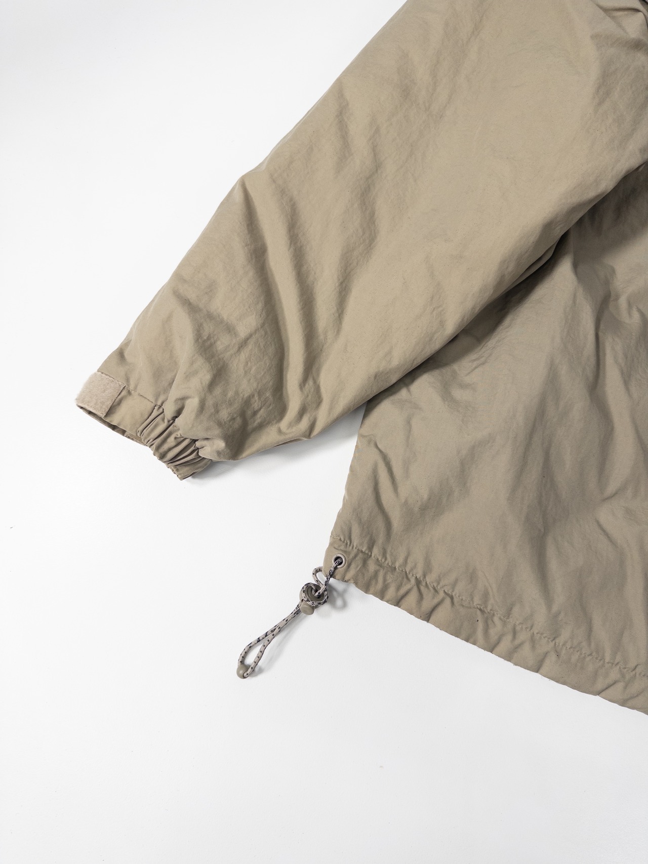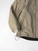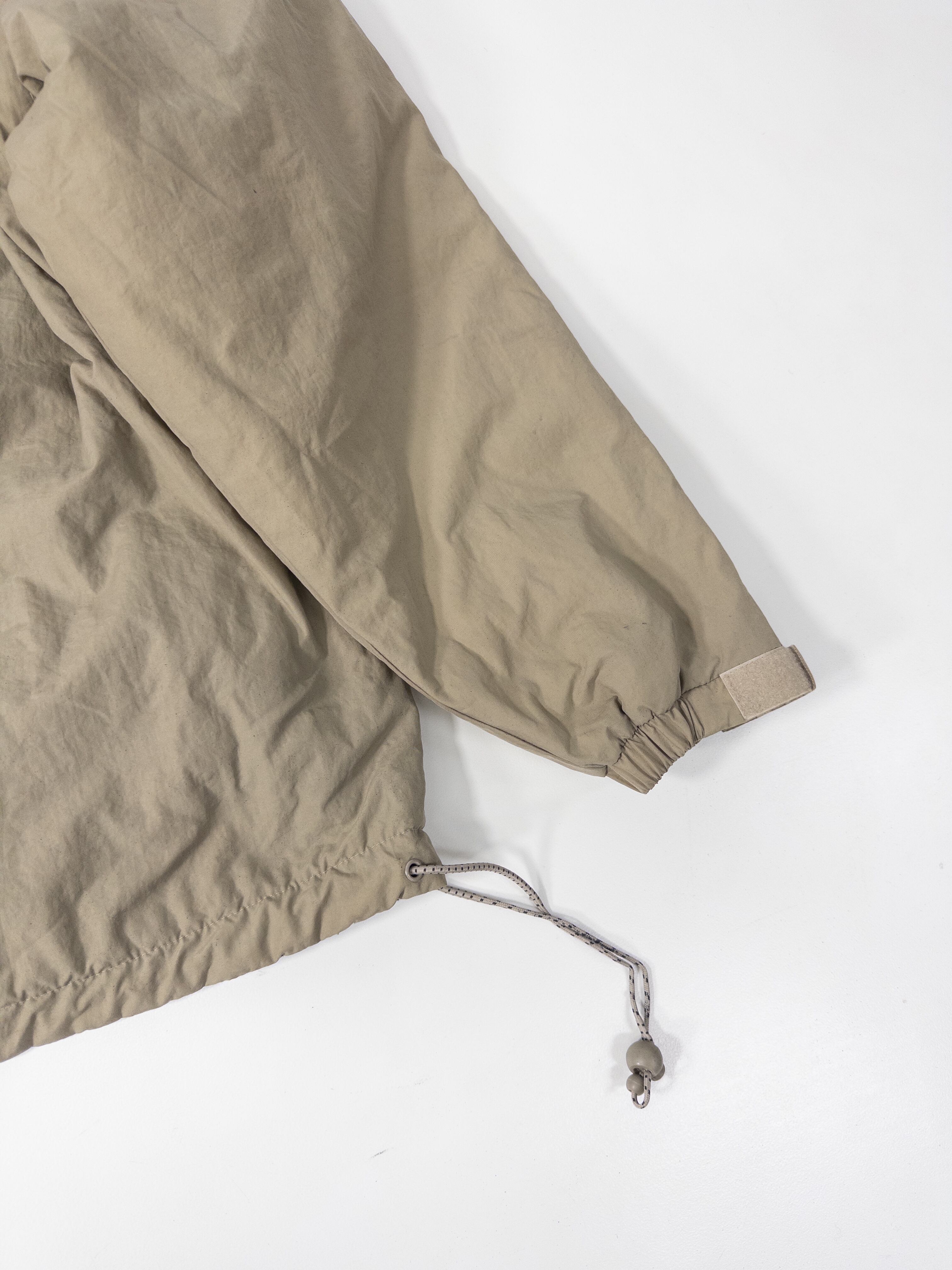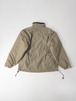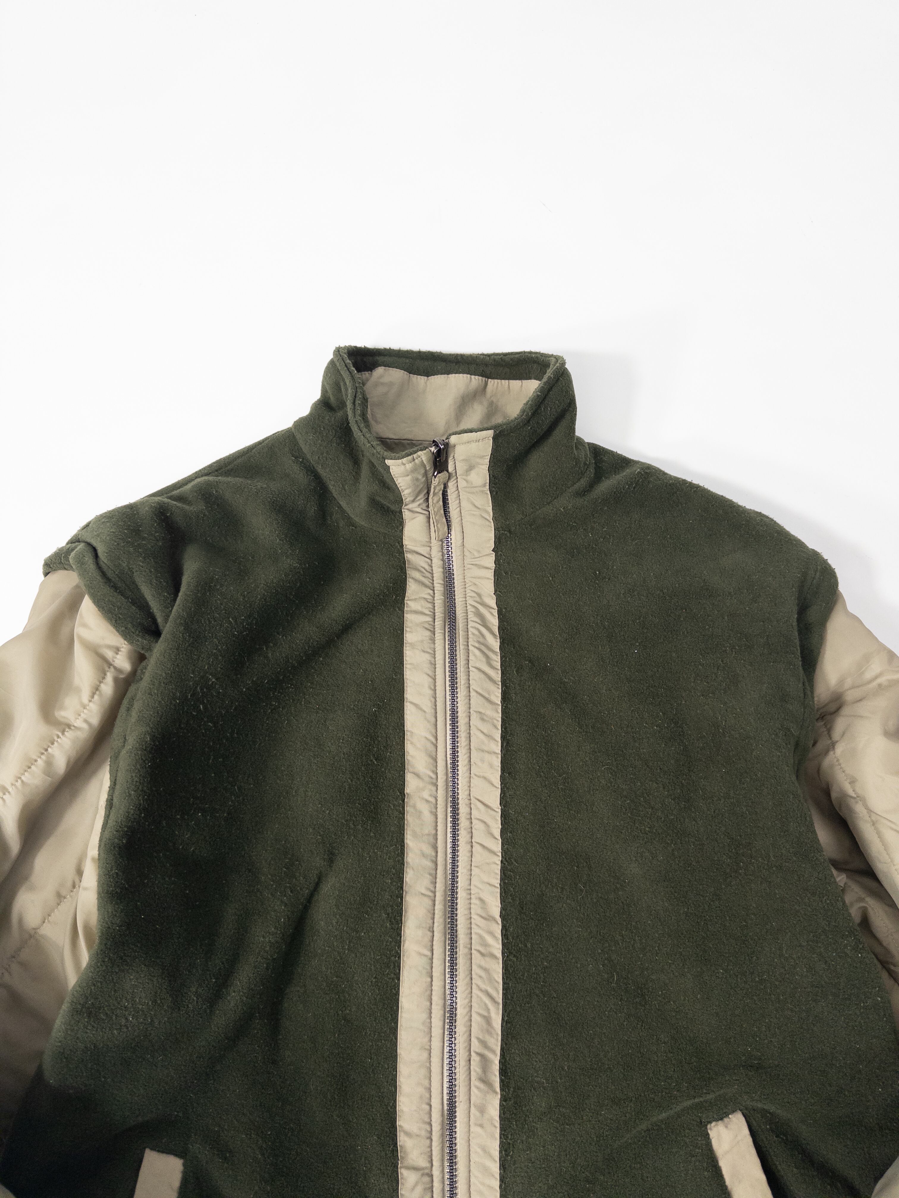 ナイロンシェルとフリースを組み合わせた構成で、片面はクリーンなベージュのナイロン、もう片面は深いオリーブのフリース仕様。