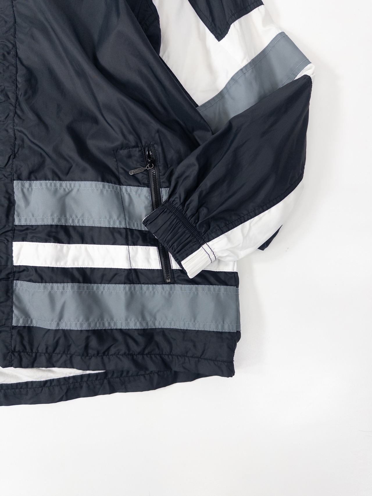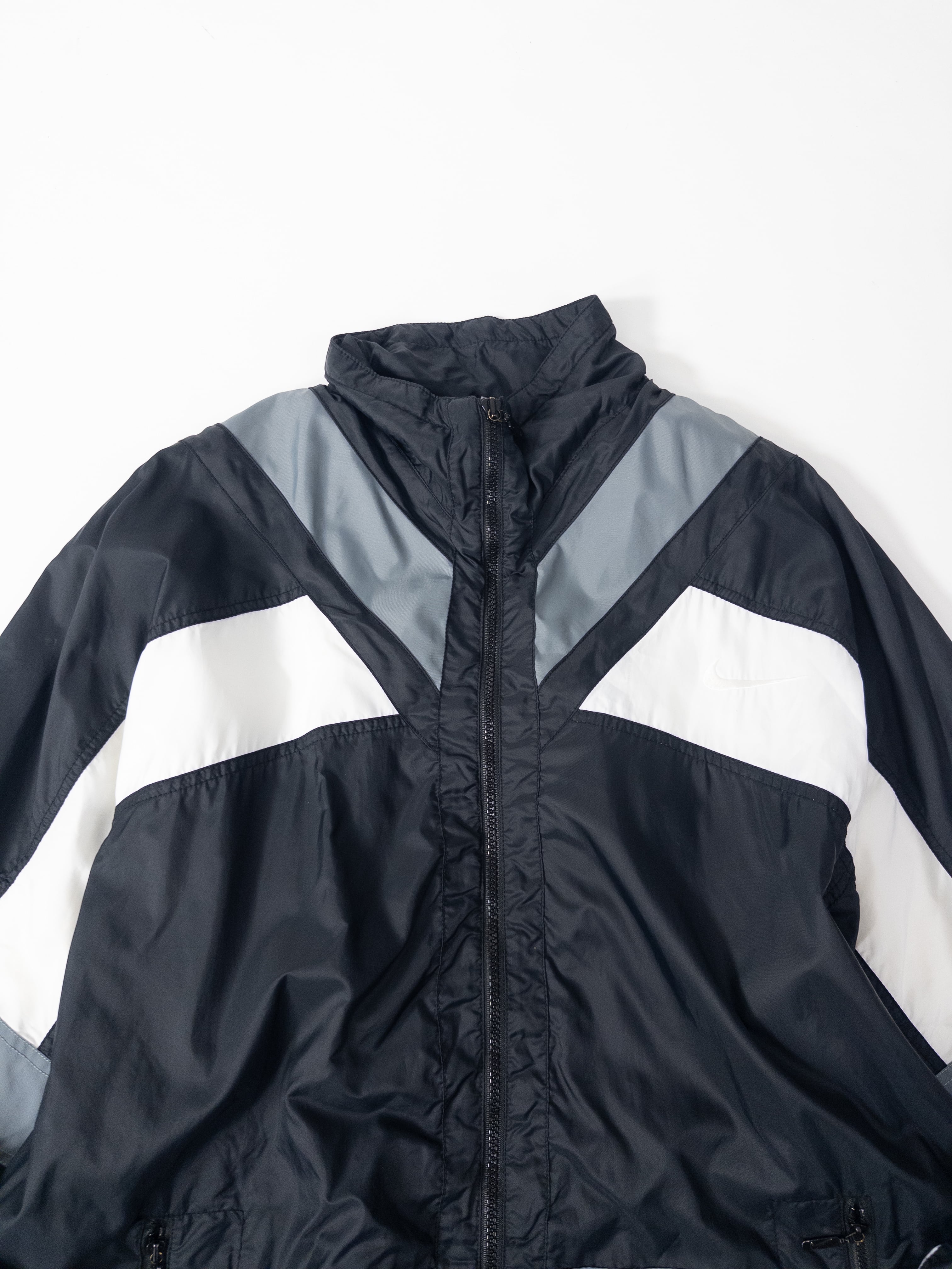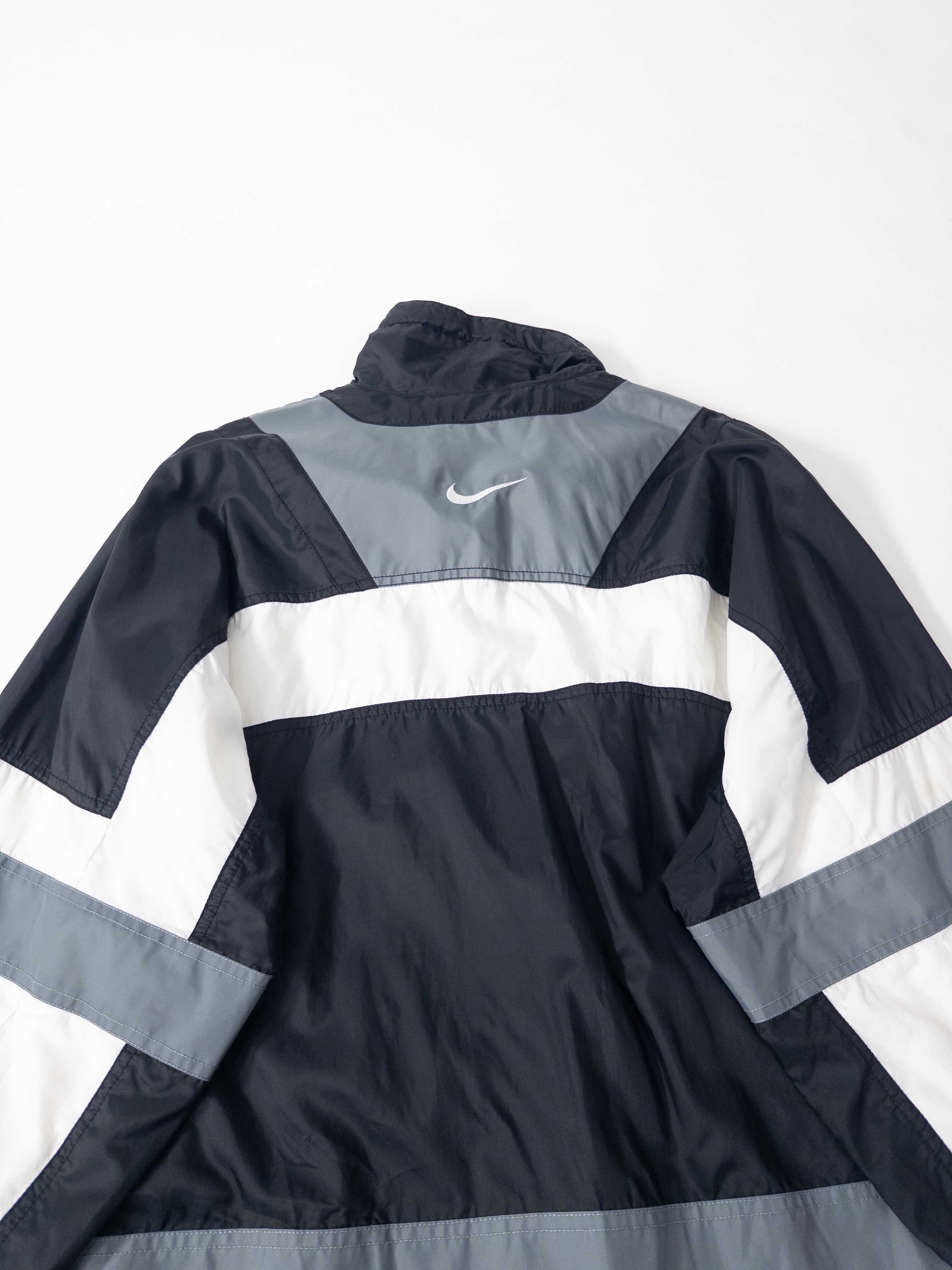 特に背面の 大きめNIKEロゴ と、フロント〜袖にかけて入るV字カッティングは、当時のナイキが一番デザインに遊んでた時代の象徴。シンプルな単色のナイロンより、「存在感のある切り替え」という魅力