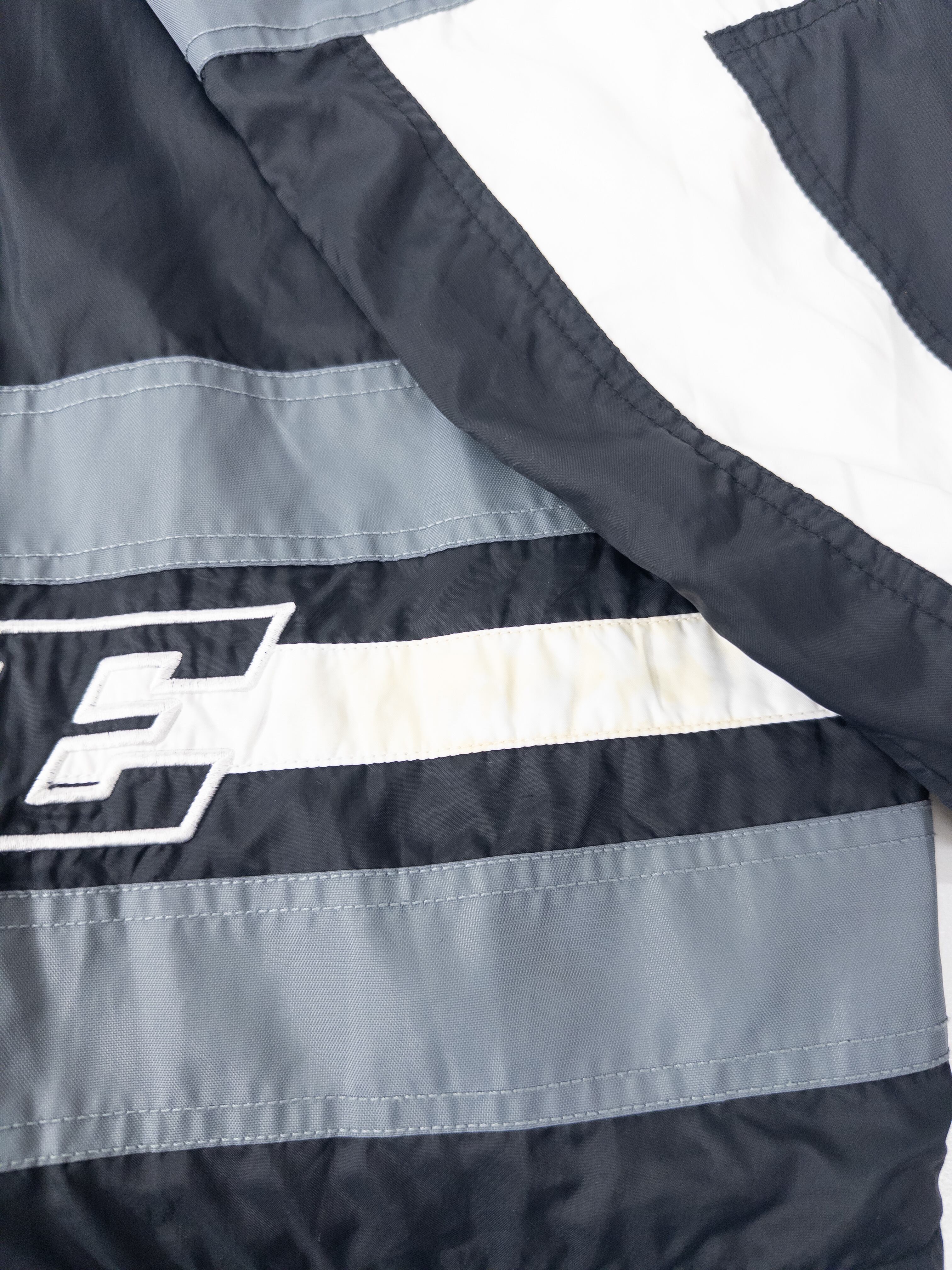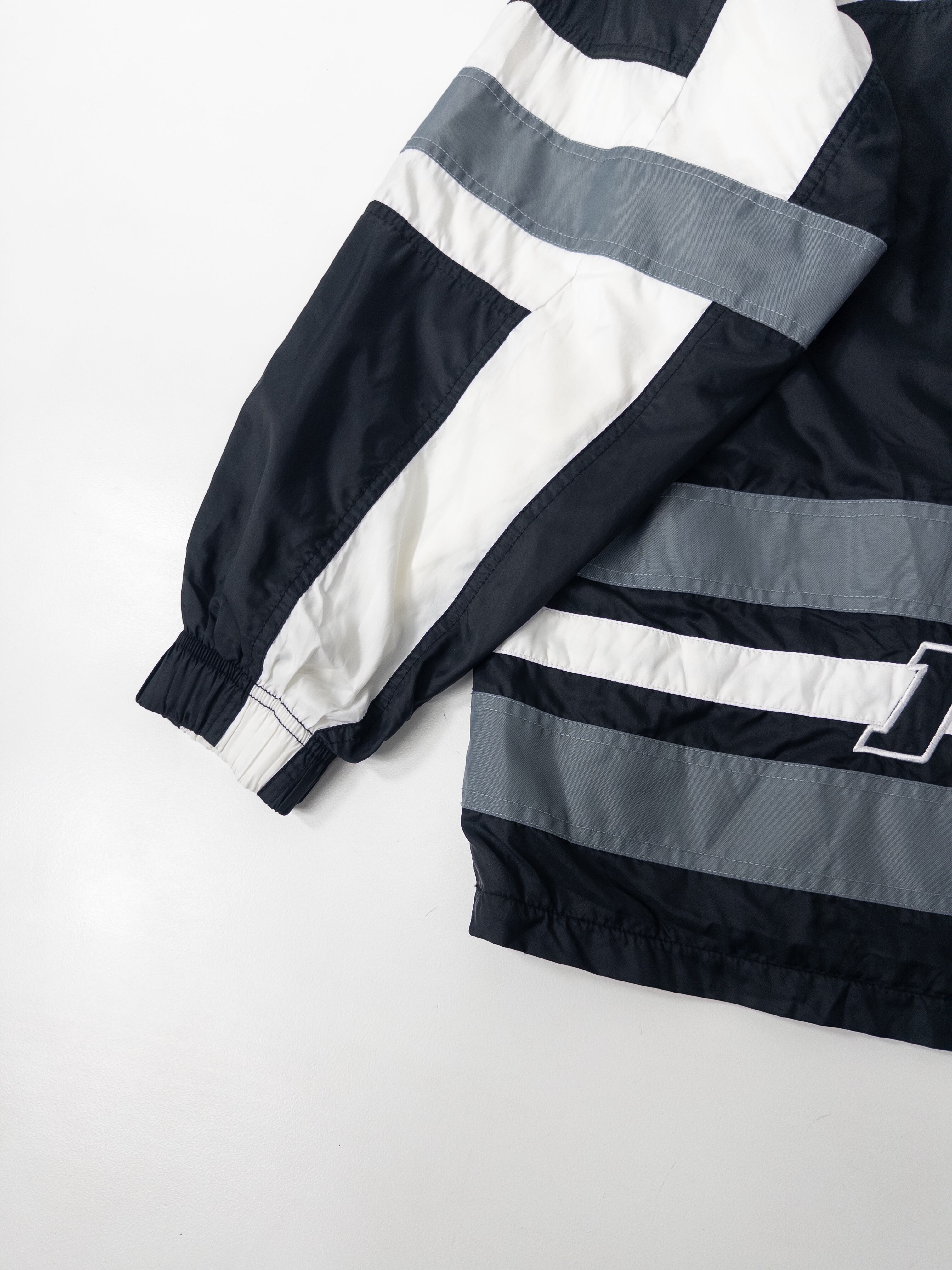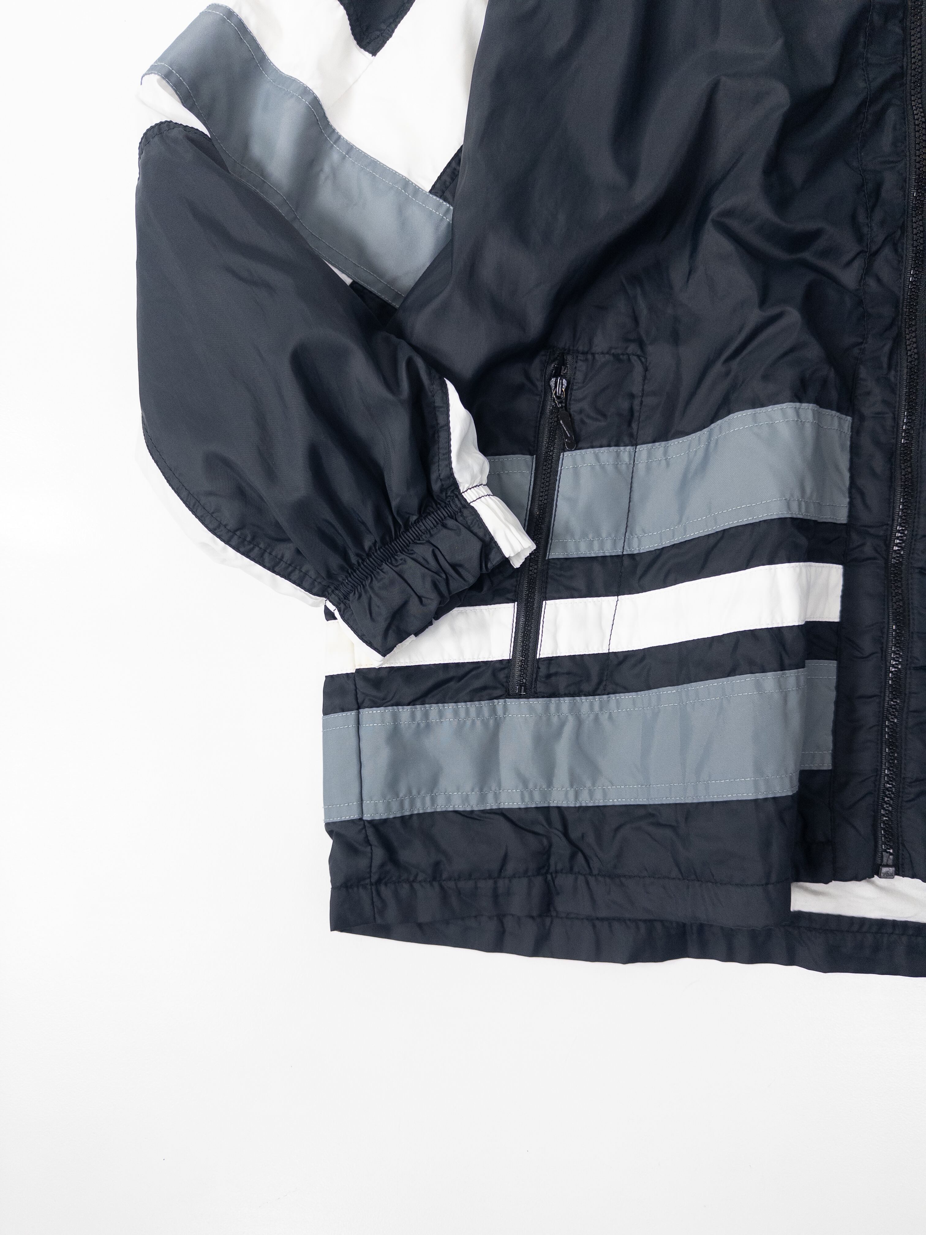 特に背面の 大きめNIKEロゴ と、フロント〜袖にかけて入るV字カッティングは、当時のナイキが一番デザインに遊んでた時代の象徴。シンプルな単色のナイロンより、「存在感のある切り替え」という魅力