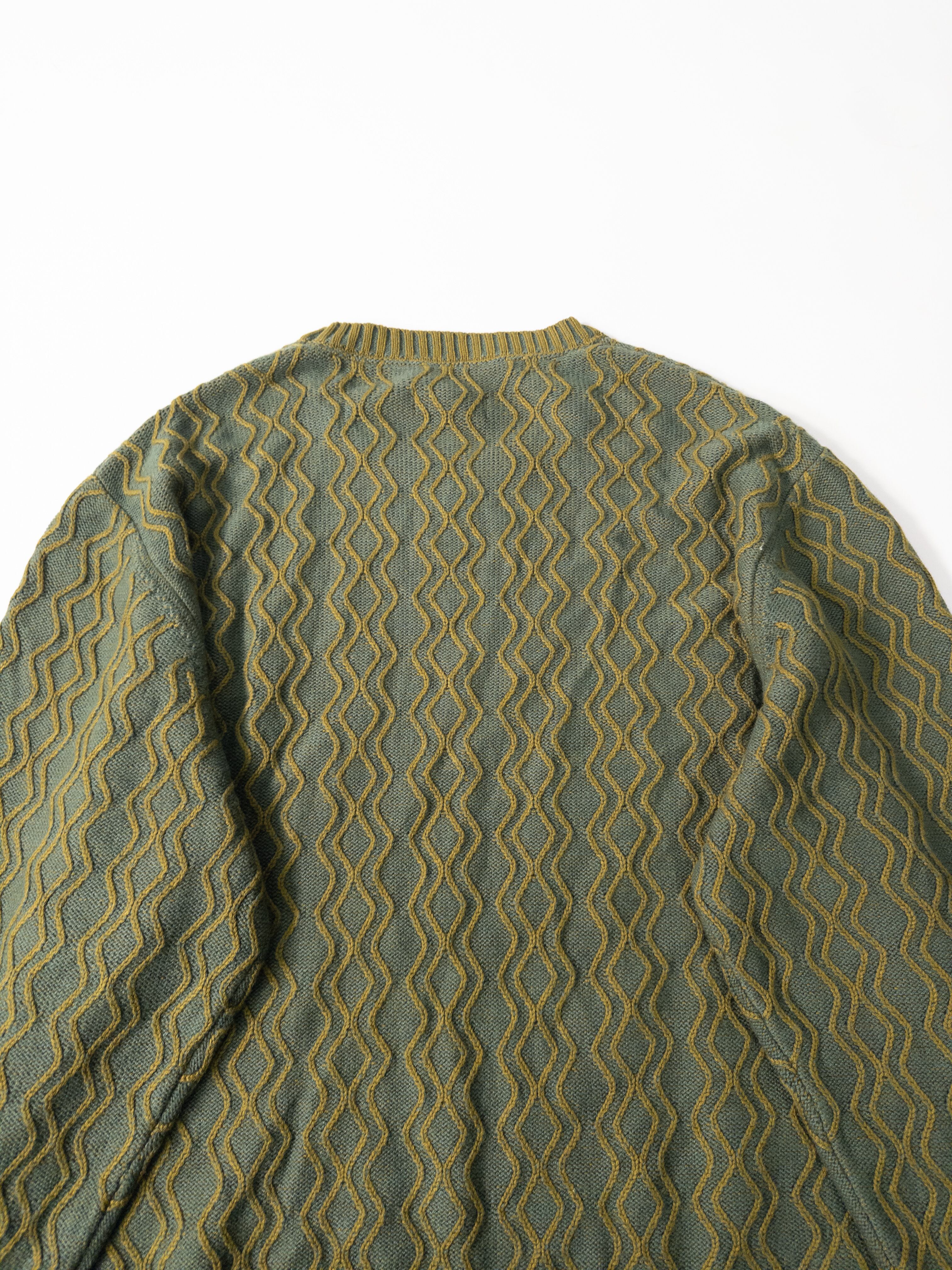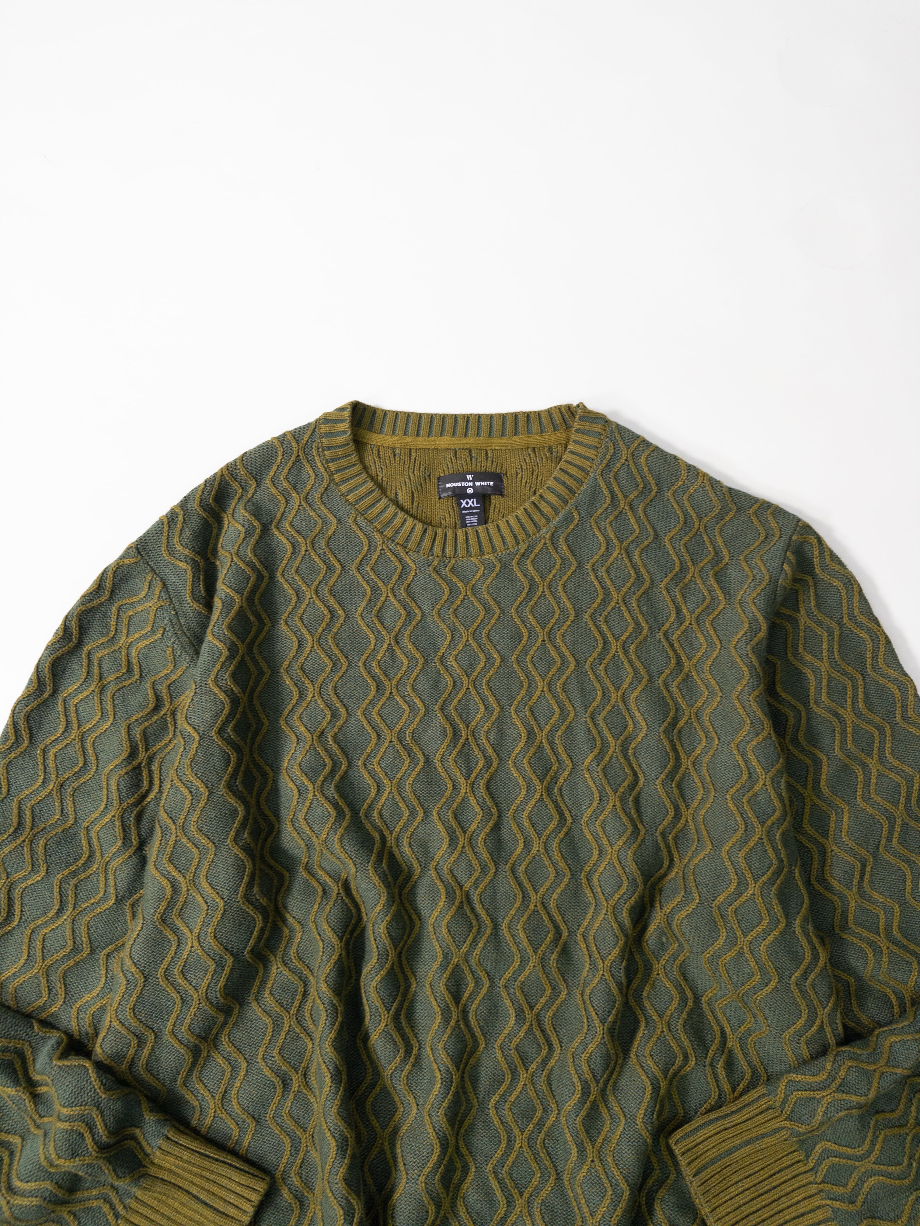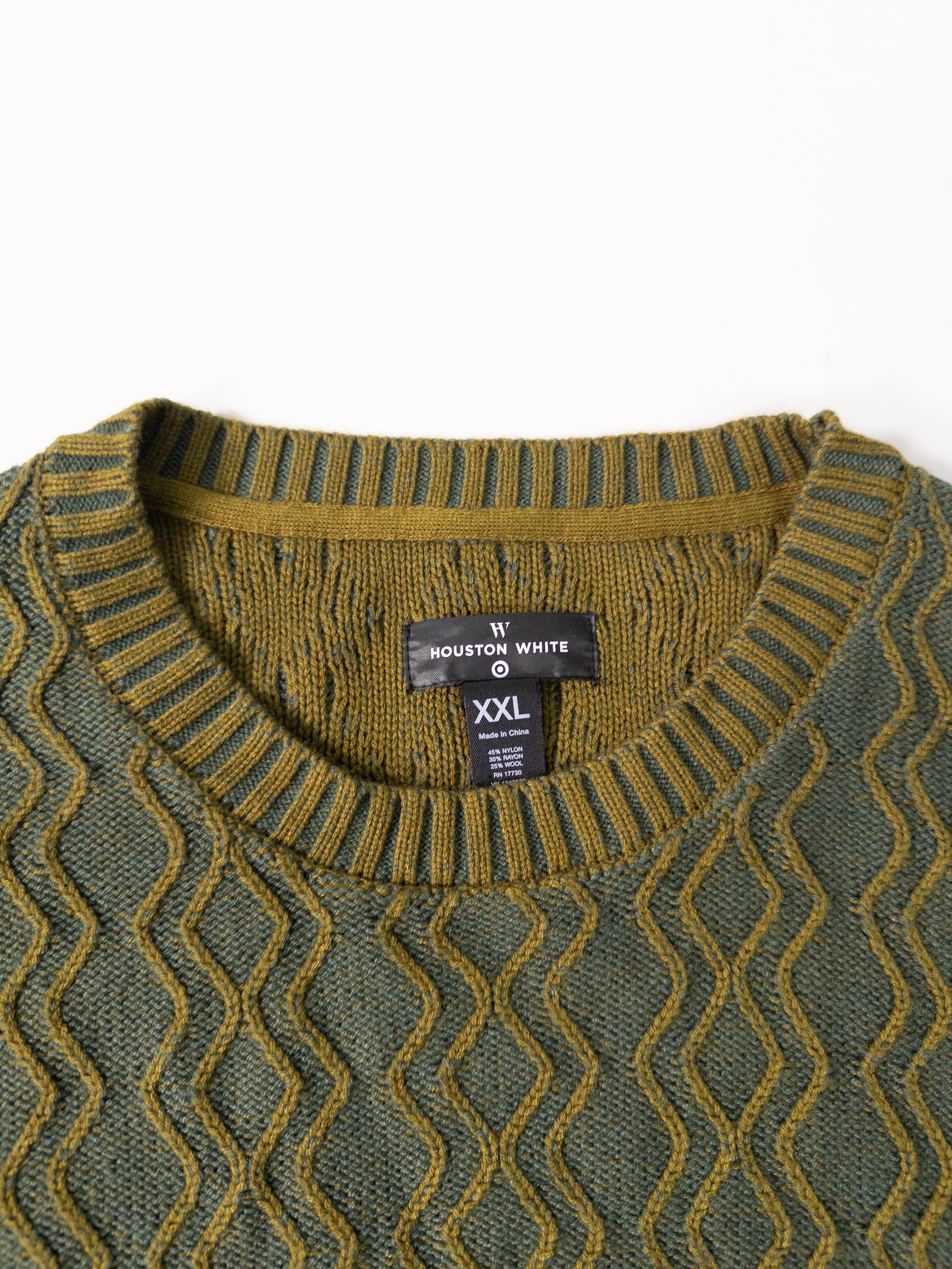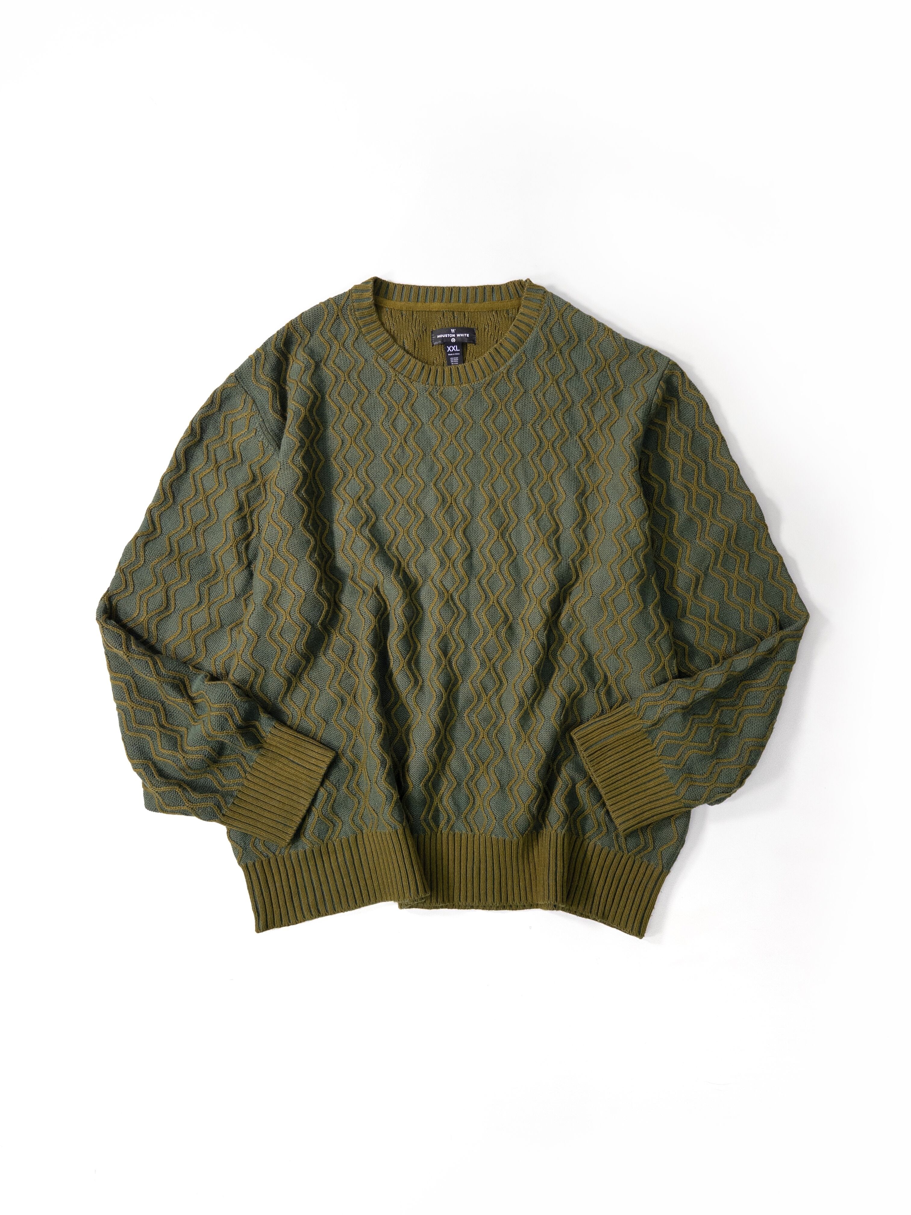 立体的なウェーブ状のパターンがきれいに浮き上がる、Houston White × Targetラインのニット。量産的に見えて、実はこのシリーズは配色や柄の作り込みがかなり丁寧で、古着市場だと“ちょうど良いデザインニット”としてあまり残らないタイプ。