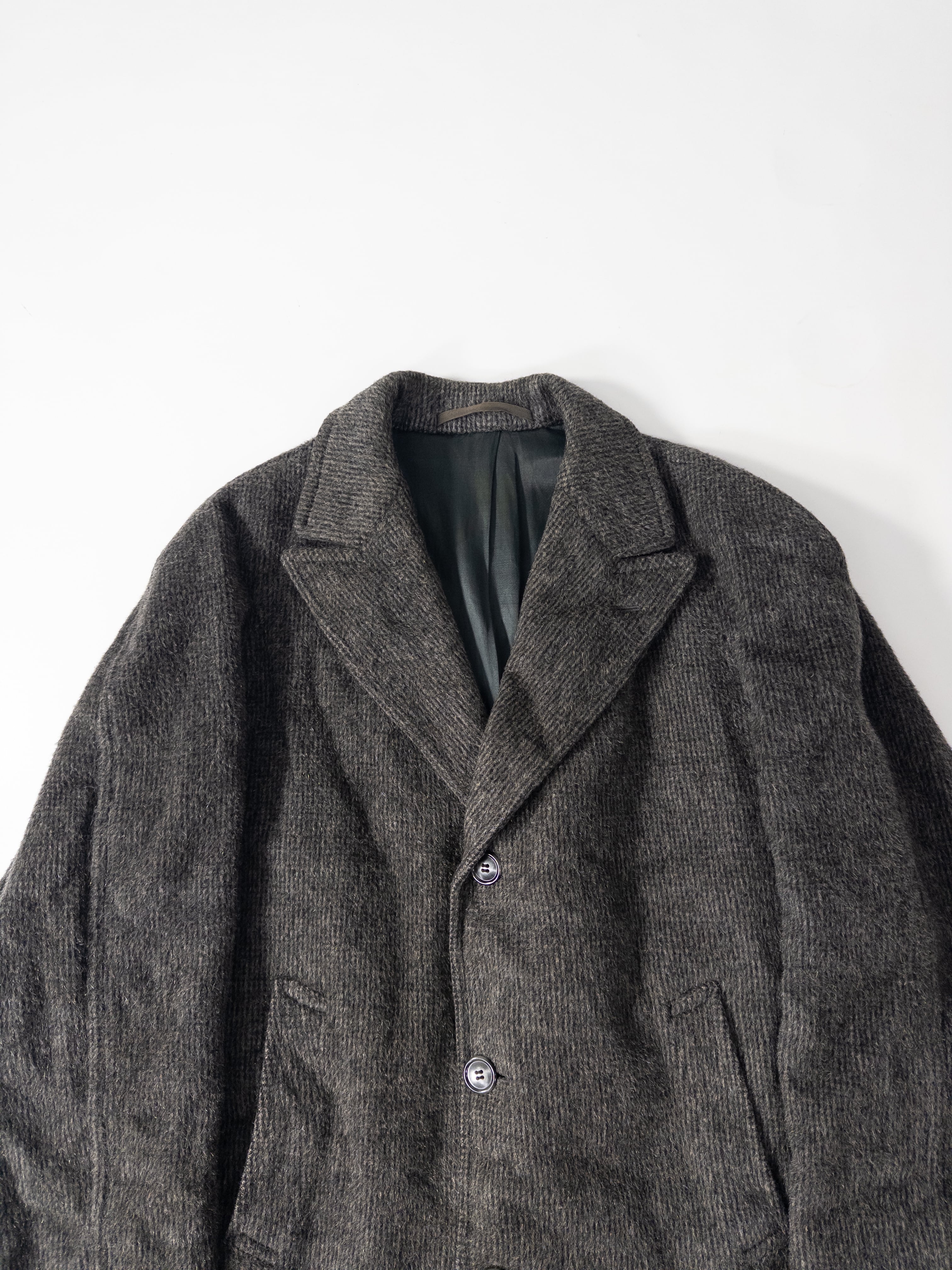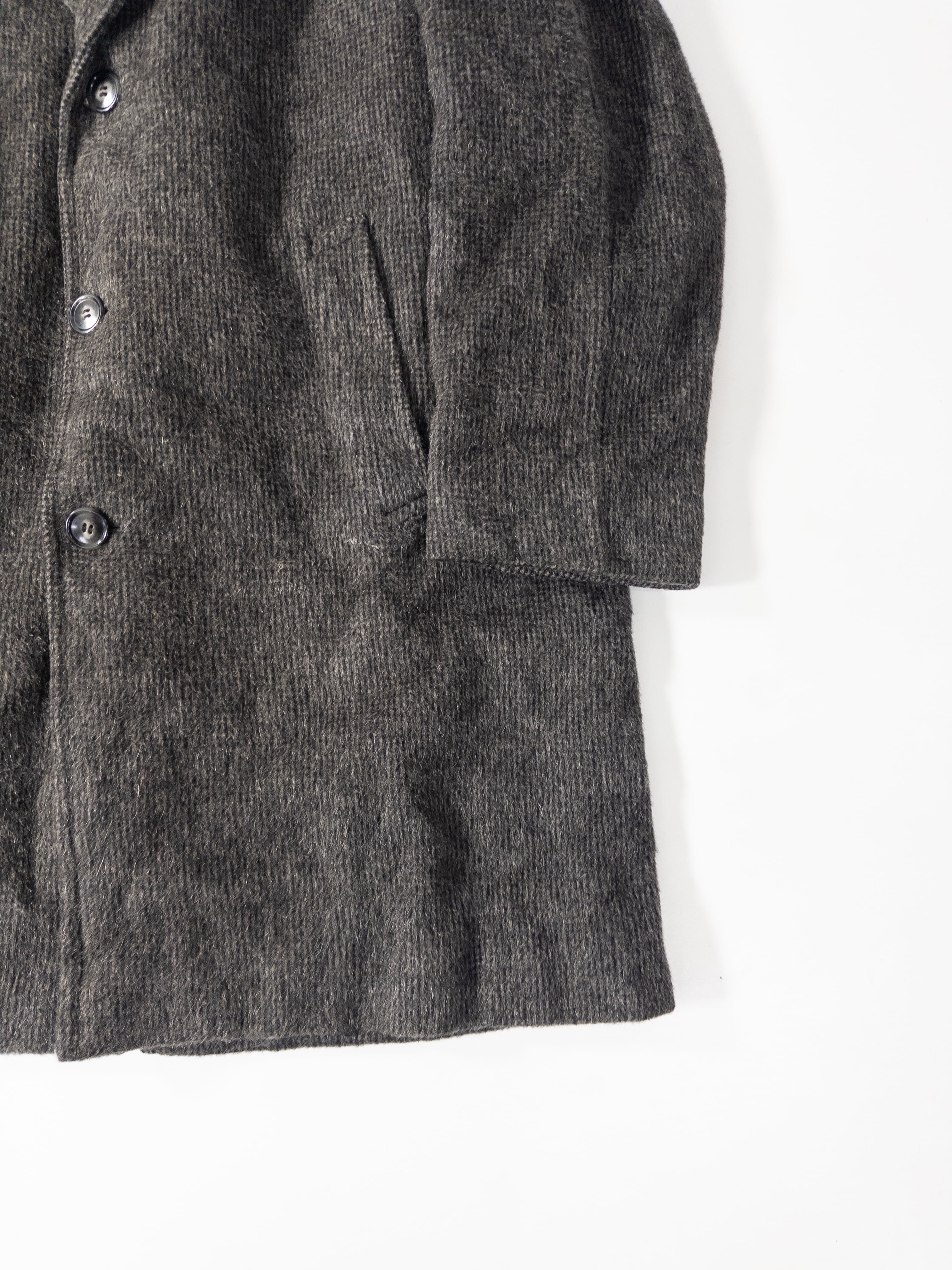 軽さを優先する現代のメルトンとは違い、糸の太さも密度も古いまま。杢グレーの濃淡が毛流れに沿って揺れ、羽織るだけで深い表情が出ます。素材そのものに“アウターの格”があるタイプ。