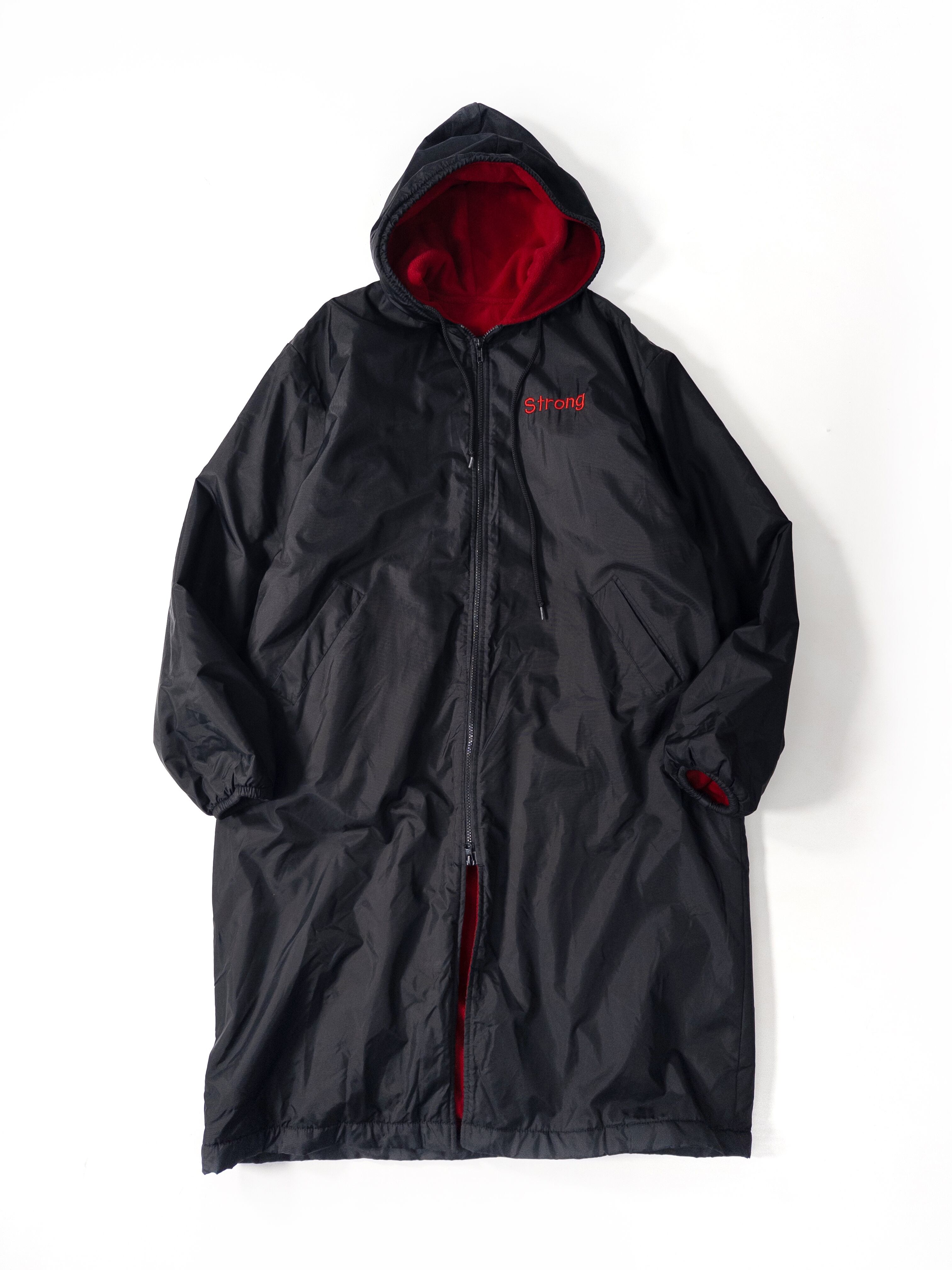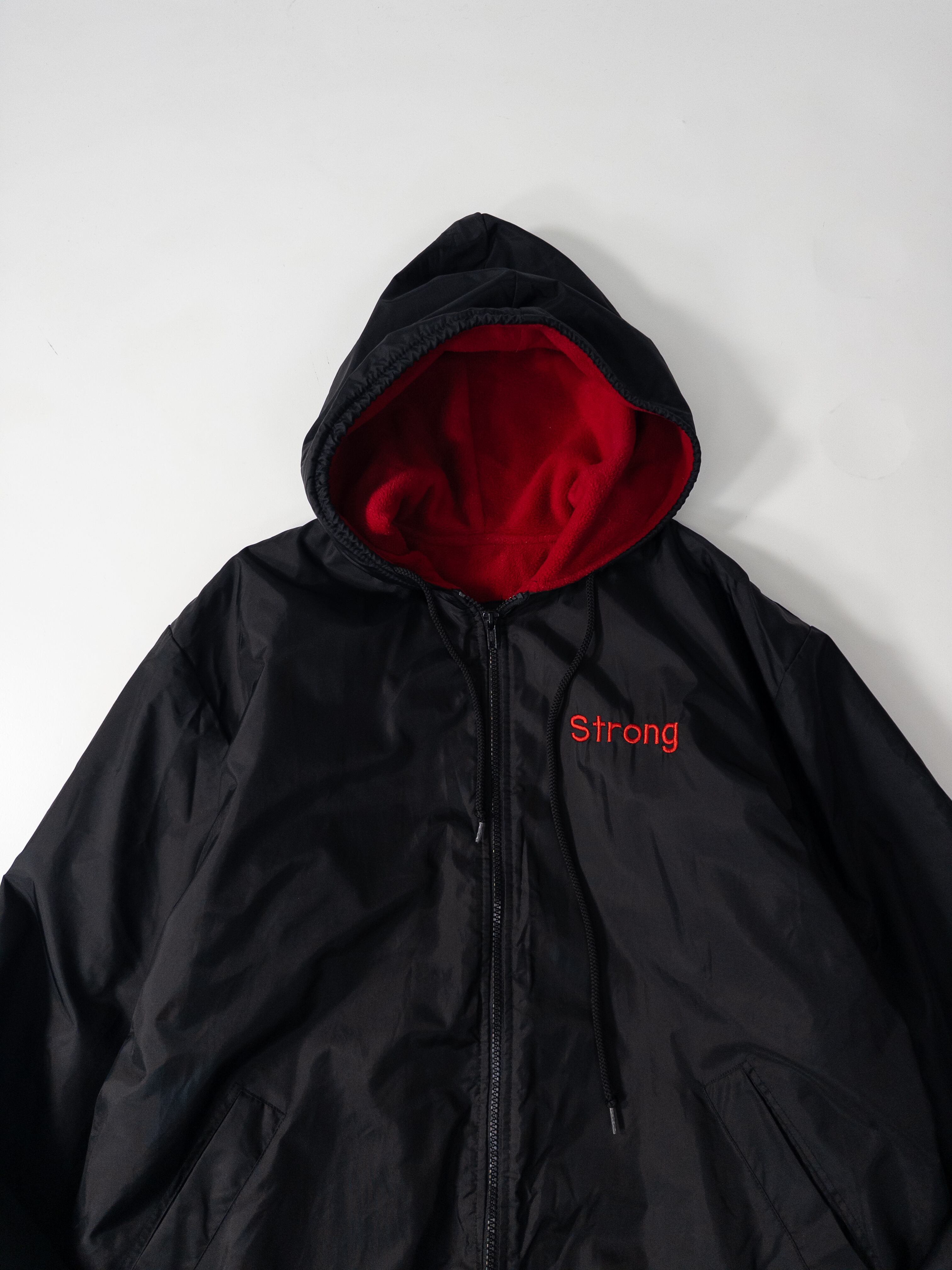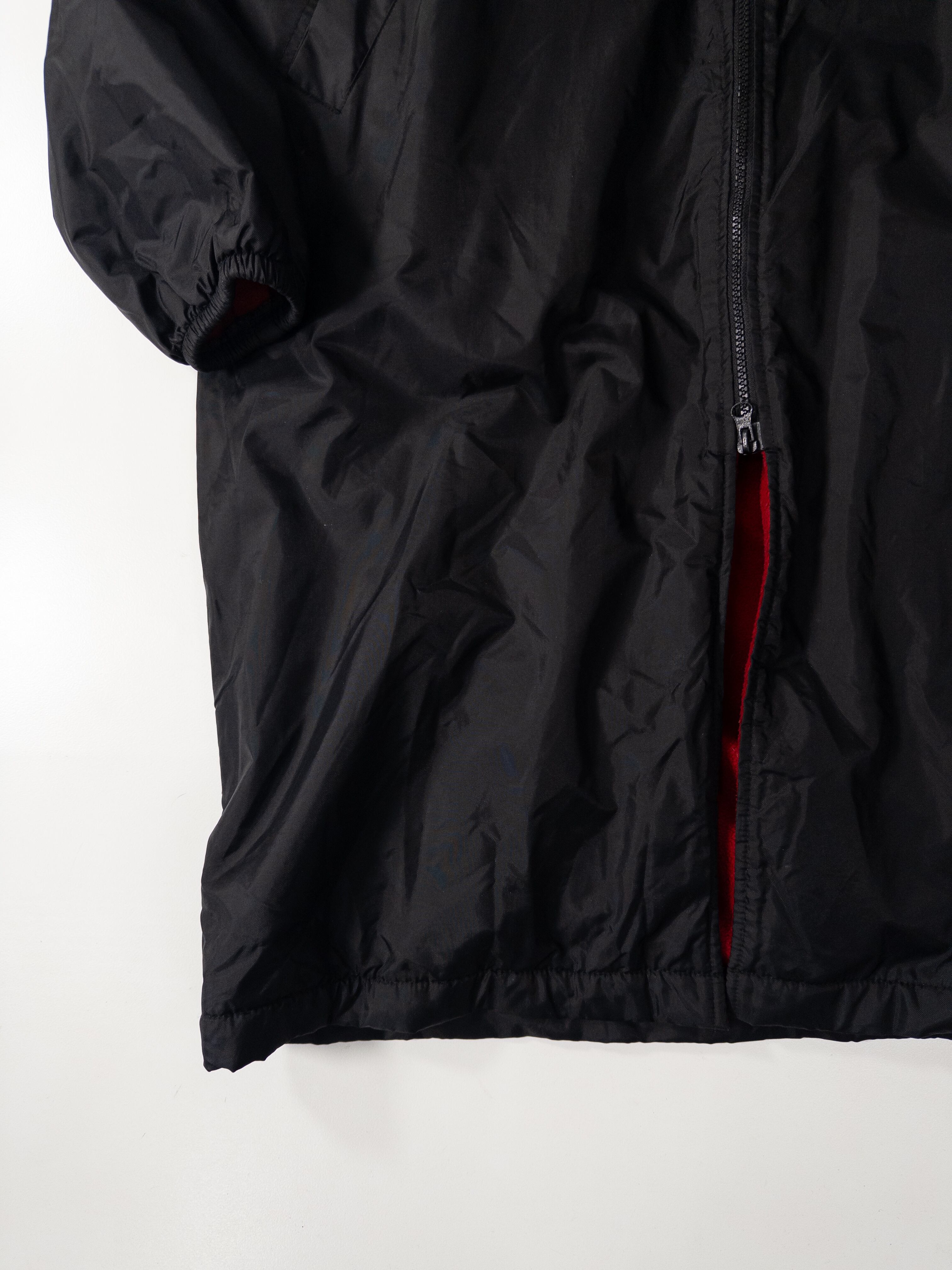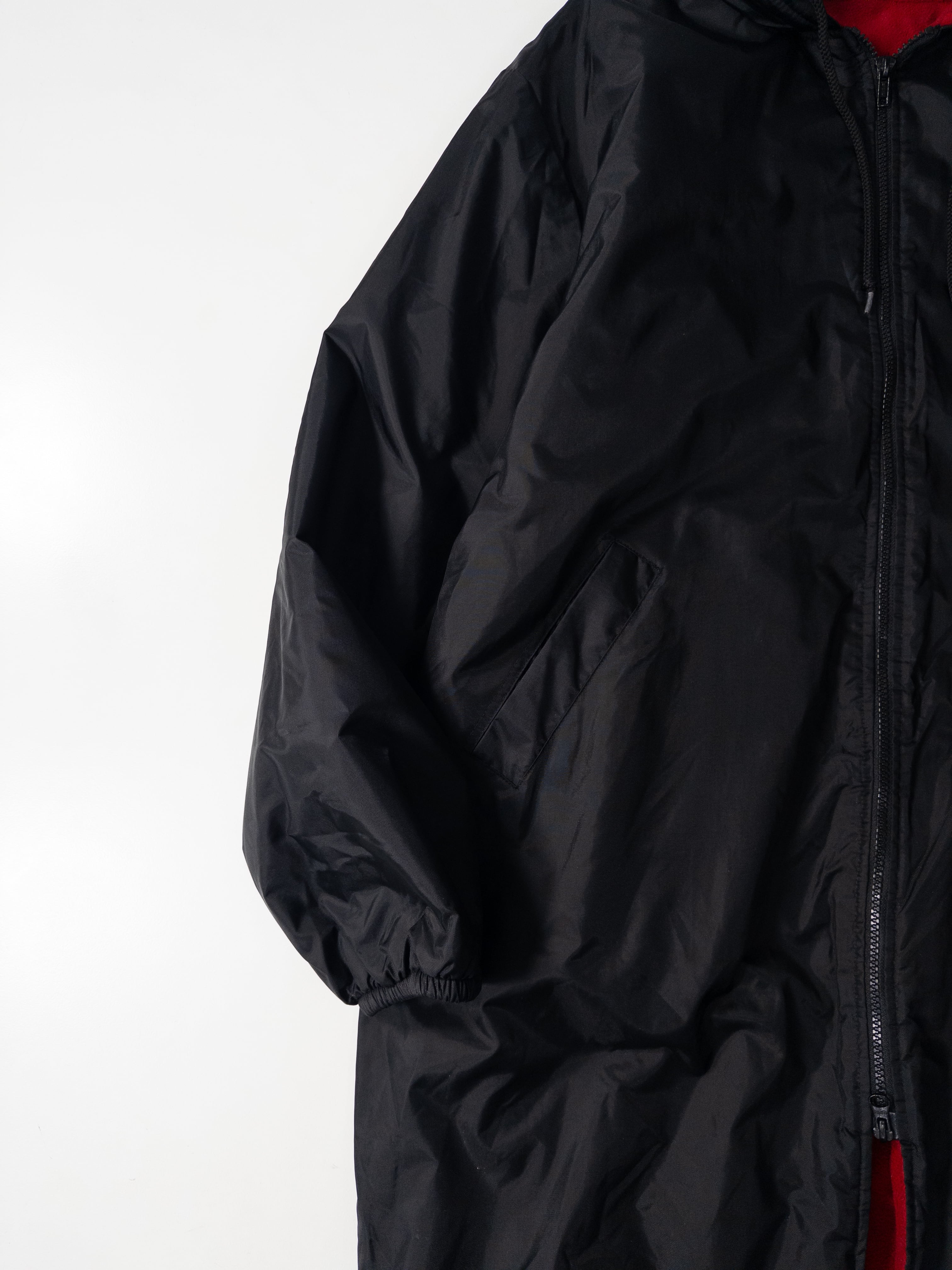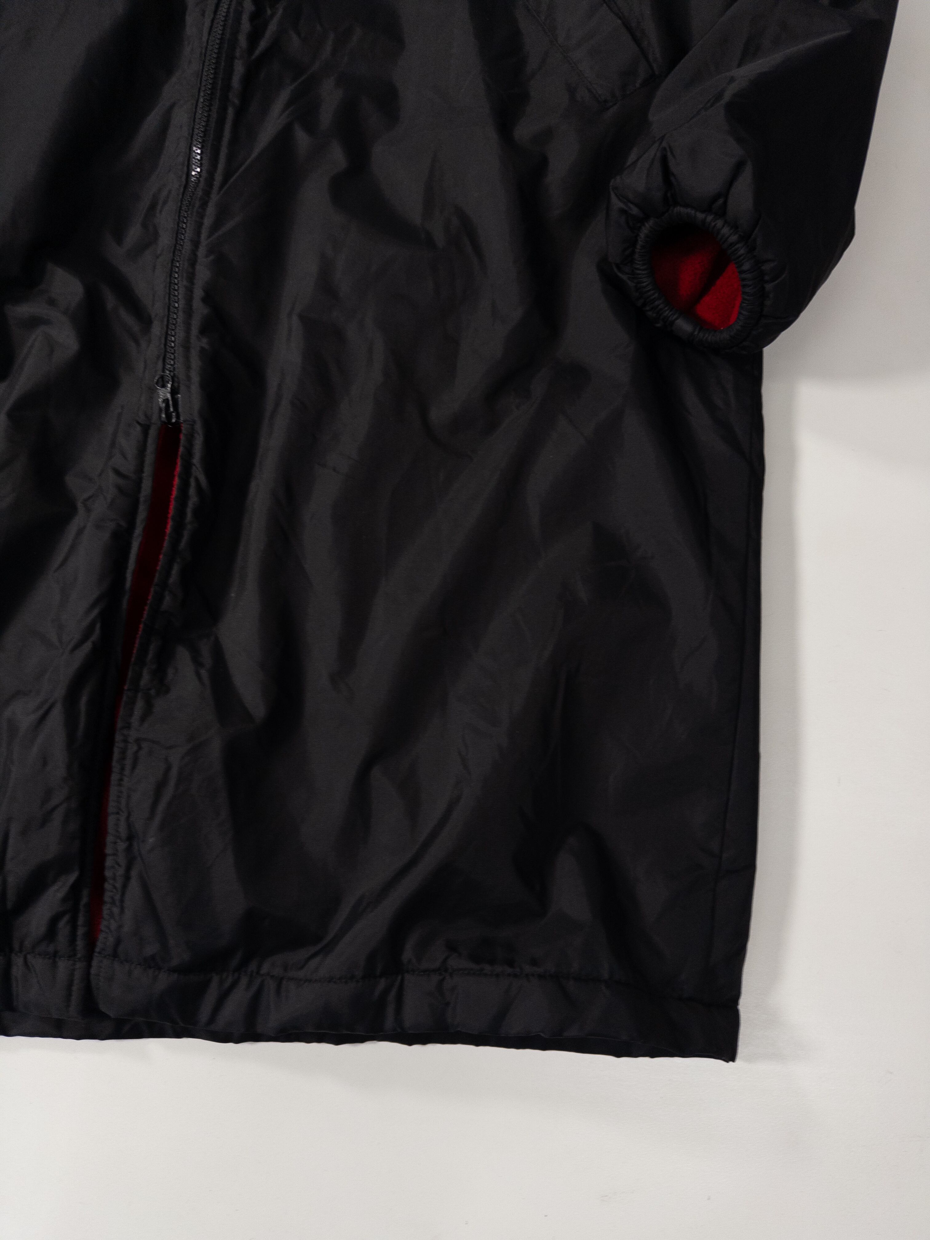 表はシャカっとした軽量ナイロン、裏は真っ赤なフリースで、ブラック×レッドのコントラストがしっかり効いた1枚。