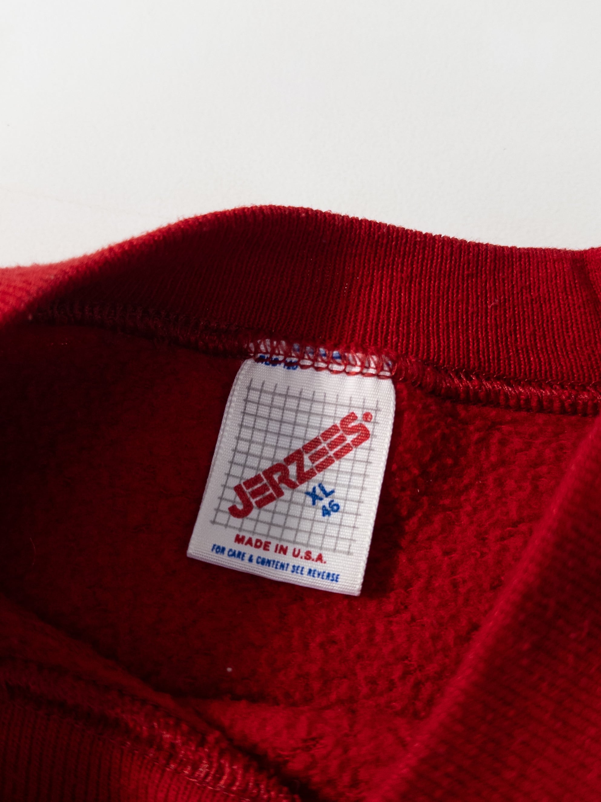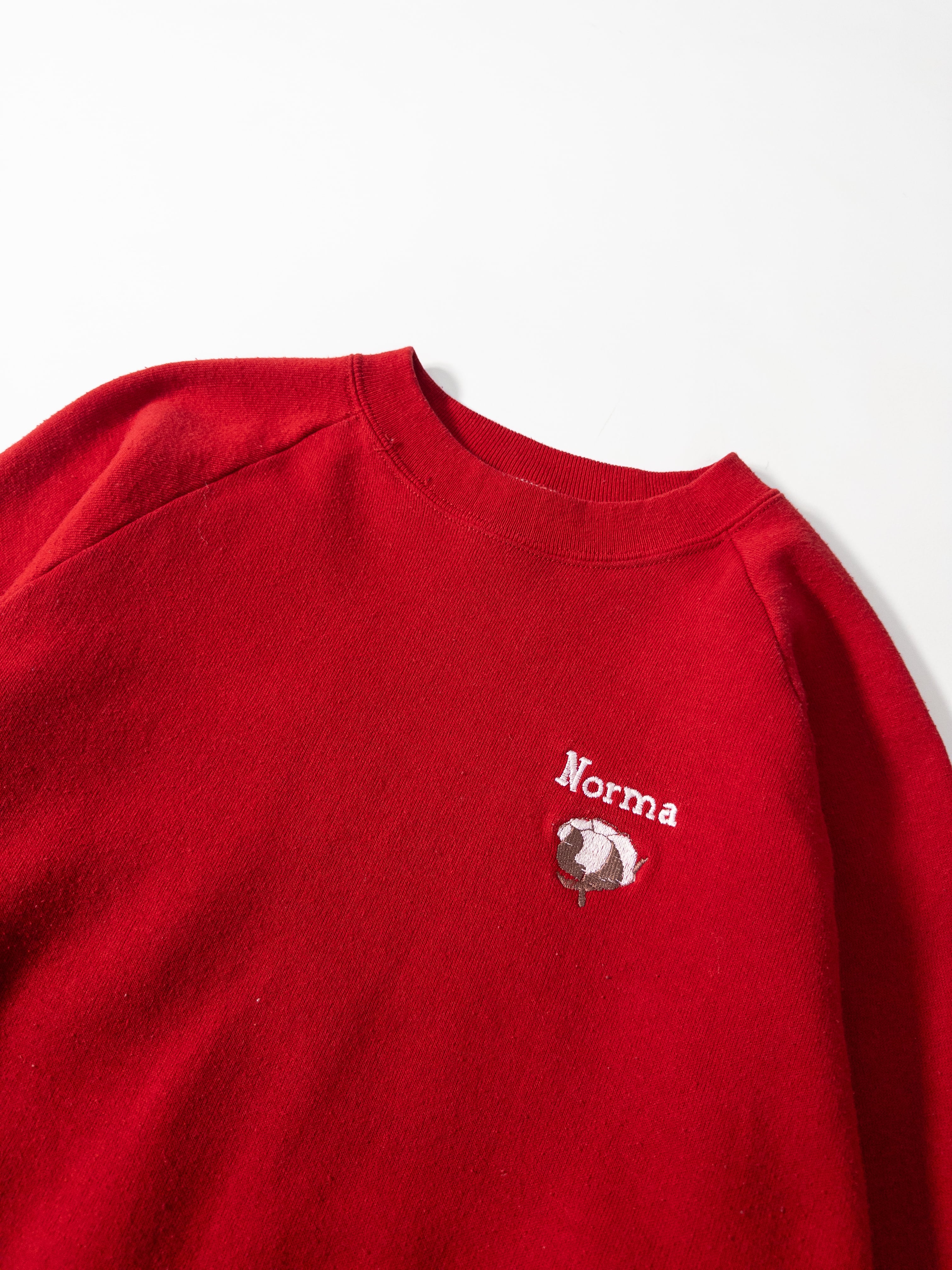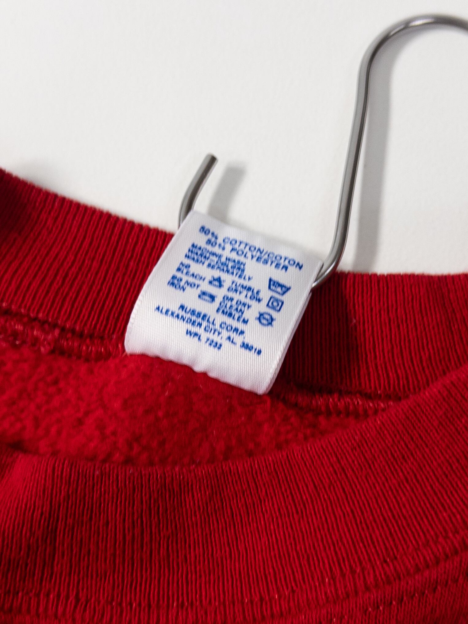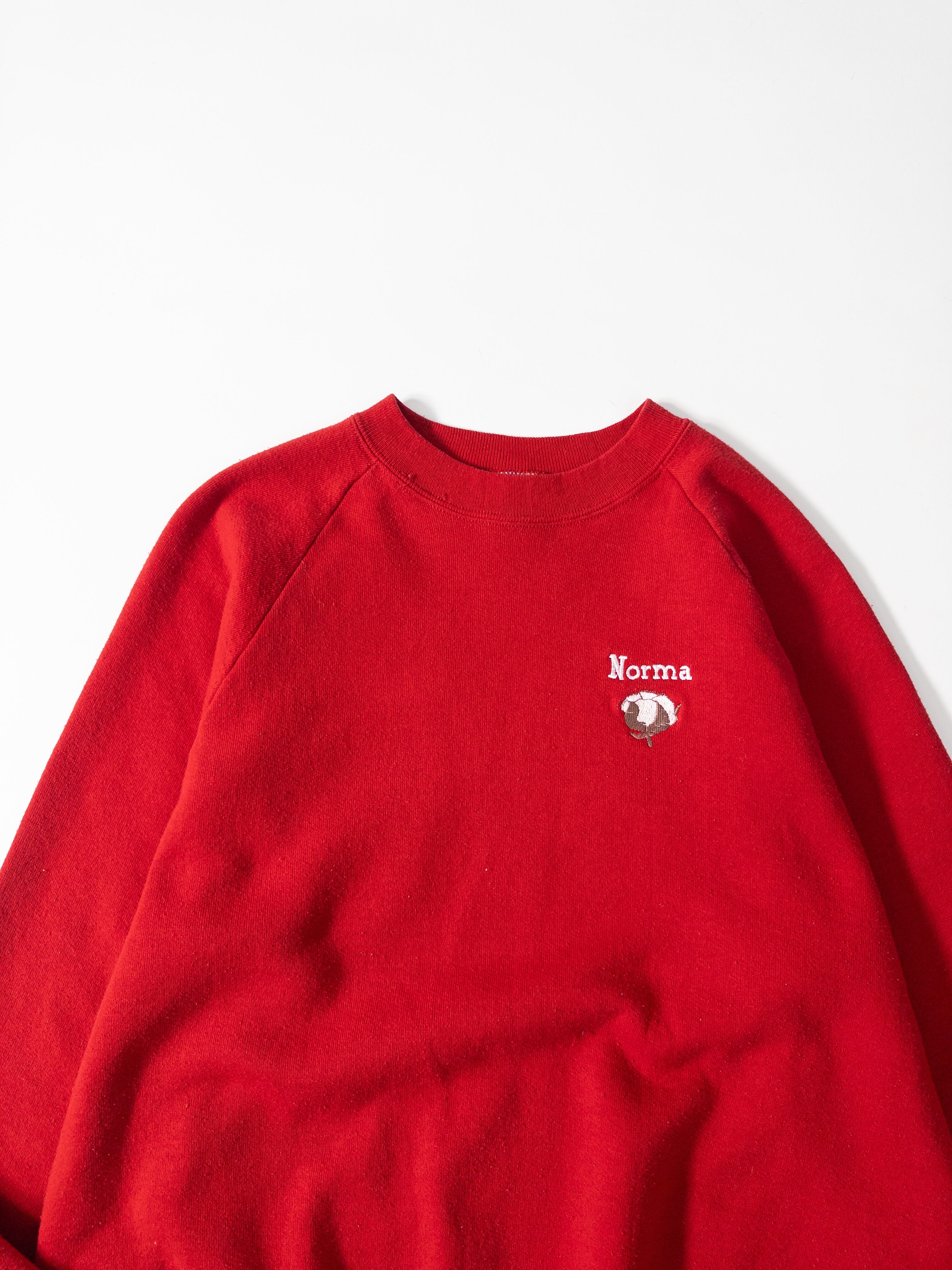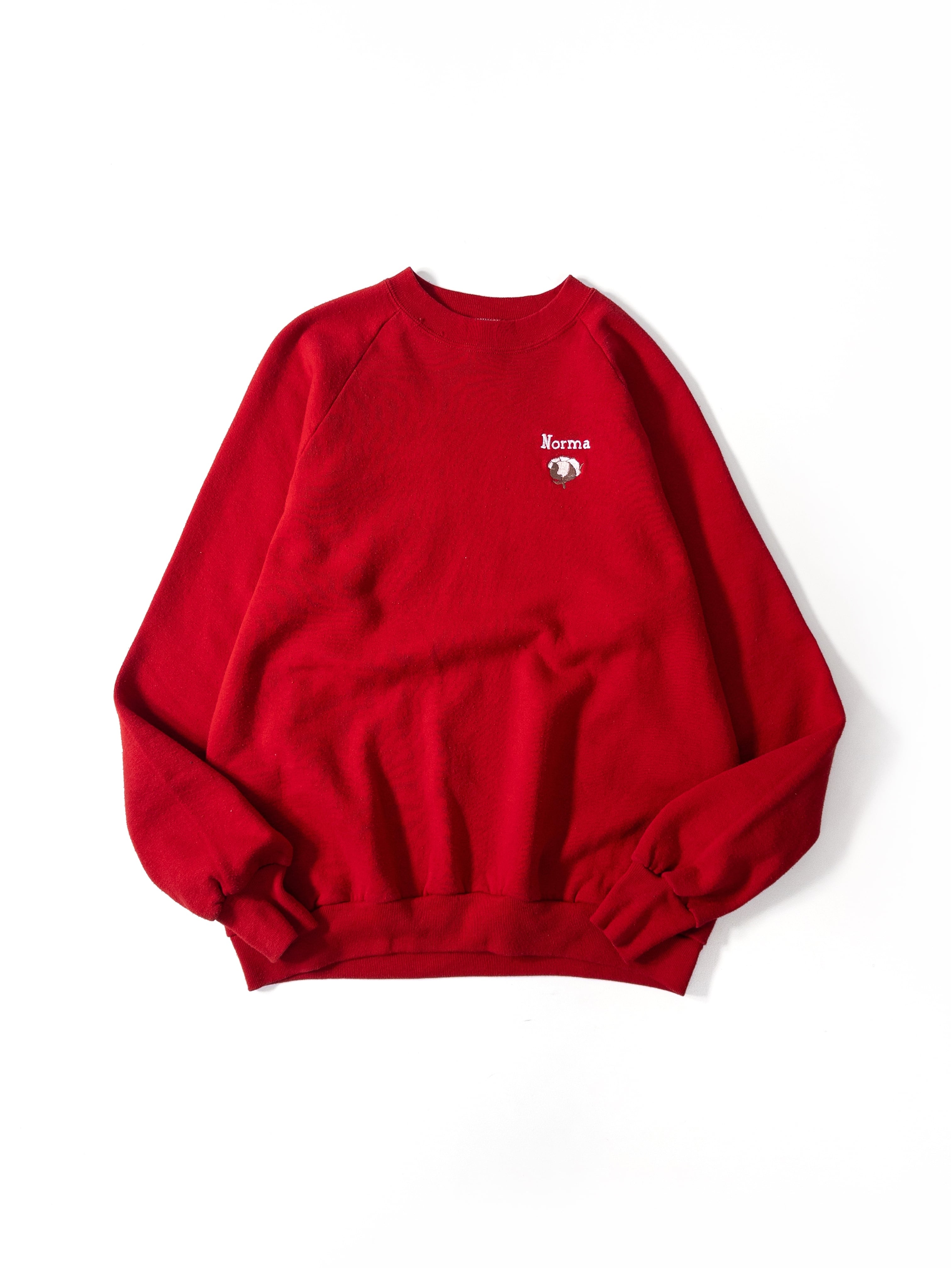 企業スウェットといっても、赤×白の配色がモード寄りに振れていて、