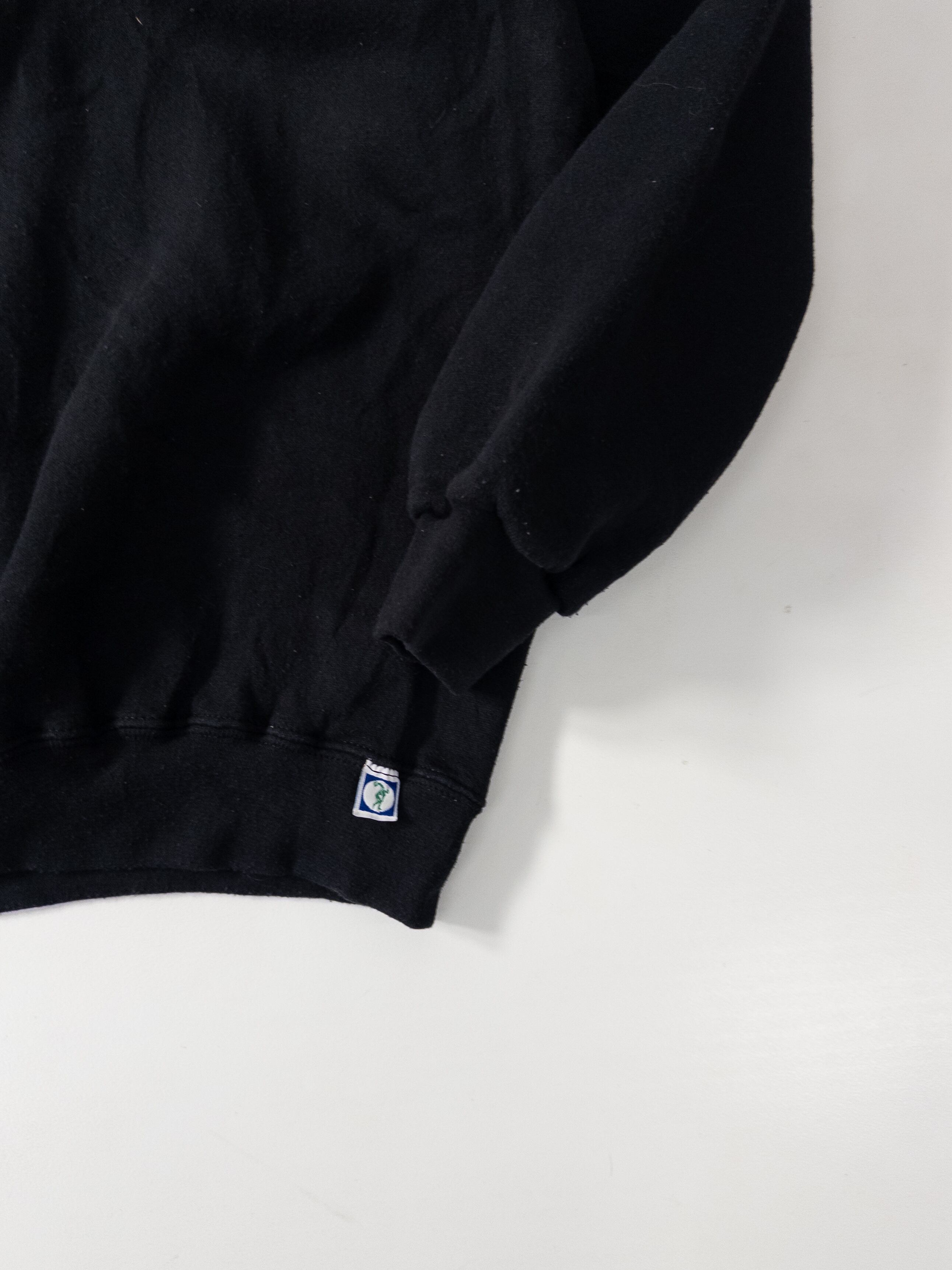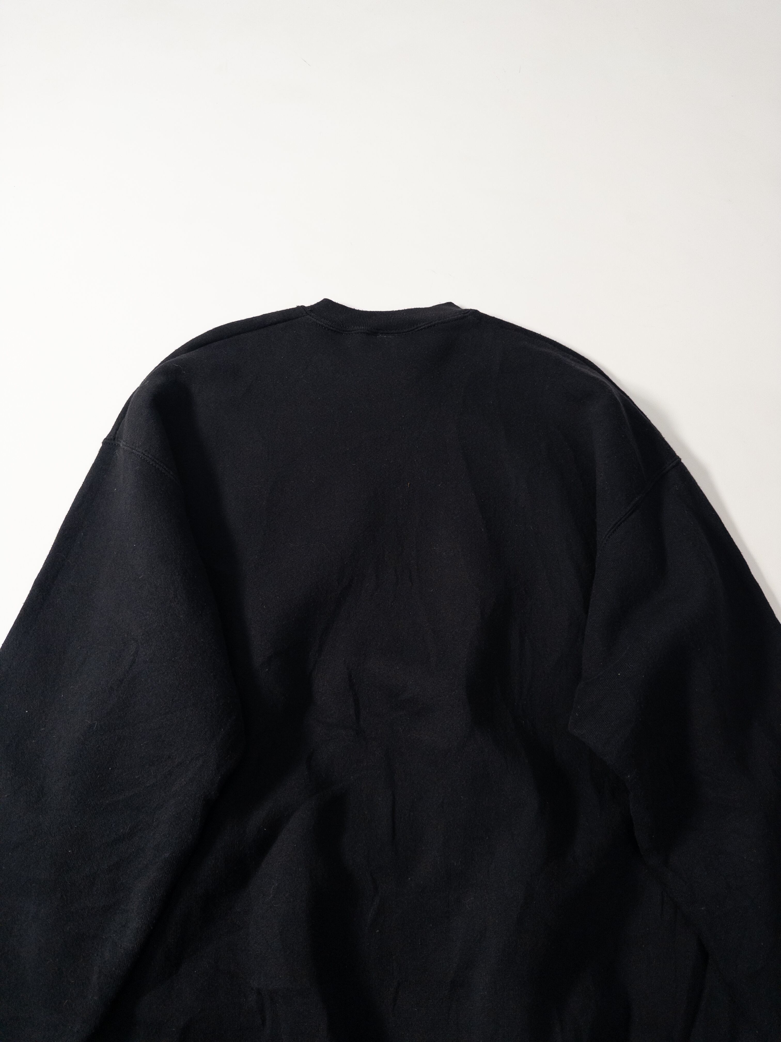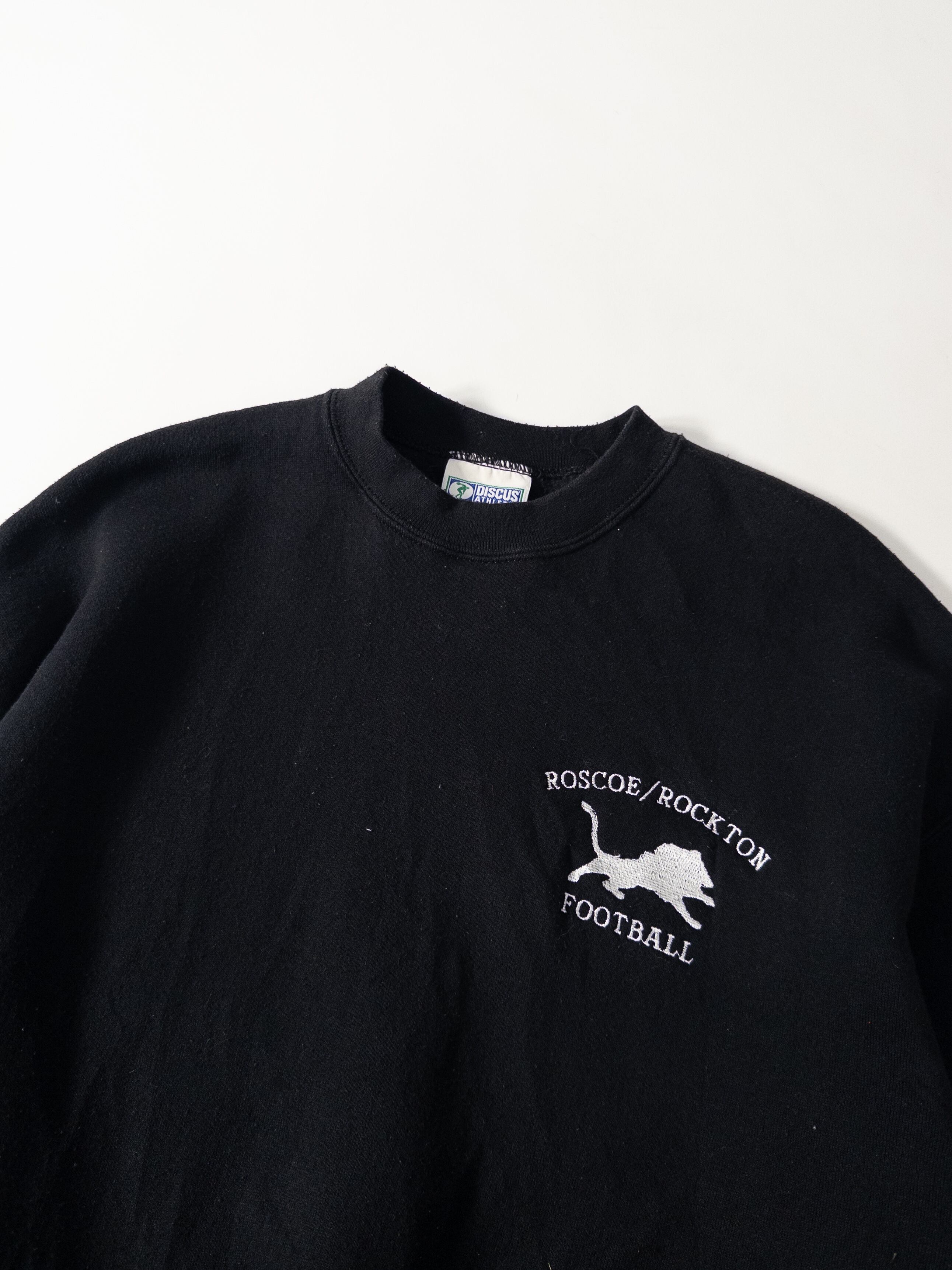 フットボールチーム ROSCOE / ROCKTON のワンポイント刺繍が入るだけの、引き算の効いたデザインが魅力。こういう“黒で、ロゴ小さめ”のスウェットは古着市場でも意外と数が少なく、スタイリングの幅が広いのがポイント。