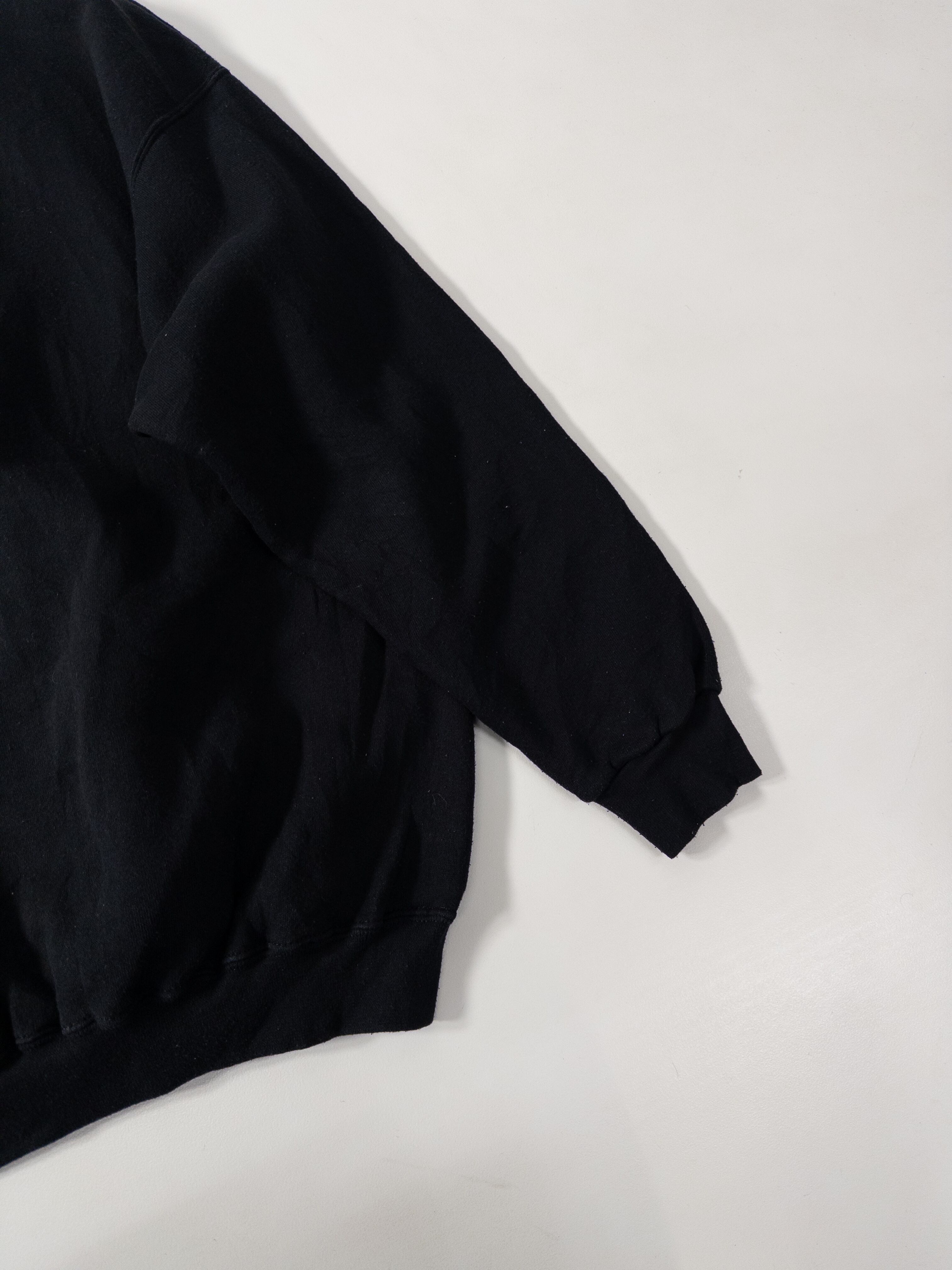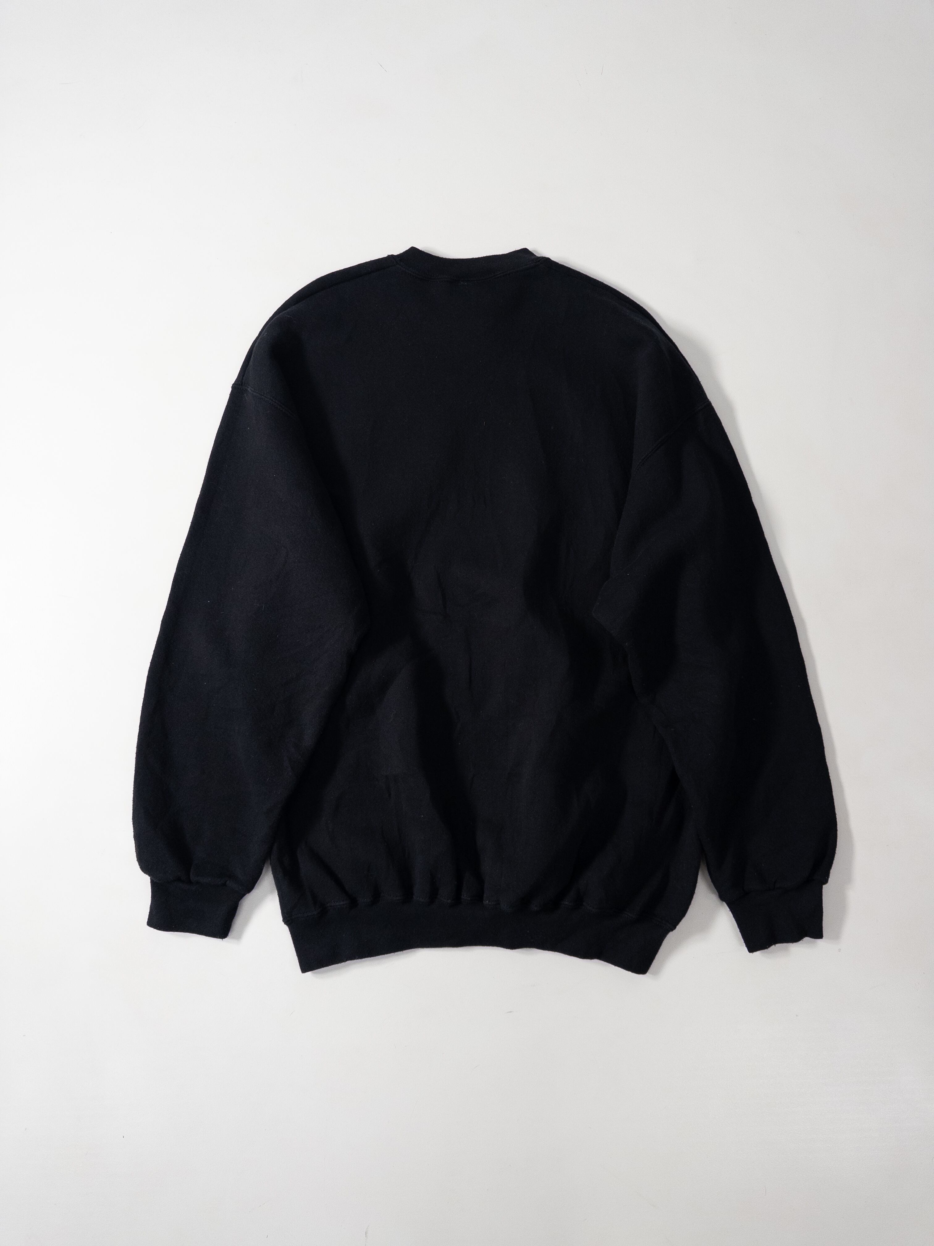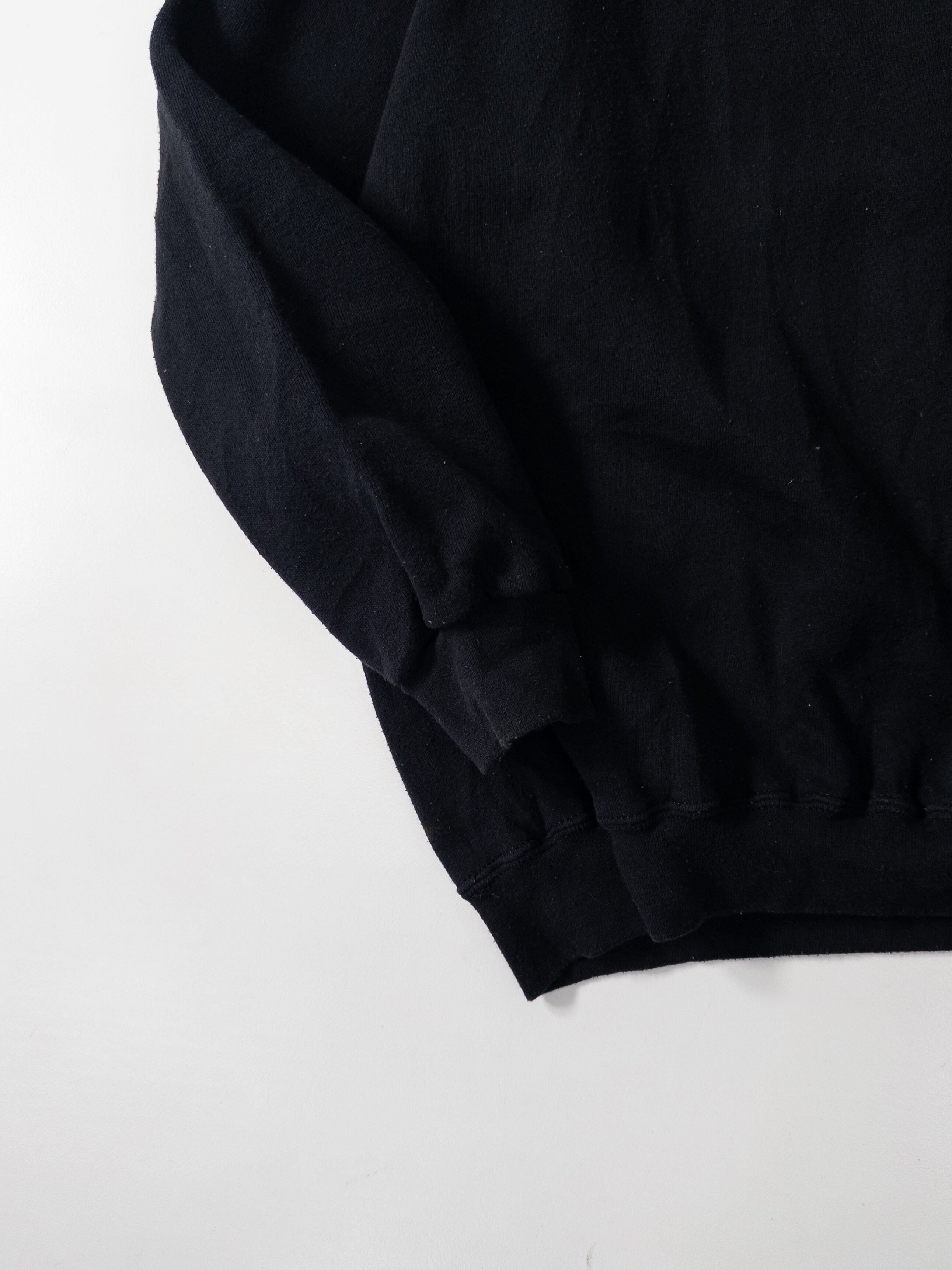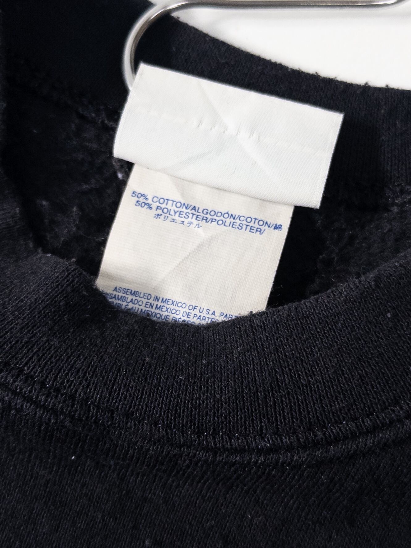 フットボールチーム ROSCOE / ROCKTON のワンポイント刺繍が入るだけの、引き算の効いたデザインが魅力。こういう“黒で、ロゴ小さめ”のスウェットは古着市場でも意外と数が少なく、スタイリングの幅が広いのがポイント。