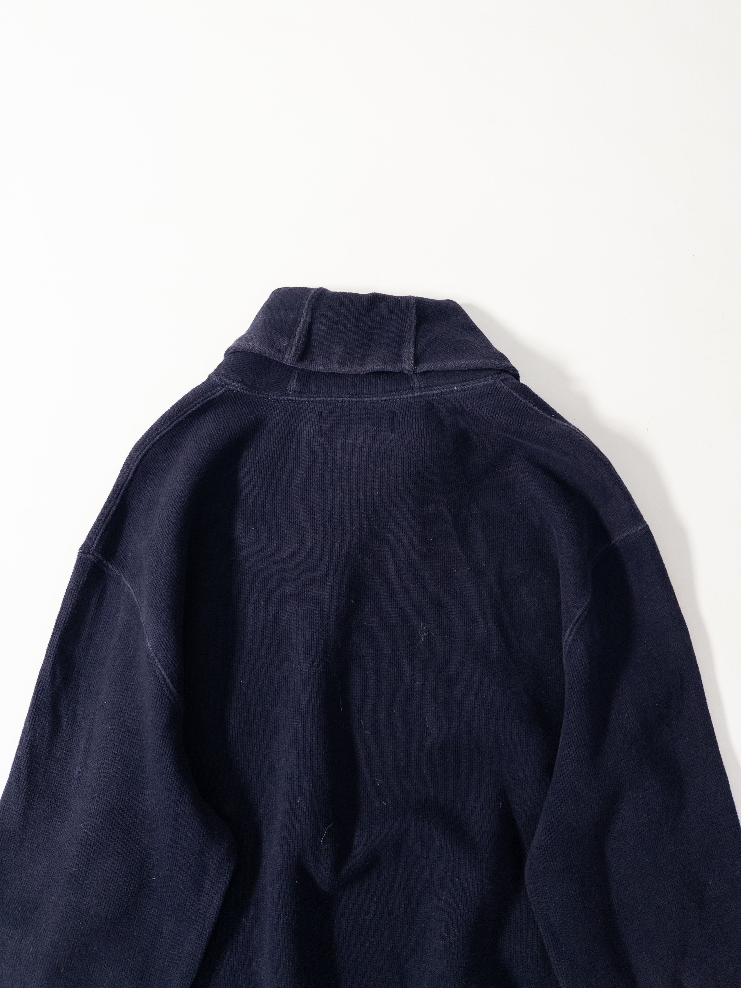 ネイビー×ショールカラーで首元に立体感が出るので、