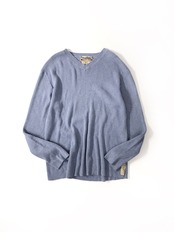 リブ編みとVネックでラフすぎないバランス。