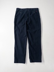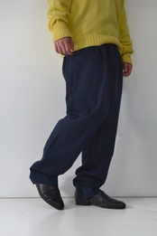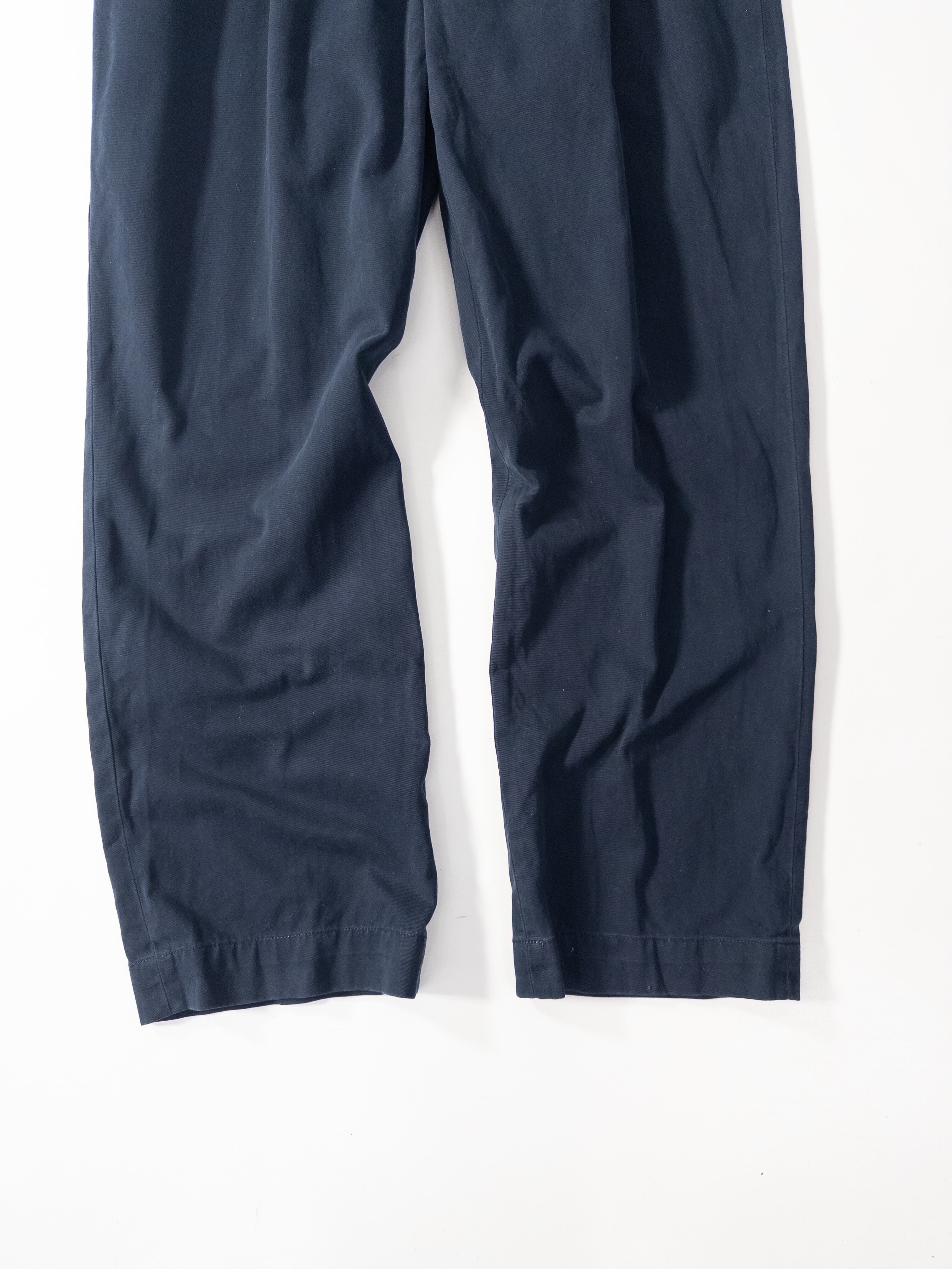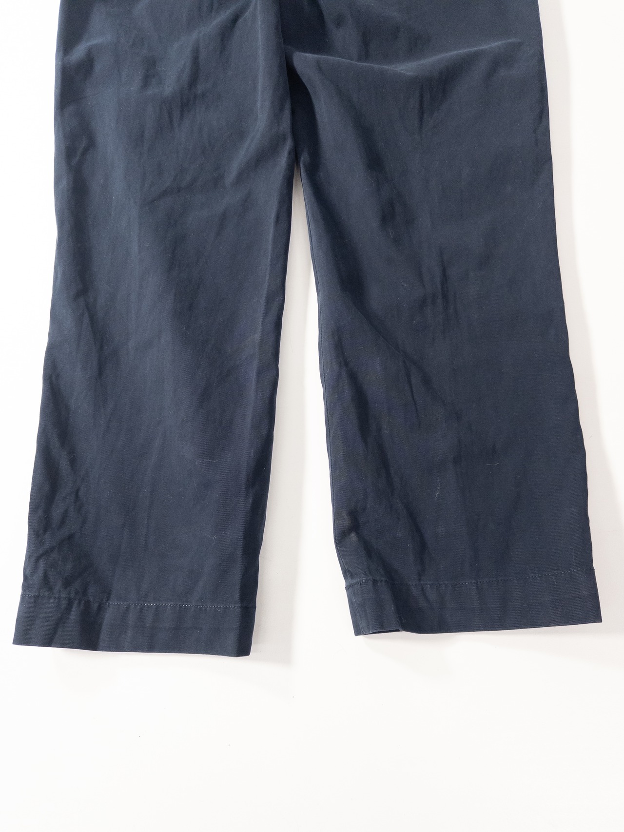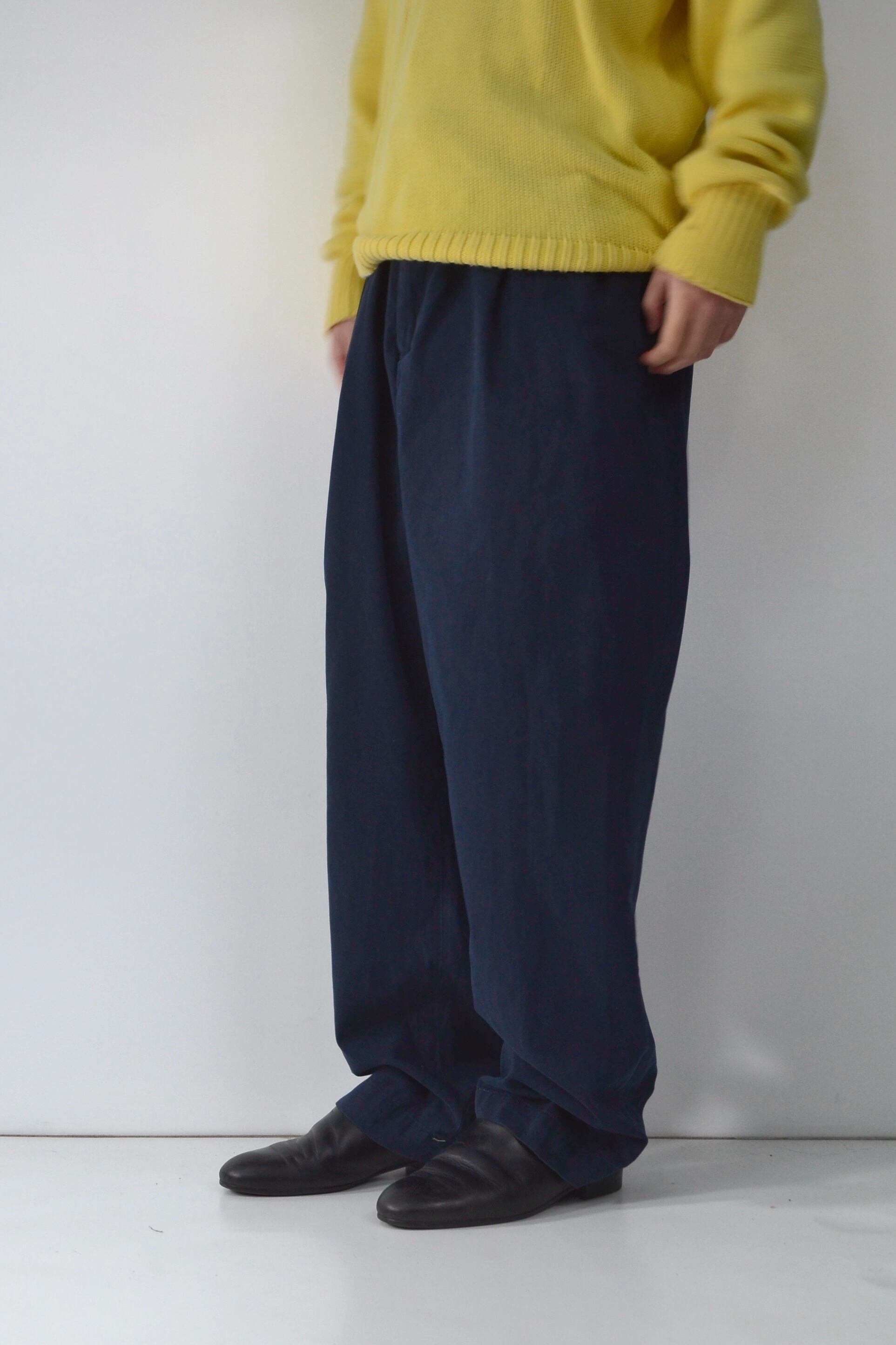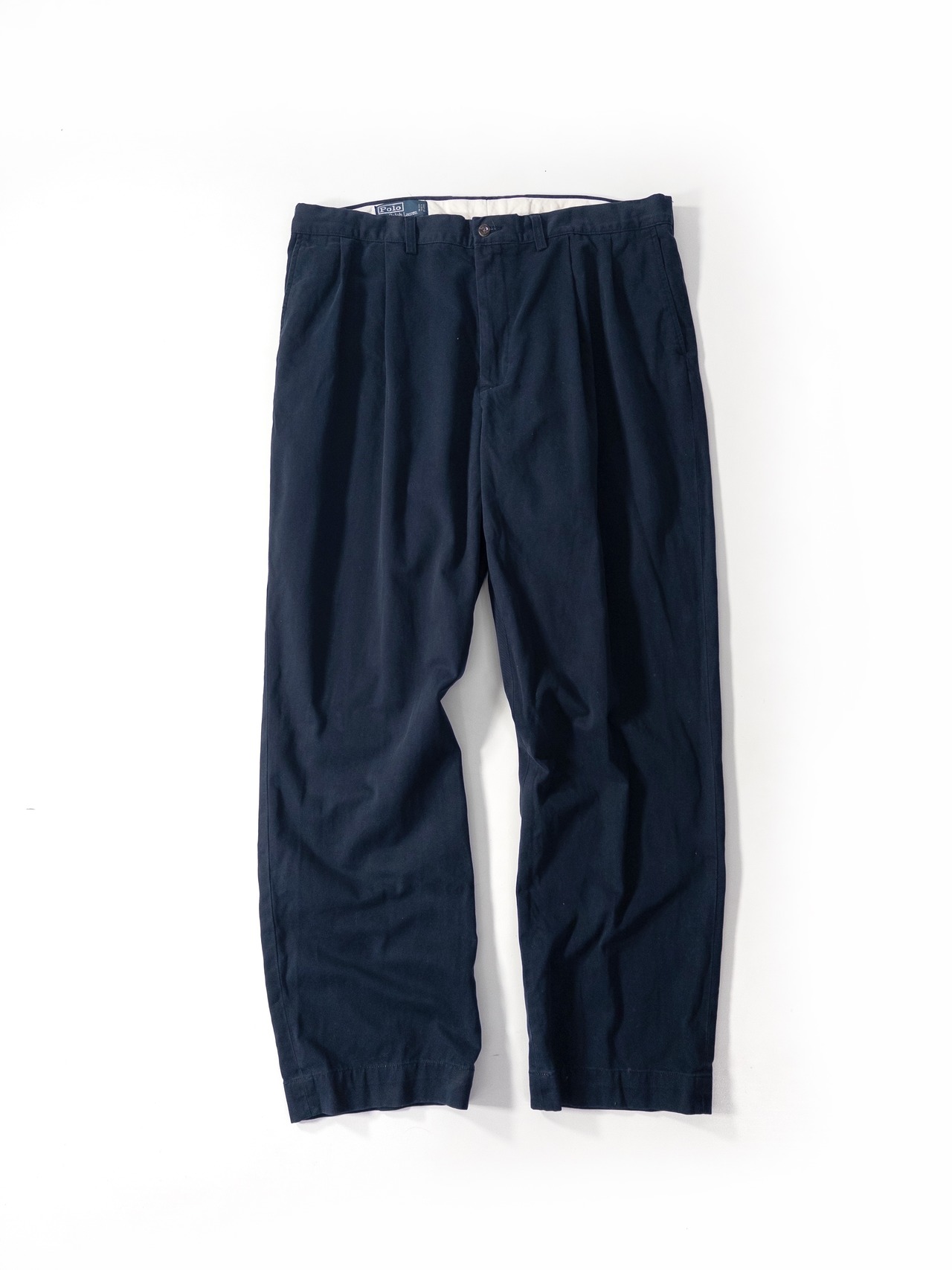 REVERSE PLEATED(逆向きプリーツ)仕様により、腰まわりに自然な溜まりが生まれ、クラシックなスラックスの構造をベースにしながらもモード寄りのシルエットに仕上がった一本。90s〜00sのRalph Laurenらしい、ドレスパンツの設計思想をカジュアルなコットン素材へ落とし込むアプローチで、いわゆるチノとは一線を画す表情を持っています。あえてウエストを大きめで選び、絞ってワイドに履くことで、プリーツの立体感がより強調され、現代的なバランスで着用できるのも魅力です。