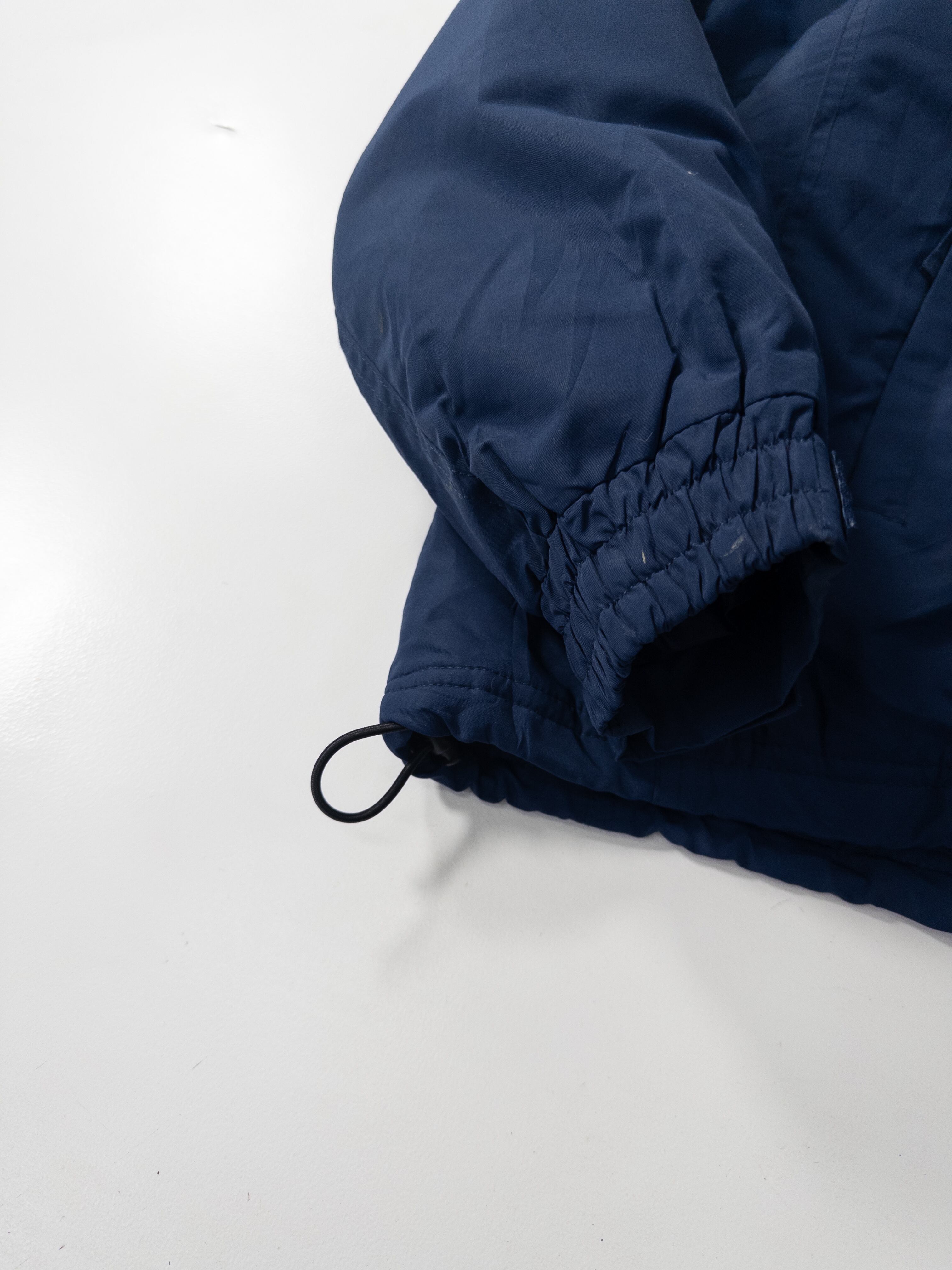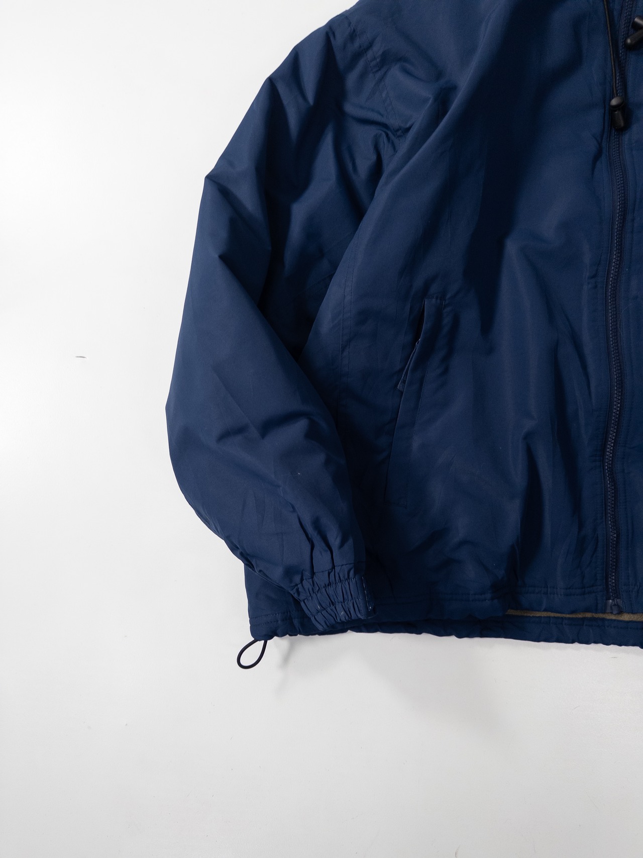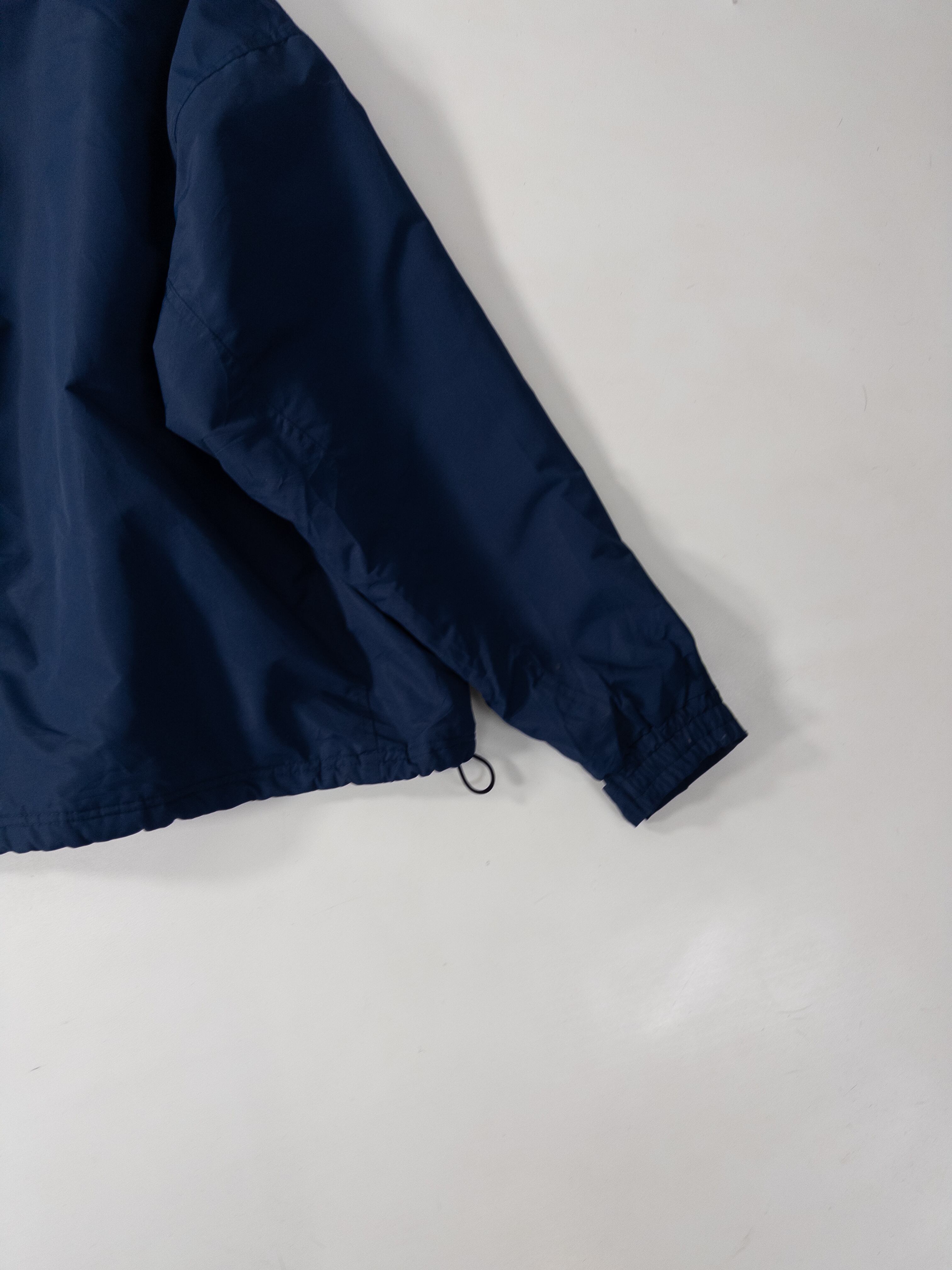 ネイビーのシェルにベージュのフリースを合わせた配色は、いかにもなアウトドア感を抑え、スラックスやチノなど街着のボトムスとも自然に馴染むのが魅力。