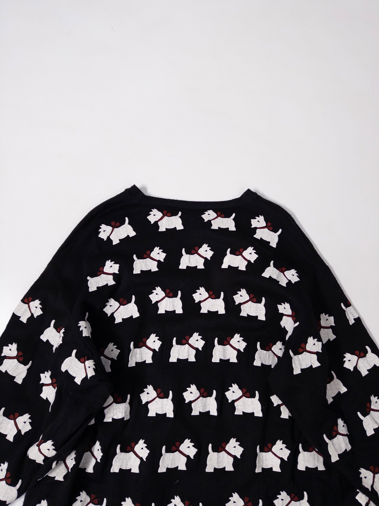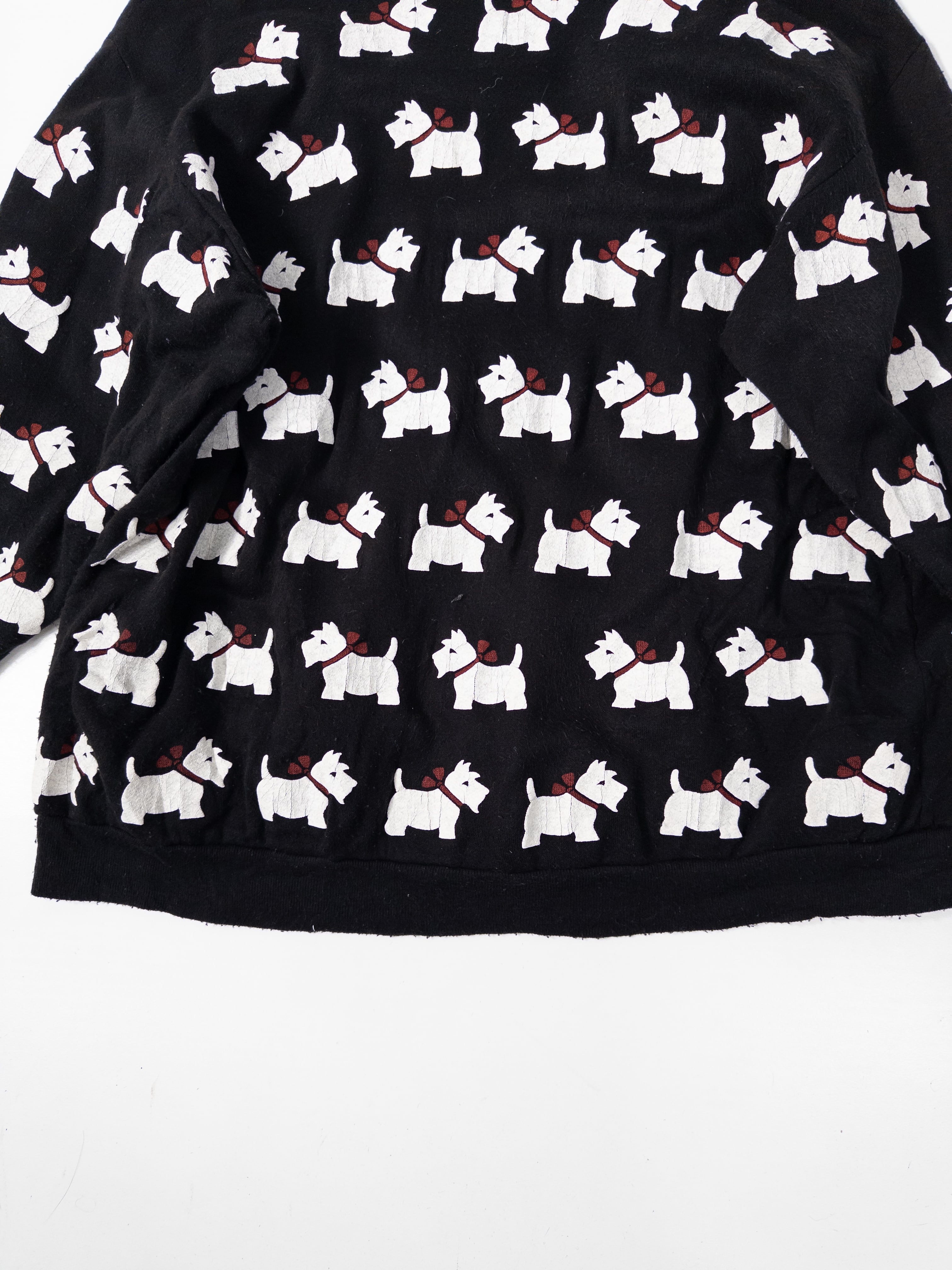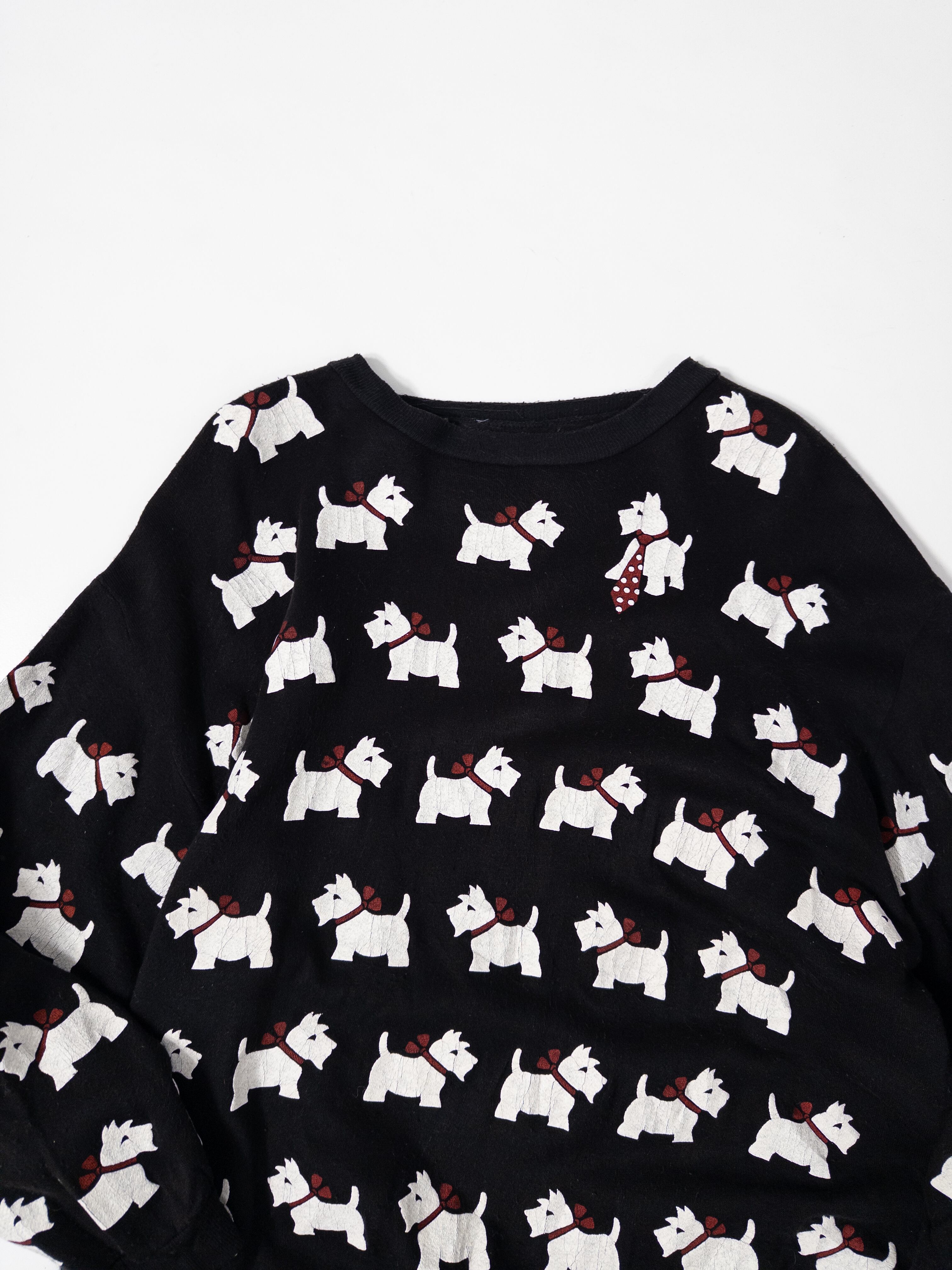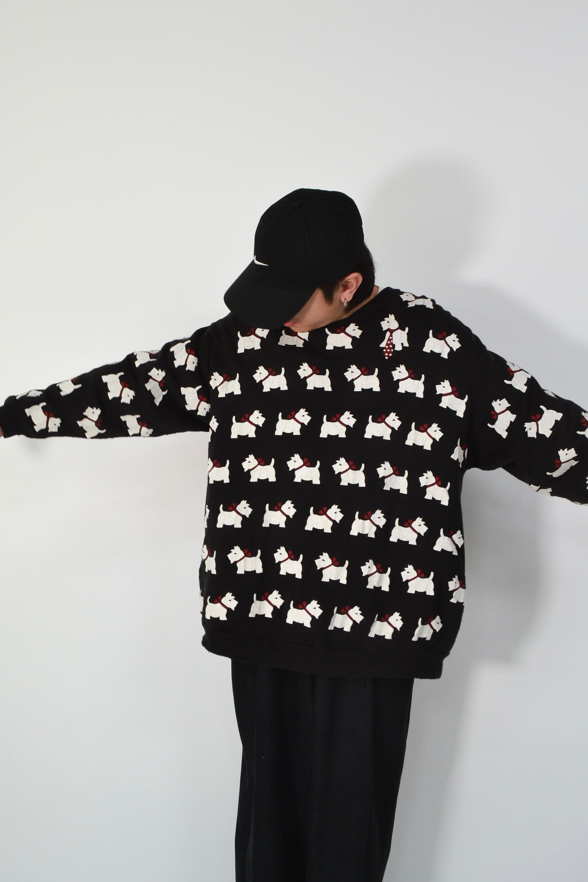 一面に並ぶホワイトテリア柄が目を引く、総柄スウェット。